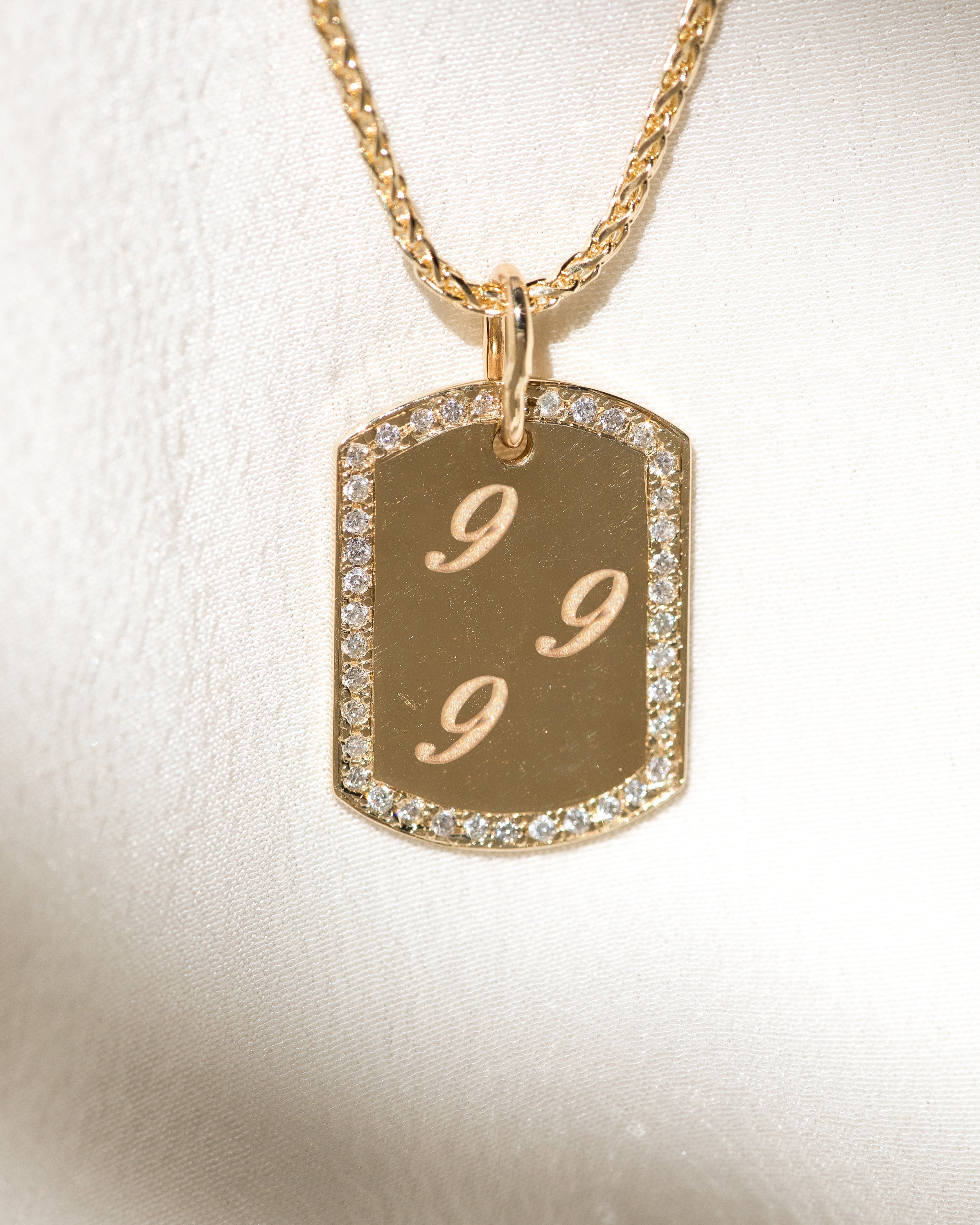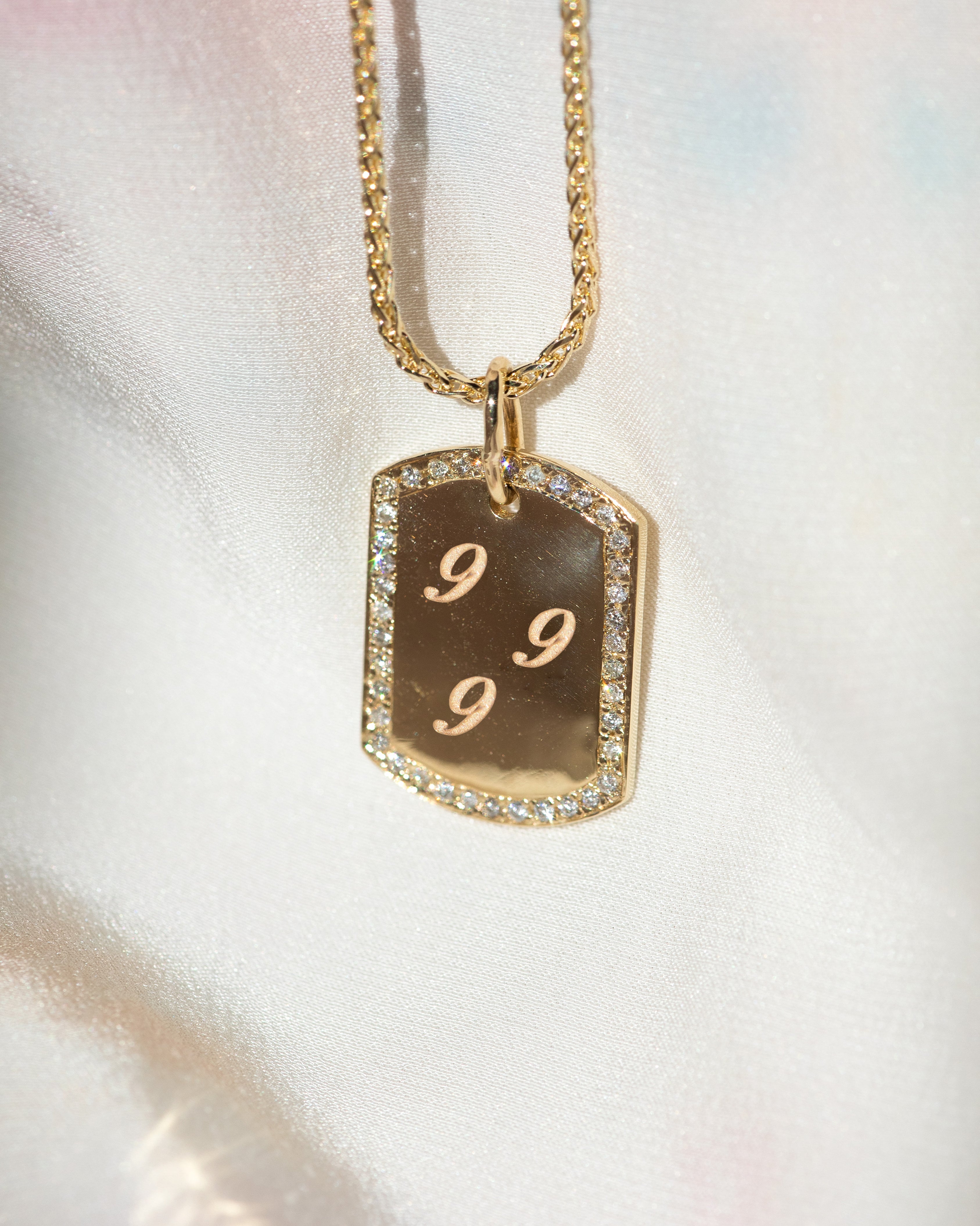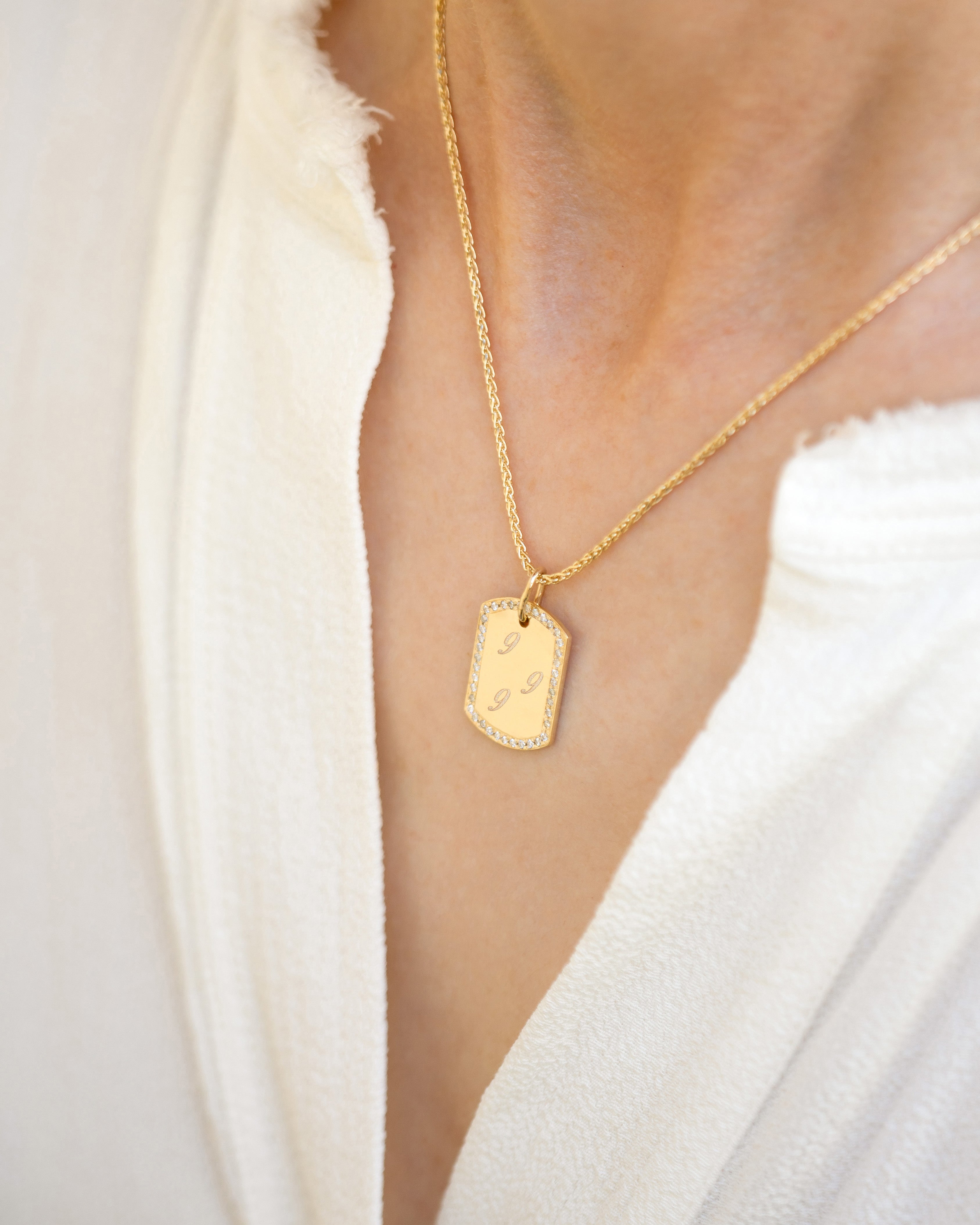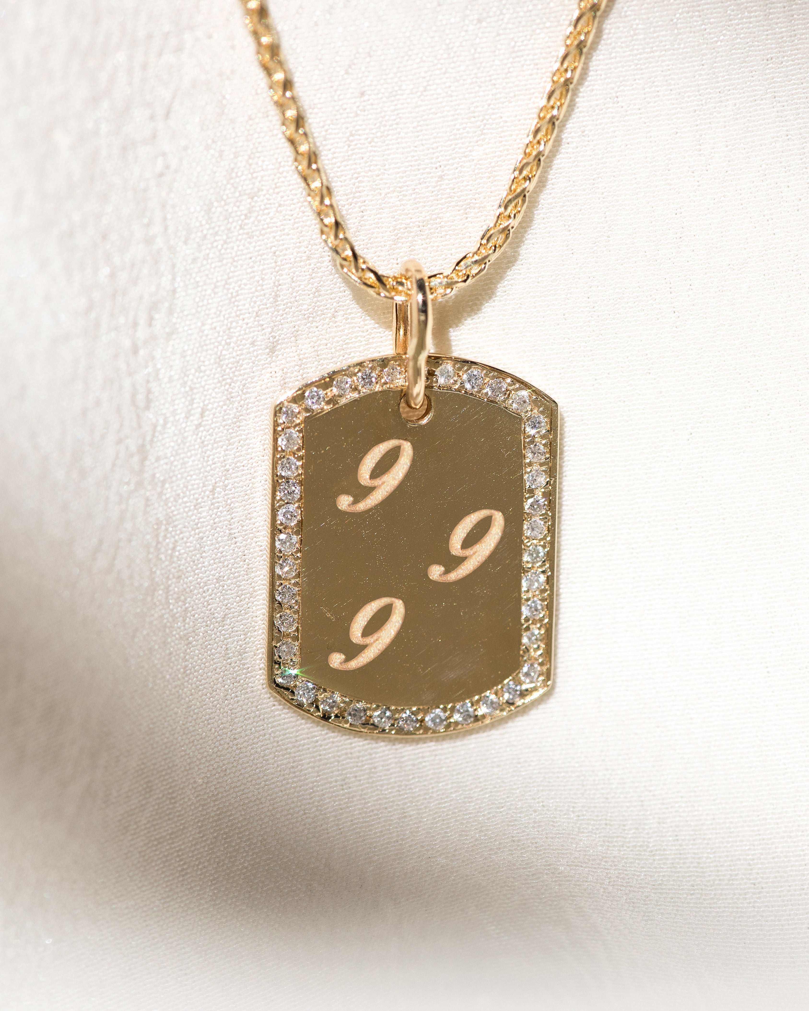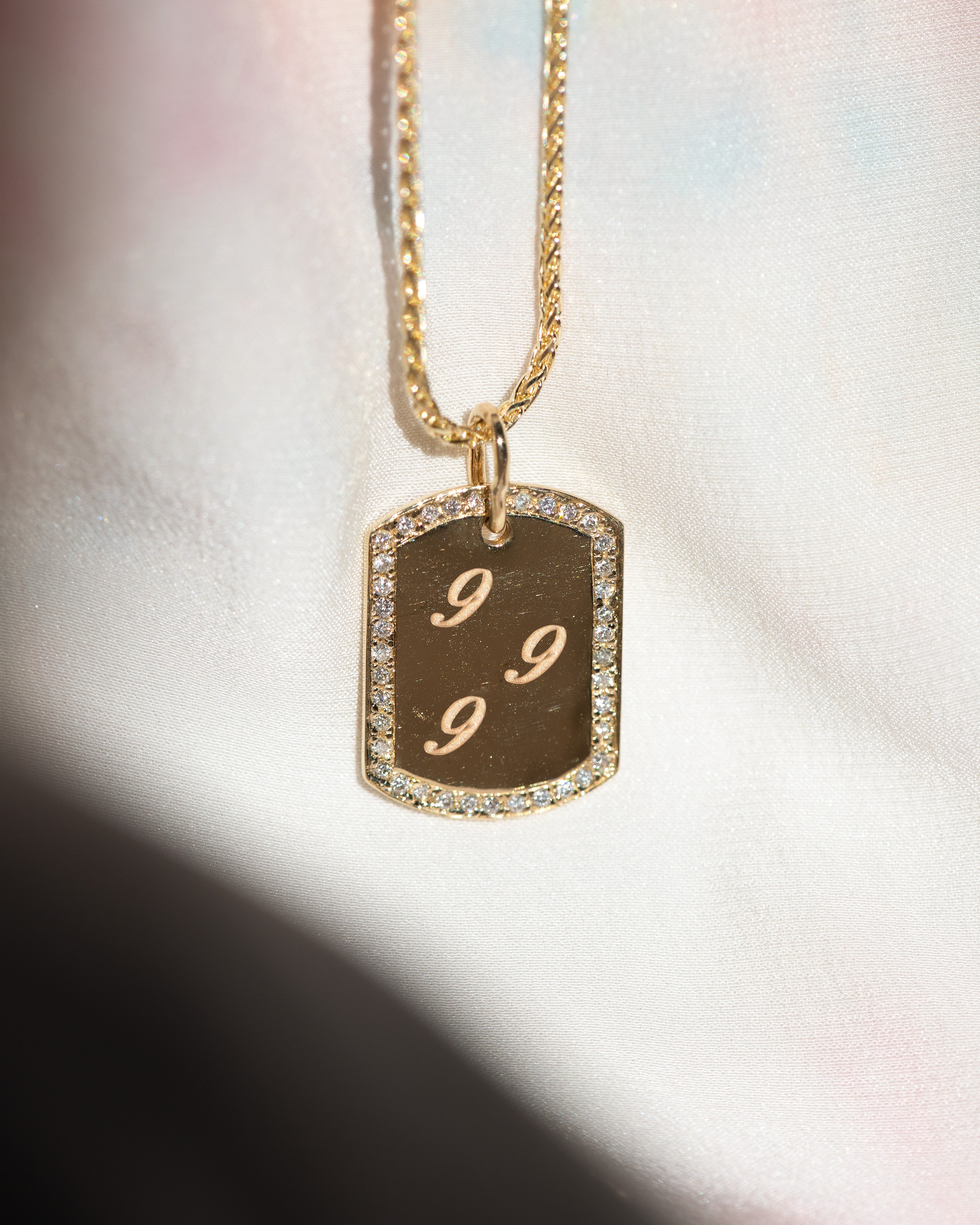 The Angel Tag features your beloved angel numbers hand engraved, surrounded by a halo of white diamonds.