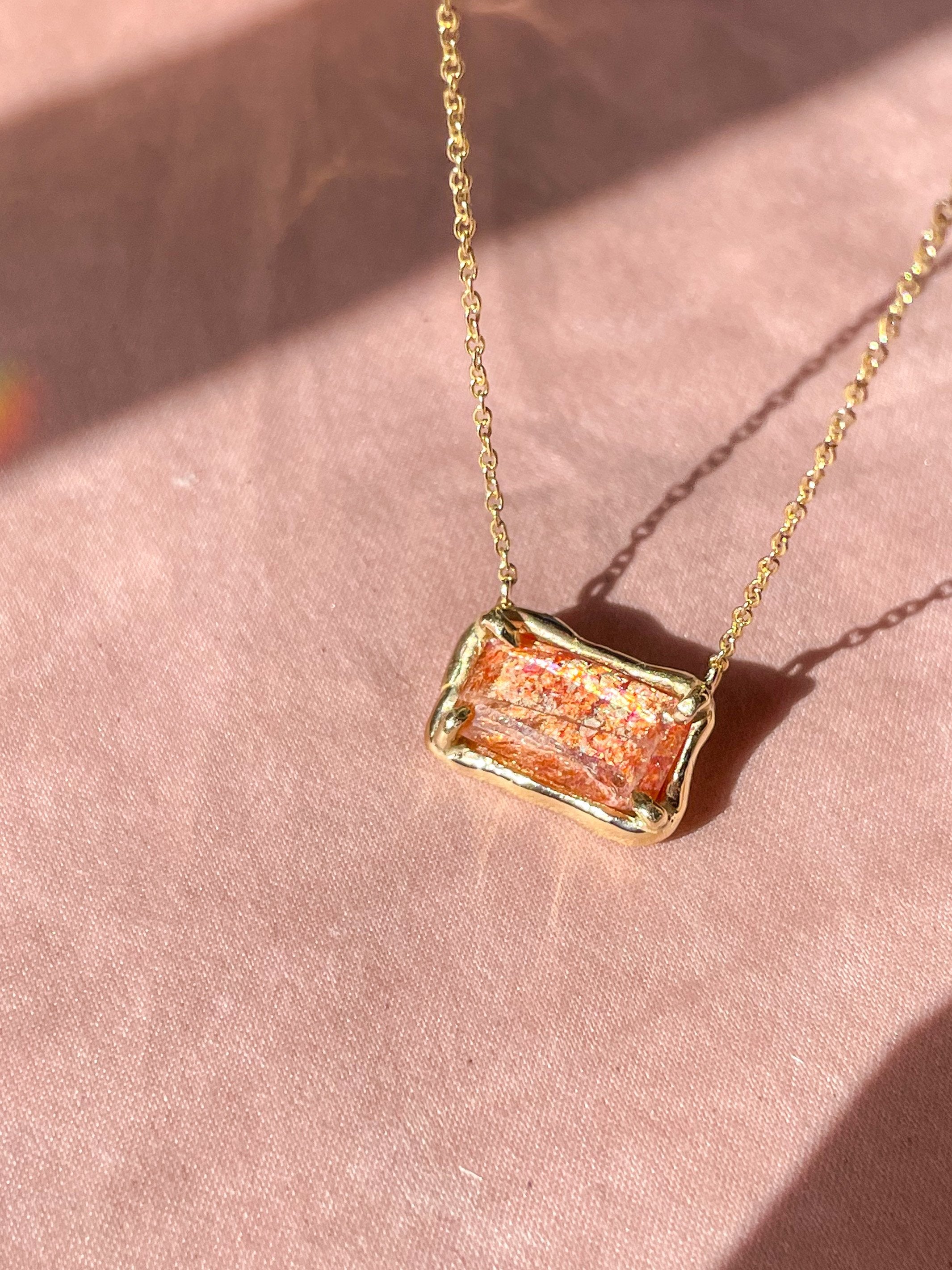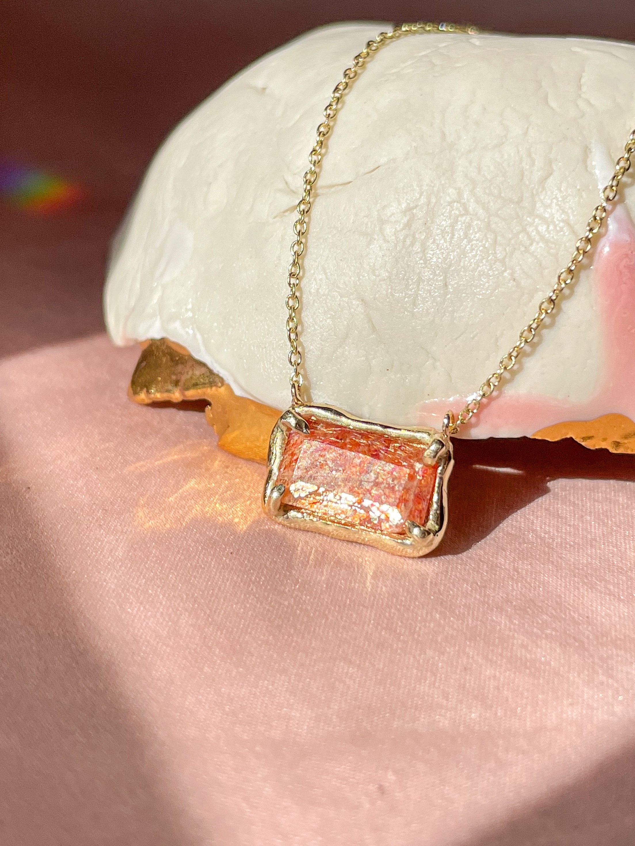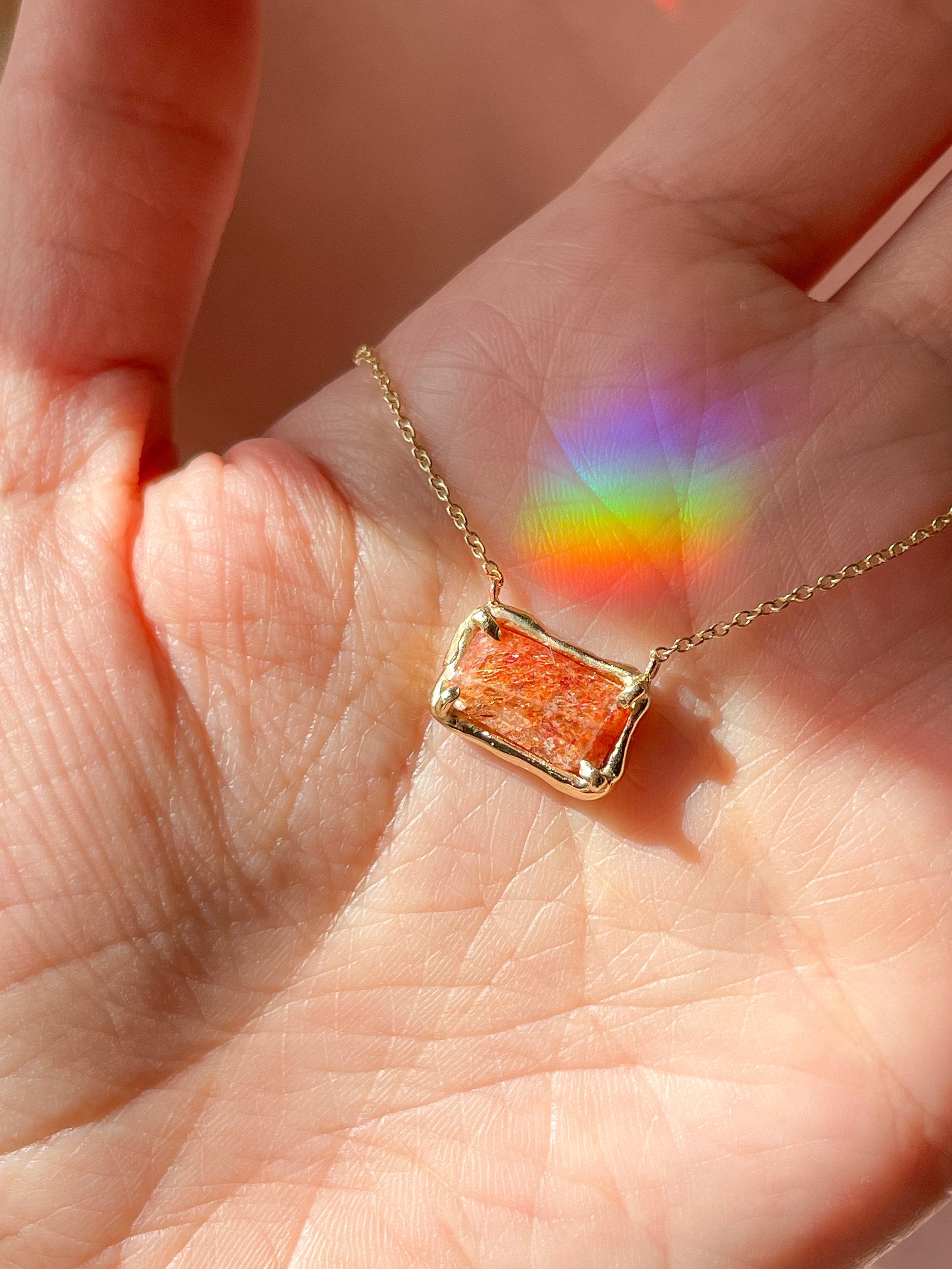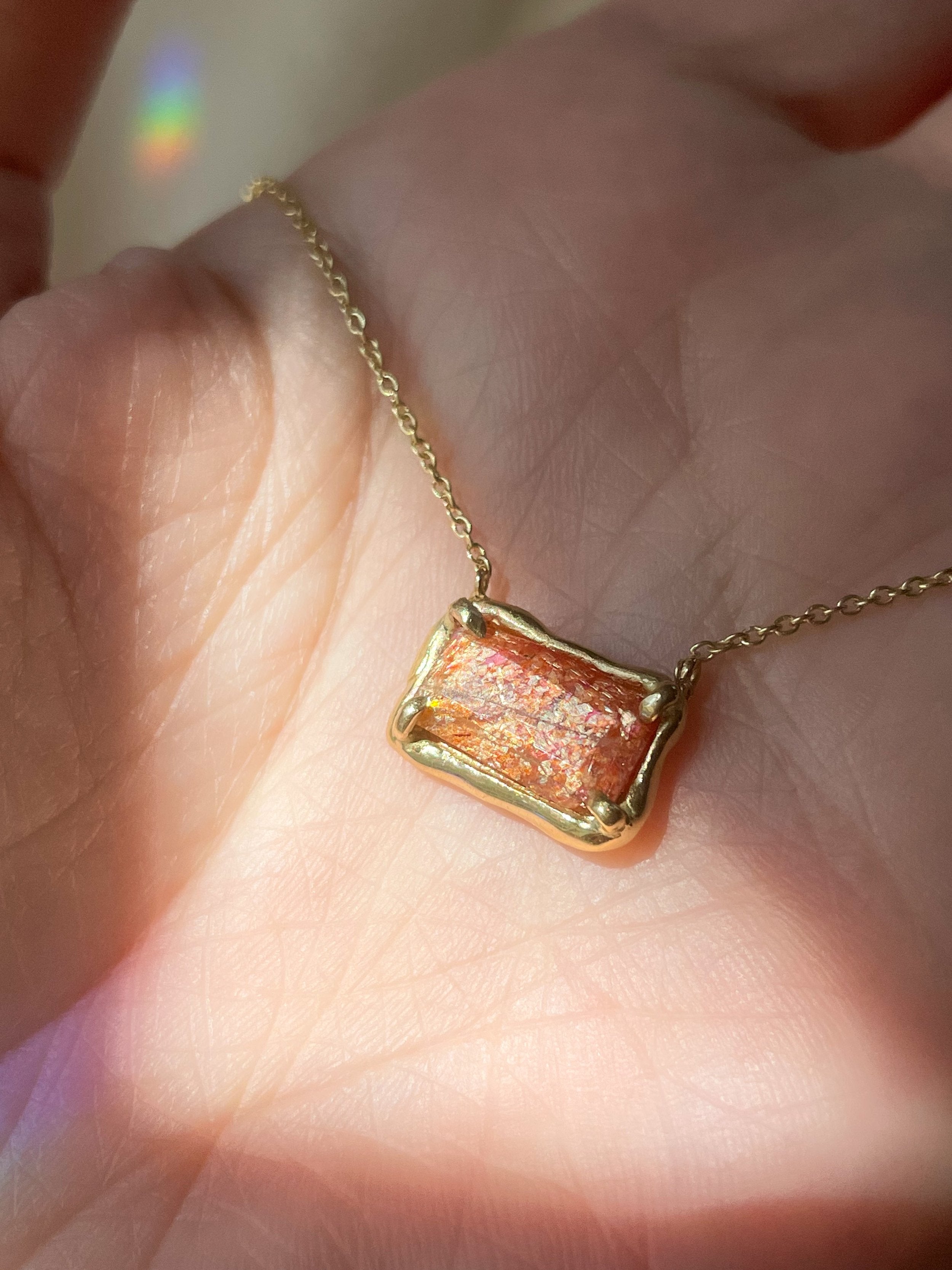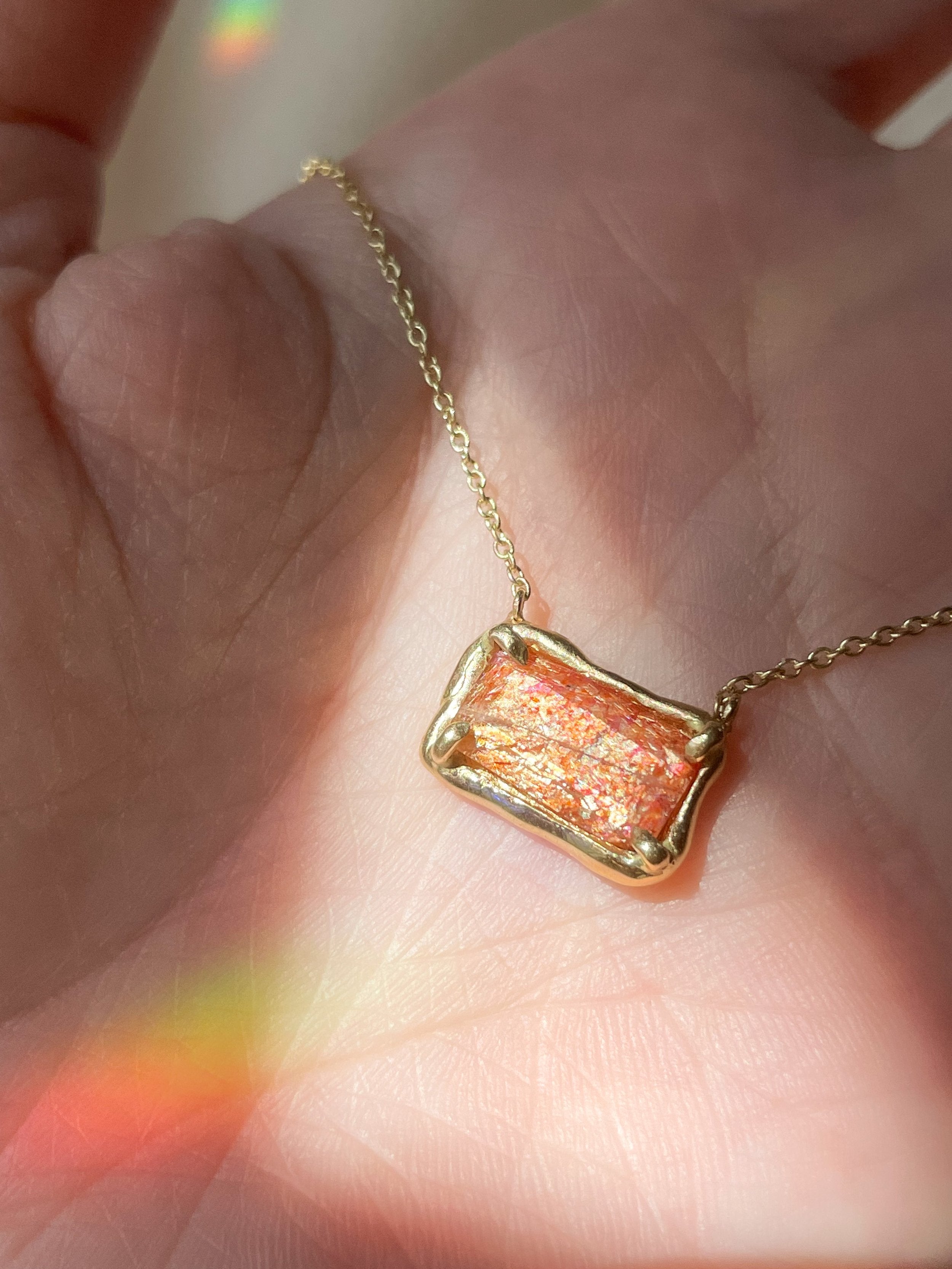 One of a kind confetti Sunstone Pendant, filled to the brim with iridescent rainbows and flecks of light, illuminated from within, this light-body is ready to embrace you with the warmth of the sun.