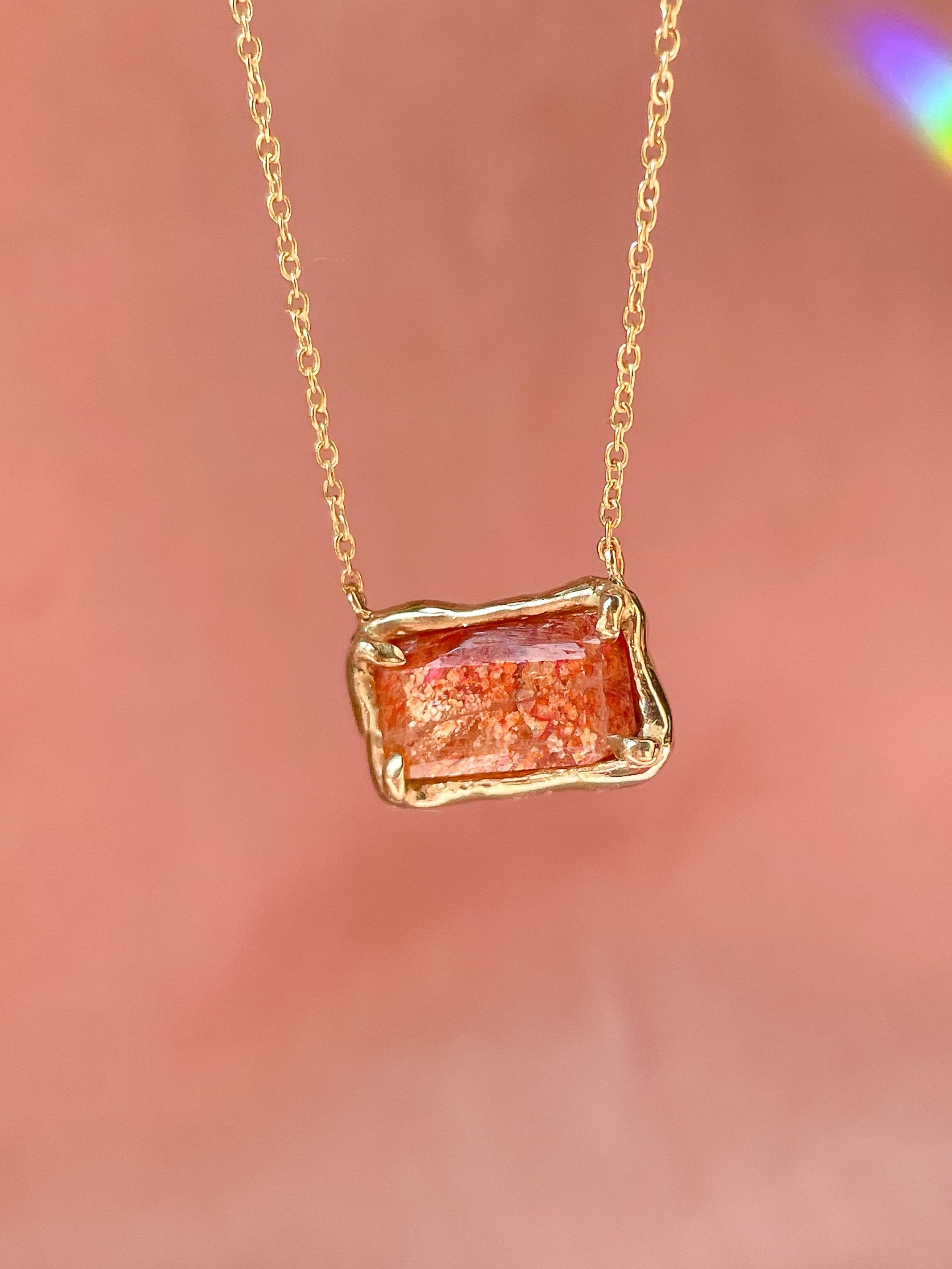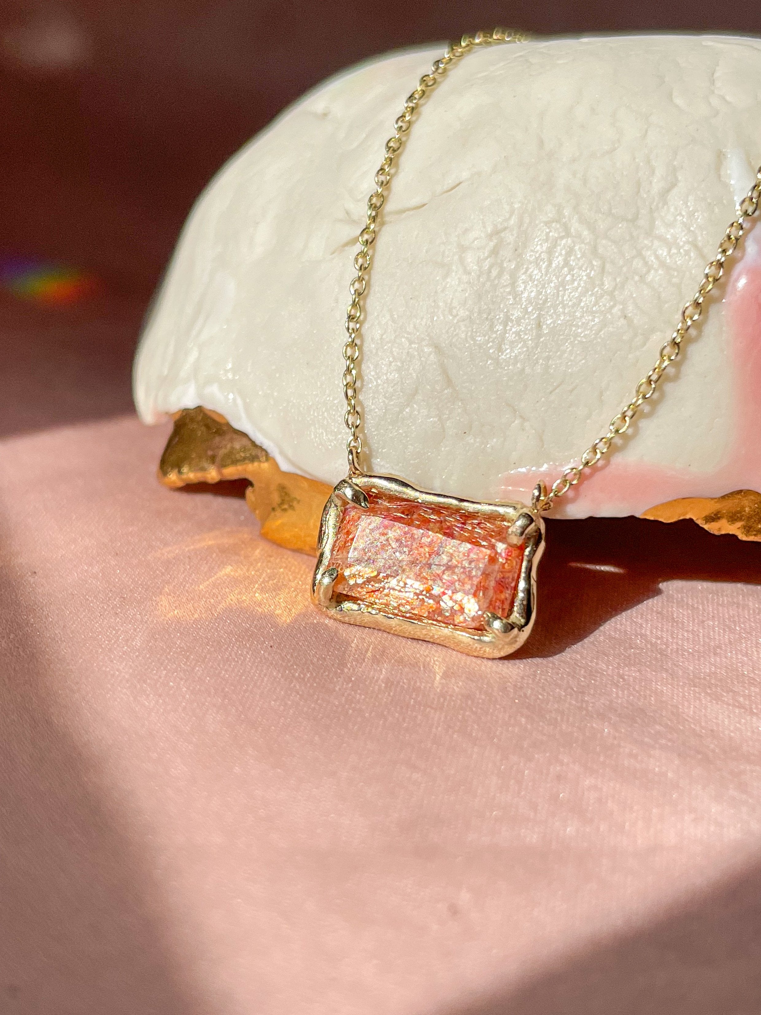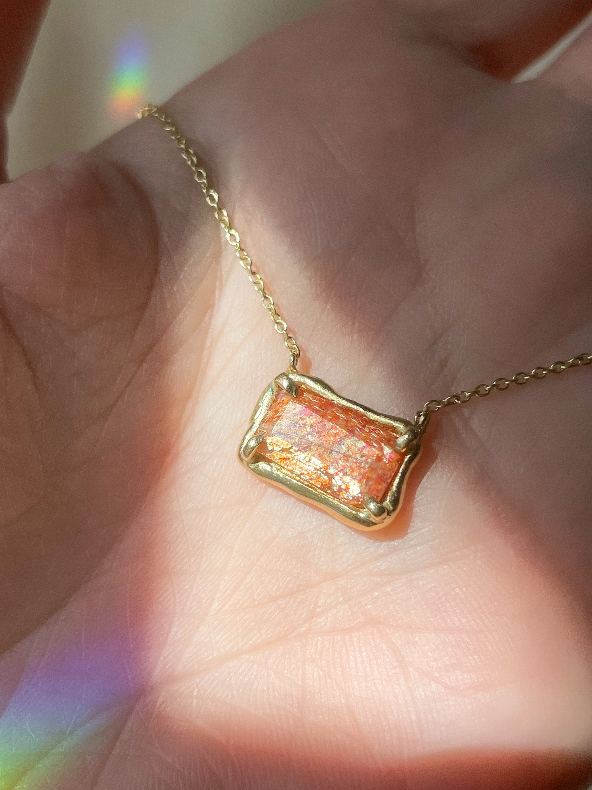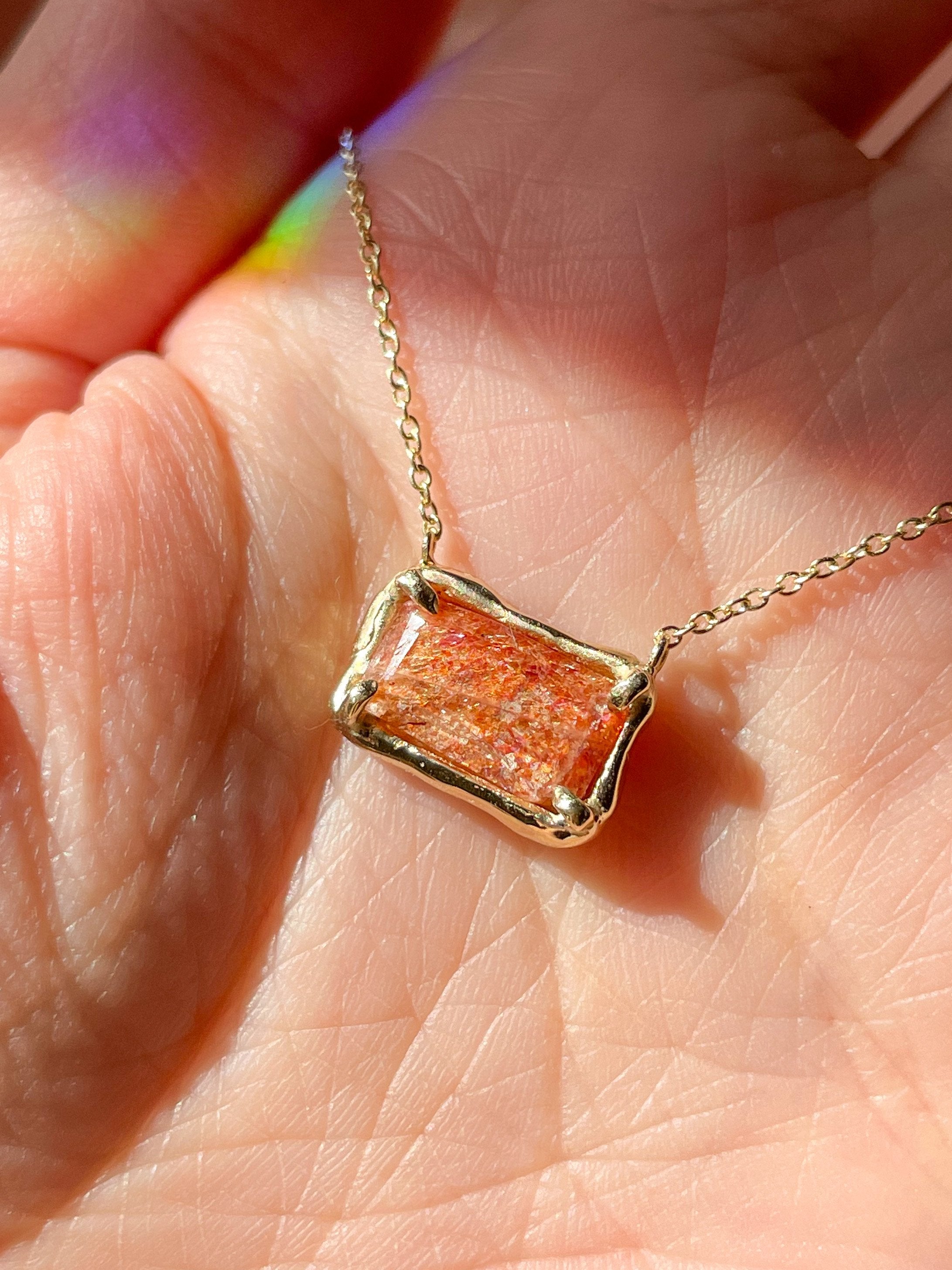 One of a kind confetti Sunstone Pendant, filled to the brim with iridescent rainbows and flecks of light, illuminated from within, this light-body is ready to embrace you with the warmth of the sun.