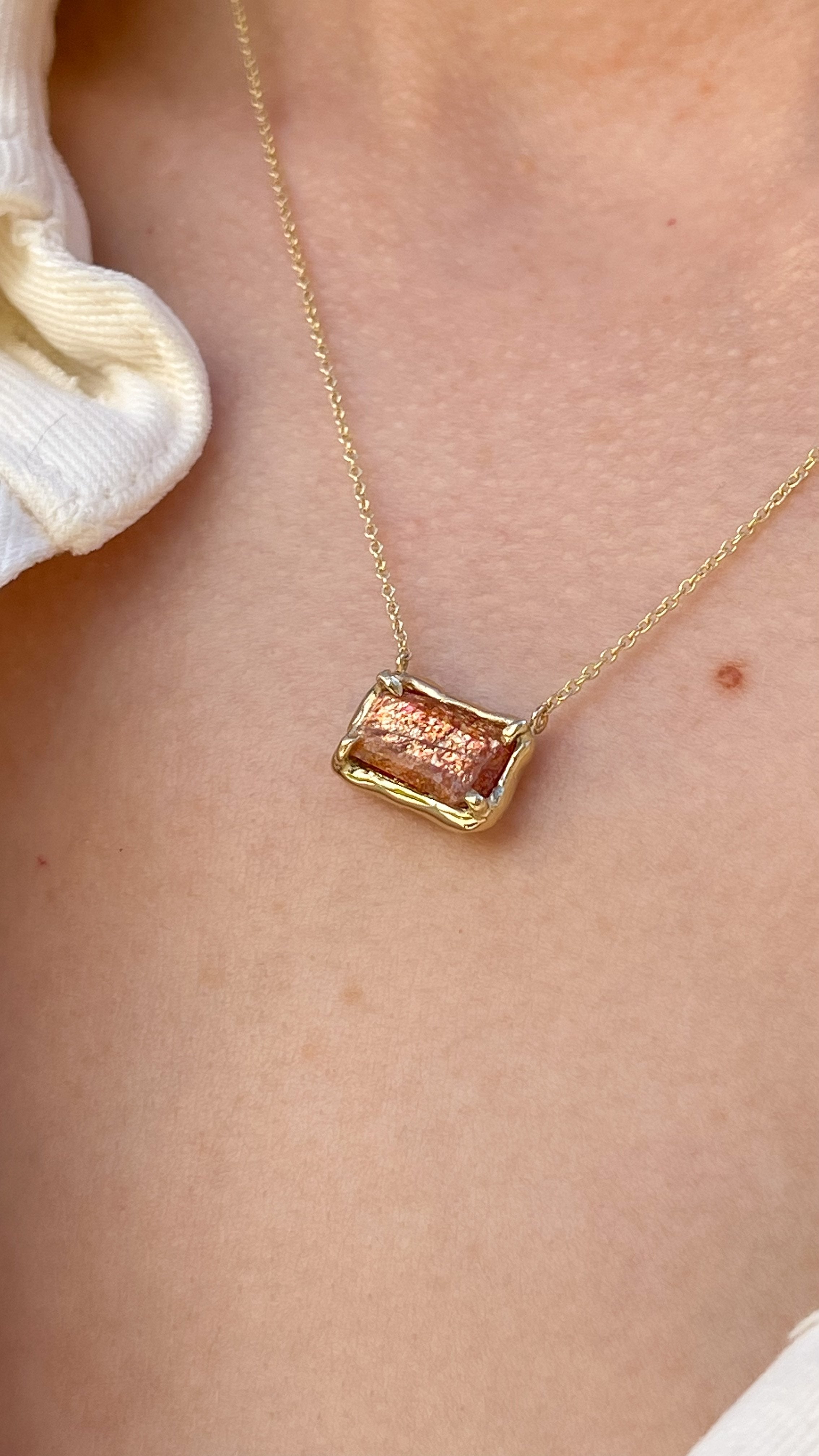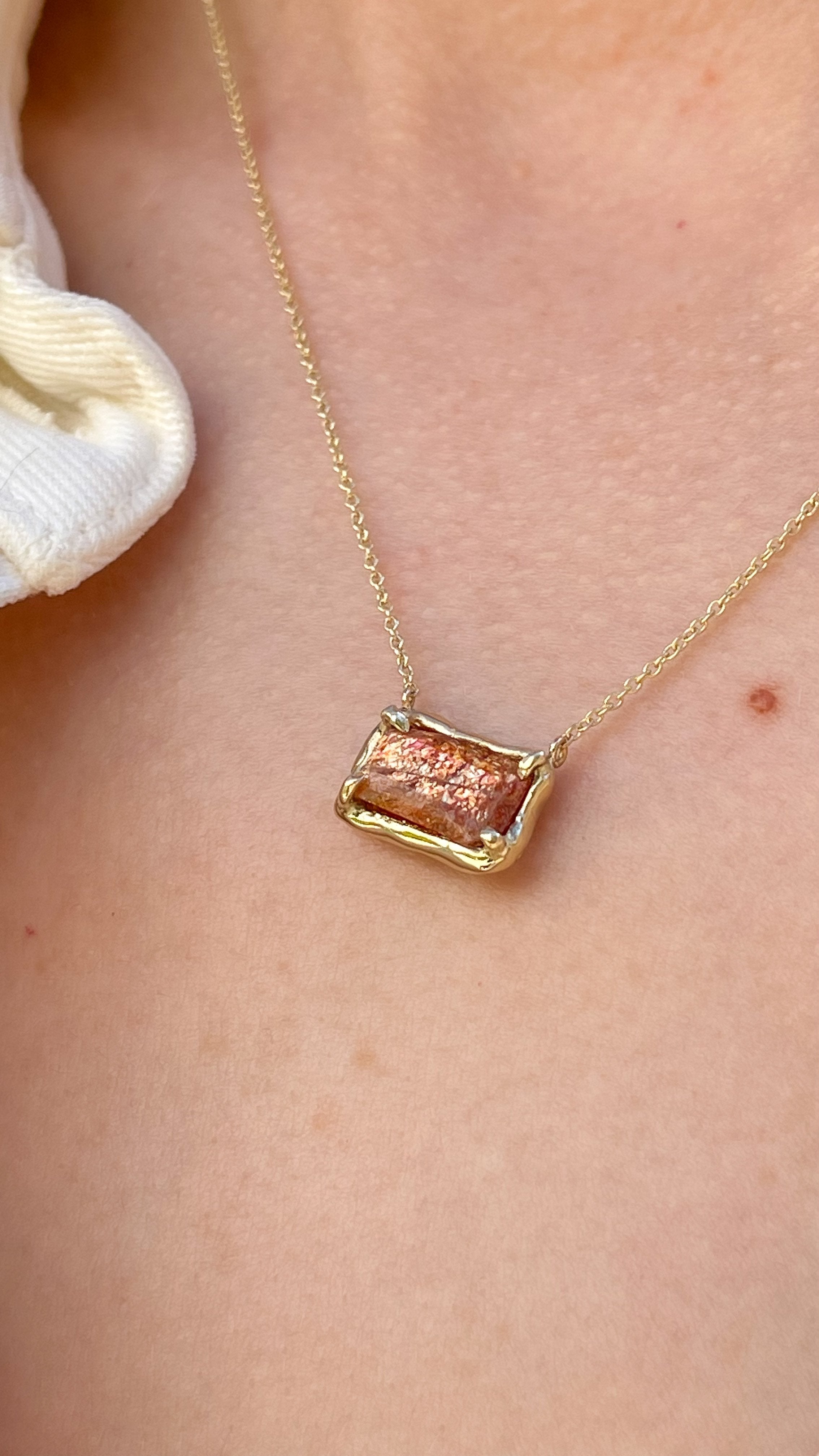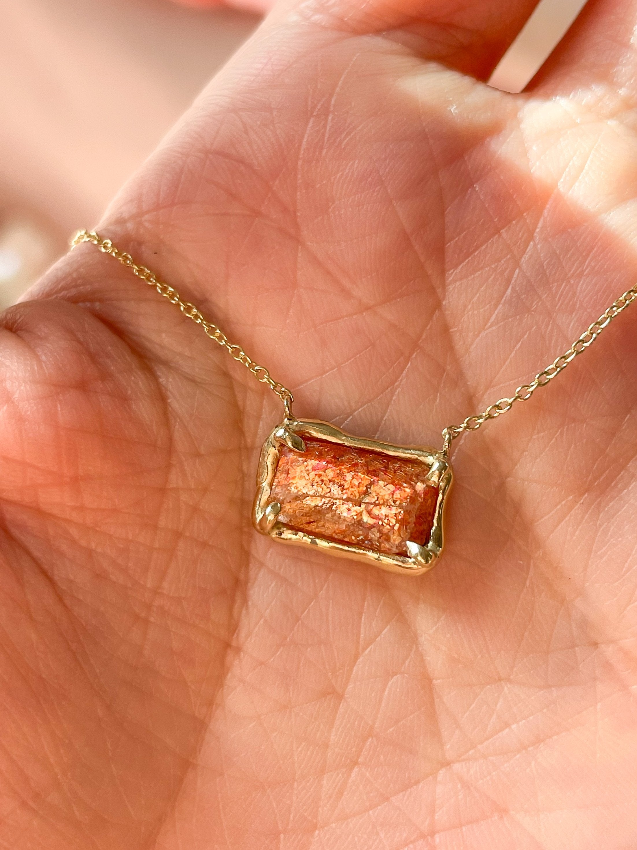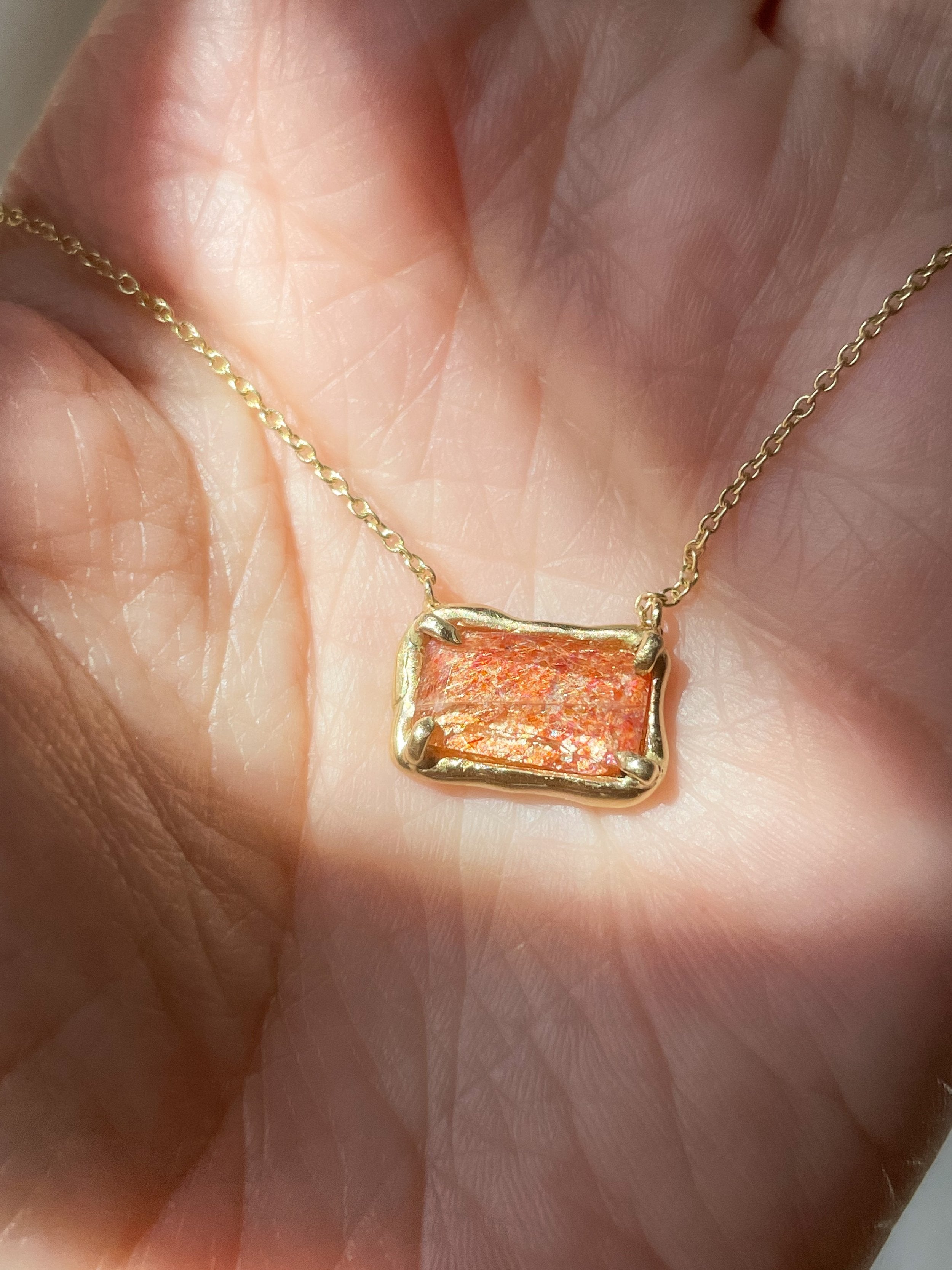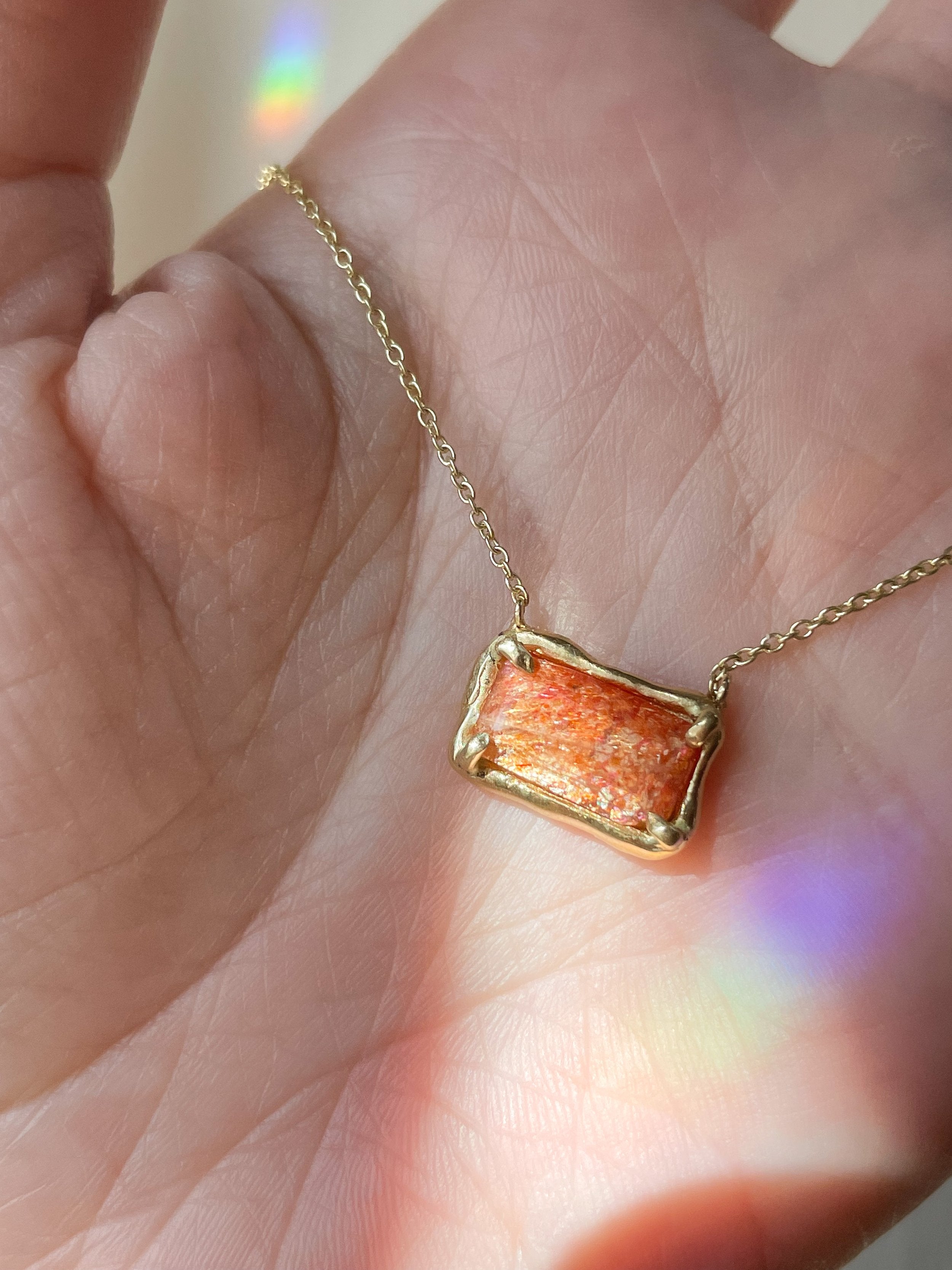 One of a kind confetti Sunstone Pendant, filled to the brim with iridescent rainbows and flecks of light, illuminated from within, this light-body is ready to embrace you with the warmth of the sun.