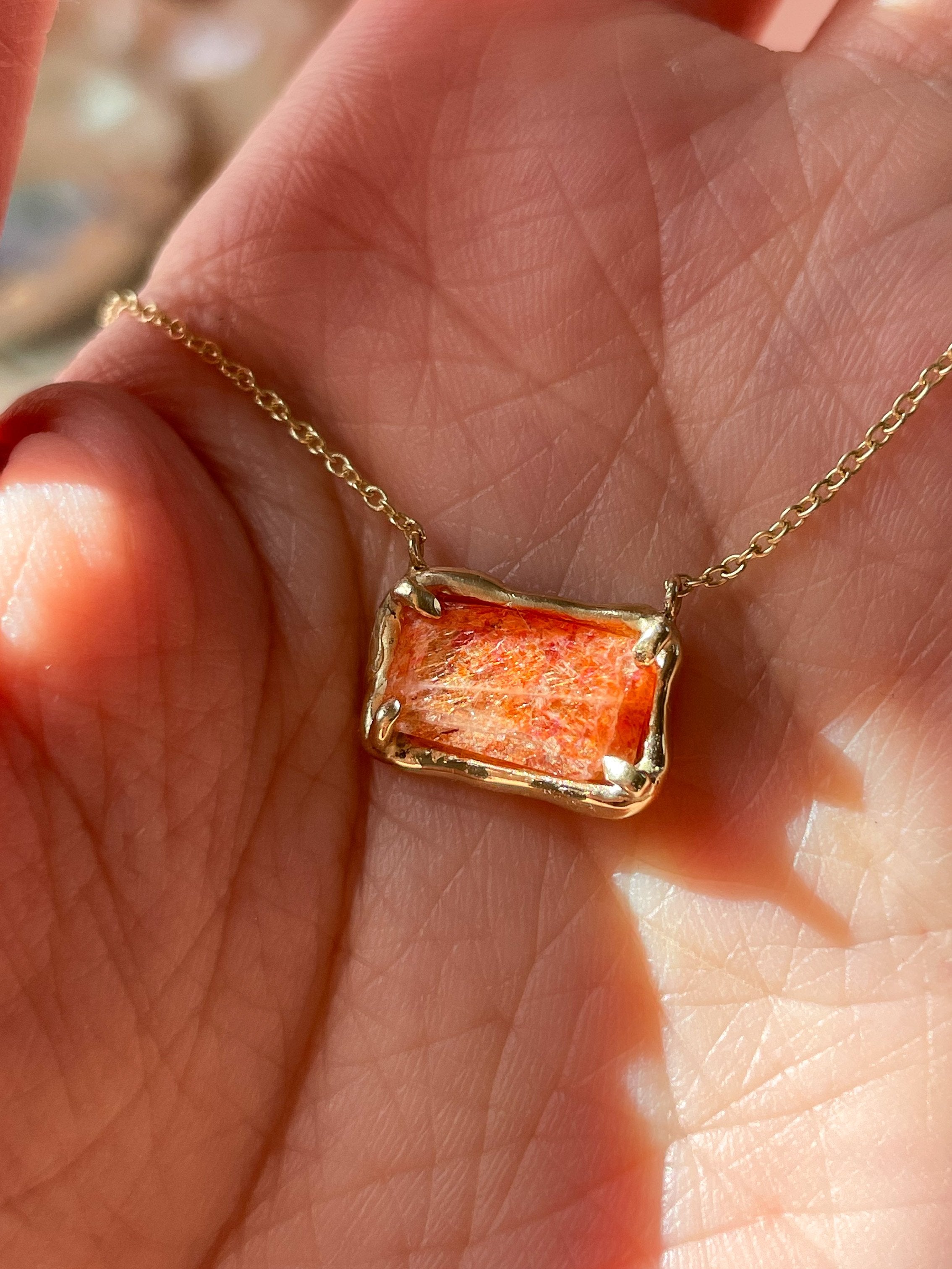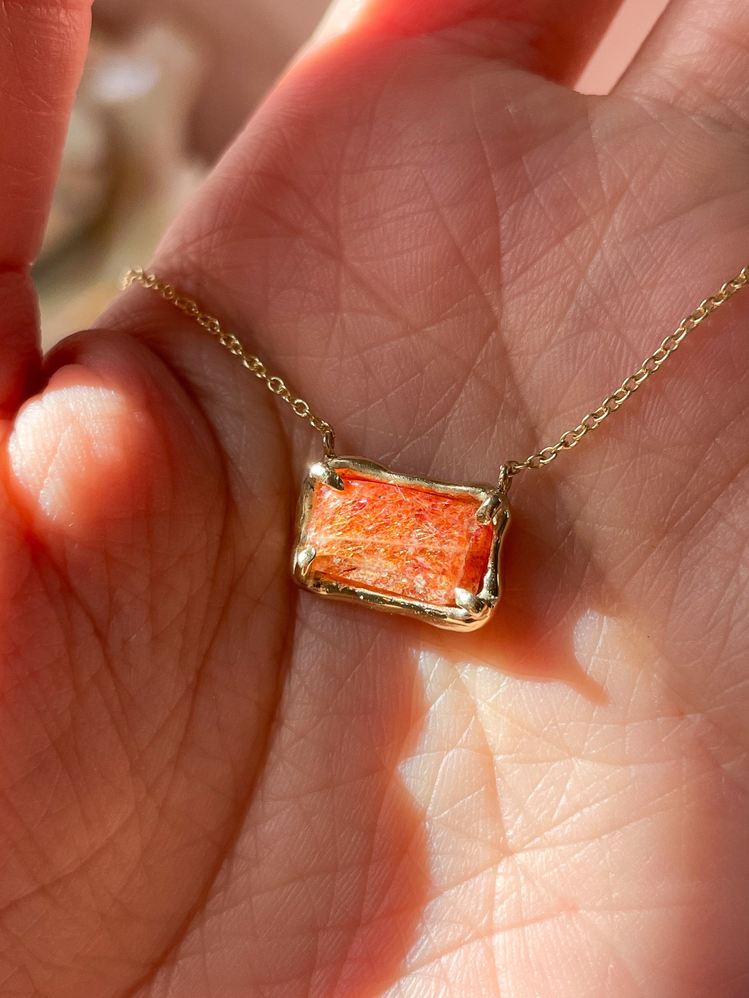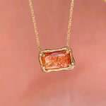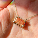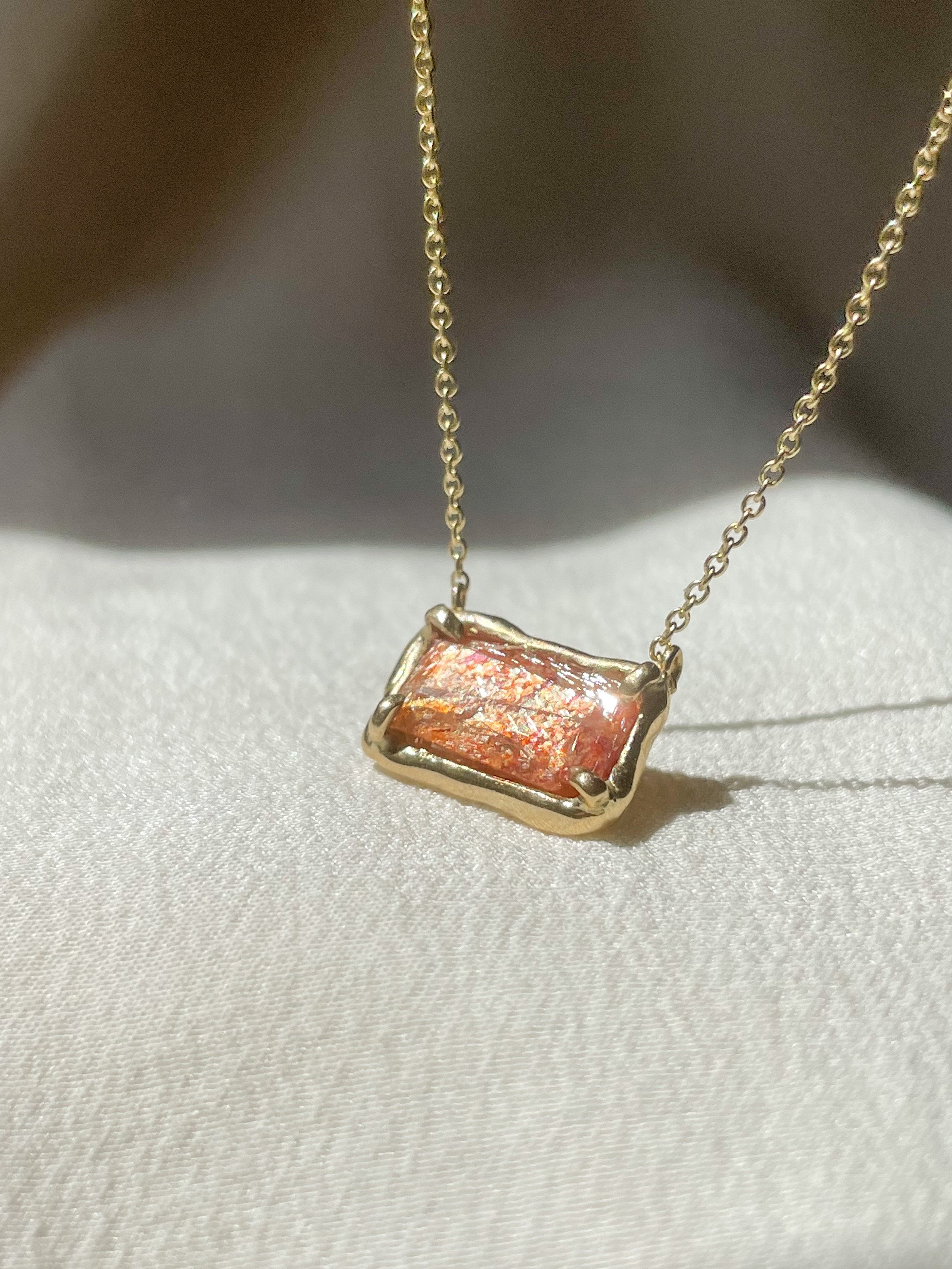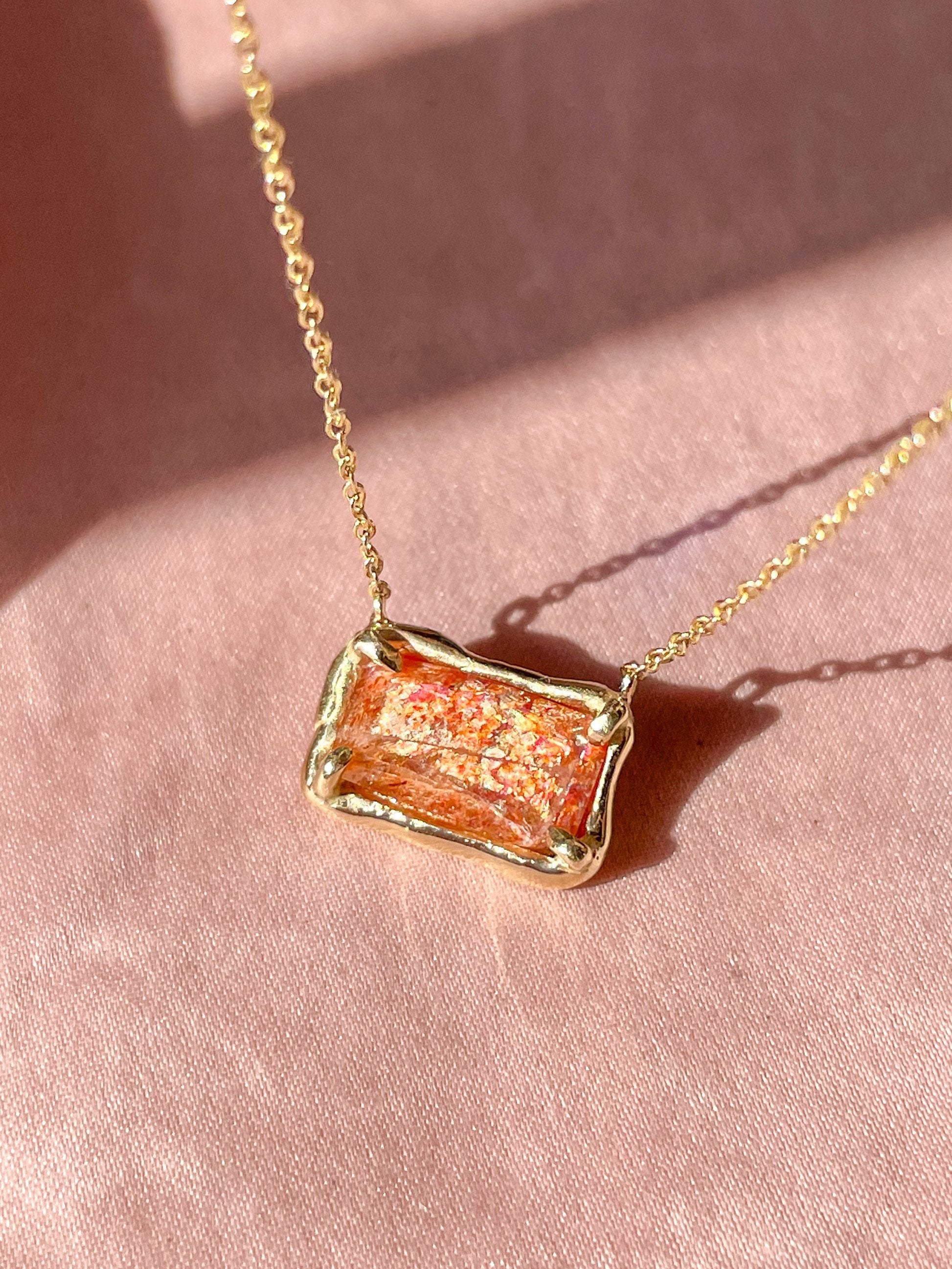 One of a kind confetti Sunstone Pendant, filled to the brim with iridescent rainbows and flecks of light, illuminated from within, this light-body is ready to embrace you with the warmth of the sun.