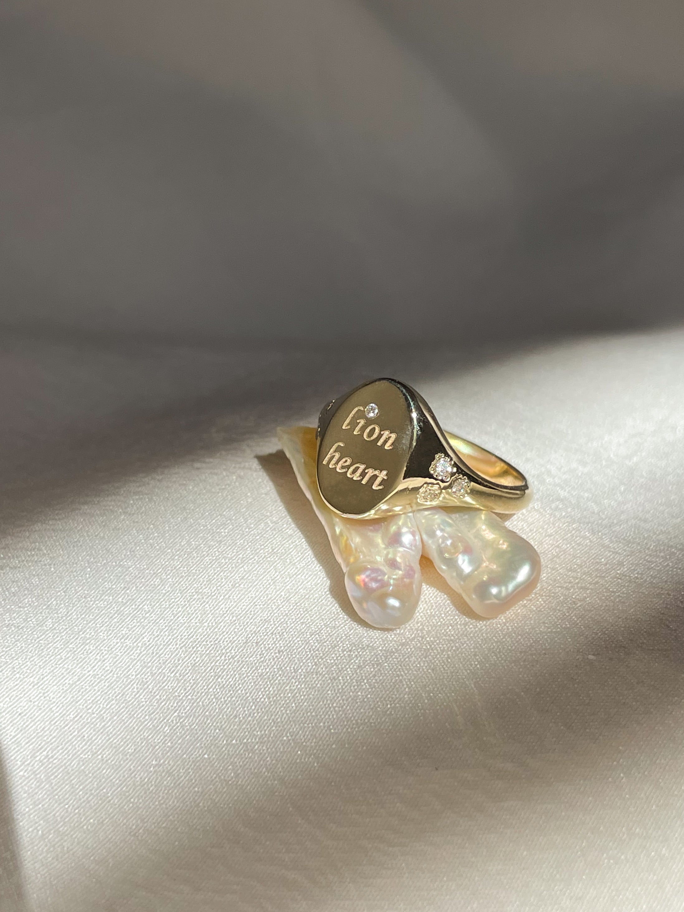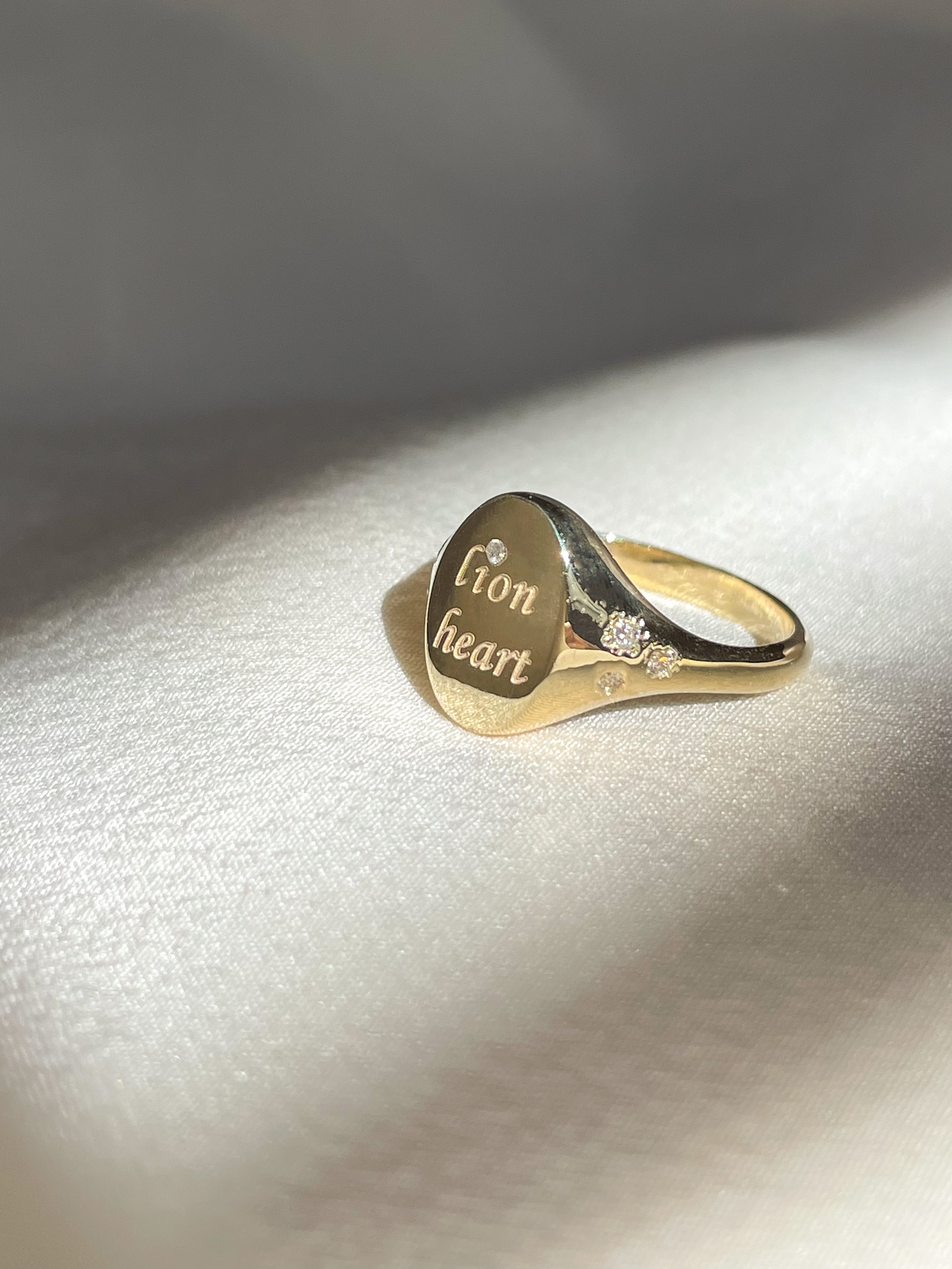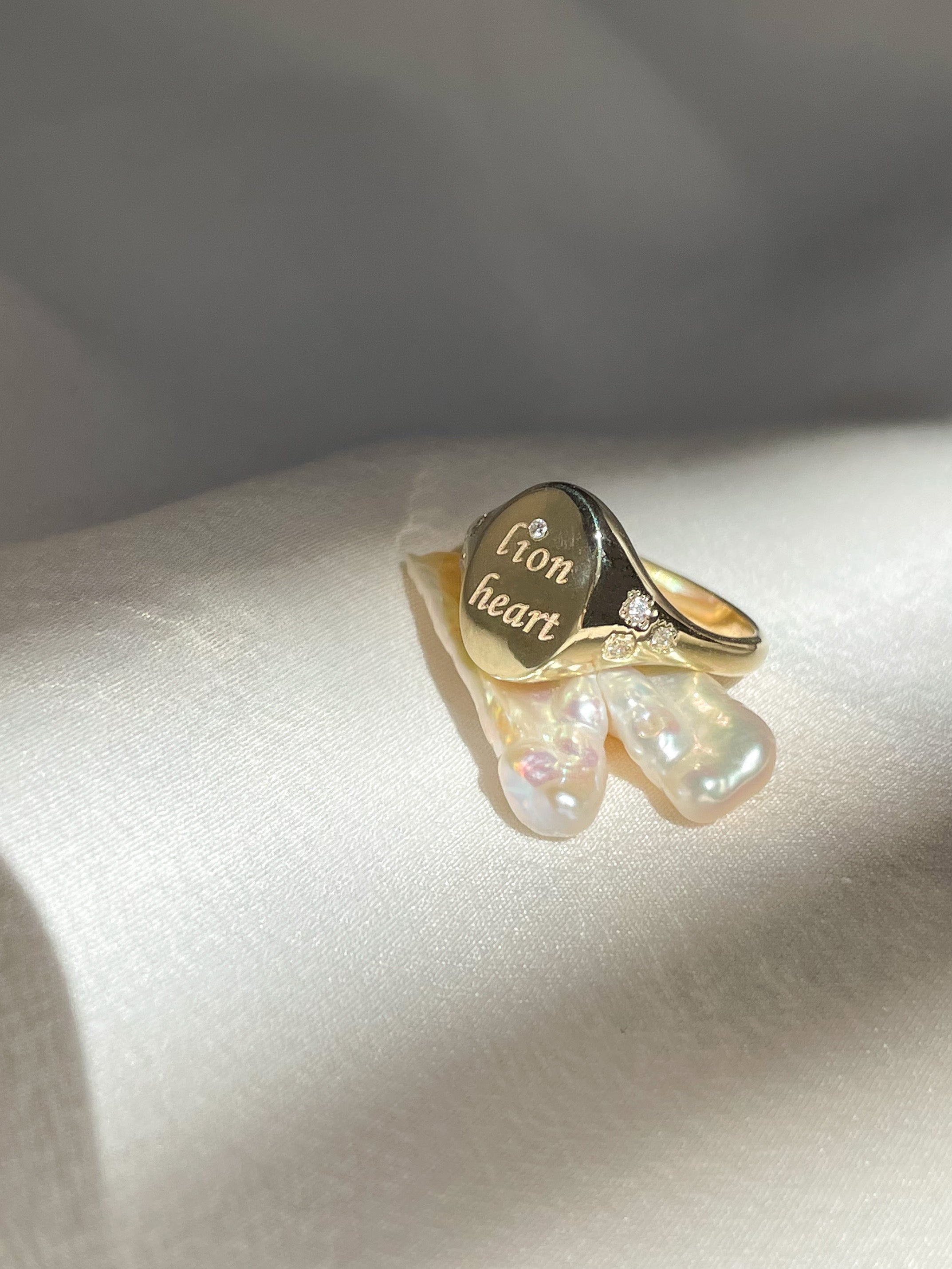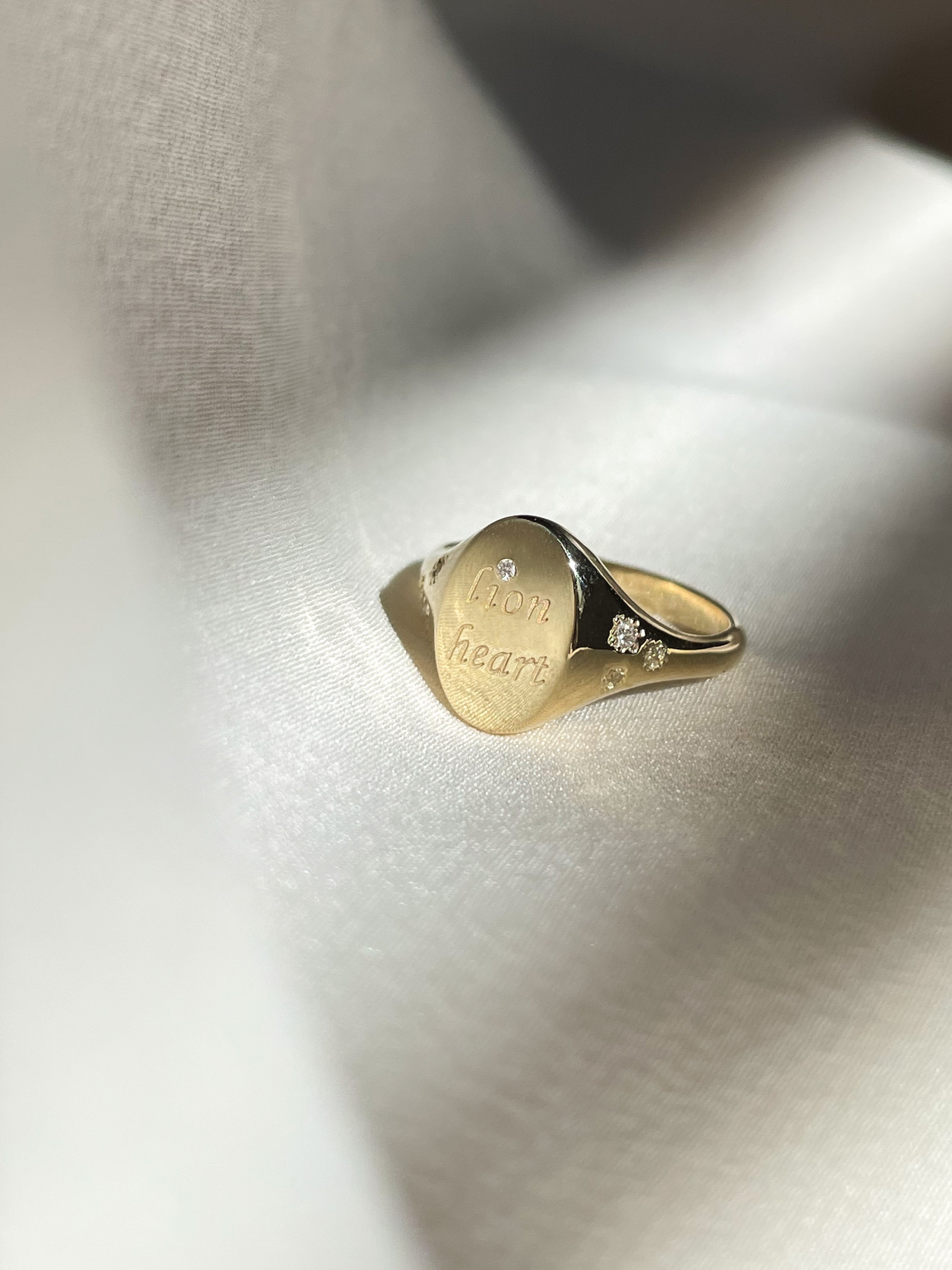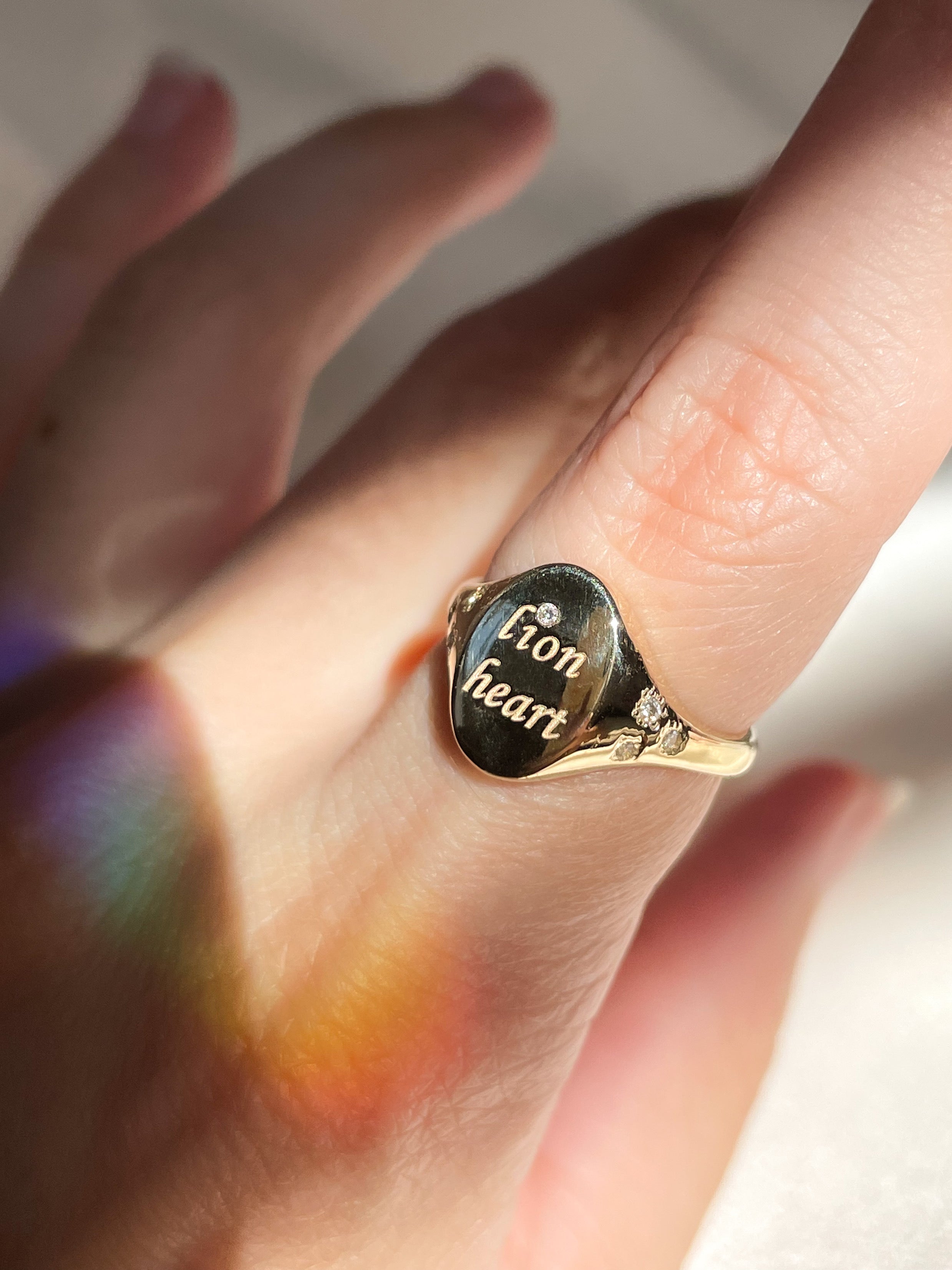 Solid 14k Yellow Gold Signet Ring, engraved with the emblem "lion heart", adorned with 7 sacred Diamonds.