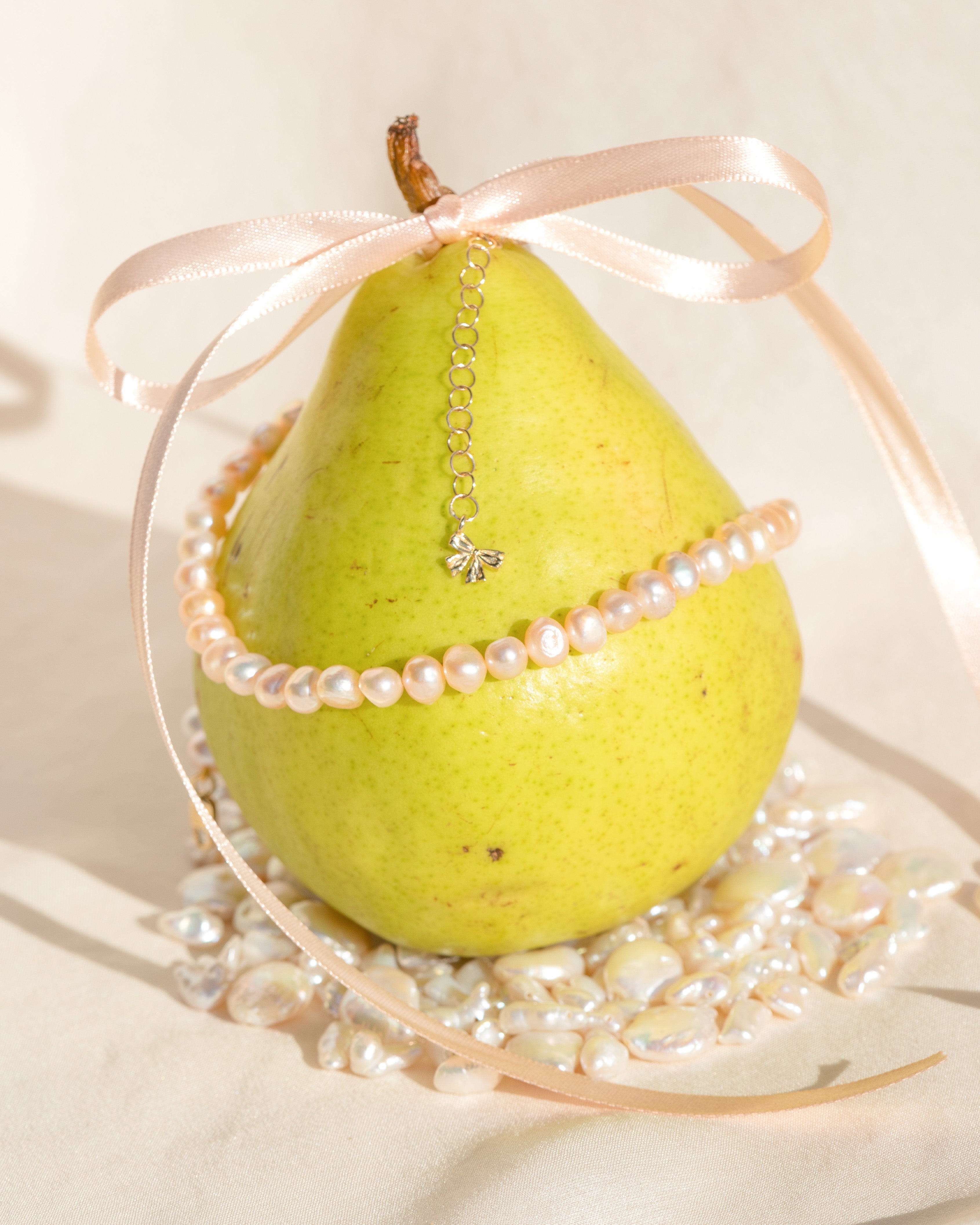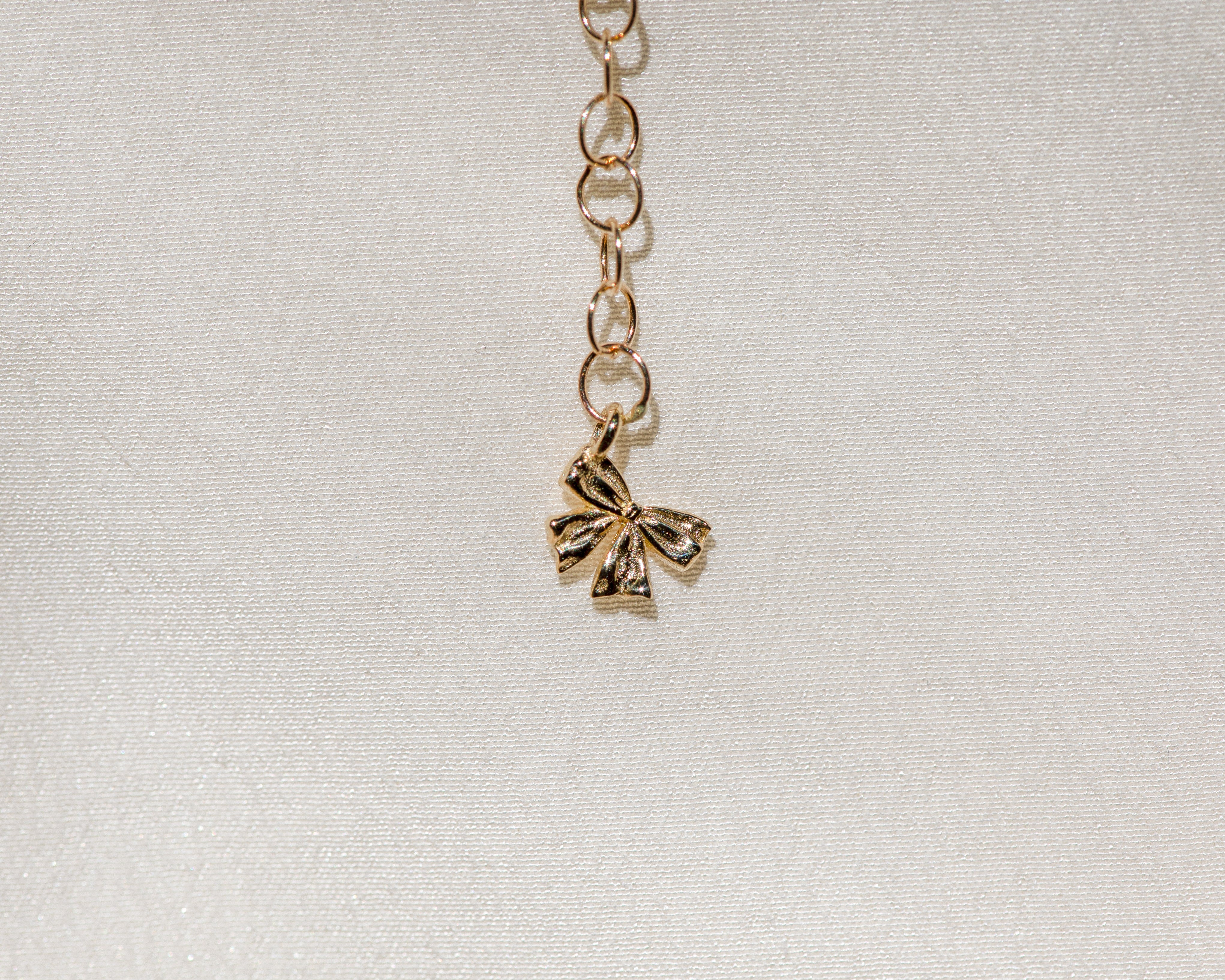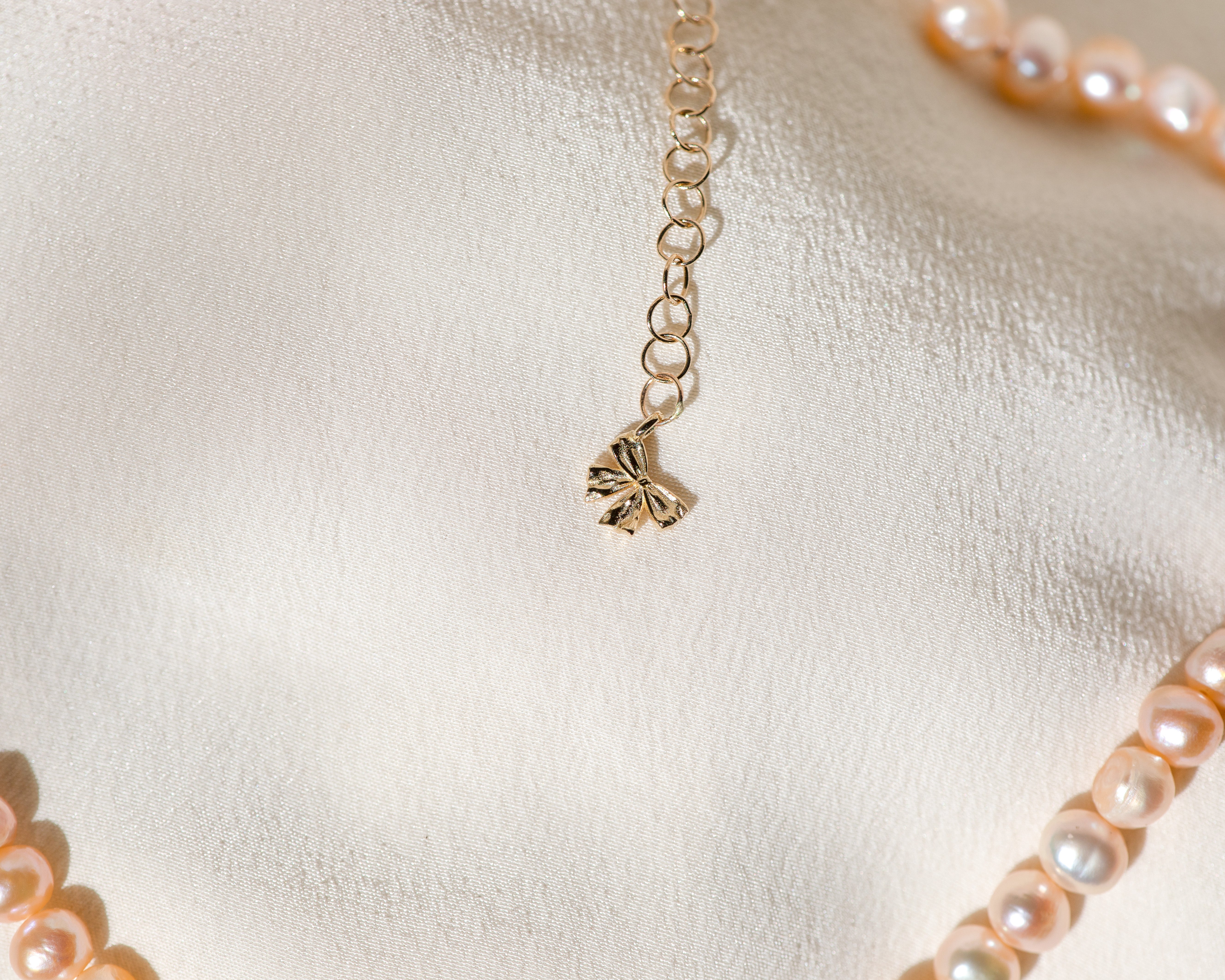 This perfectly petite coquette pearl pendant is inspired by the pendants worn by Marie Antoinette, adorned in ribbon and sealed at the back with a bow.
