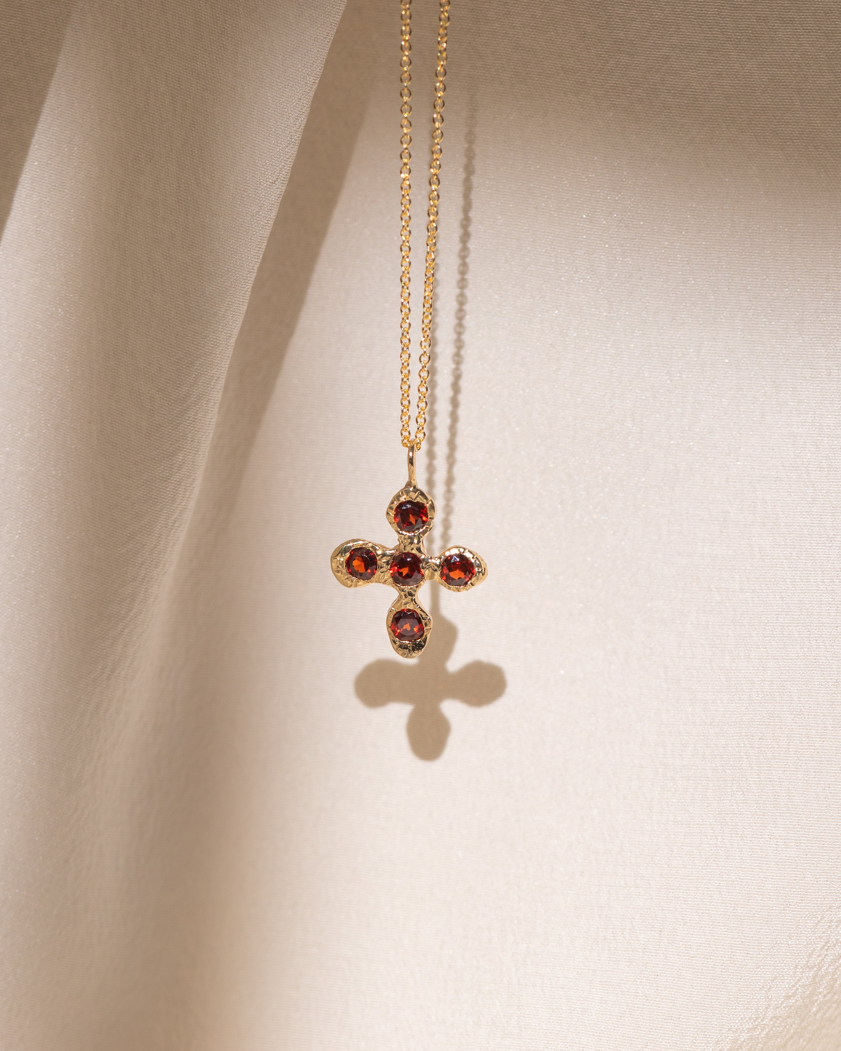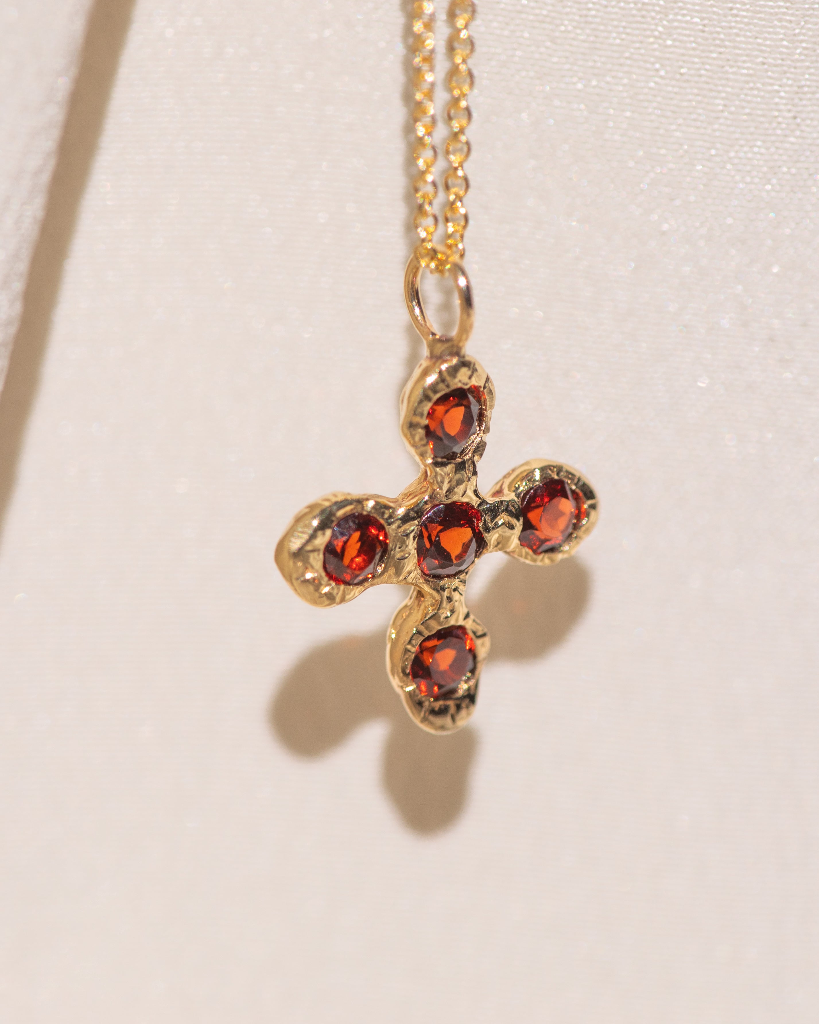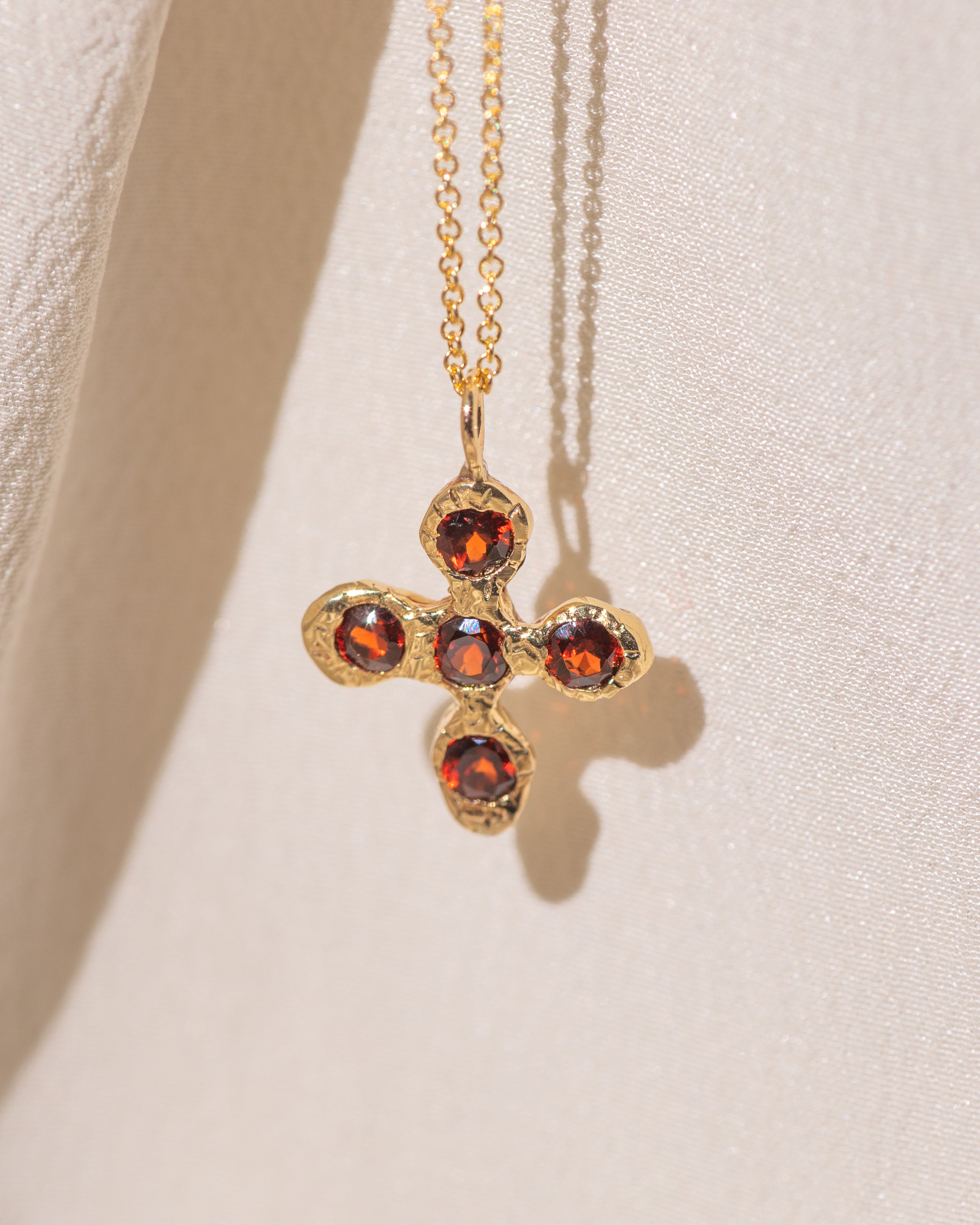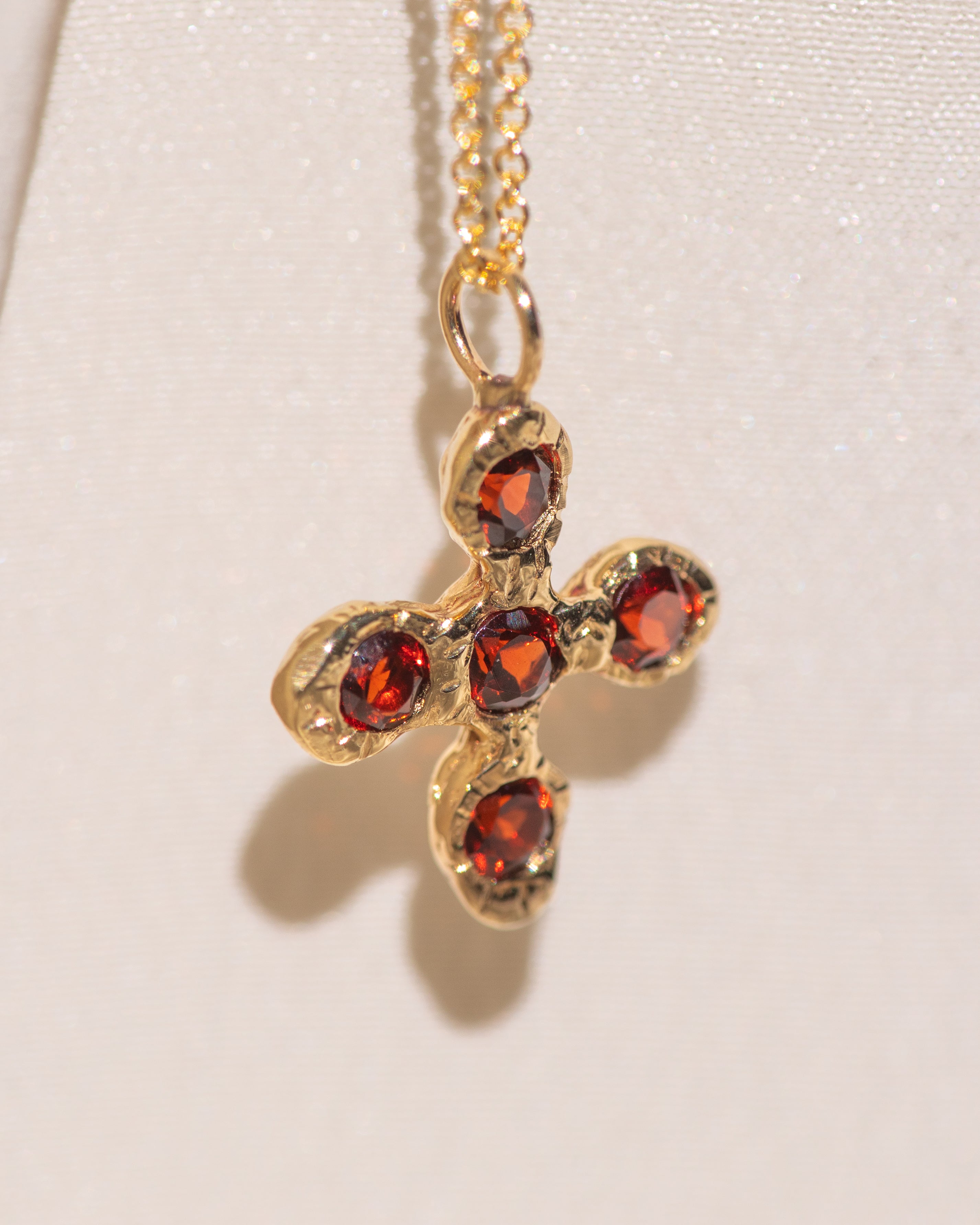 This cross is hand-carved in 14k yellow gold, strung on either a delicate oval chain or Singapore chain, available in 16” or 18”.