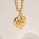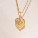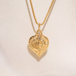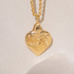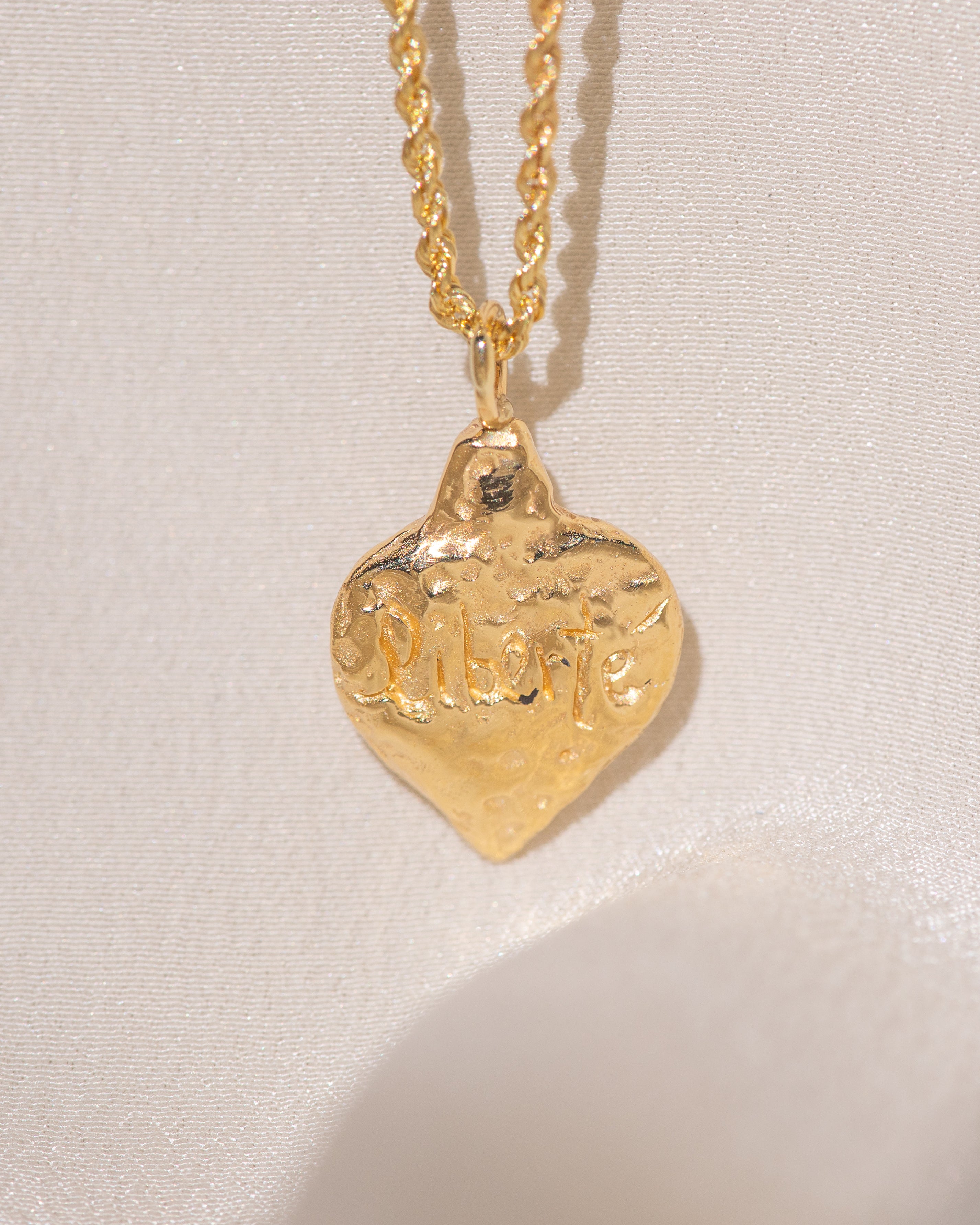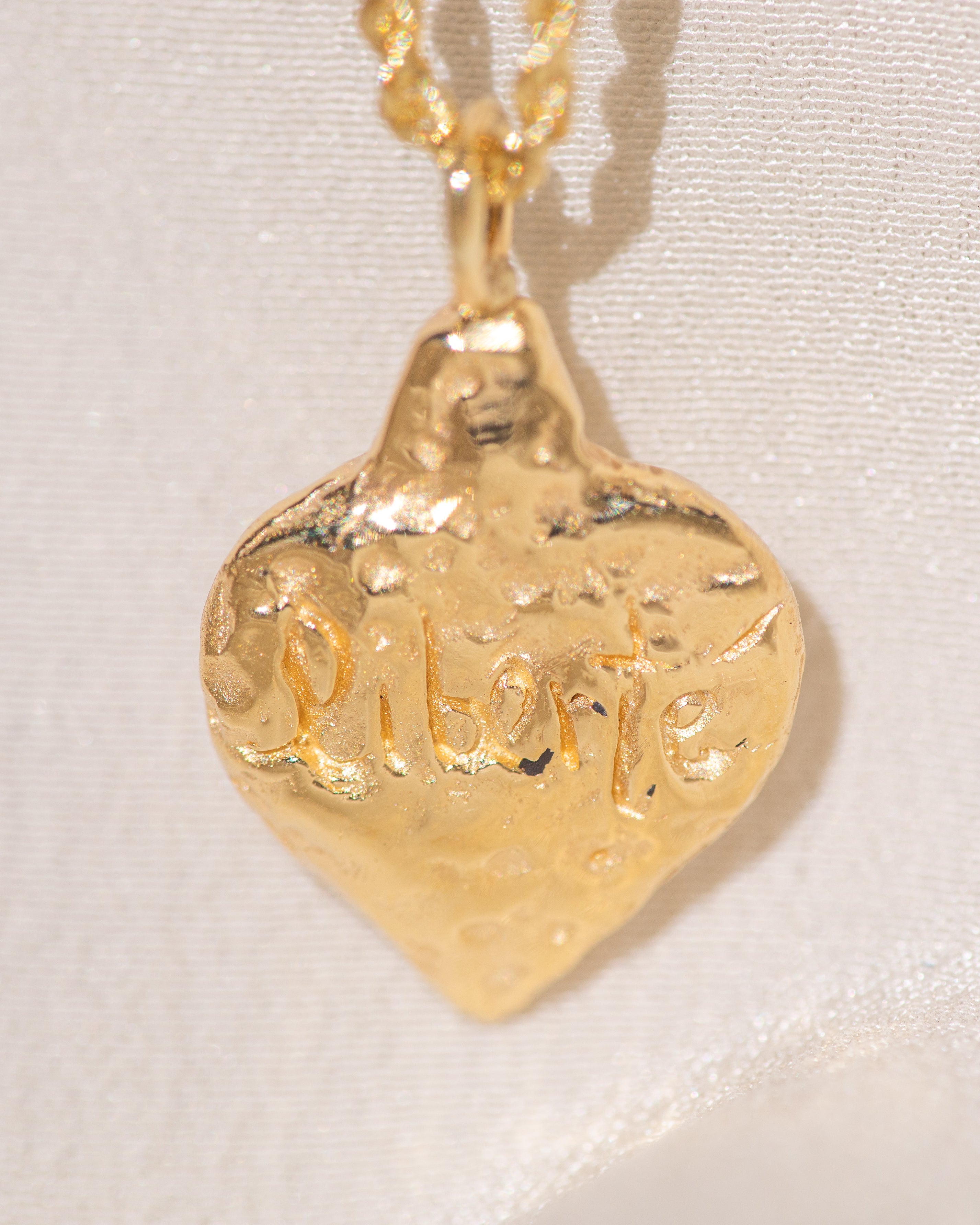 Gold heart-shaped medallion necklace featuring hand carved "liberty" in the back