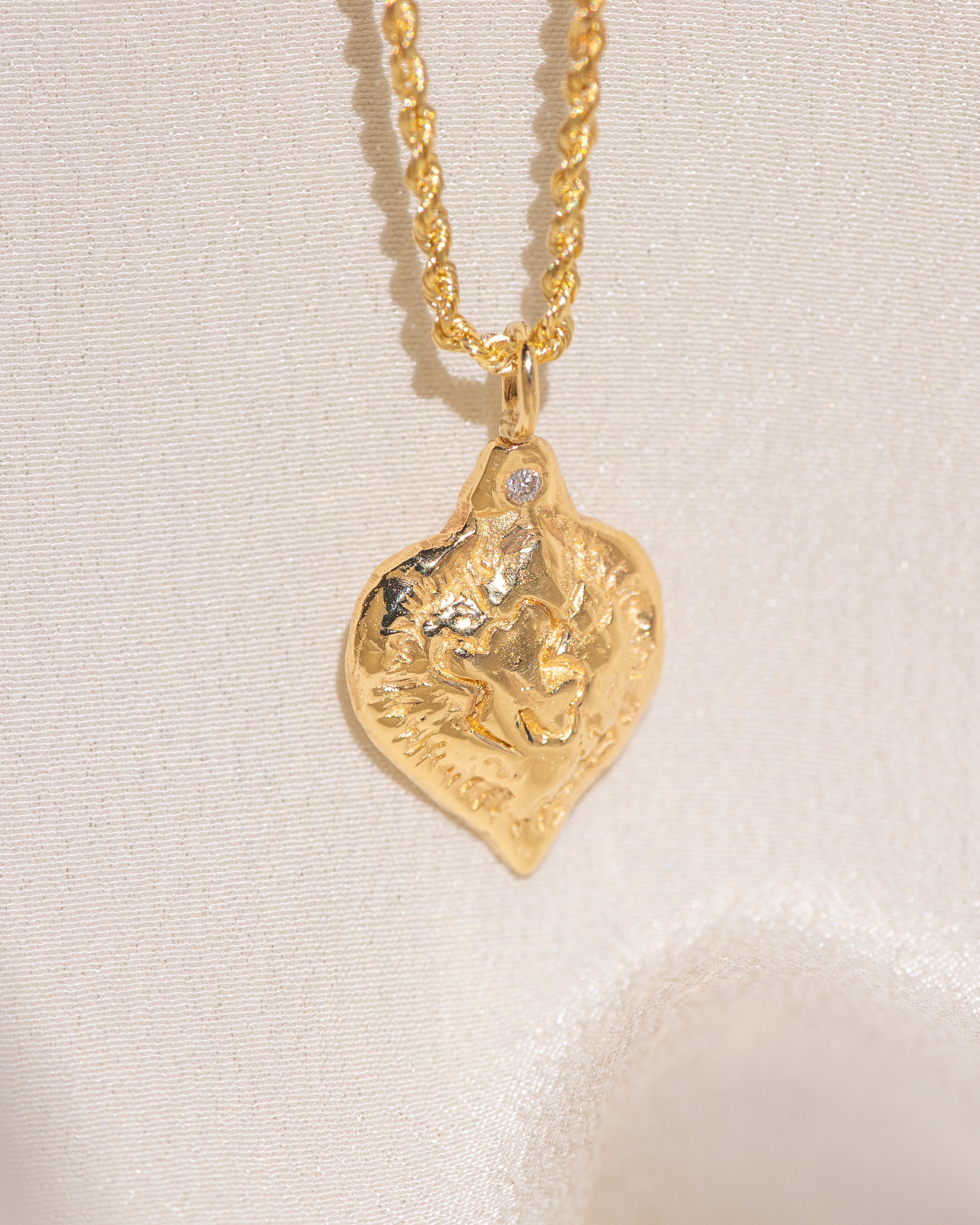Gold heart-shaped medallion necklace featuring a white diamond and a dove on rope chain