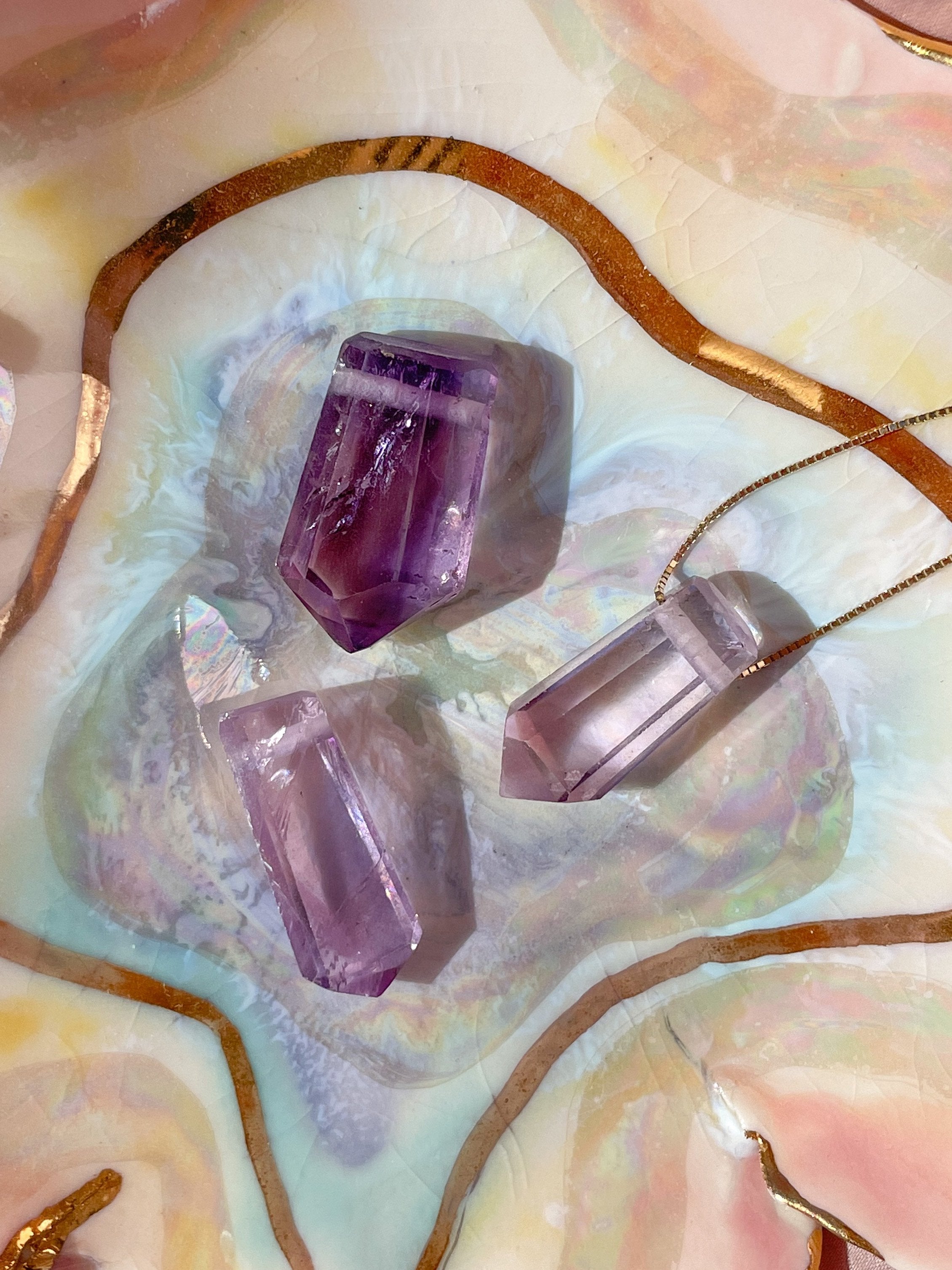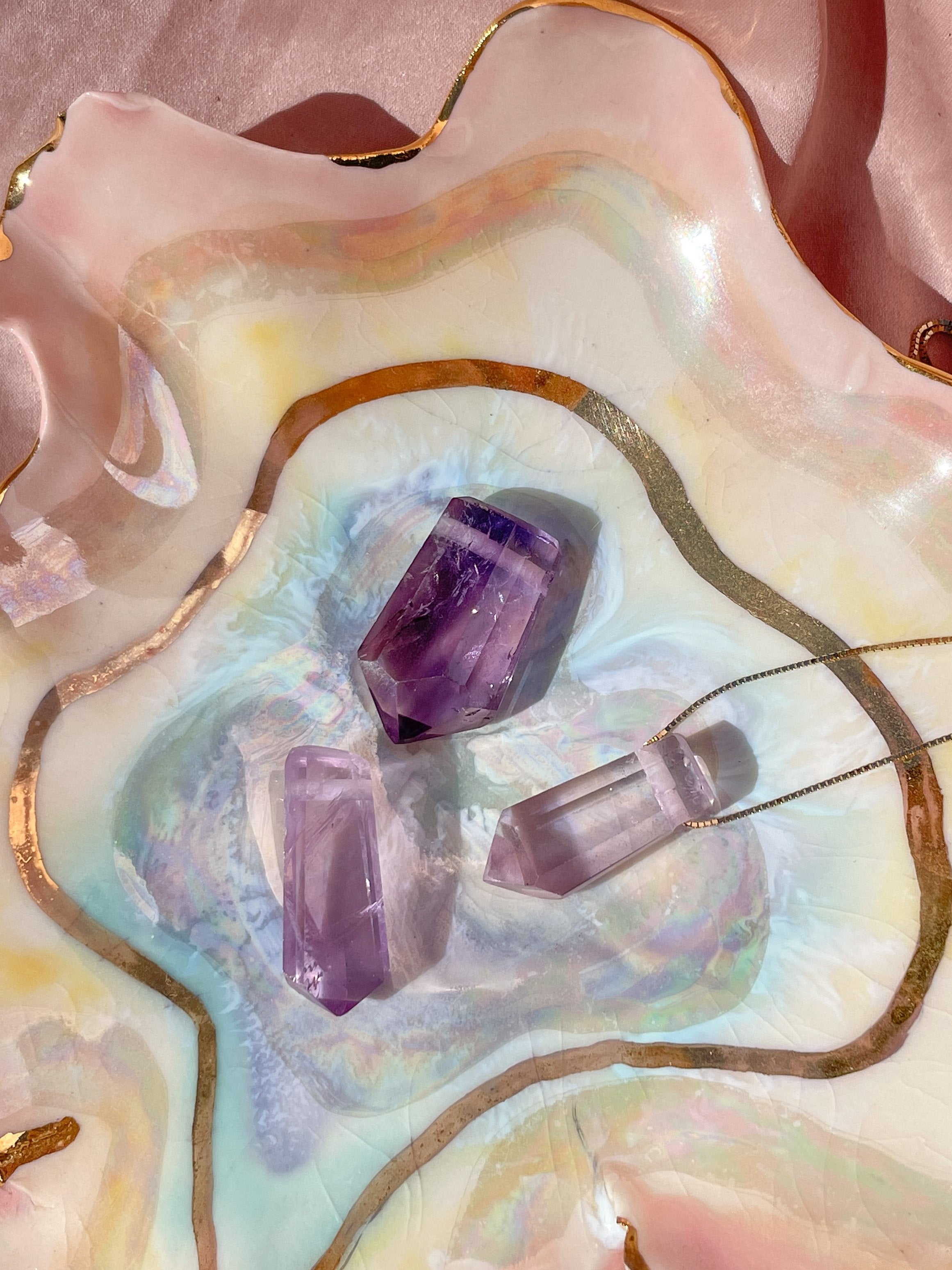 Amethyst is a natural protection stone, creating a cohesion and an open flow of energy to travel and unblock your crown, third eye, and solar plexus chakras. Amethyst is ideal for those wanting to awaken and deepen their sense of spirituality, helping release toxic patterns of behavior or emotional baggage that no longer serve you. It allows you to become more psychically attuned, linking you to your intuition to know what your soul’s purpose is and aligning you to your Divine Self. Amethyst allows you to see unlimited possibilities, opening doors and creating more opportunities to draw in prosperity and abundance. It increases optimism, self-confidence and esteem, releasing fear of success or growth. Amethyst promotes a motivated mindset, unlocking your creative force for the ultimate manifestation of your goals through the alignment and awareness of your true purpose in life.