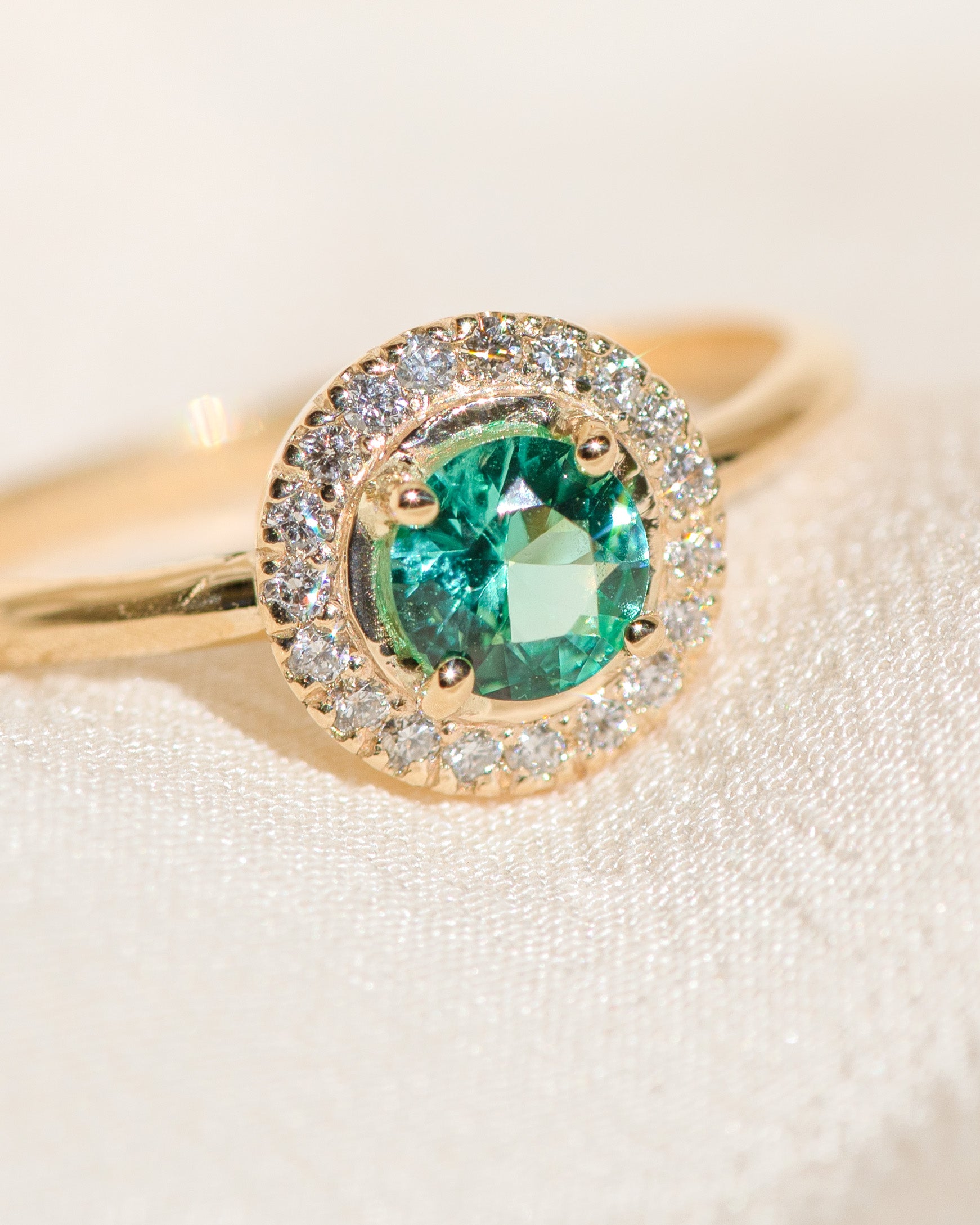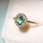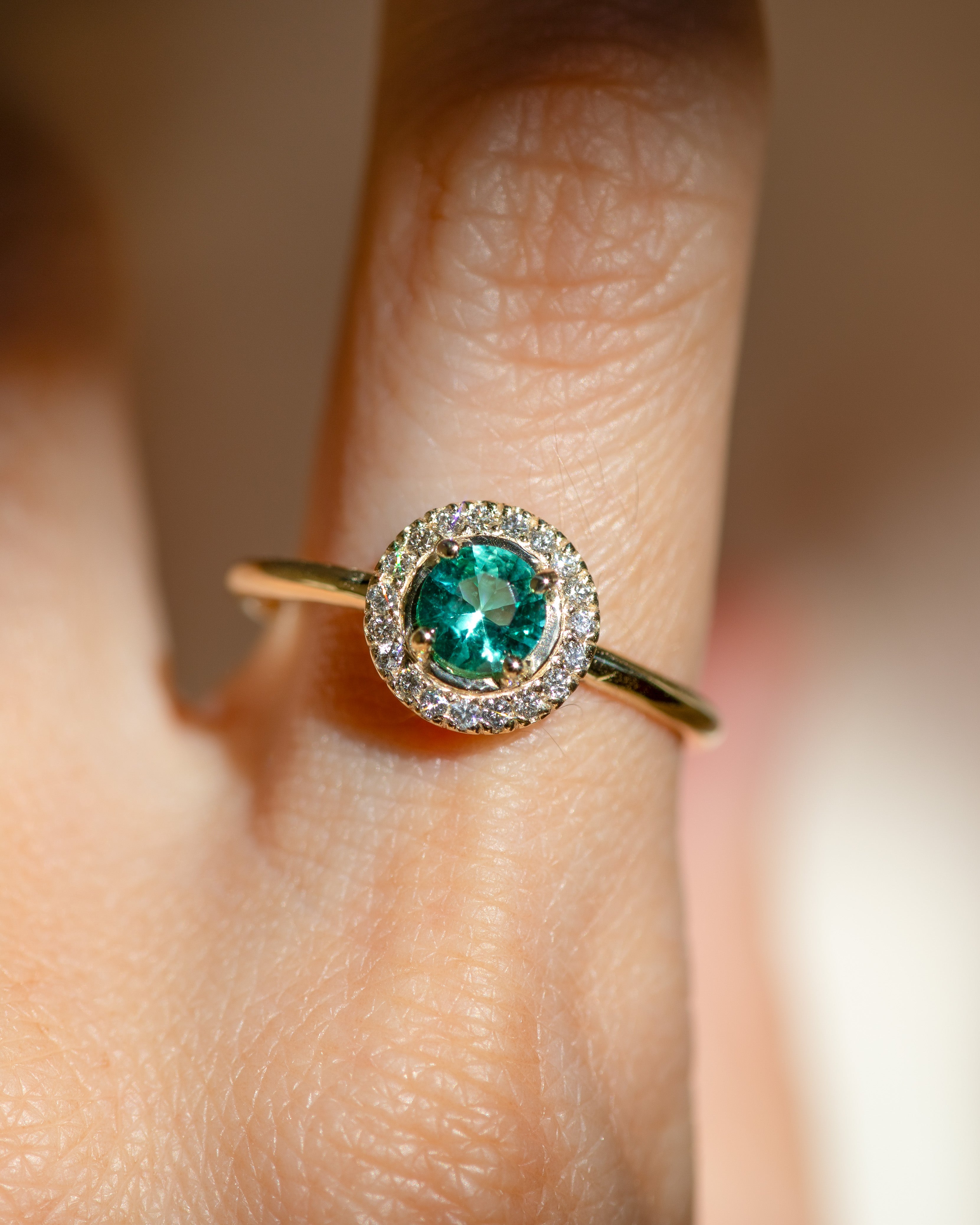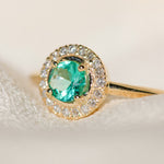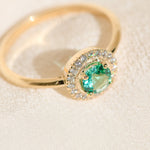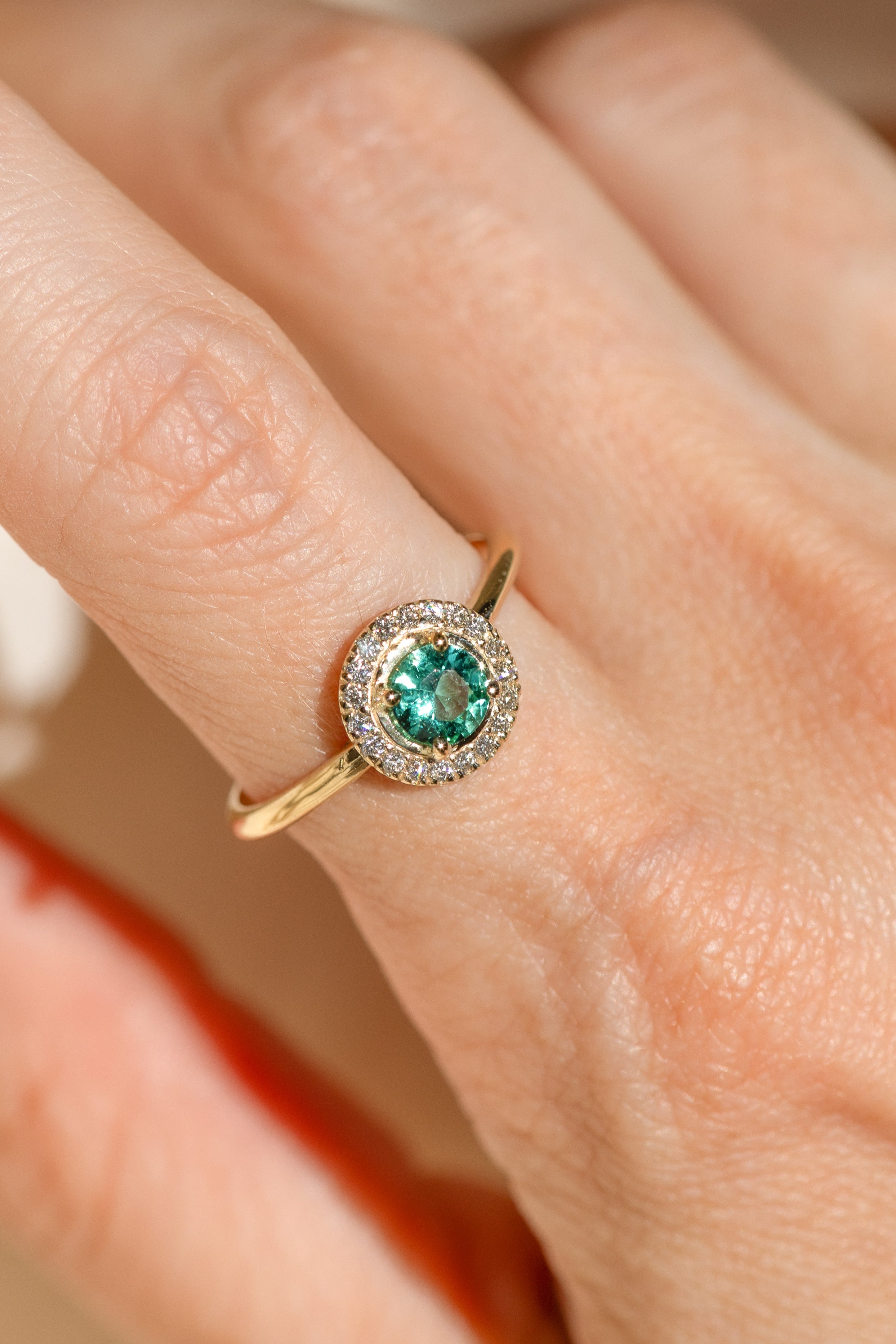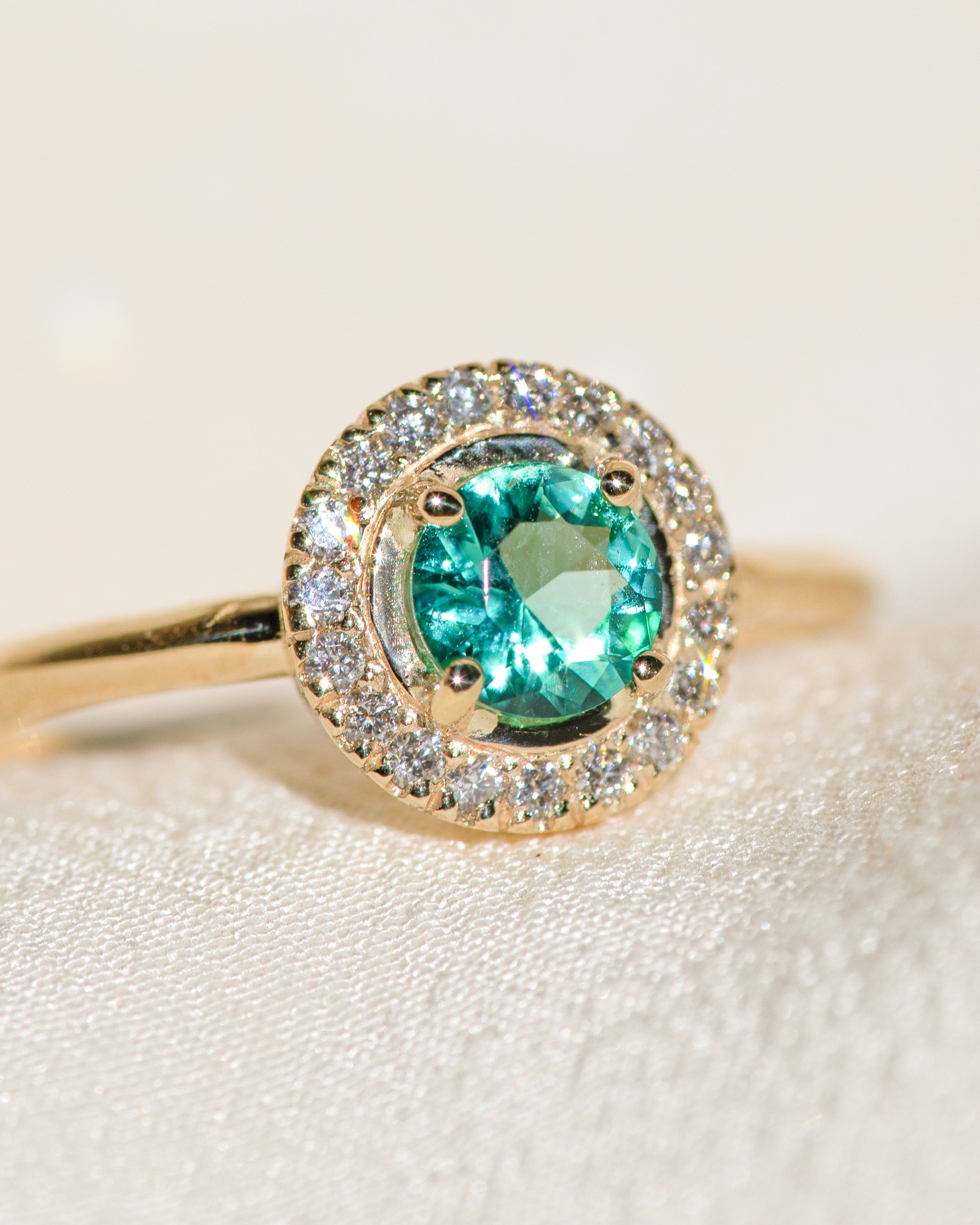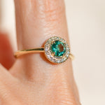 One of a kind 14k Yellow Gold ring featuring a stunning 0.40 CT round Zambian Emerald, snuggled by a halo of White Diamonds. Created to inspire regality, reminding you of your innate Divinity, to fill you with unconditional love and harmonize your strength, softness and power. Natural inclusions may be present within the stone.