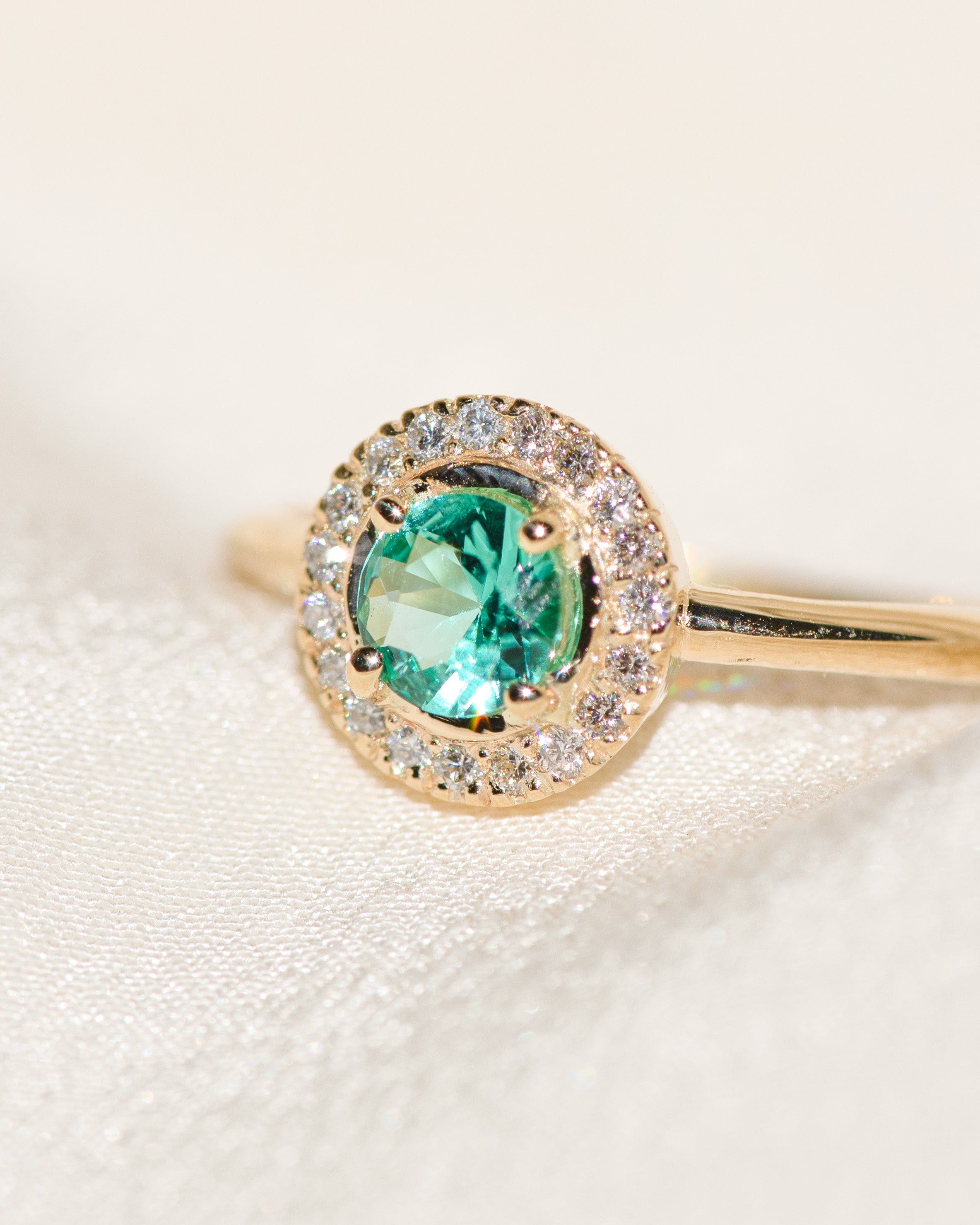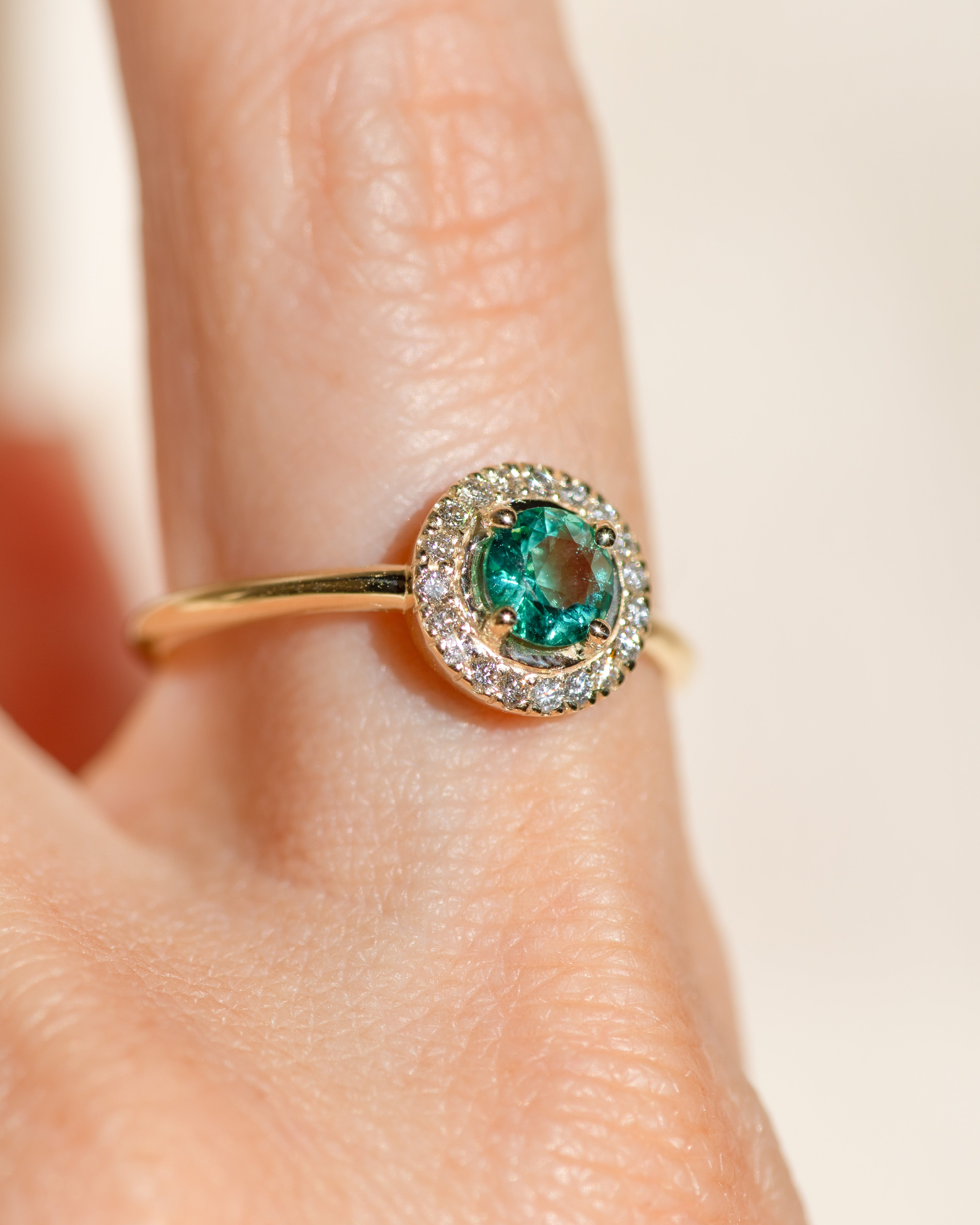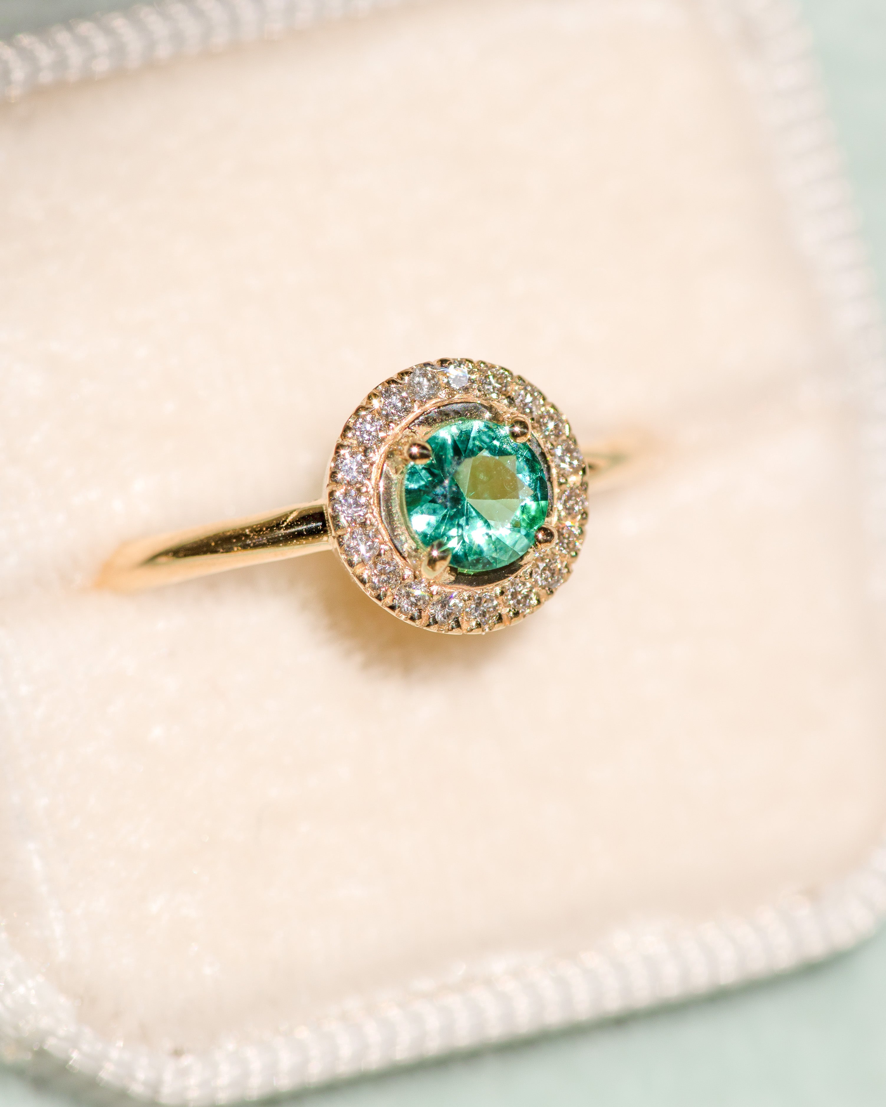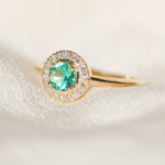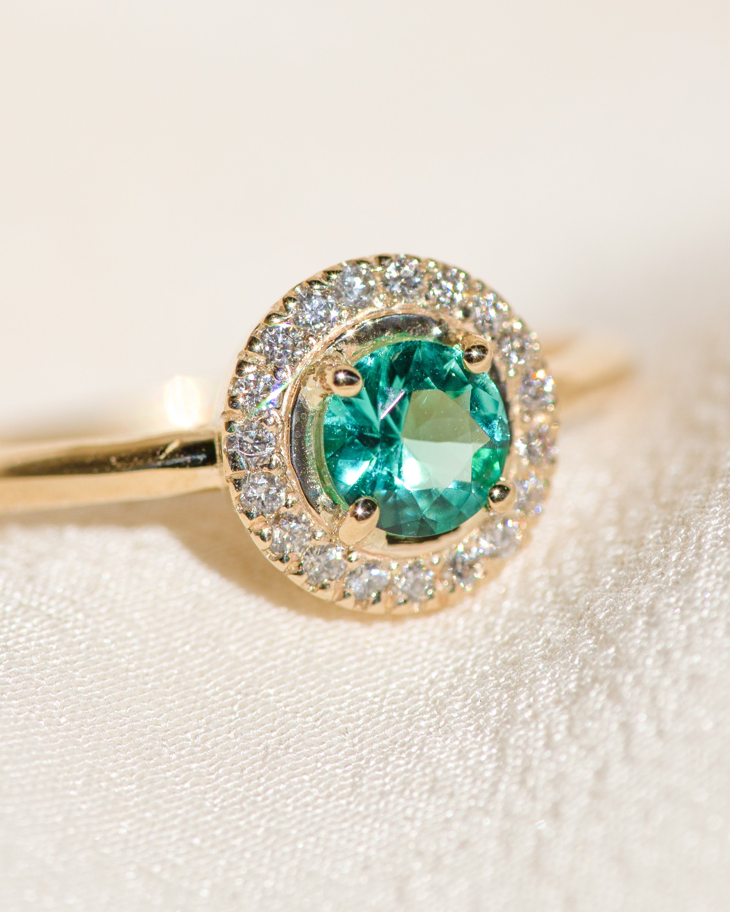 One of a kind 14k Yellow Gold ring featuring a stunning 0.40 CT round Zambian Emerald, snuggled by a halo of White Diamonds. Created to inspire regality, reminding you of your innate Divinity, to fill you with unconditional love and harmonize your strength, softness and power. Natural inclusions may be present within the stone.