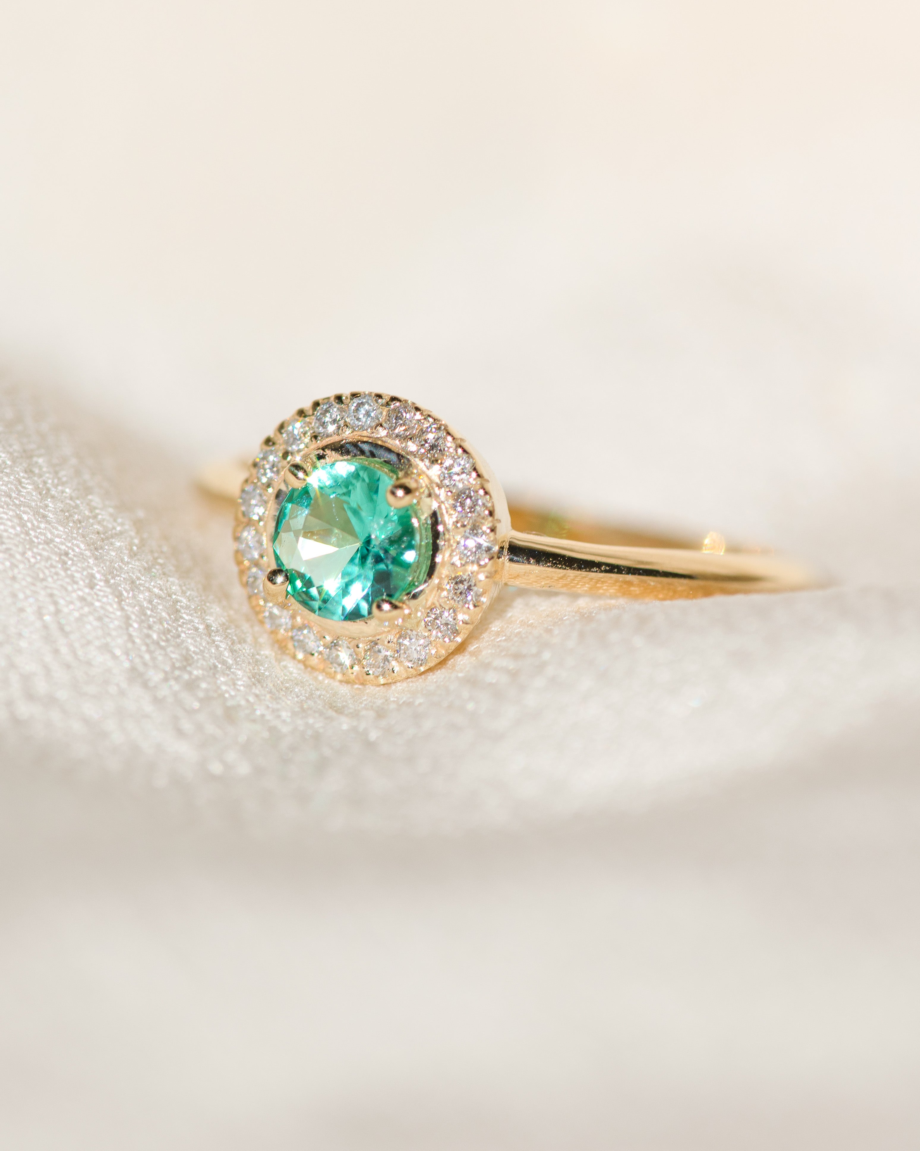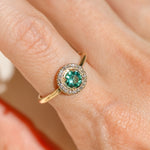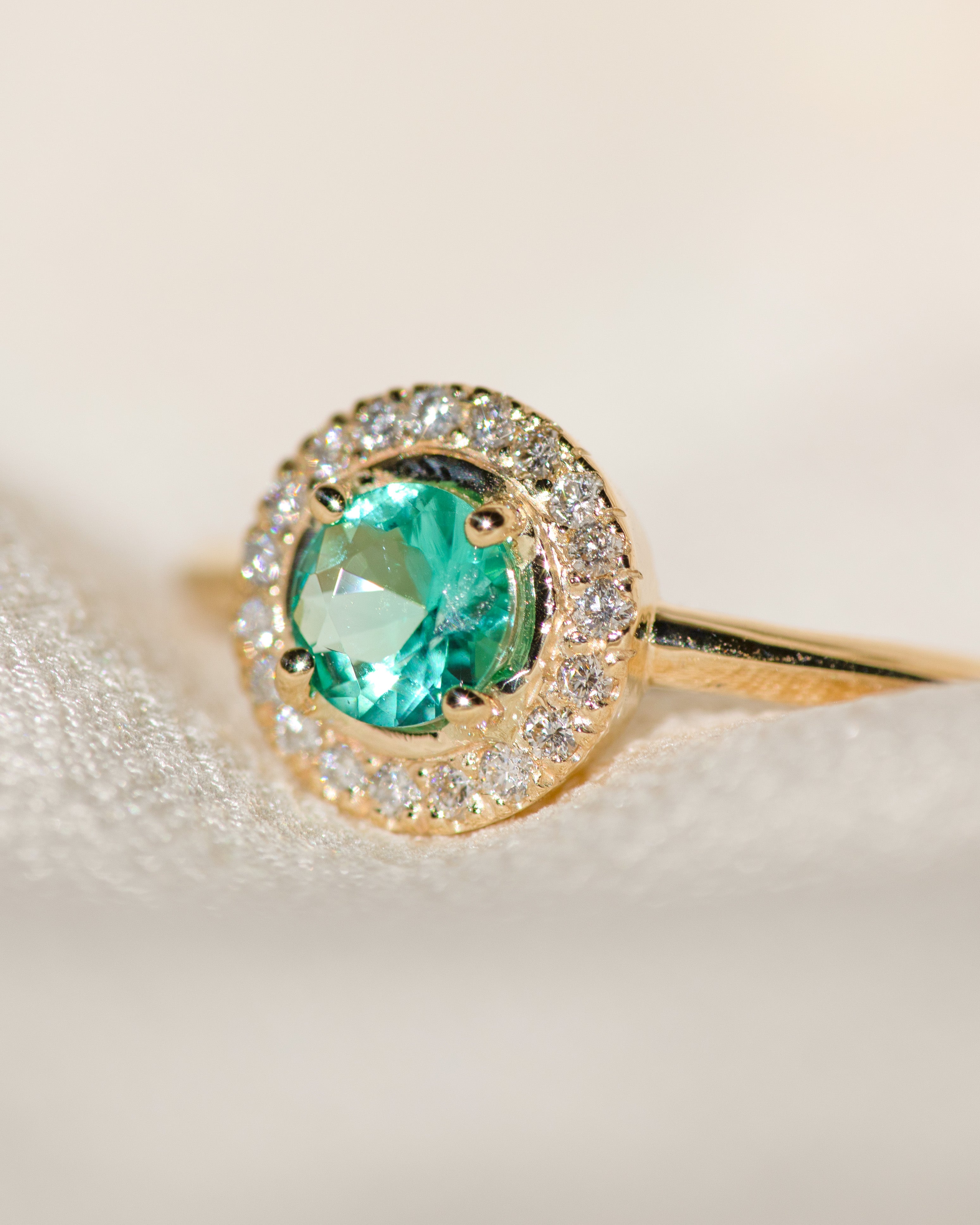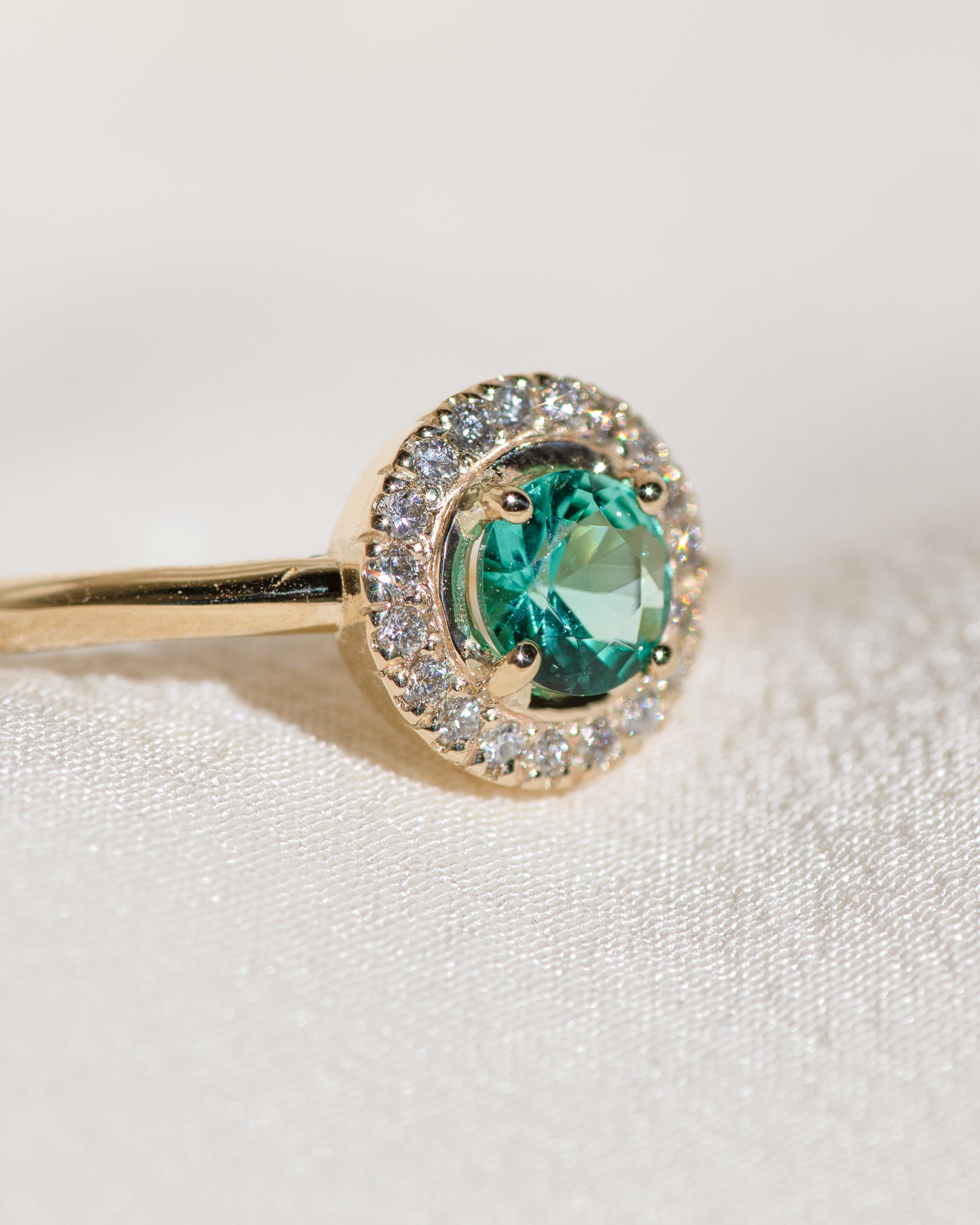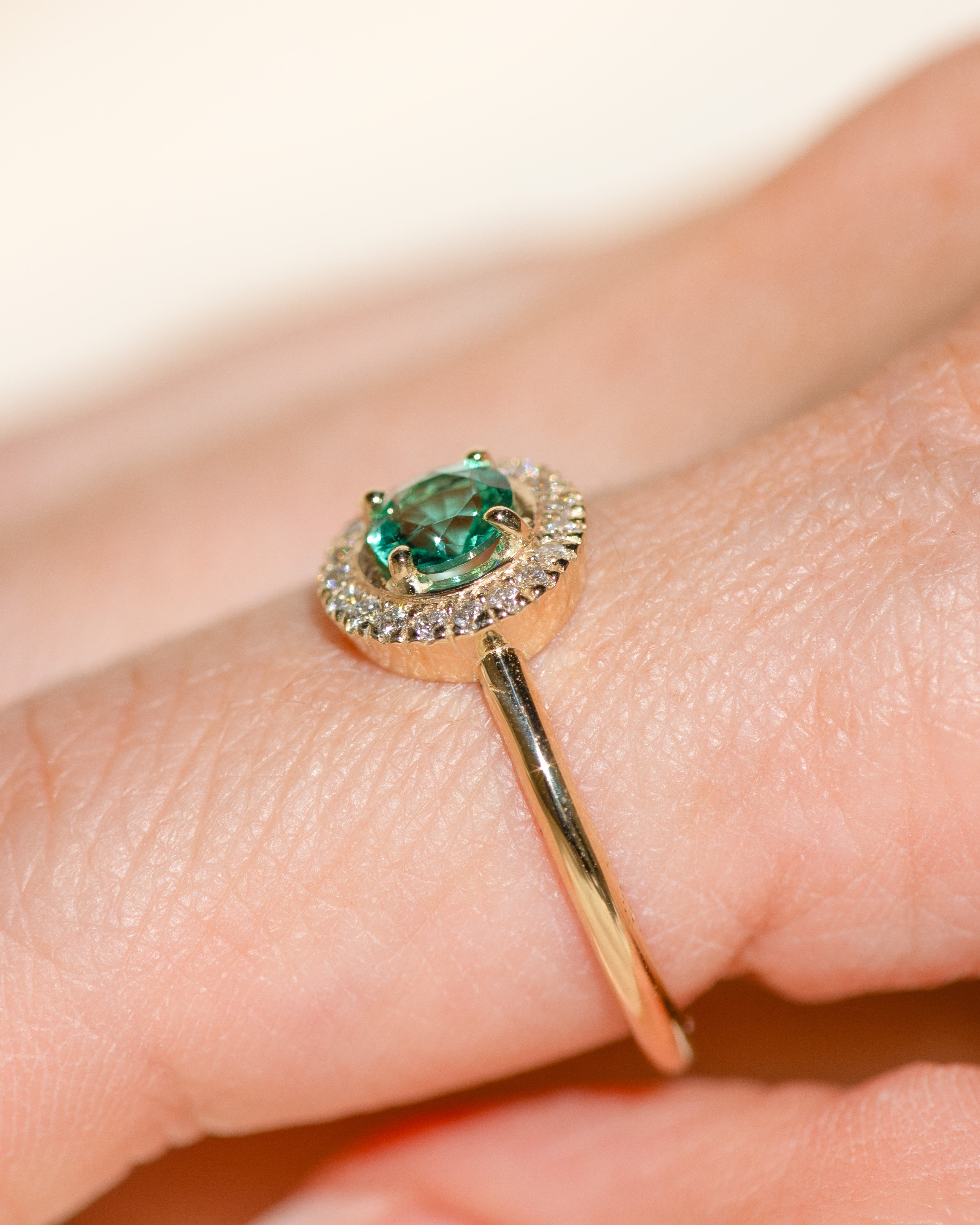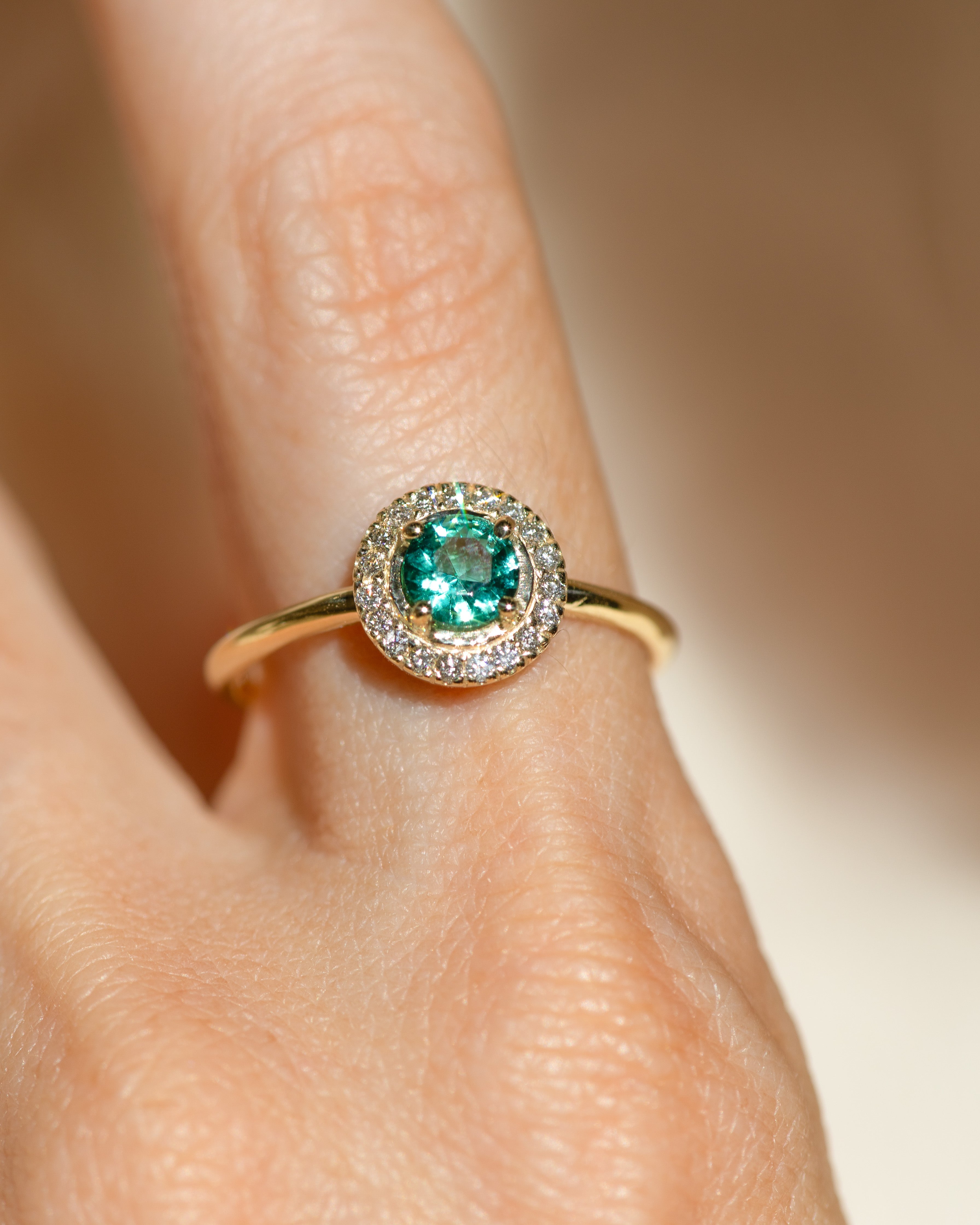 One of a kind 14k Yellow Gold ring featuring a stunning 0.40 CT round Zambian Emerald, snuggled by a halo of White Diamonds. Created to inspire regality, reminding you of your innate Divinity, to fill you with unconditional love and harmonize your strength, softness and power. Natural inclusions may be present within the stone.
