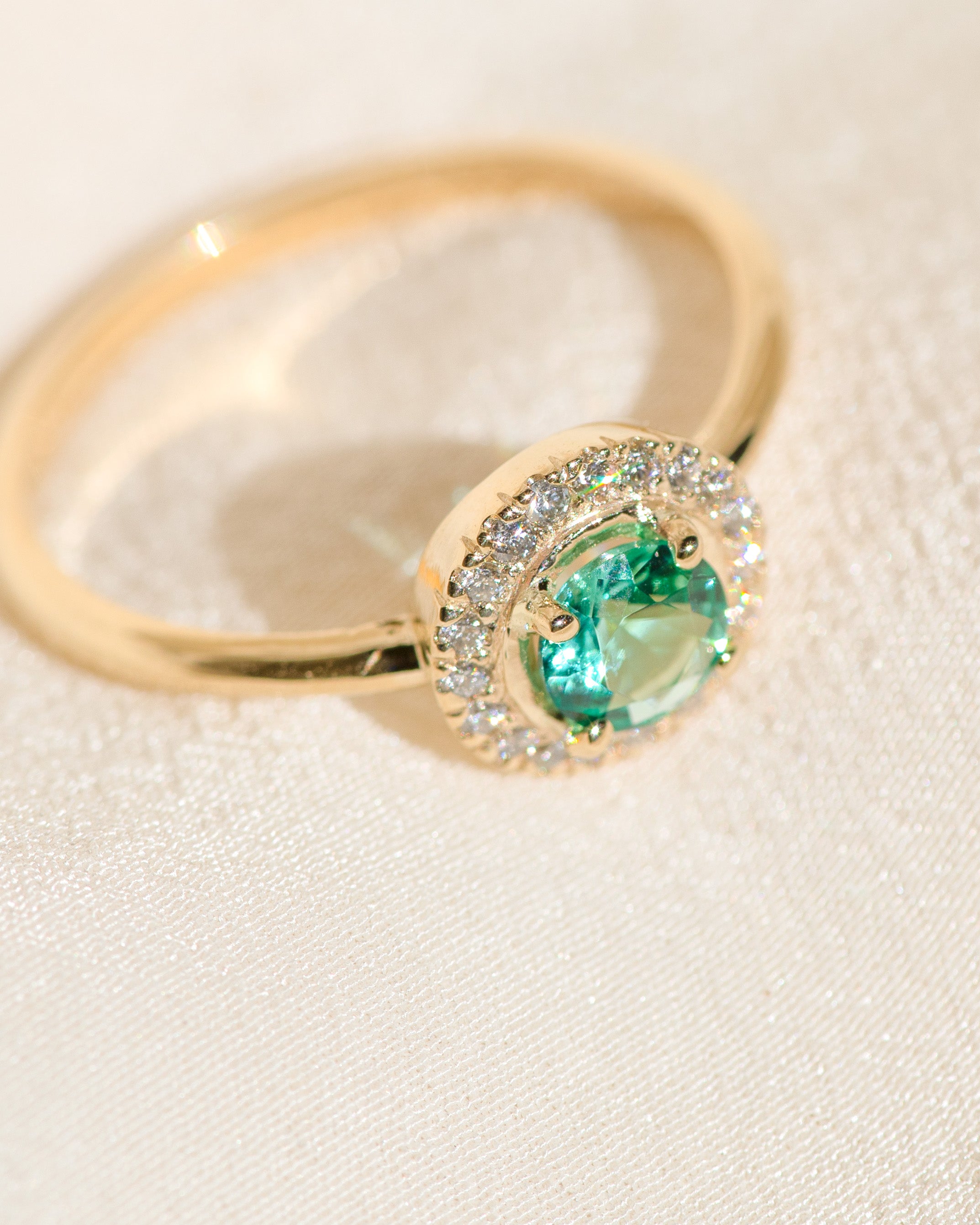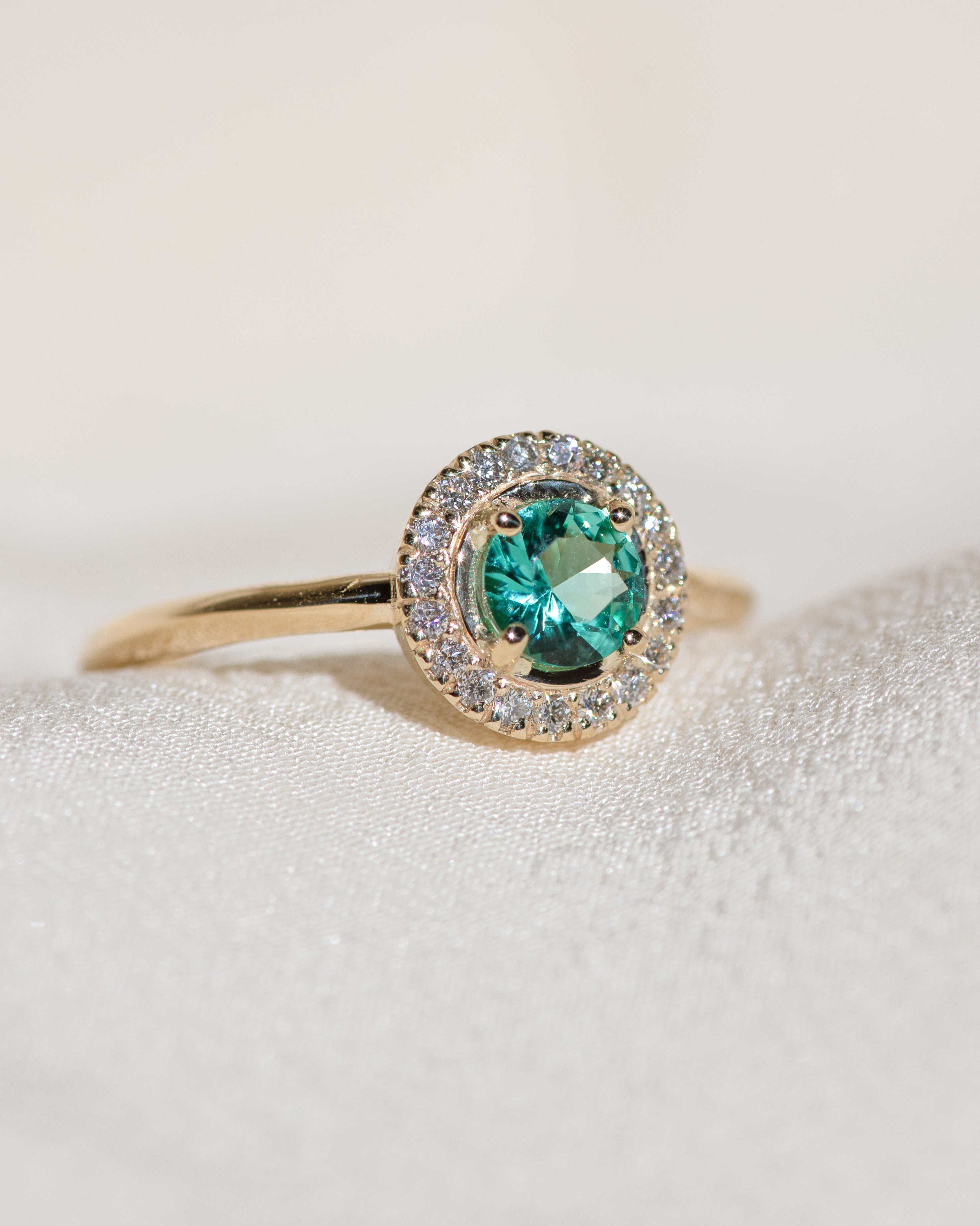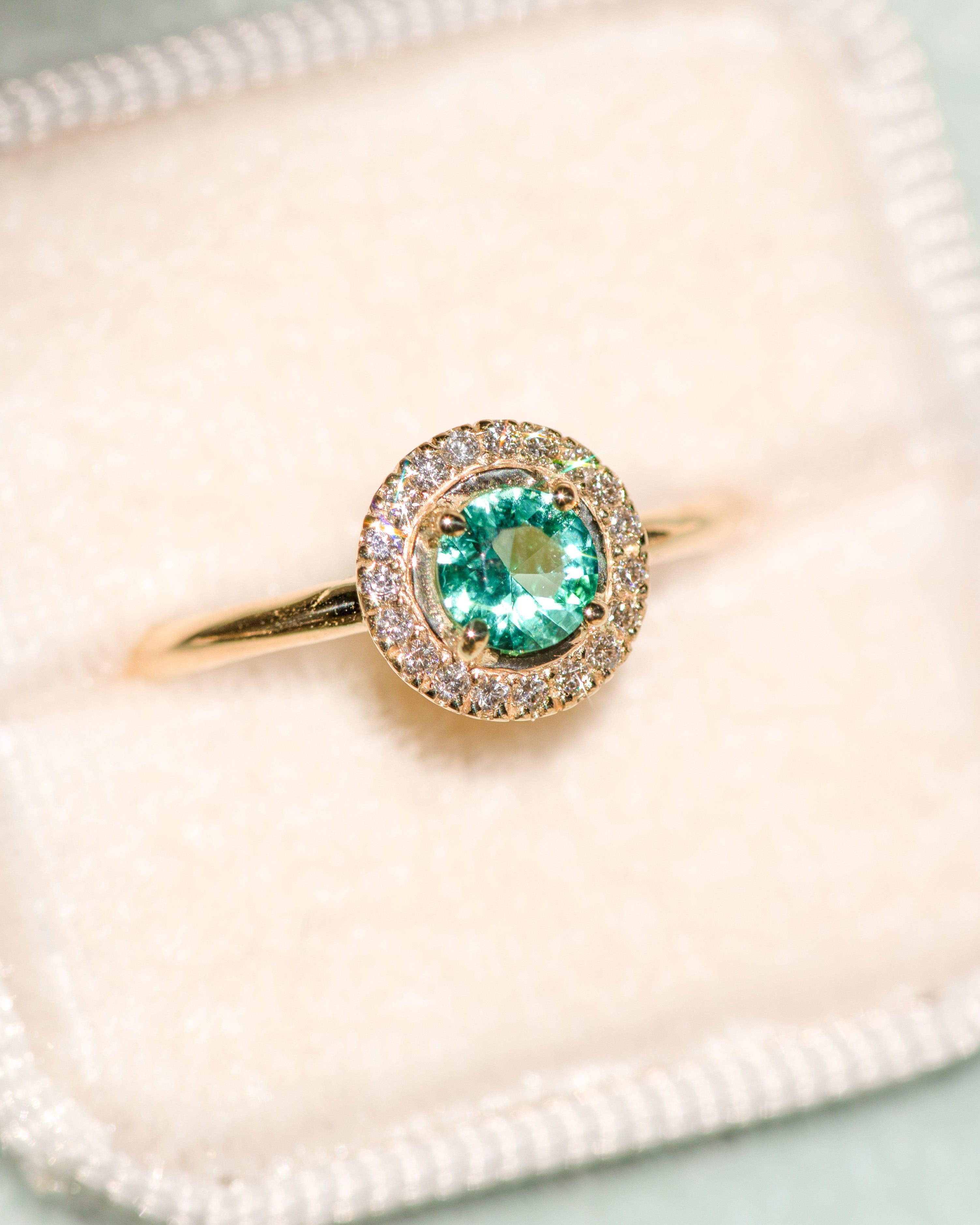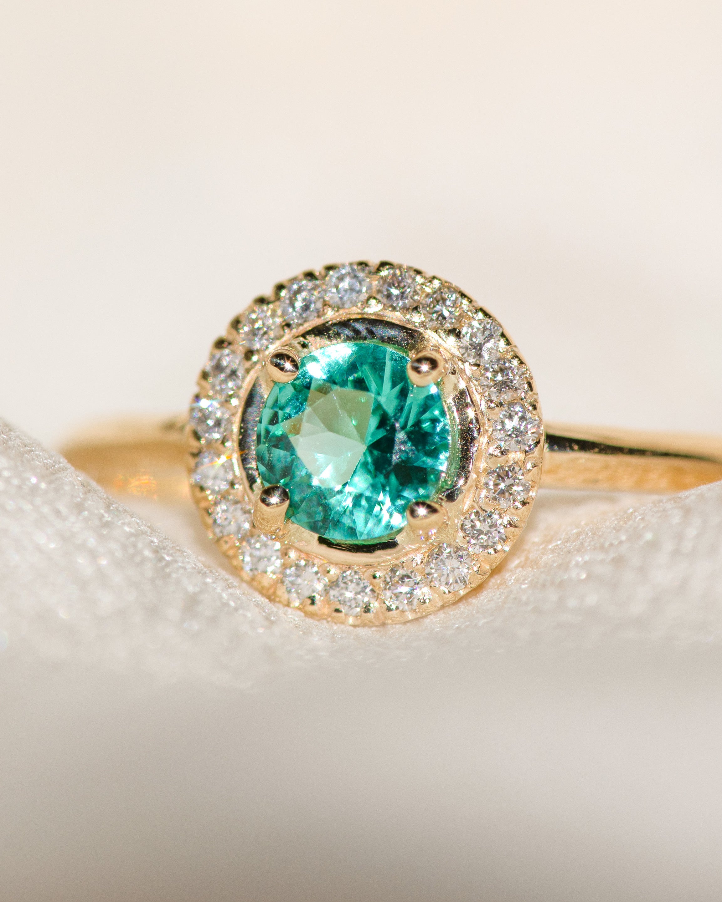 One of a kind 14k Yellow Gold ring featuring a stunning 0.40 CT round Zambian Emerald, snuggled by a halo of White Diamonds. Created to inspire regality, reminding you of your innate Divinity, to fill you with unconditional love and harmonize your strength, softness and power. Natural inclusions may be present within the stone.