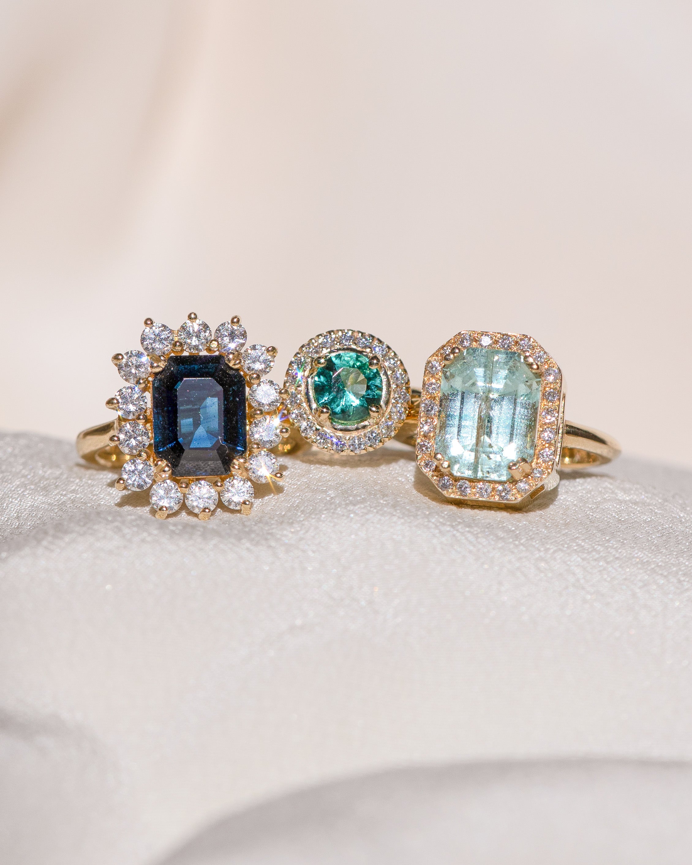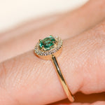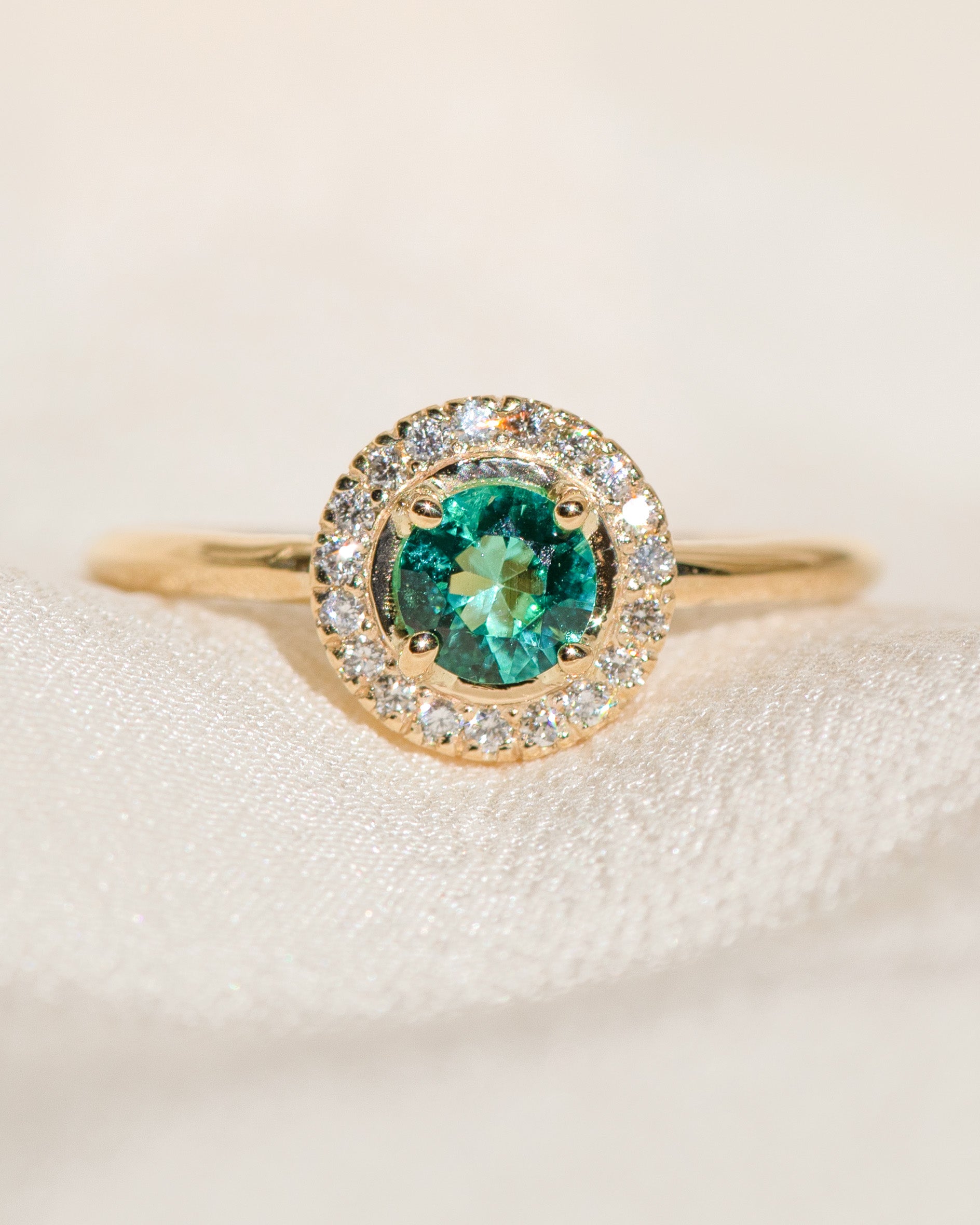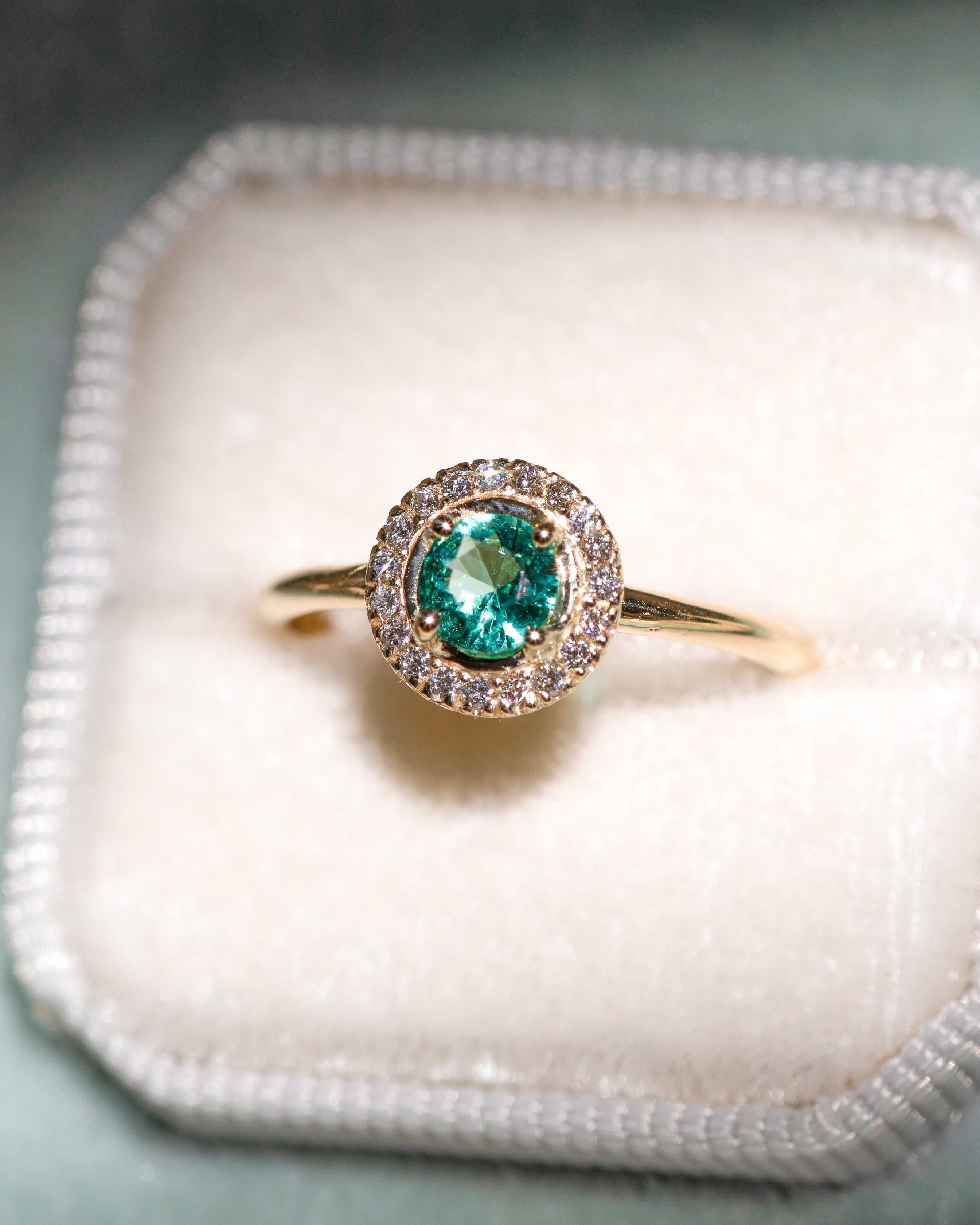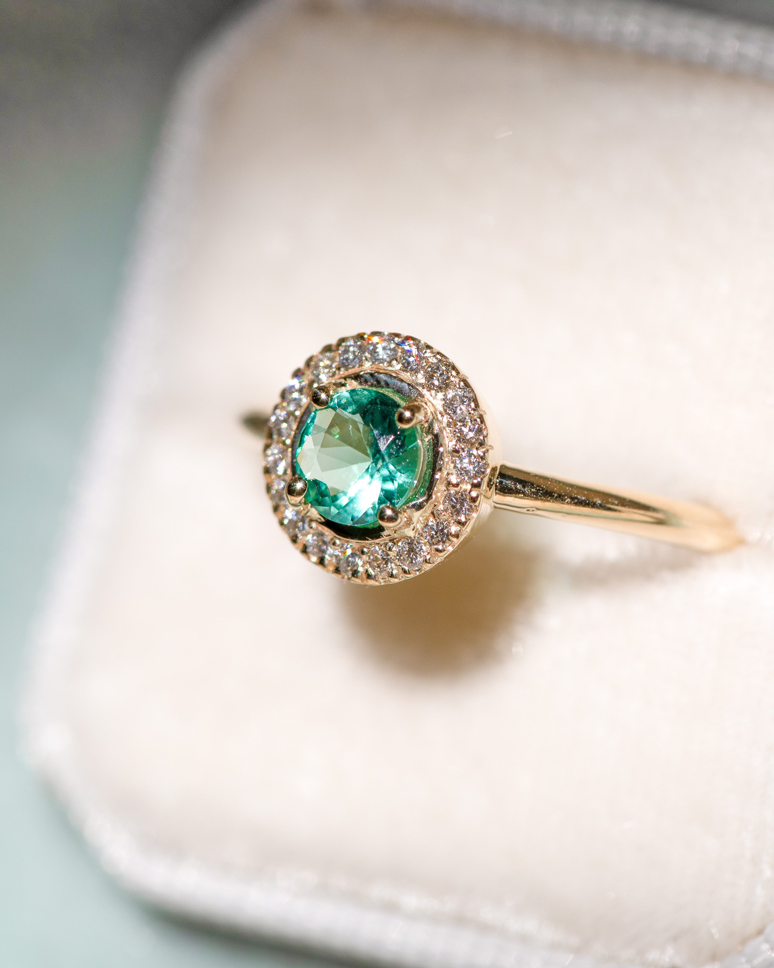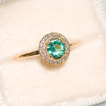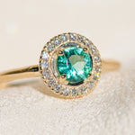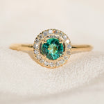 One of a kind 14k Yellow Gold ring featuring a stunning 0.40 CT round Zambian Emerald, snuggled by a halo of White Diamonds. Created to inspire regality, reminding you of your innate Divinity, to fill you with unconditional love and harmonize your strength, softness and power. Natural inclusions may be present within the stone.