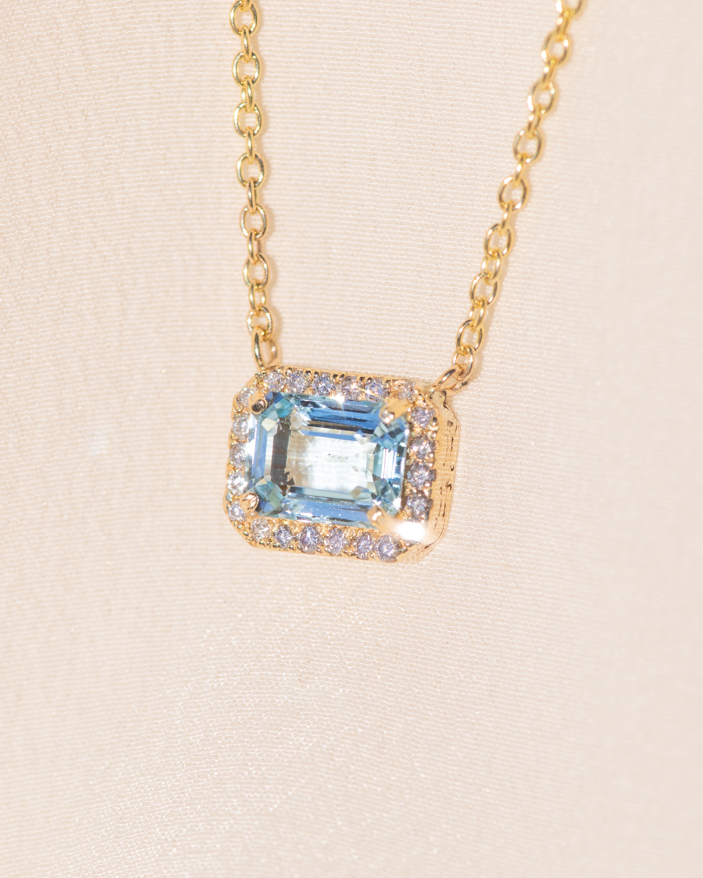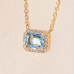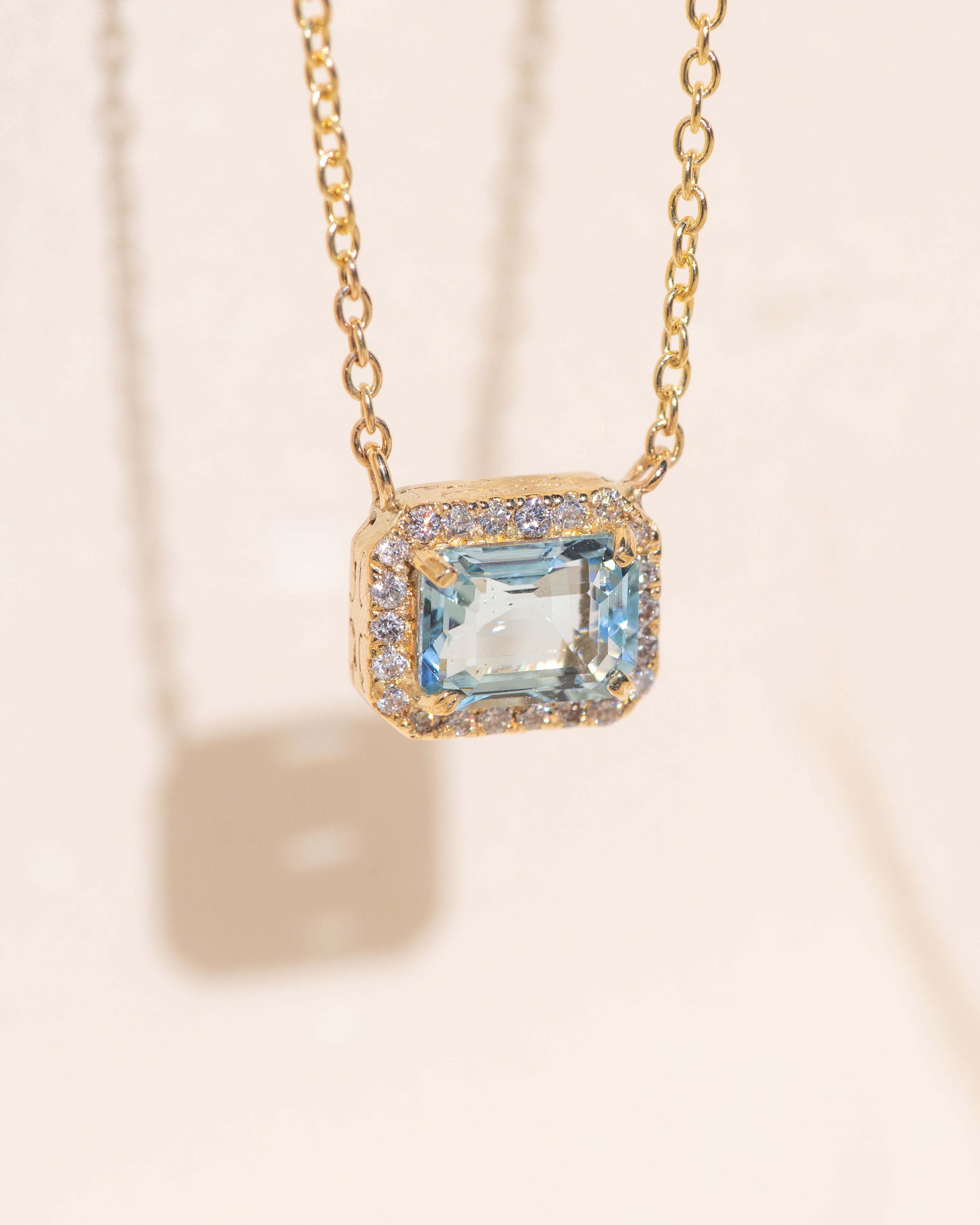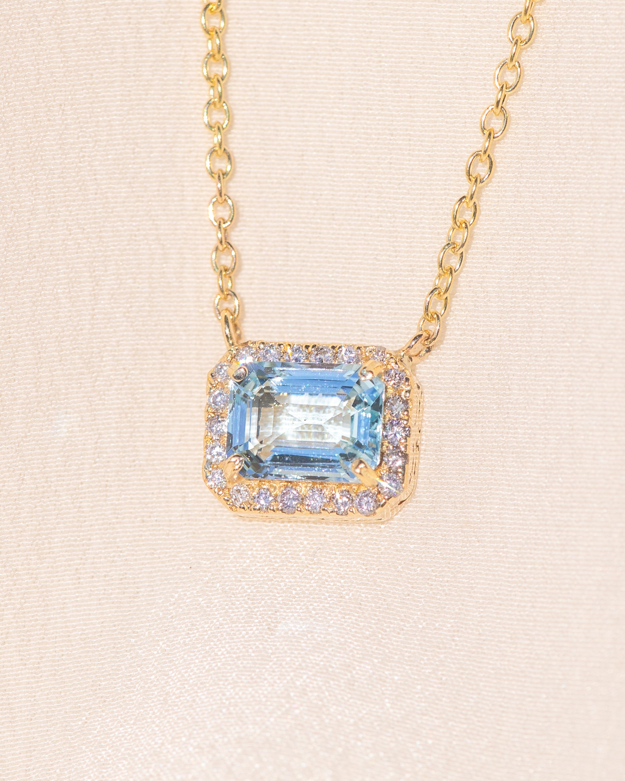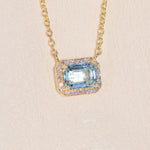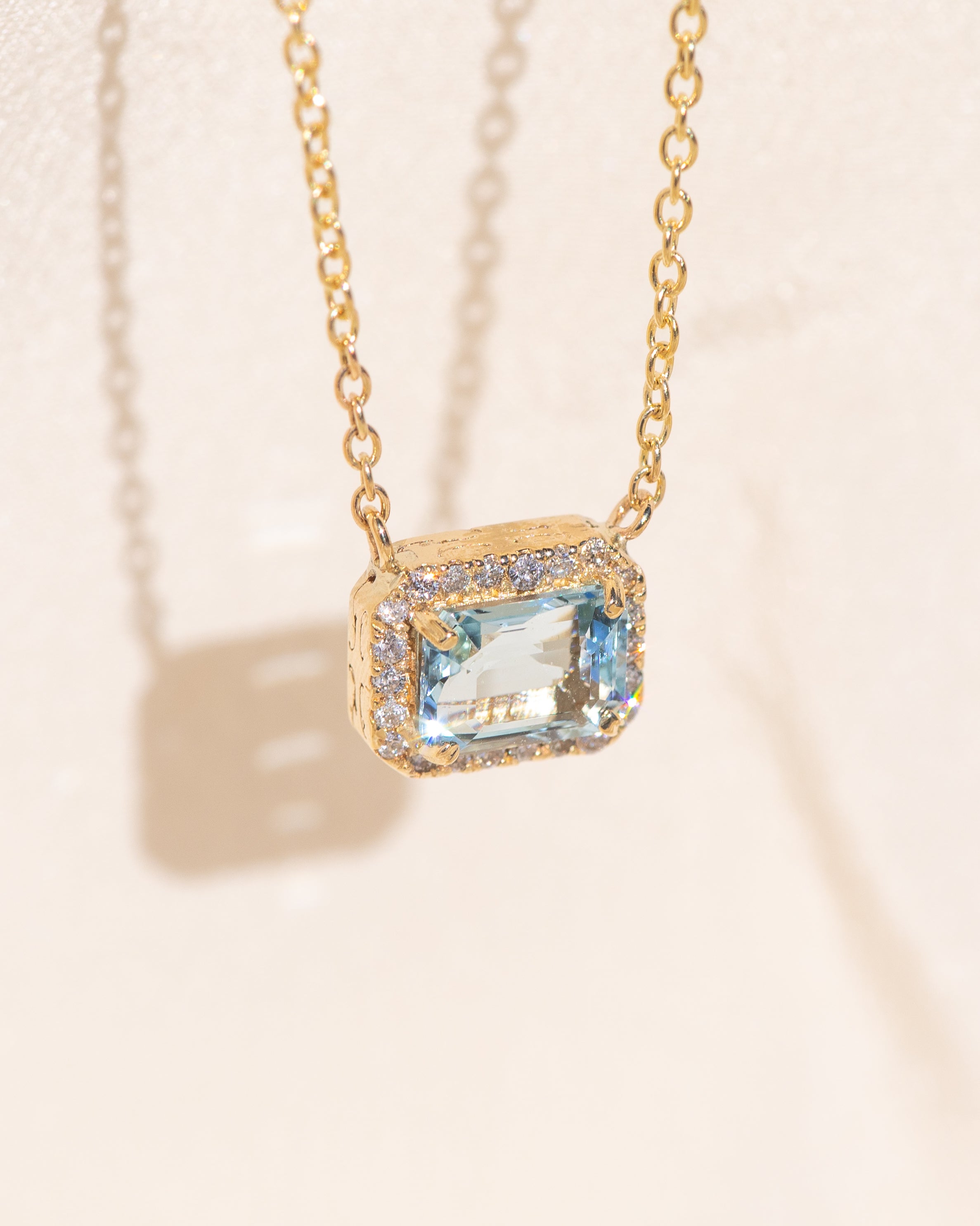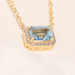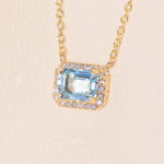 Features a stunning 8x6mm Aquamarine surrounded by a halo of White Diamonds, cast in 14k yellow gold. Set on a 16" delicate oval chain - can be made shorter, please reach out for desired length adjustments.