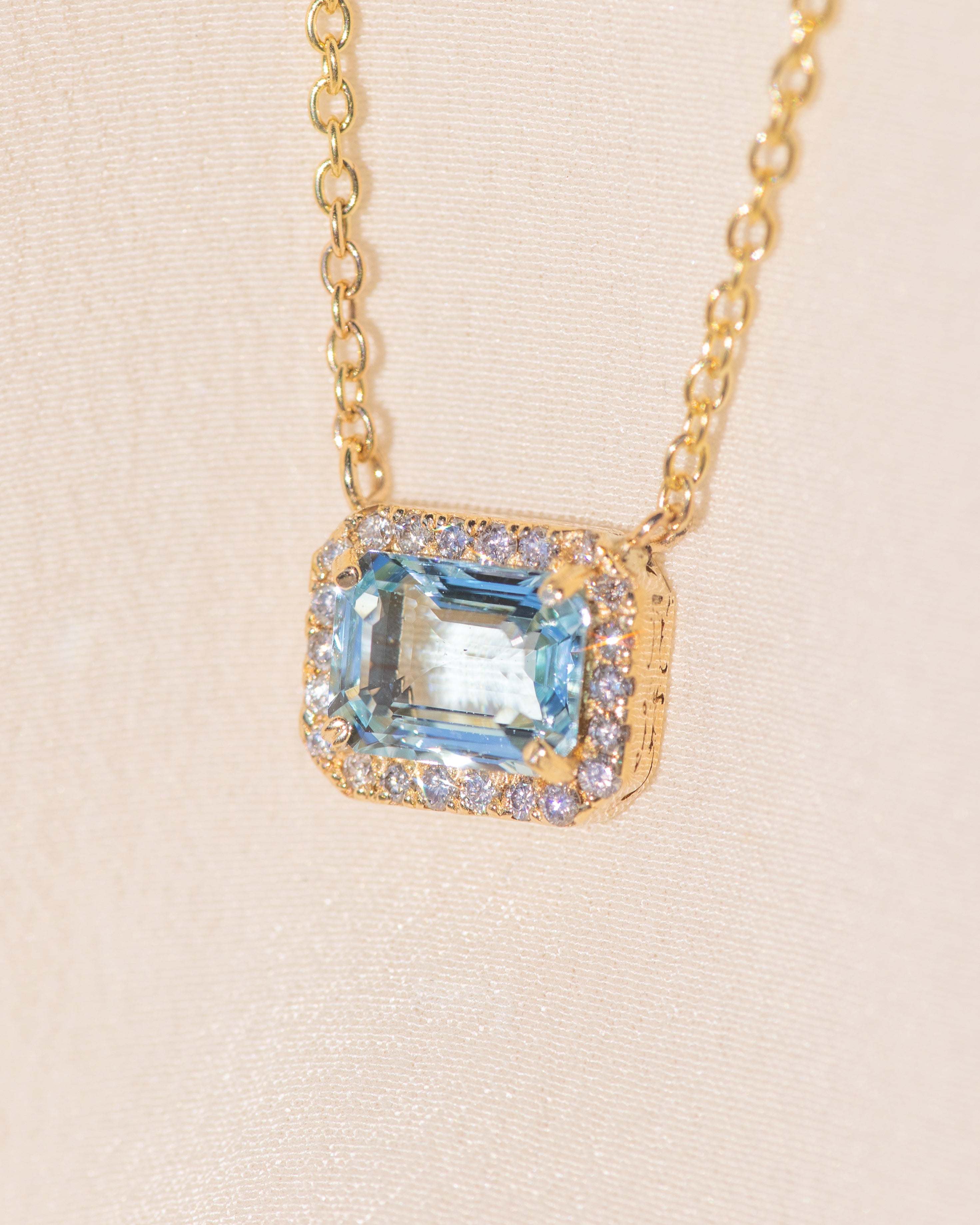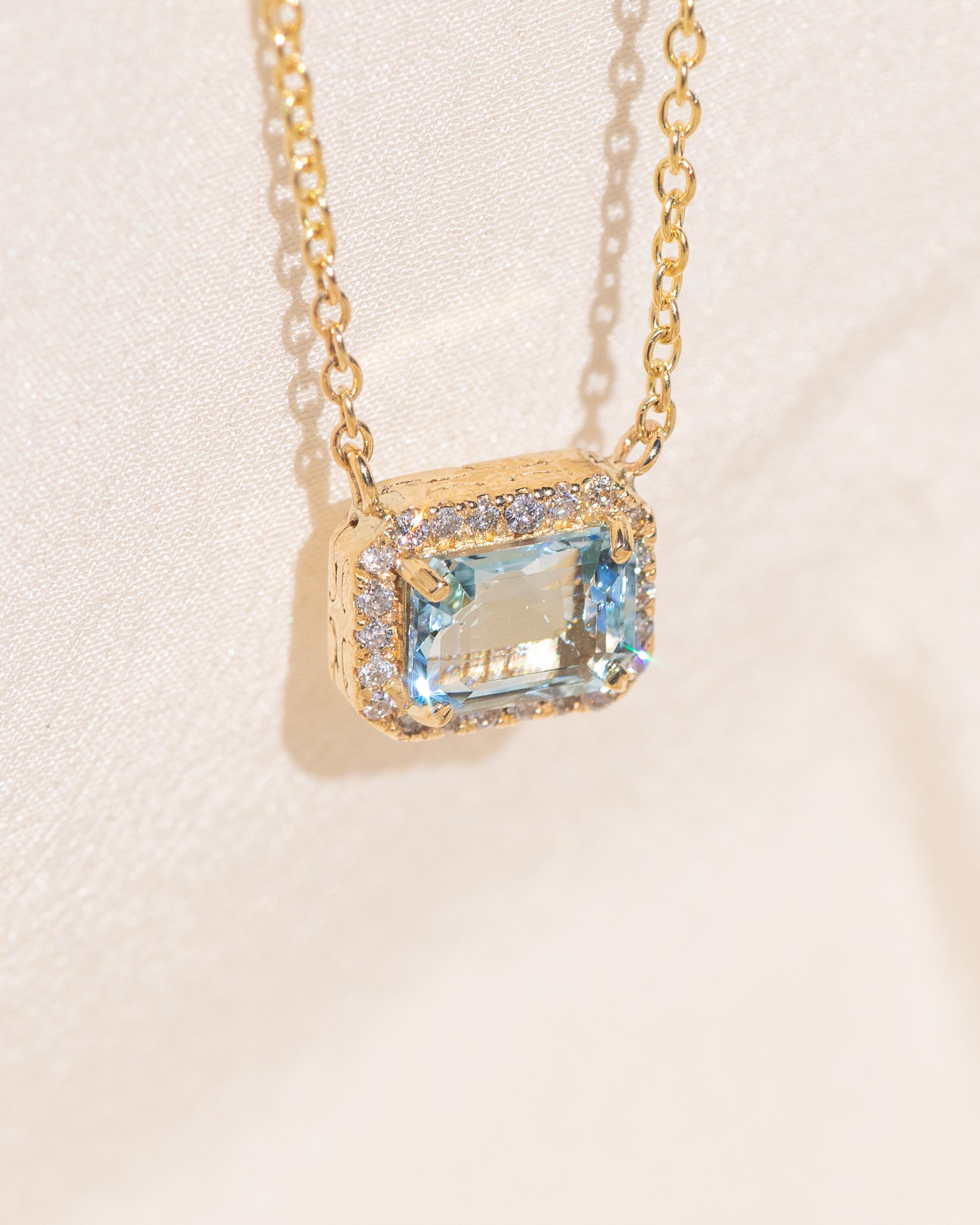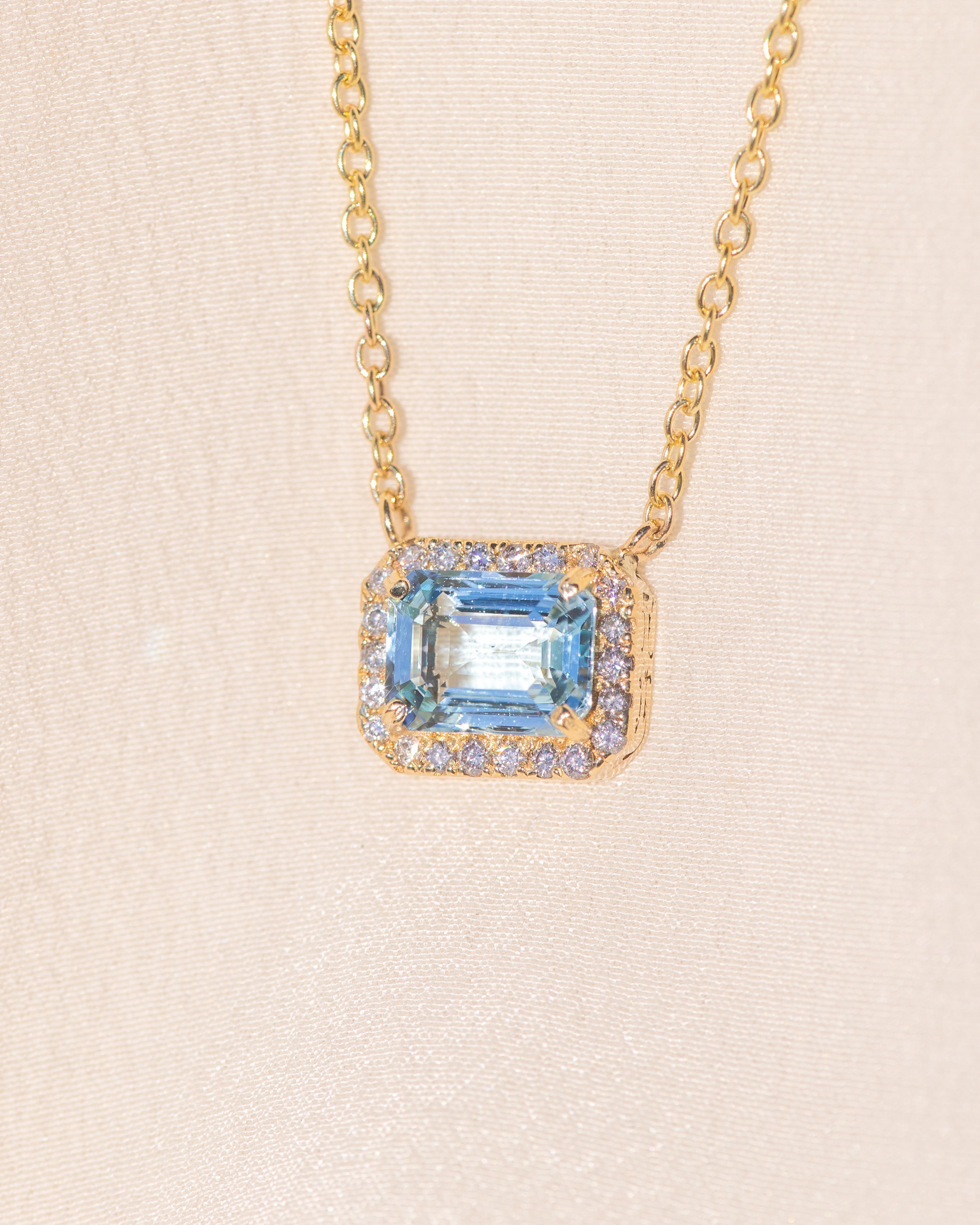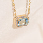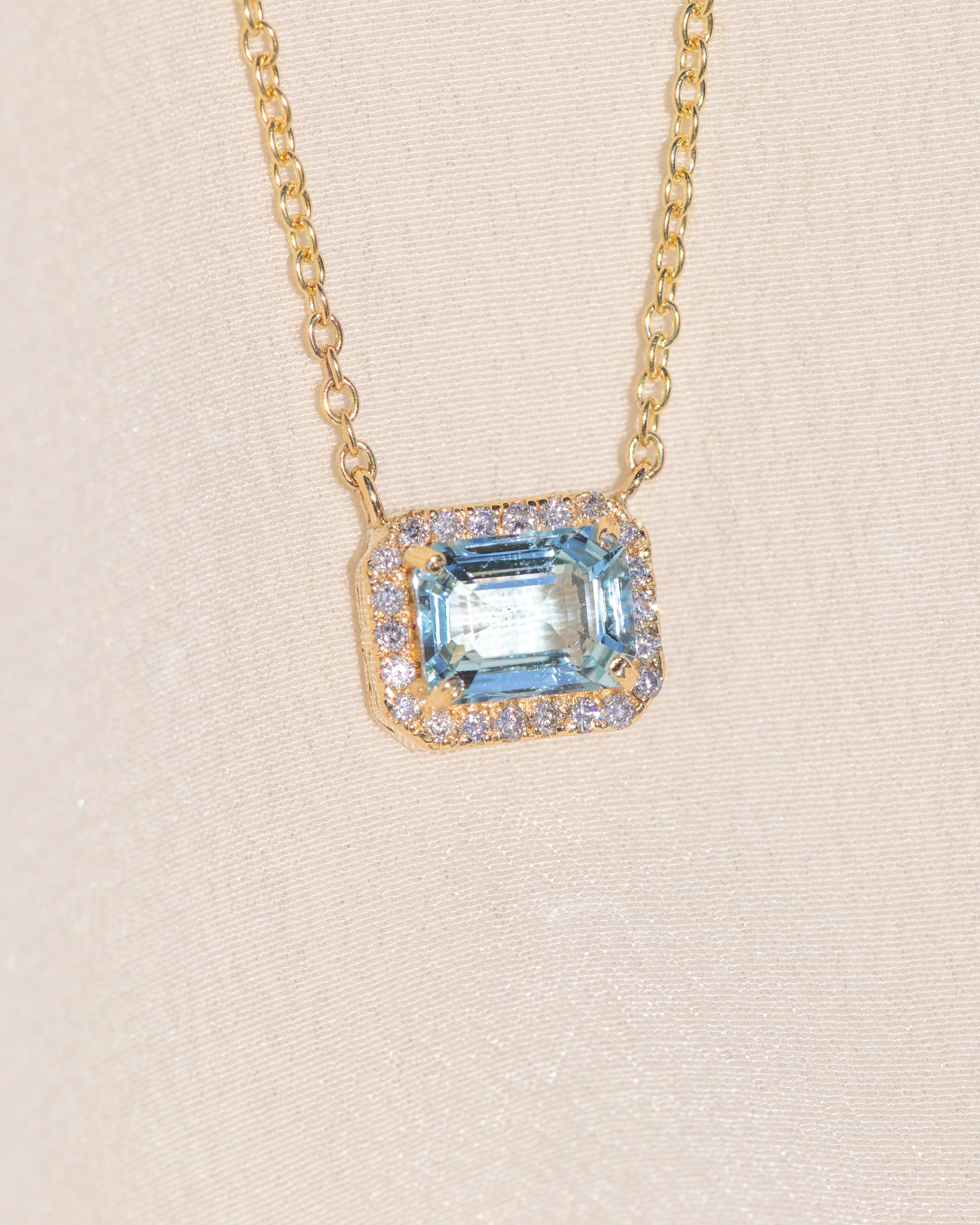 Features a stunning 8x6mm Aquamarine surrounded by a halo of White Diamonds, cast in 14k yellow gold. Set on a 16" delicate oval chain - can be made shorter, please reach out for desired length adjustments.