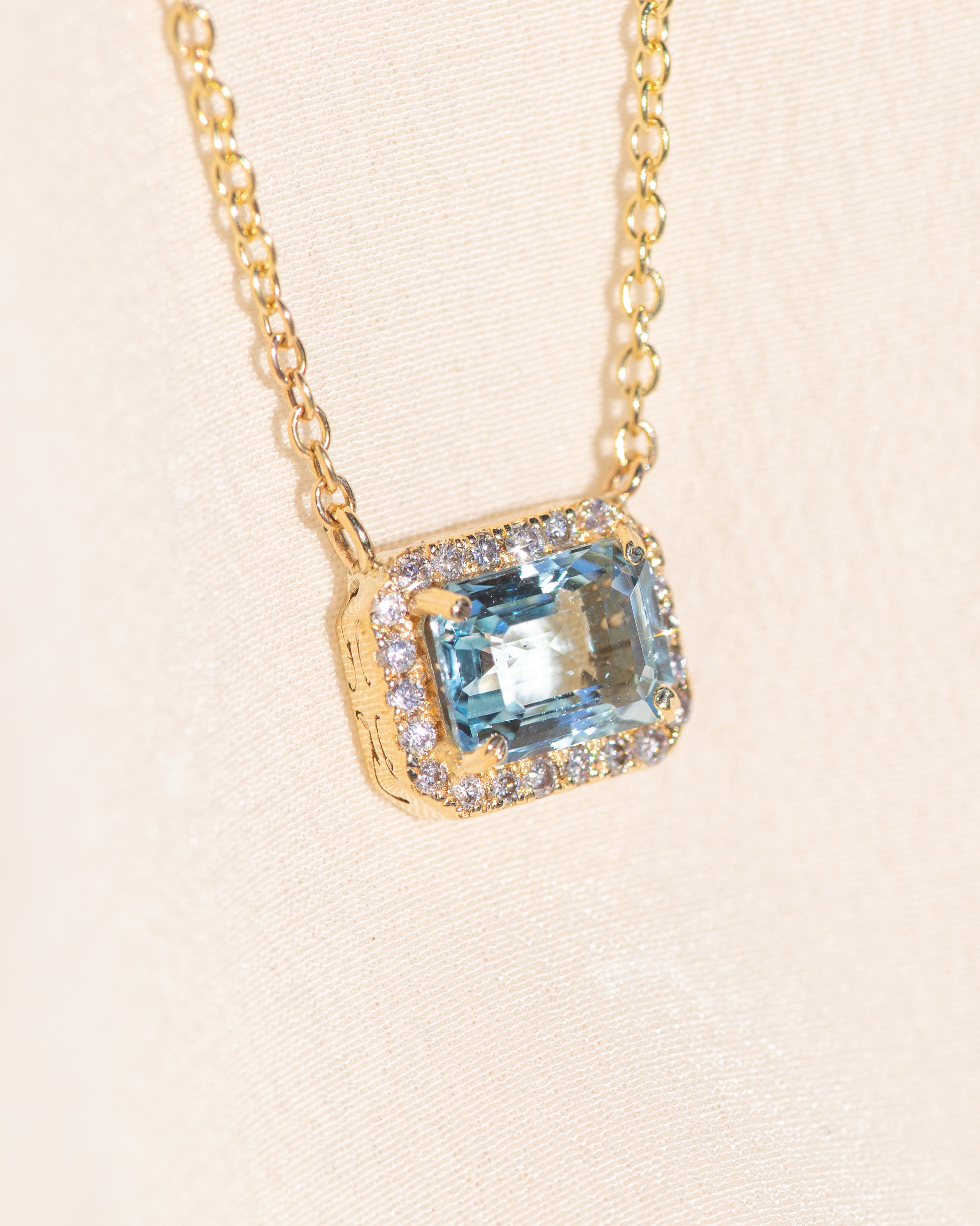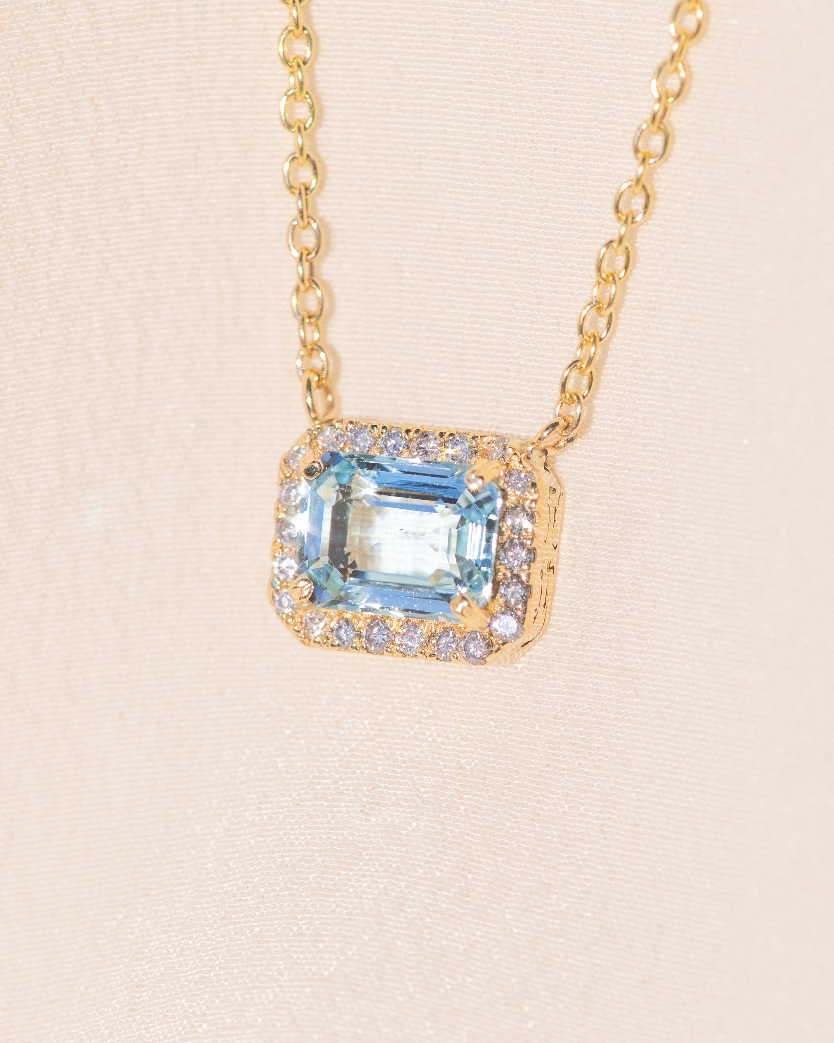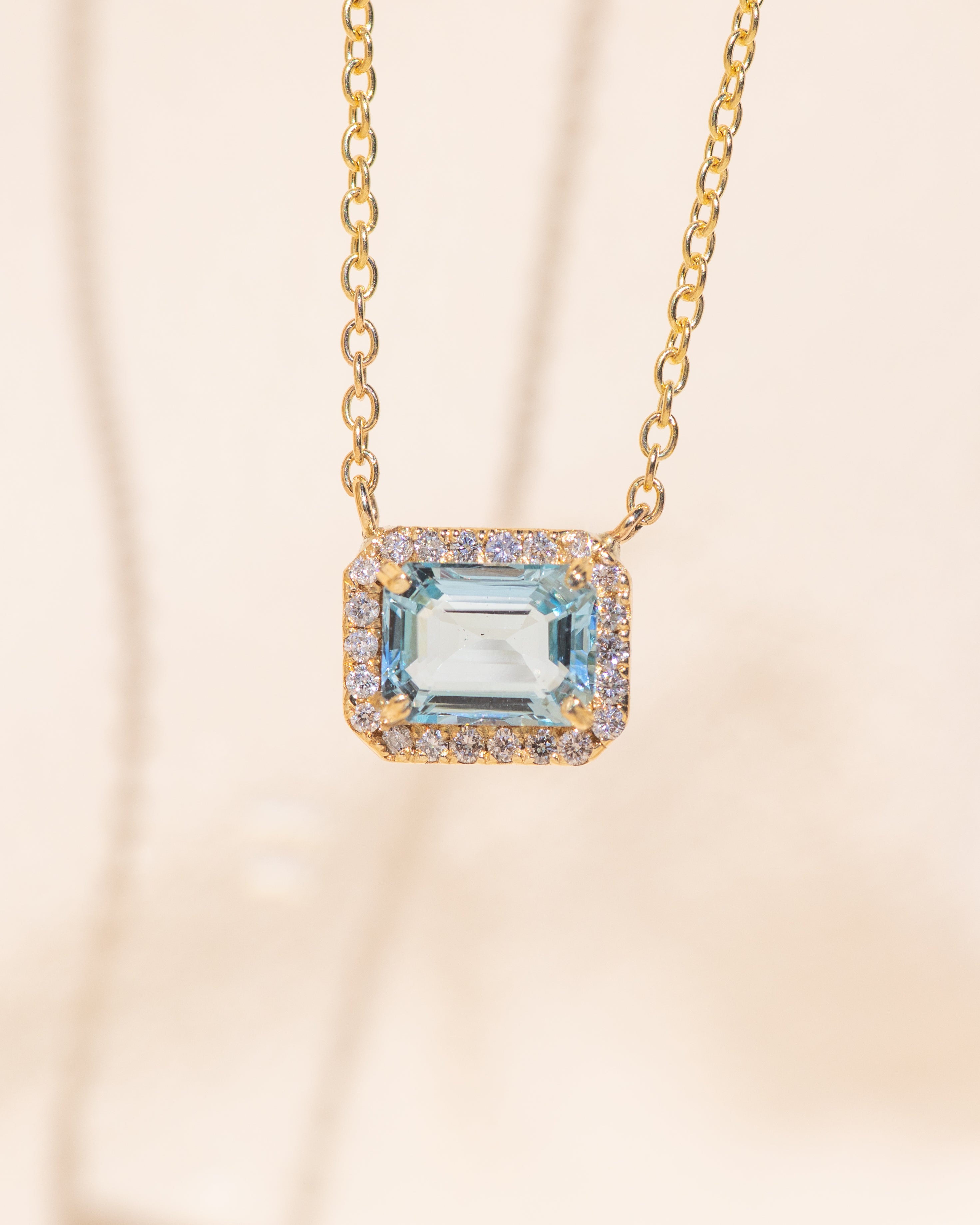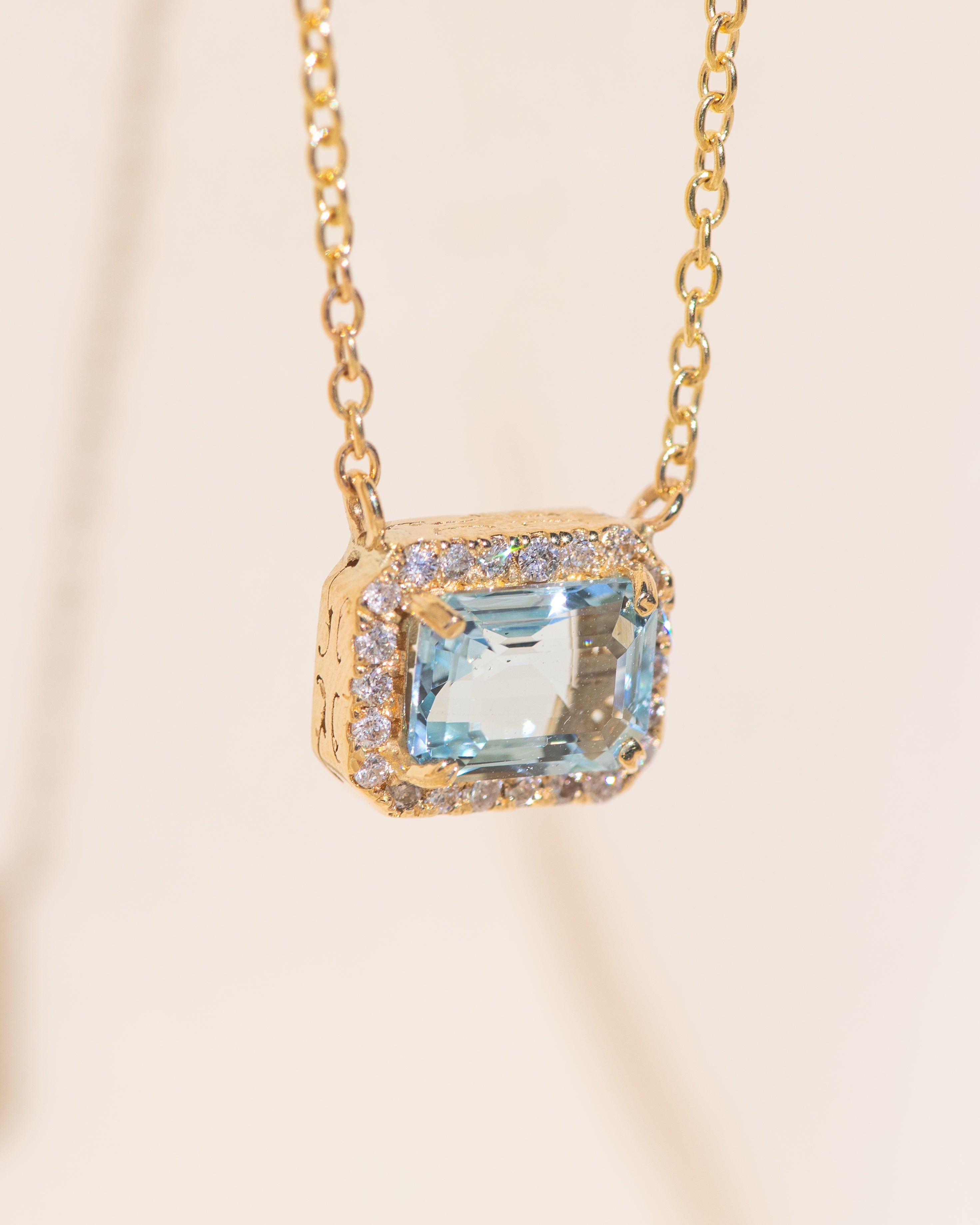 Features a stunning 8x6mm Aquamarine surrounded by a halo of White Diamonds, cast in 14k yellow gold. Set on a 16" delicate oval chain - can be made shorter, please reach out for desired length adjustments.