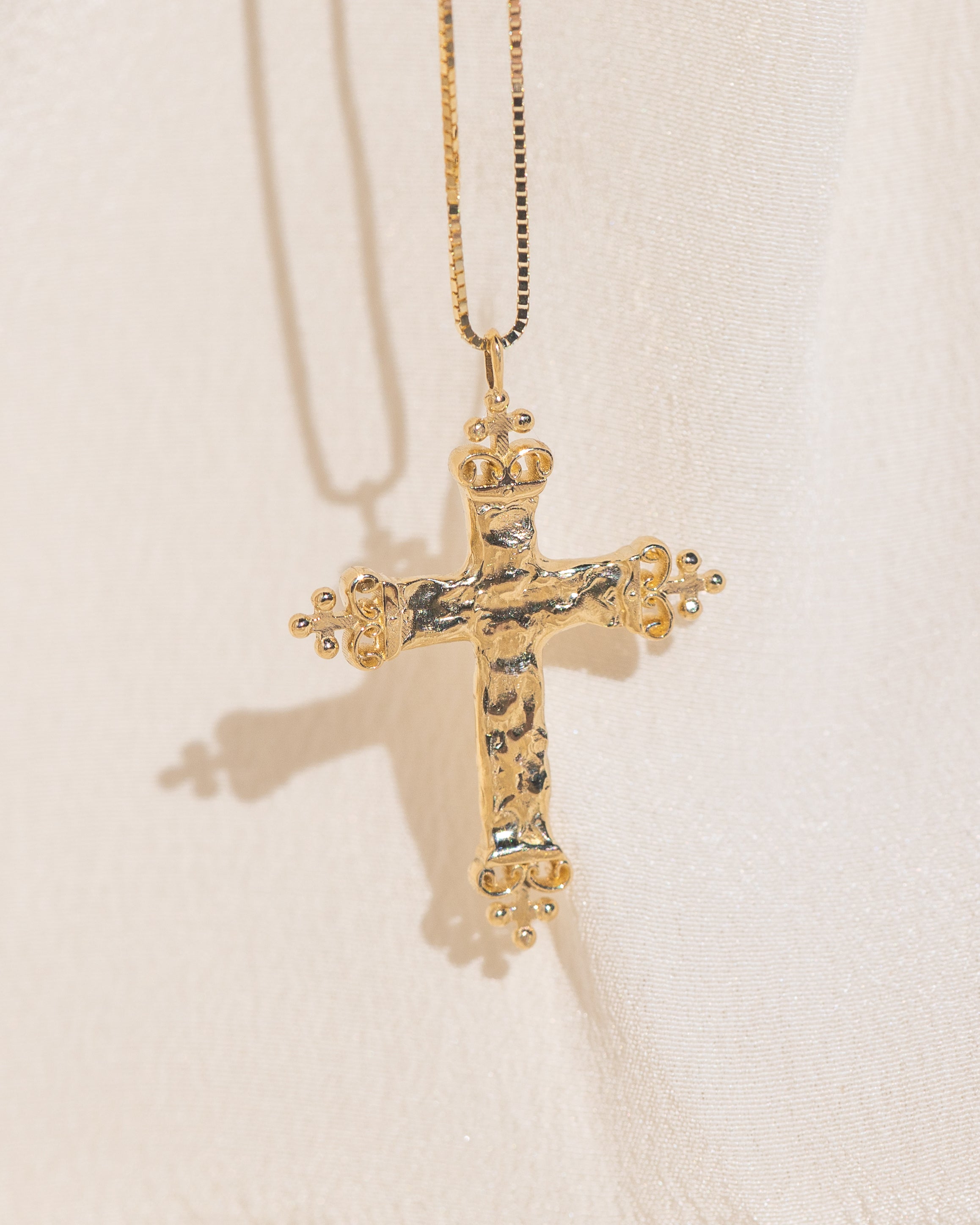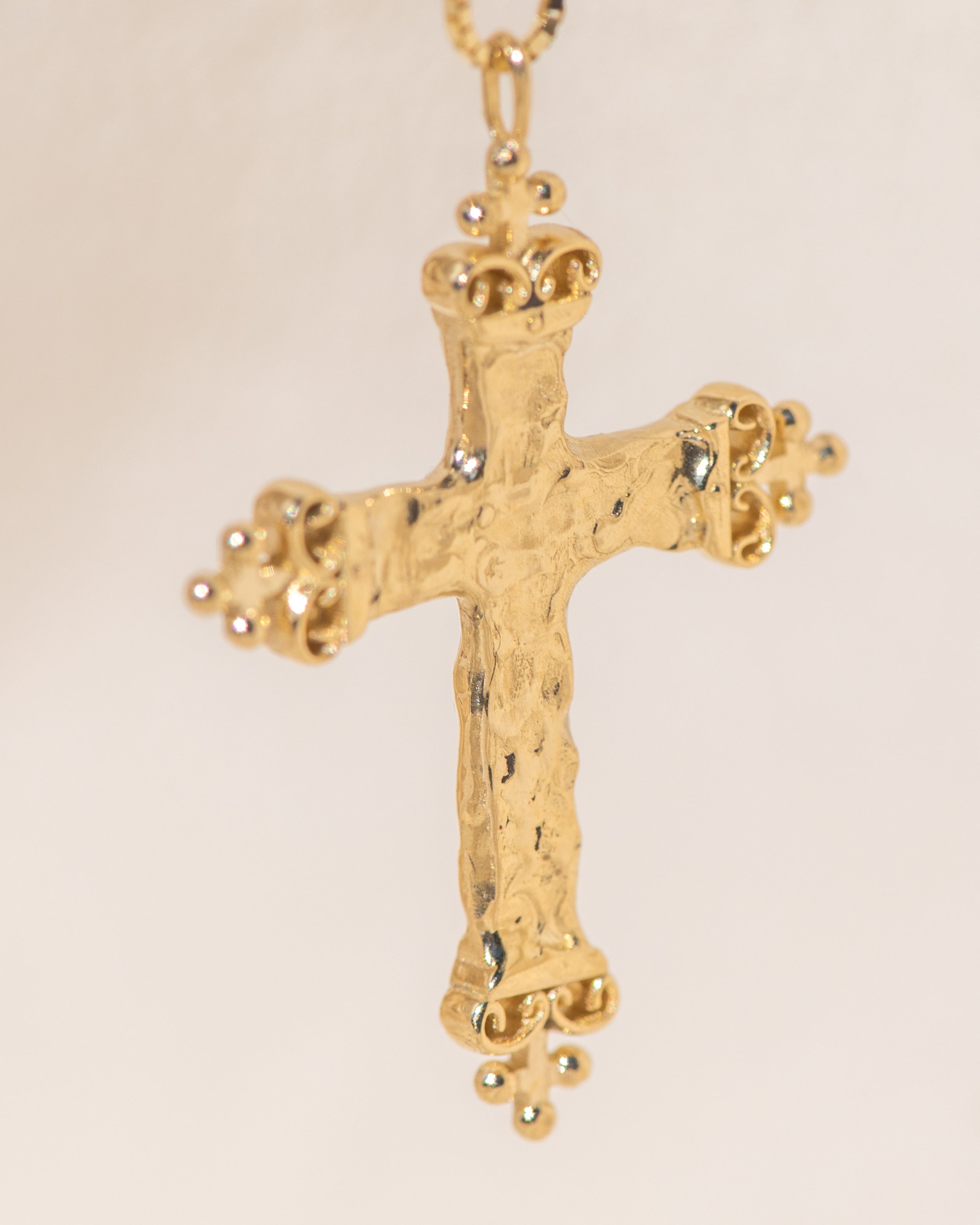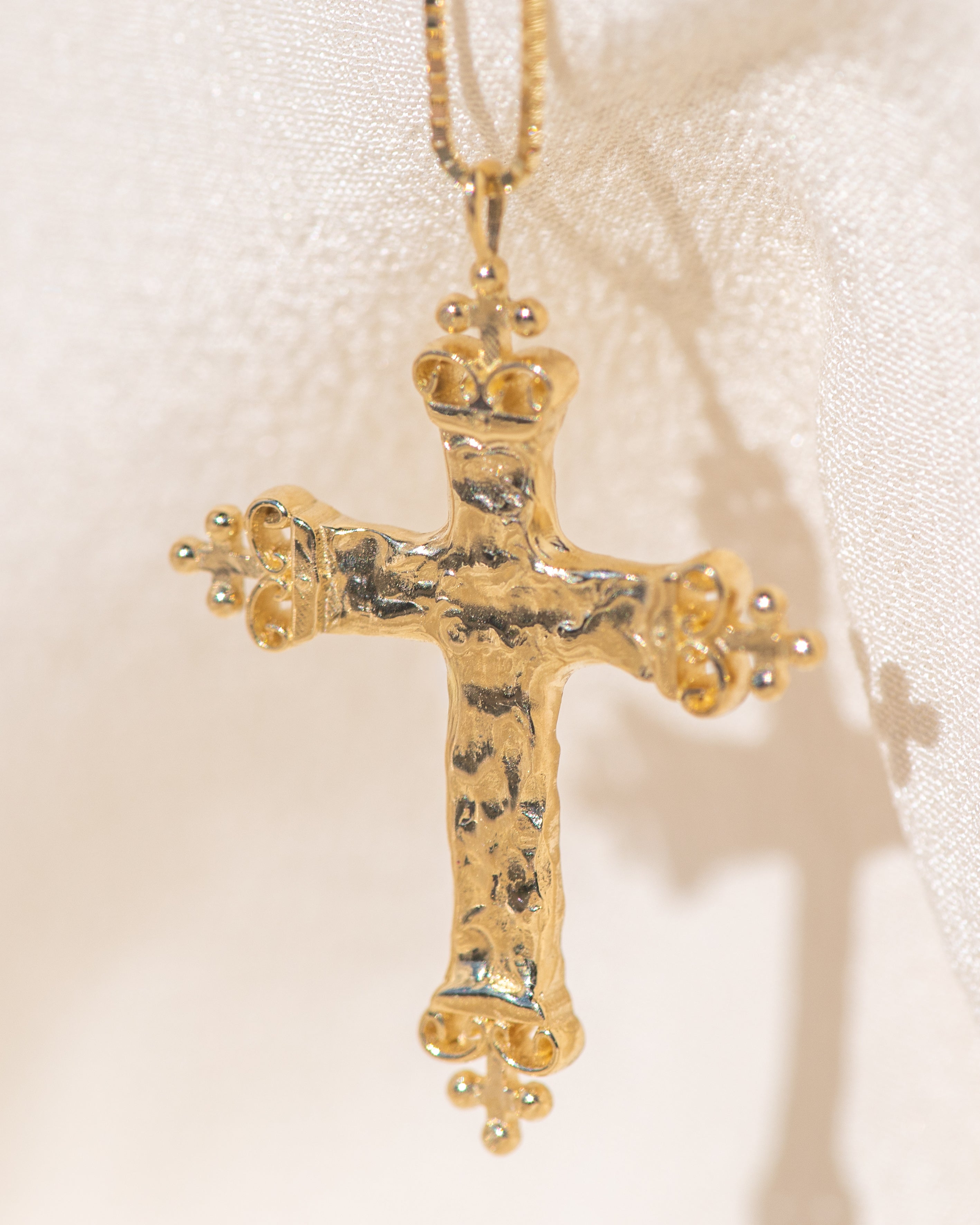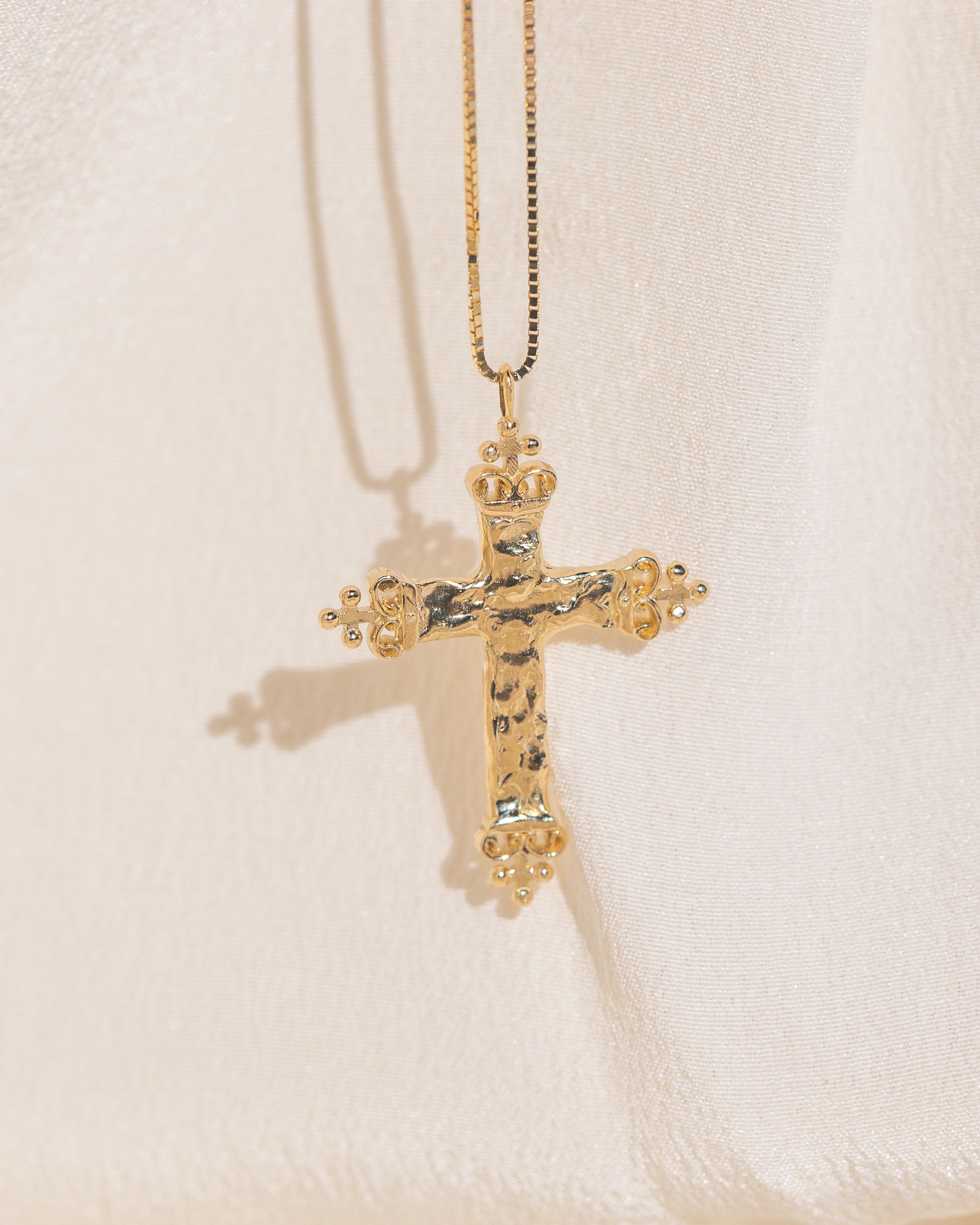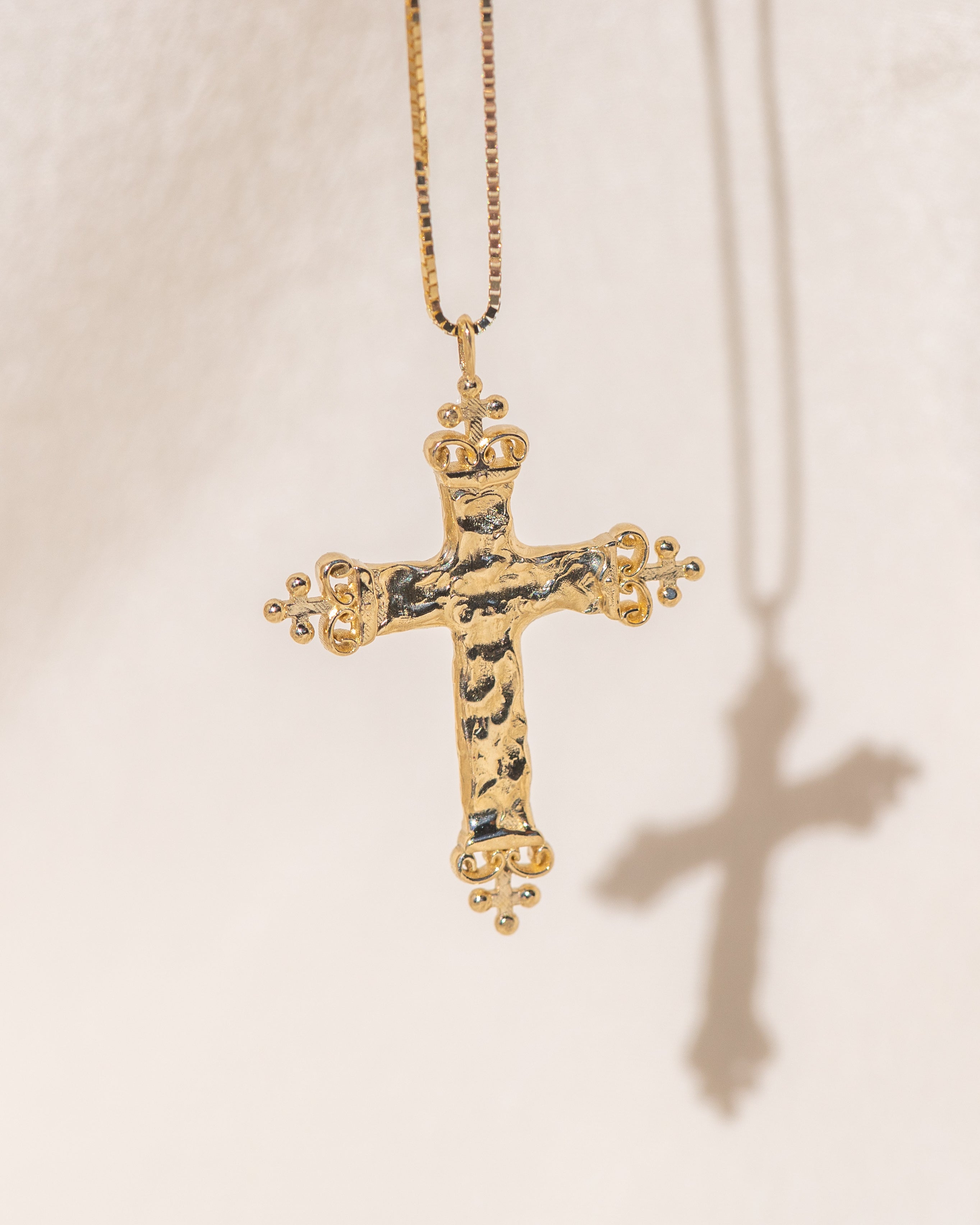 Its silhouette emanates the sacred artistry of early French devotional metalwork, with nods to the Holy Trinity and  Royalty within its crowned terminals, acting a talisman against despair and spiritual heaviness. This piece was designed to serve as an invitation to surrender, and to step into a devotion that reminds you of your Divine birthright.