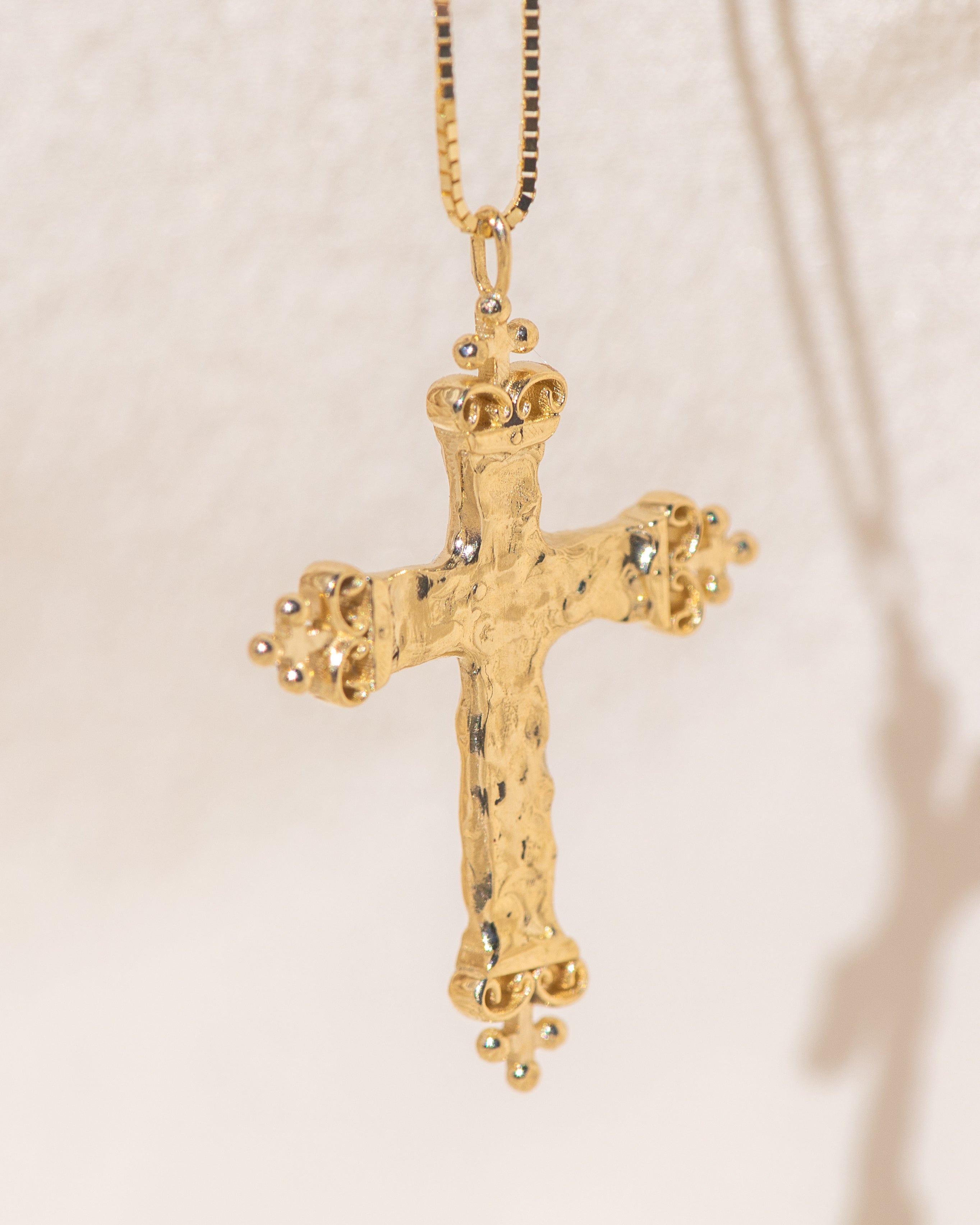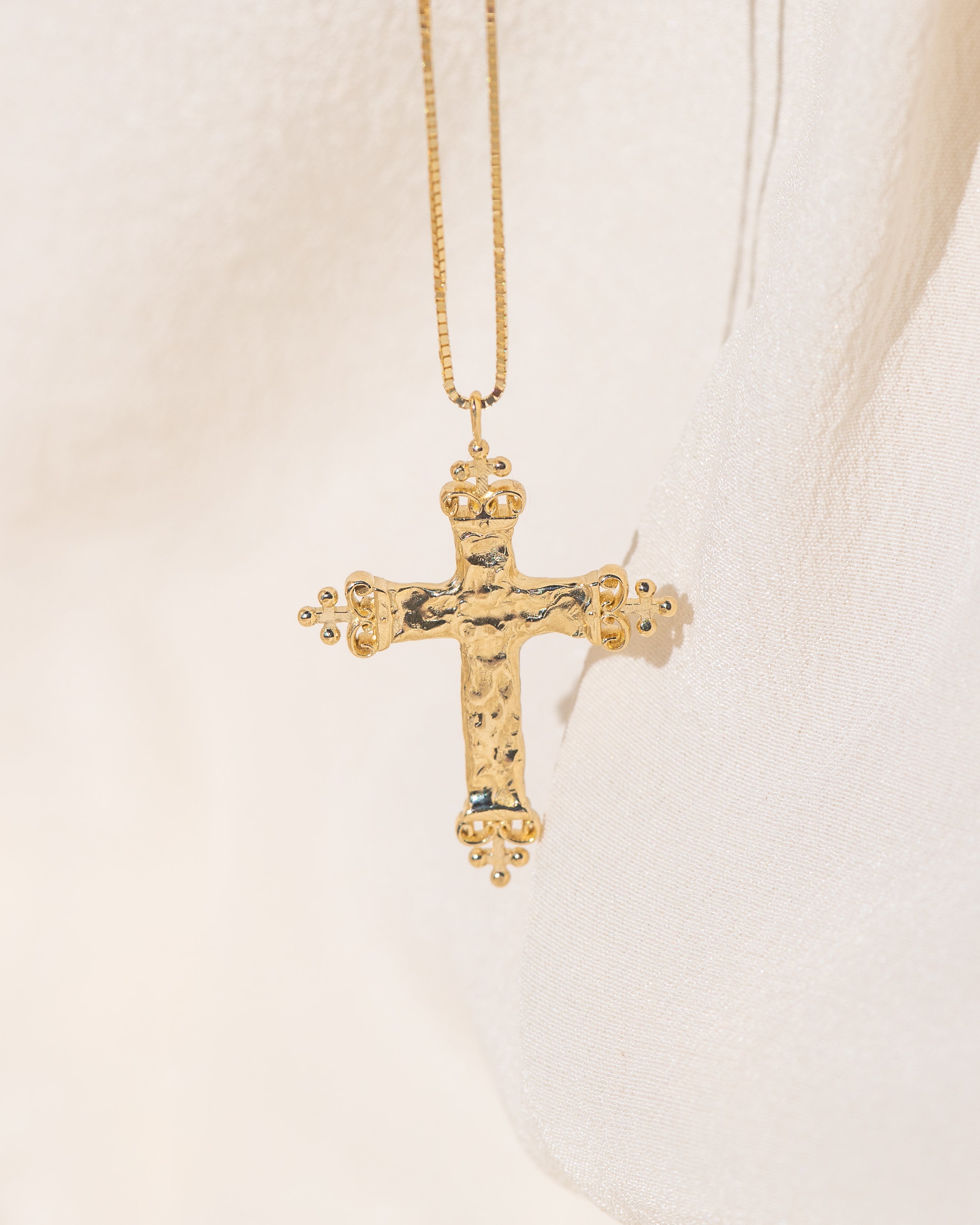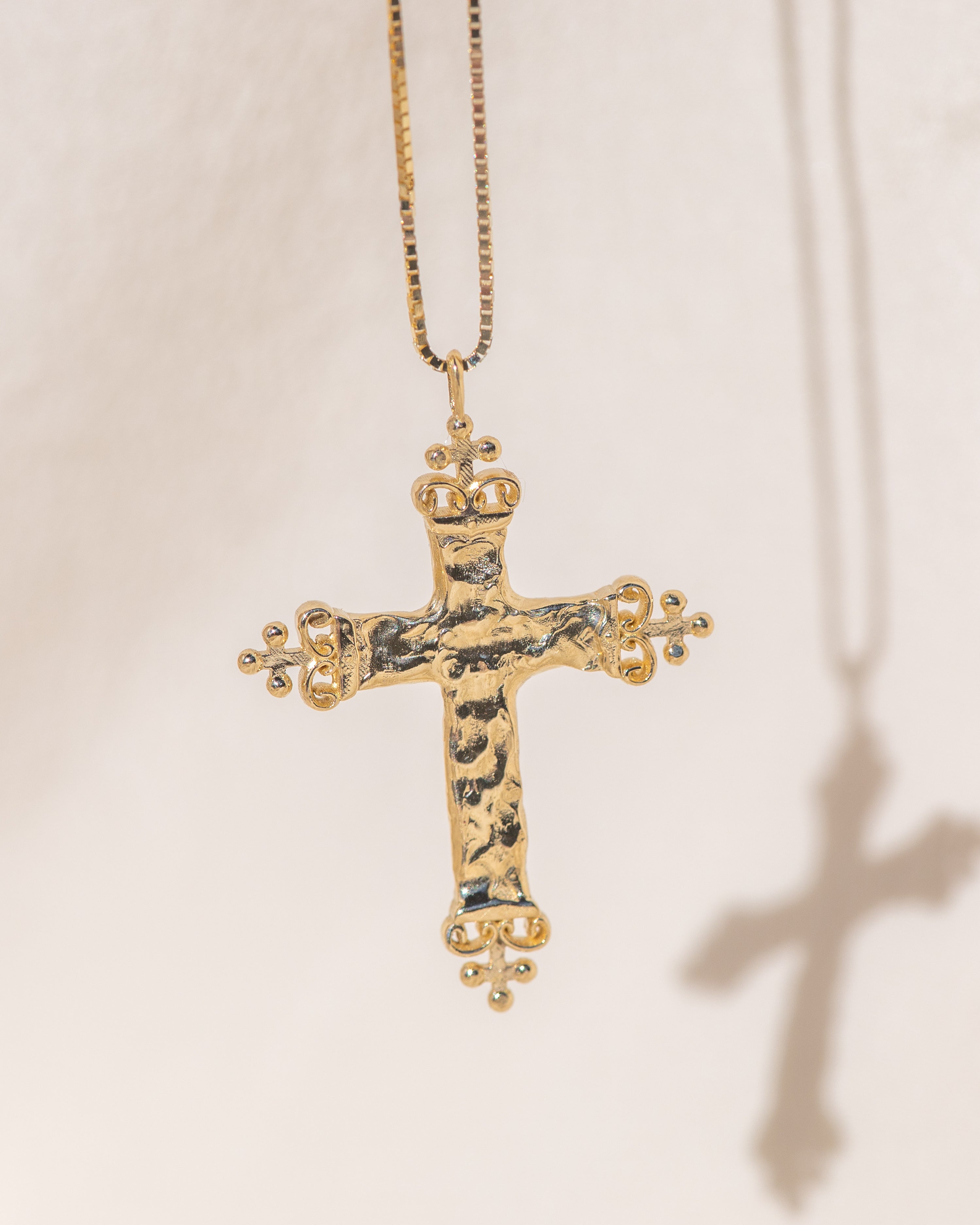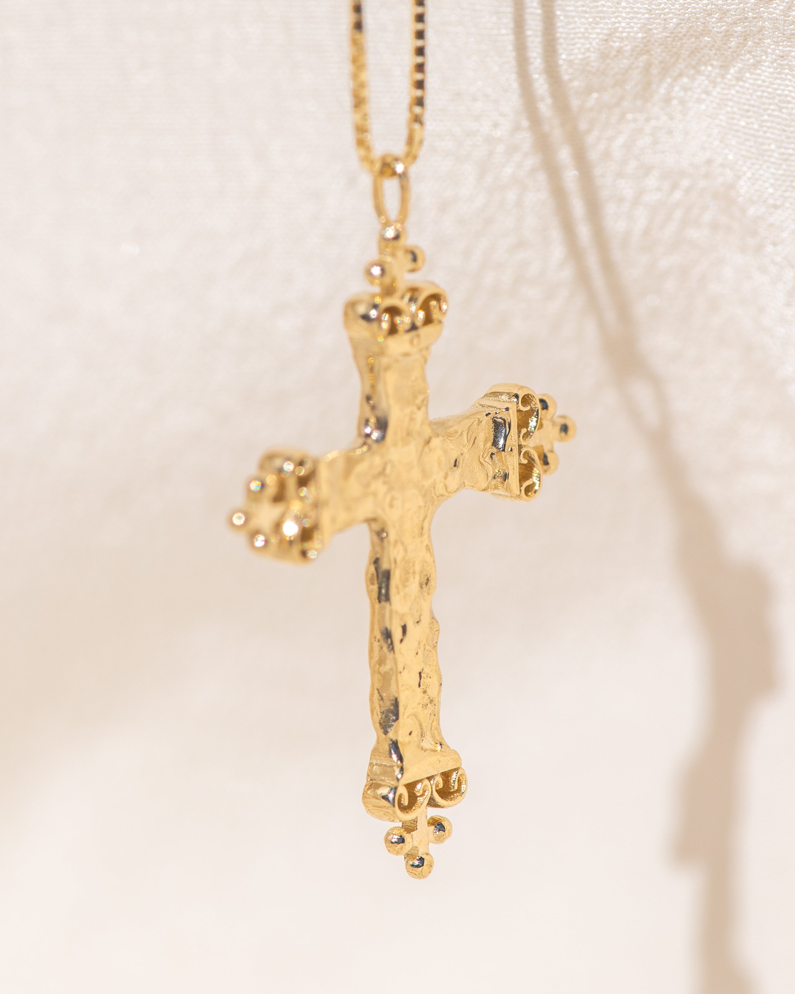 Its silhouette emanates the sacred artistry of early French devotional metalwork, with nods to the Holy Trinity and  Royalty within its crowned terminals, acting a talisman against despair and spiritual heaviness. This piece was designed to serve as an invitation to surrender, and to step into a devotion that reminds you of your Divine birthright.