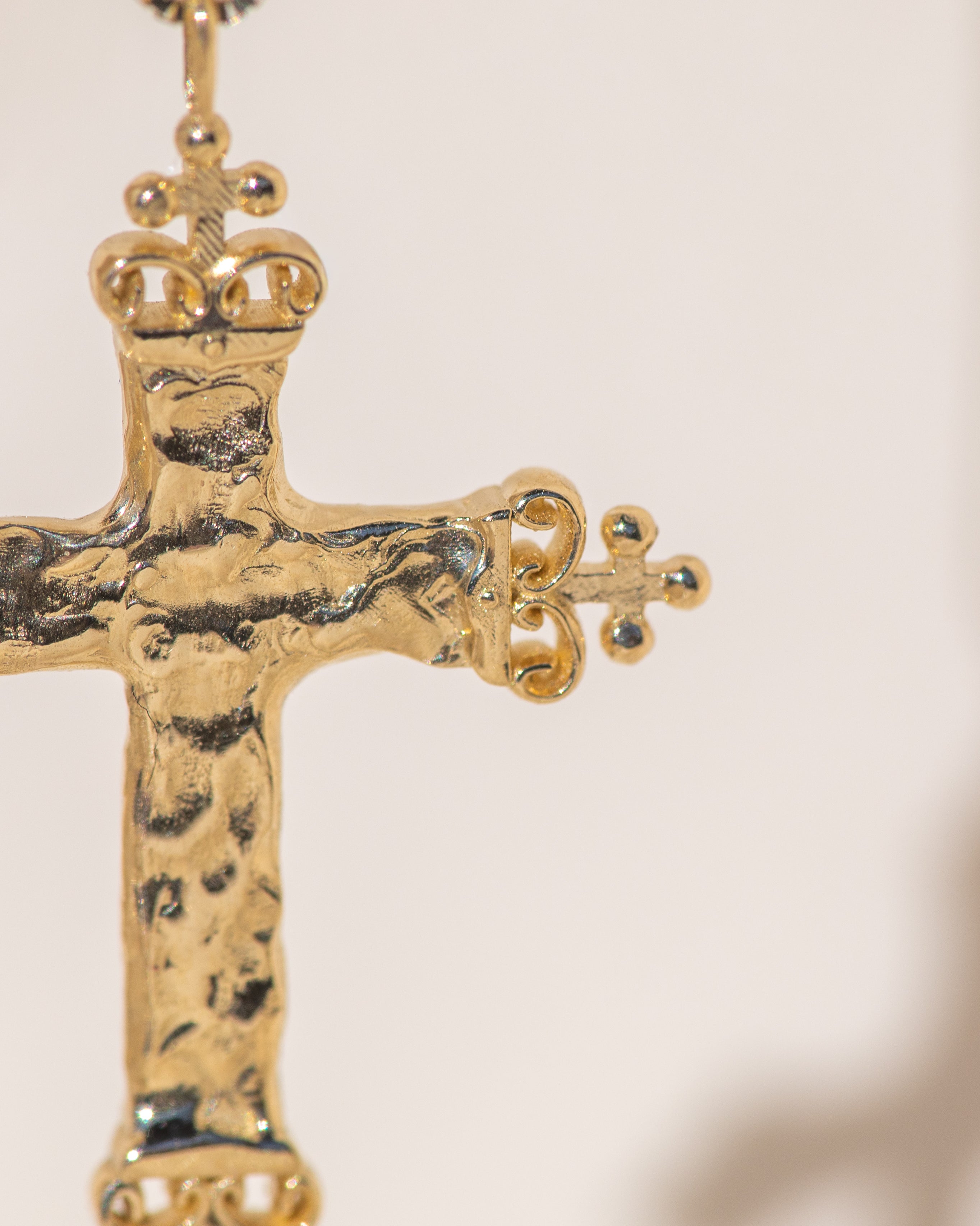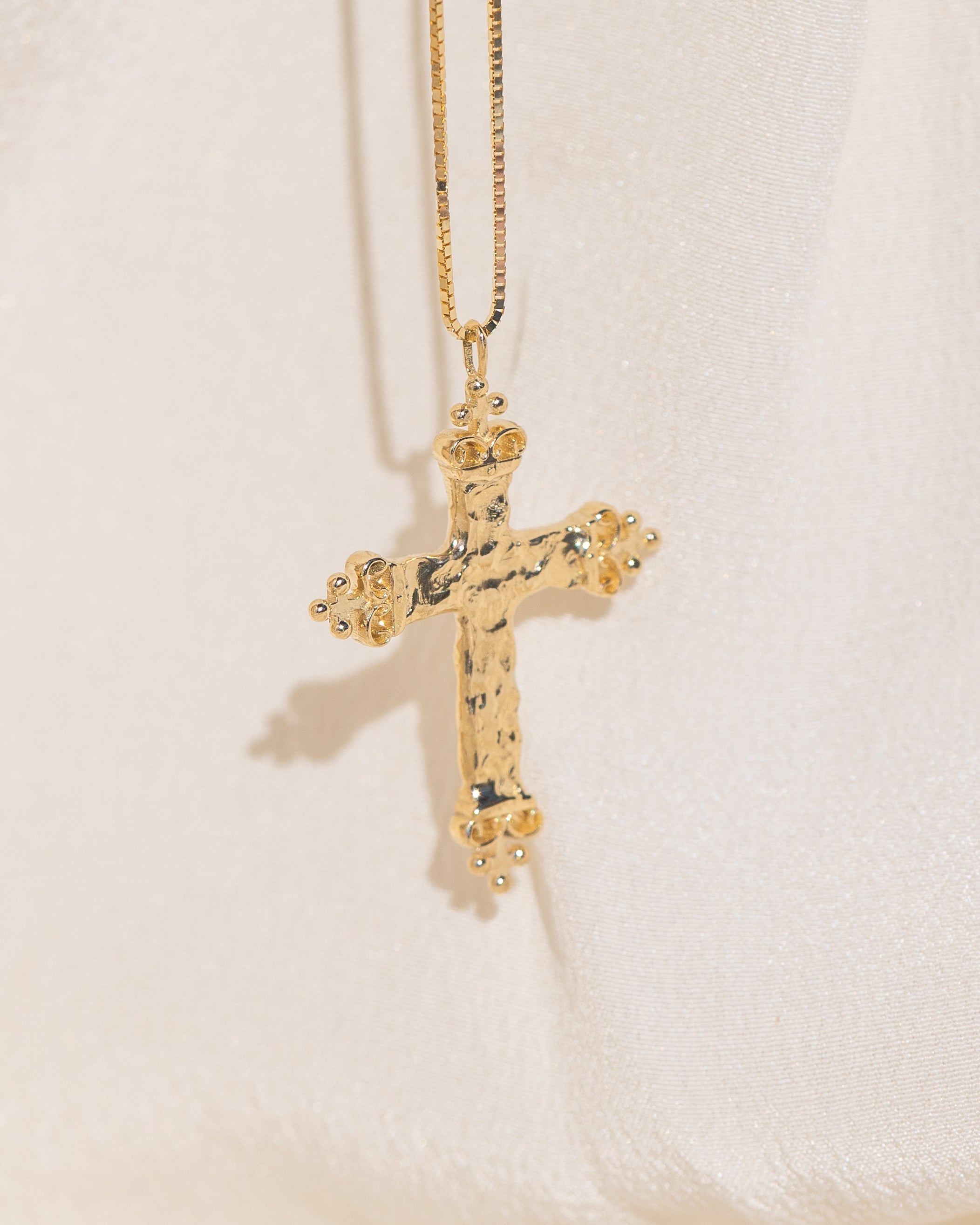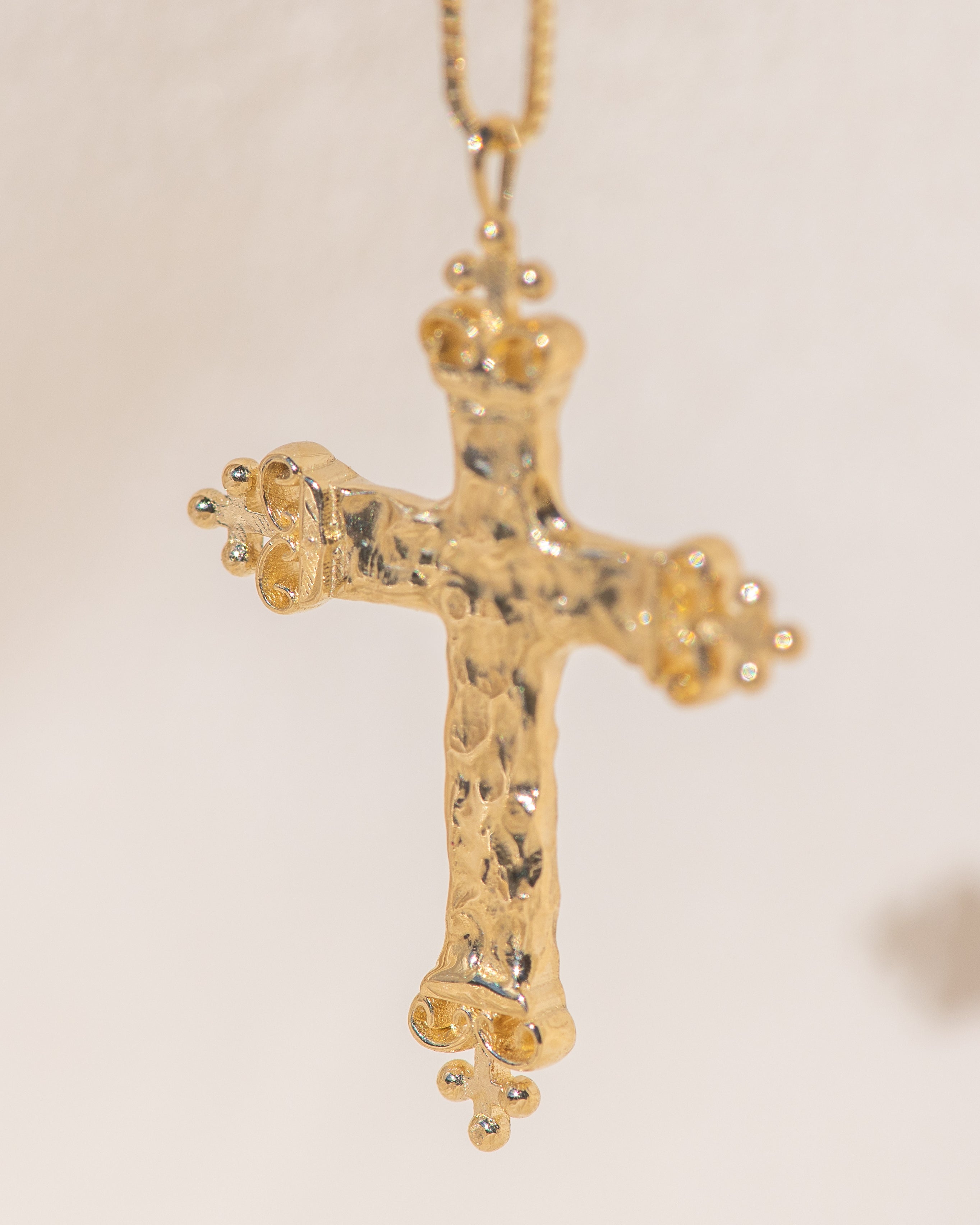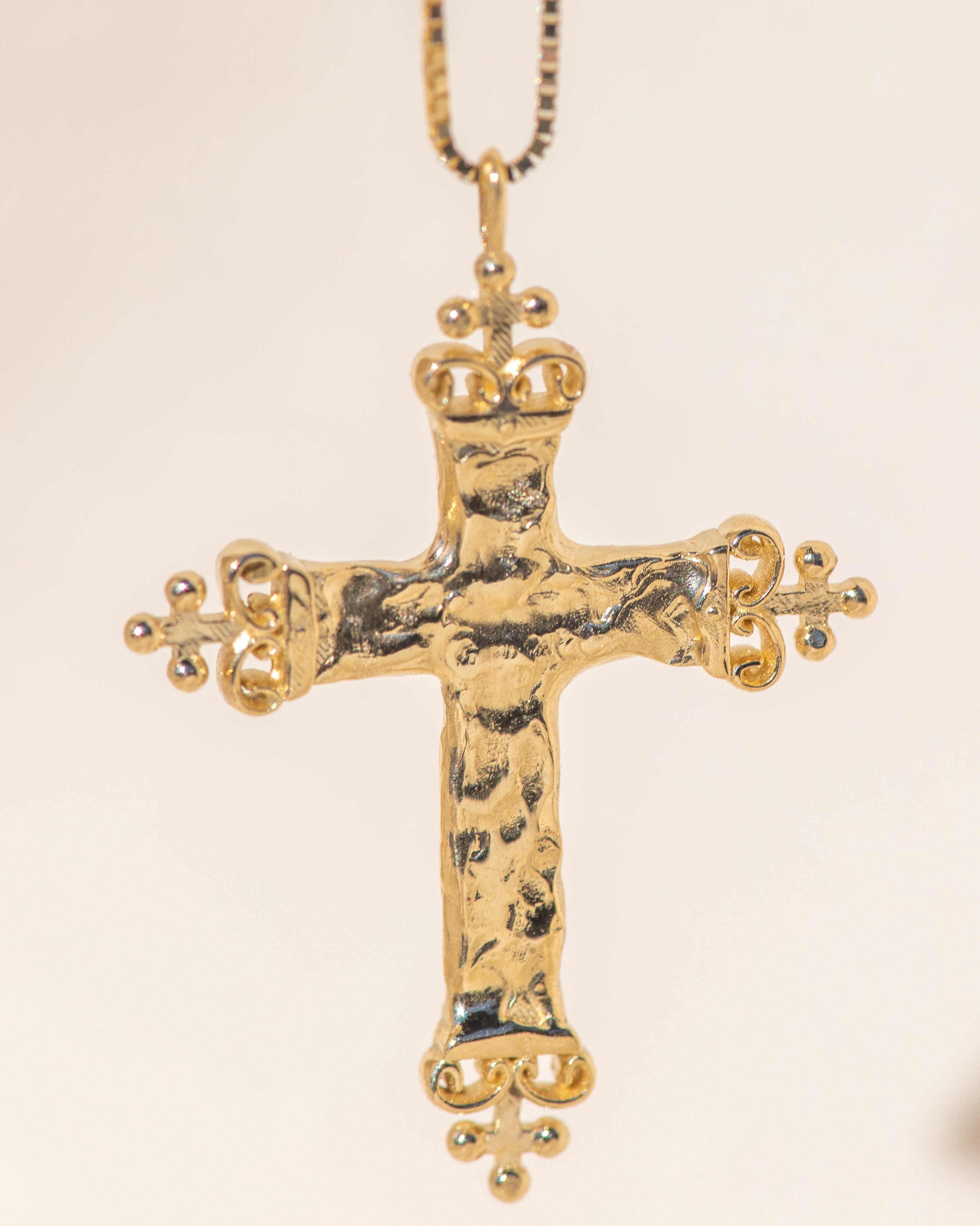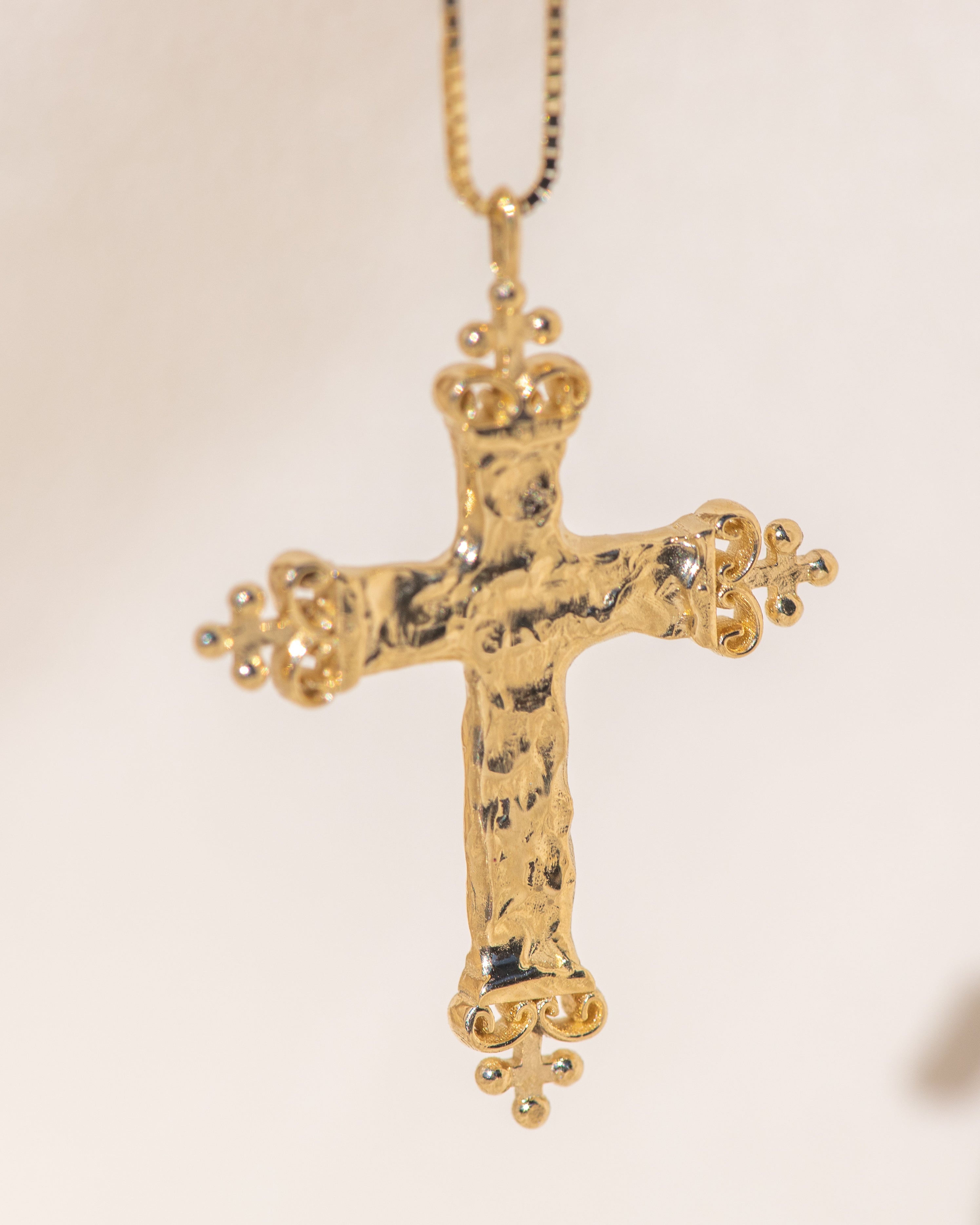 Its silhouette emanates the sacred artistry of early French devotional metalwork, with nods to the Holy Trinity and  Royalty within its crowned terminals, acting a talisman against despair and spiritual heaviness. This piece was designed to serve as an invitation to surrender, and to step into a devotion that reminds you of your Divine birthright.