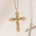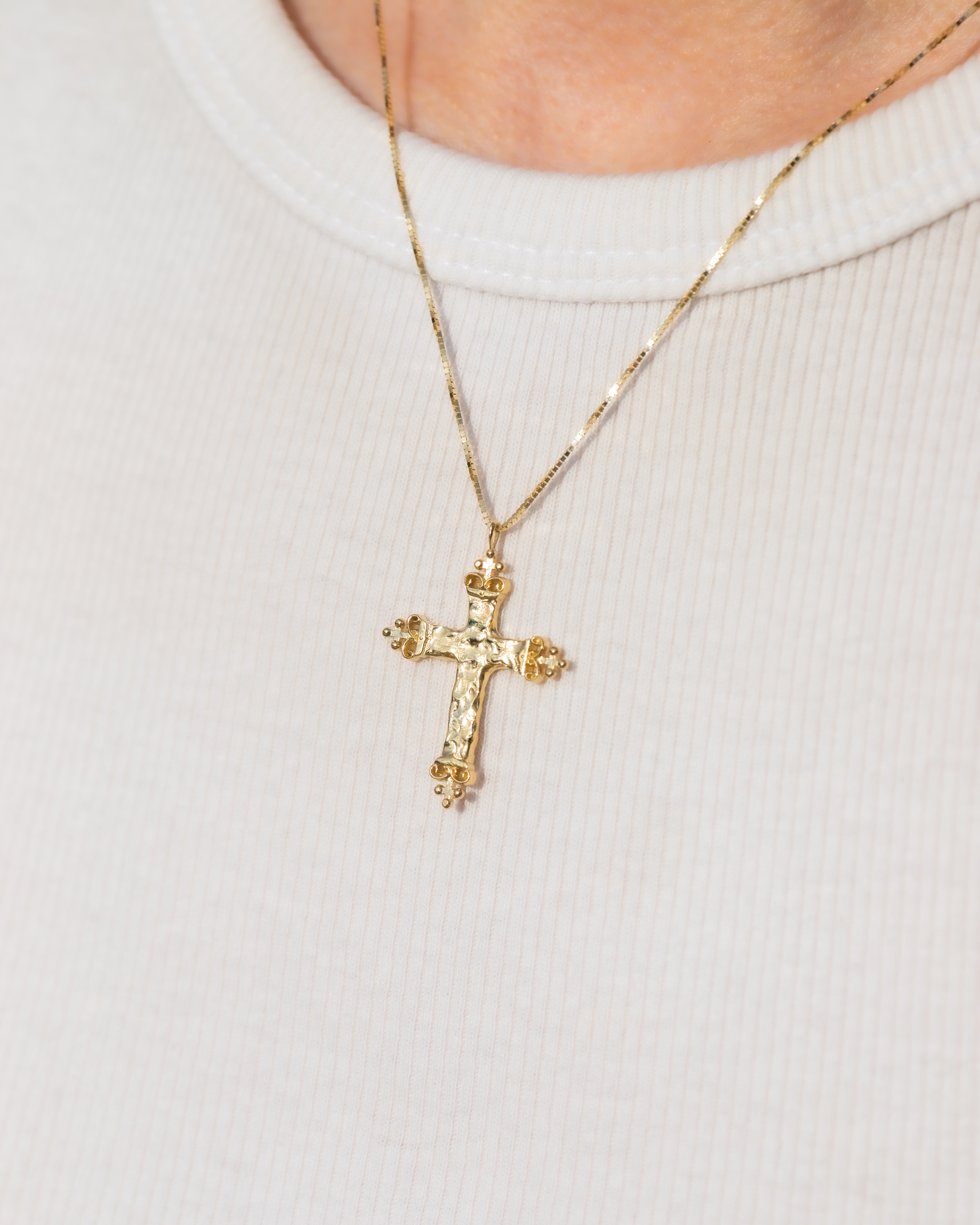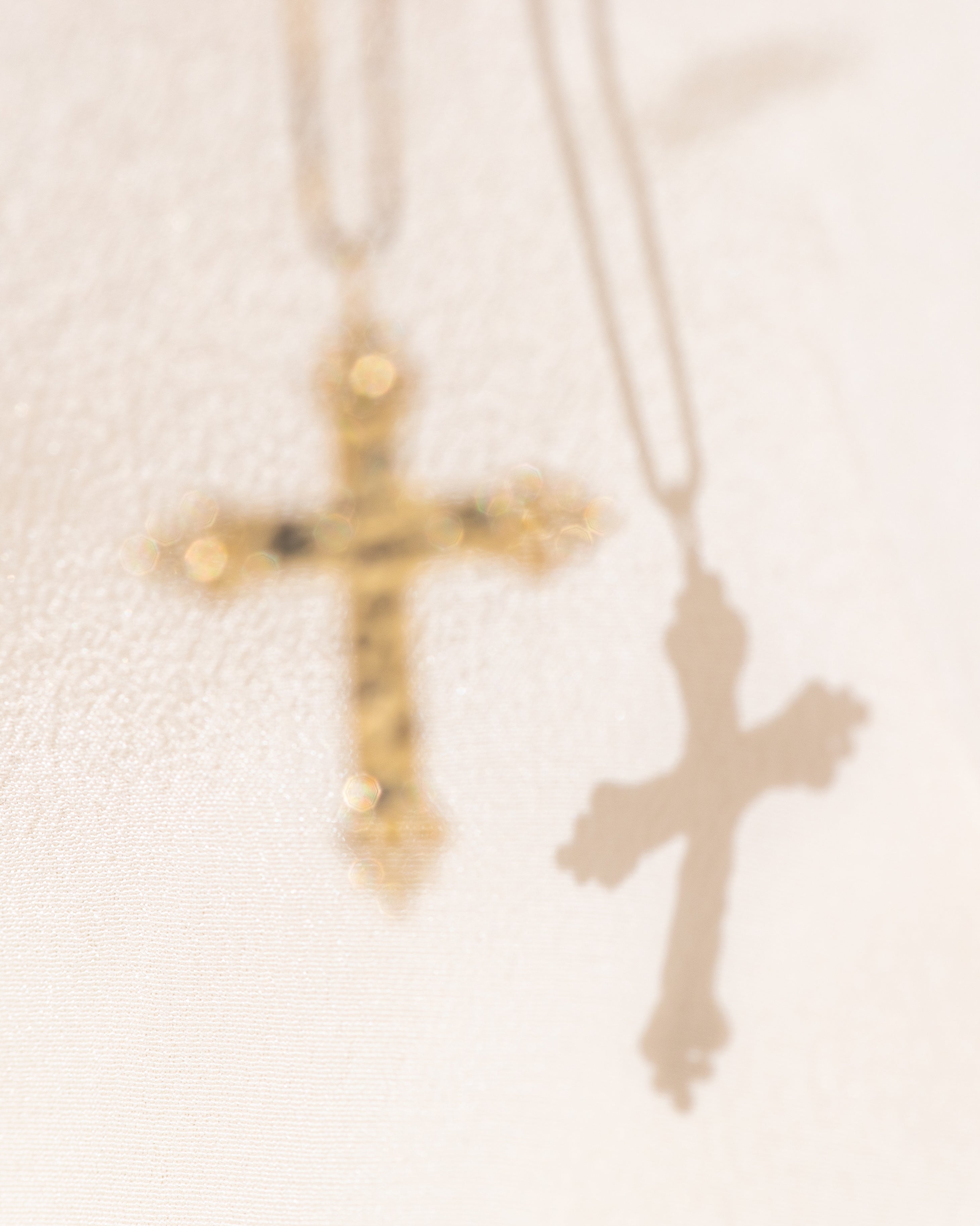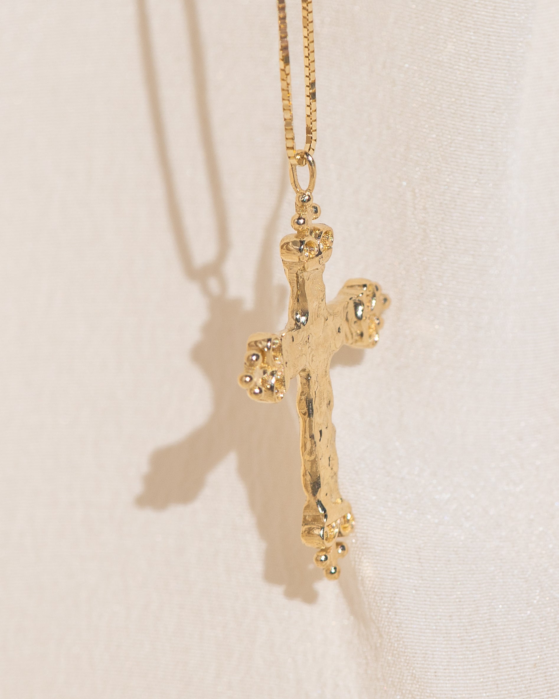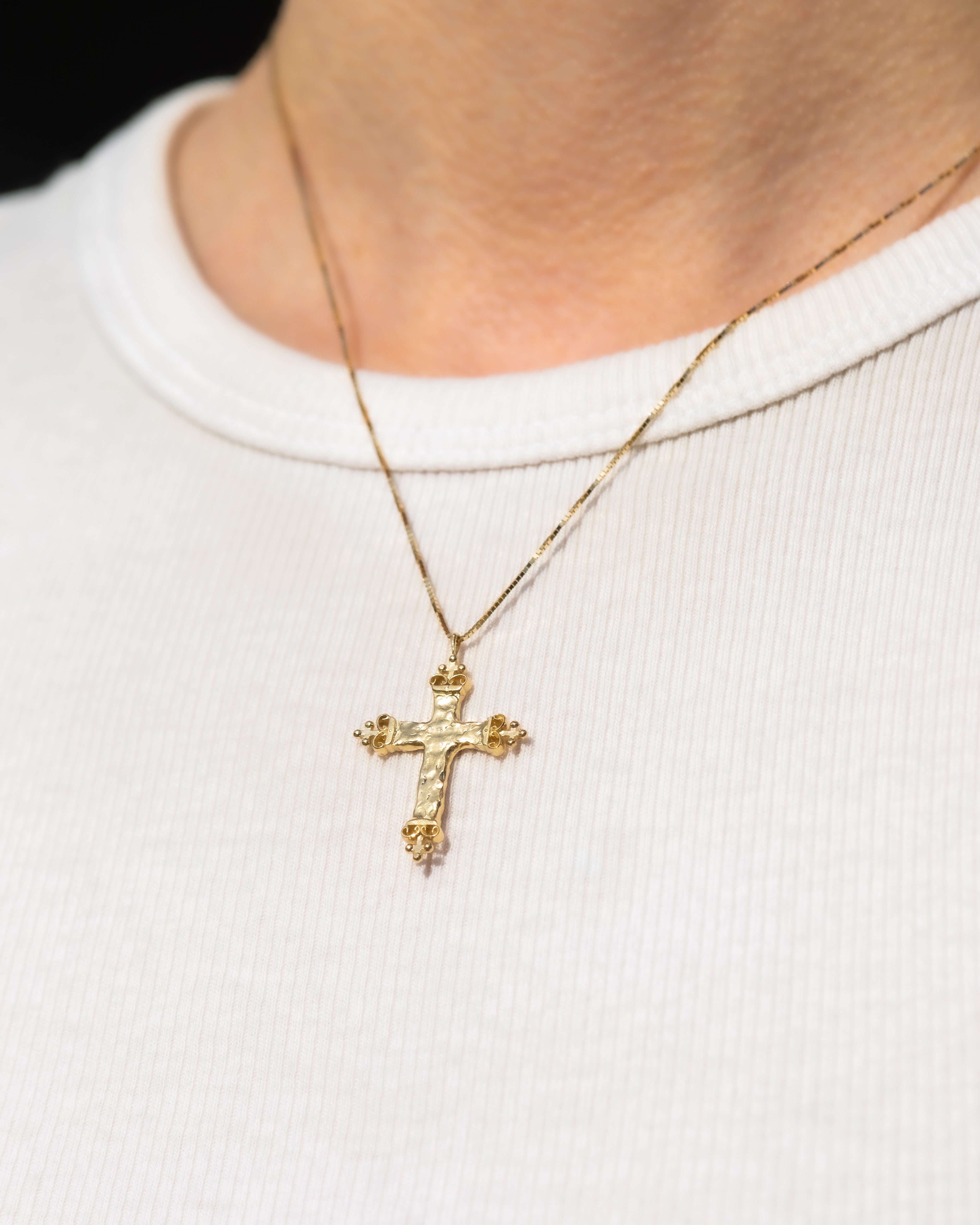 Its silhouette emanates the sacred artistry of early French devotional metalwork, with nods to the Holy Trinity and  Royalty within its crowned terminals, acting a talisman against despair and spiritual heaviness. This piece was designed to serve as an invitation to surrender, and to step into a devotion that reminds you of your Divine birthright.