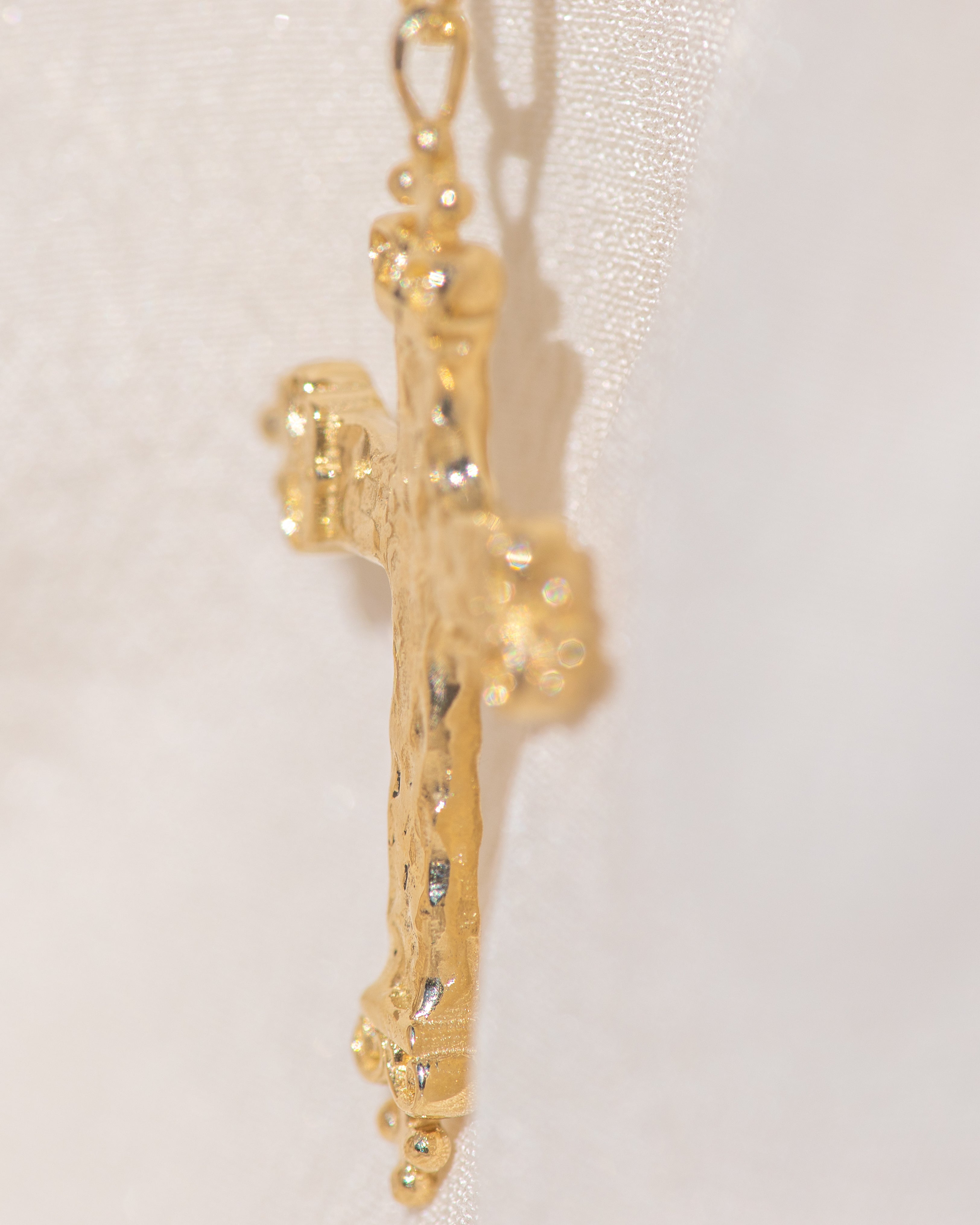 Inspired by an antique 17th-century French amulet and created with baroque & Rococo devotional crosses in mind, La Croix de Dévotion embodies love expressed through surrender, spiritual nobility and Divine sovereignty. Historically, these devotional crosses were worn daily, kept in prayer books, and carried as protective talismans. Understood as amplifiers of prayer and companions to the soul, they serve as physical anchors of faith and act as shields of the heart- an emblem of trust, love, and loyalty to the Divine.