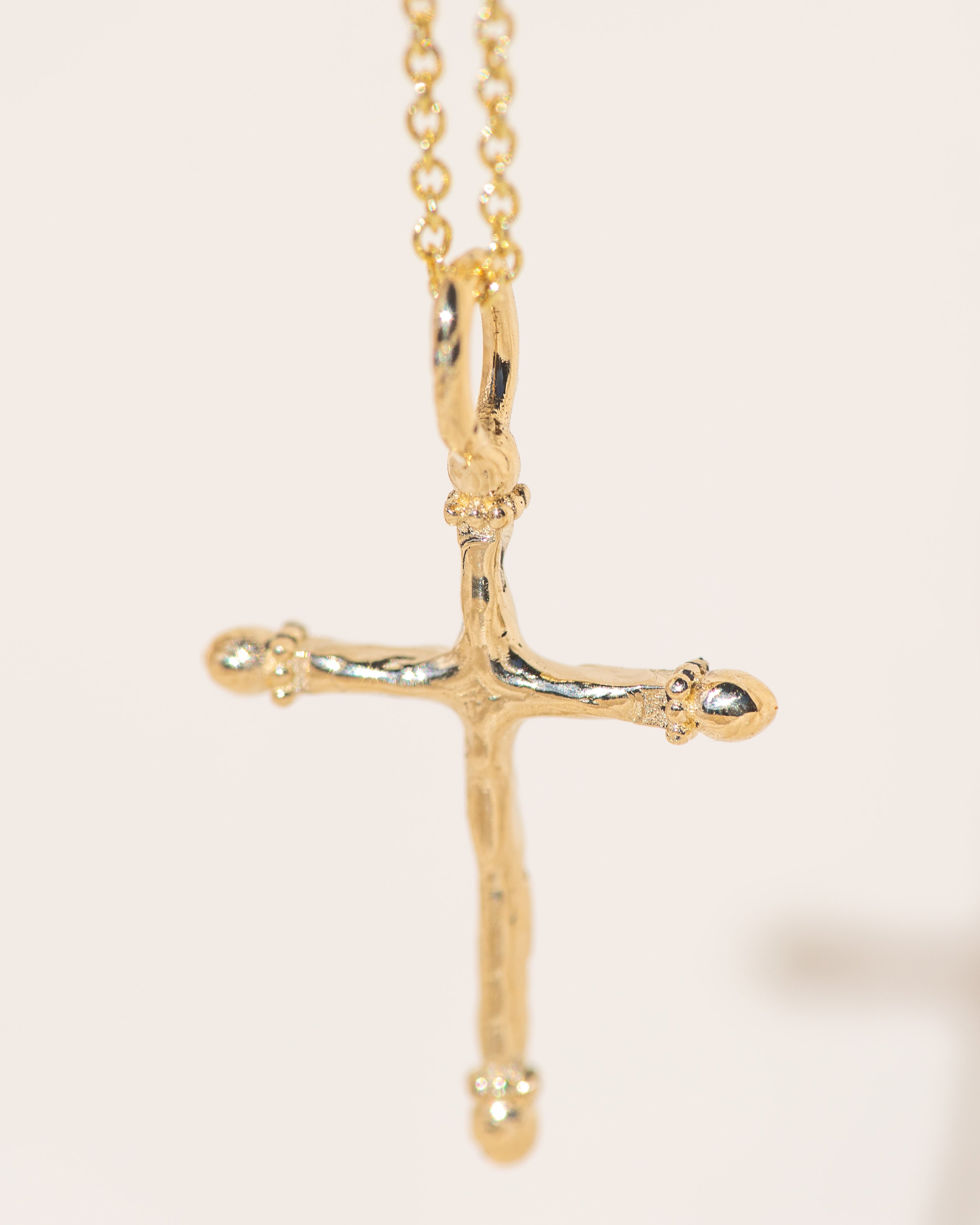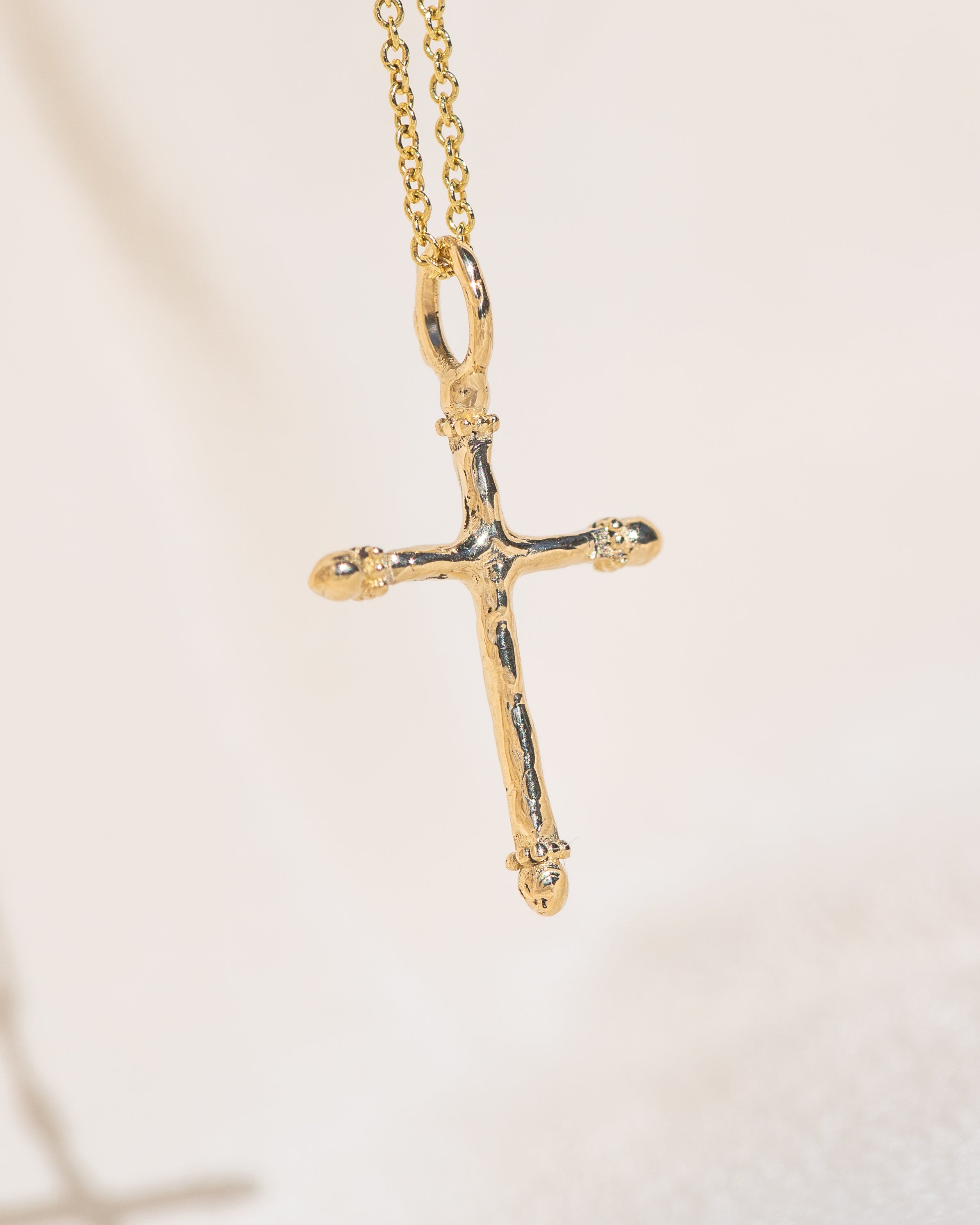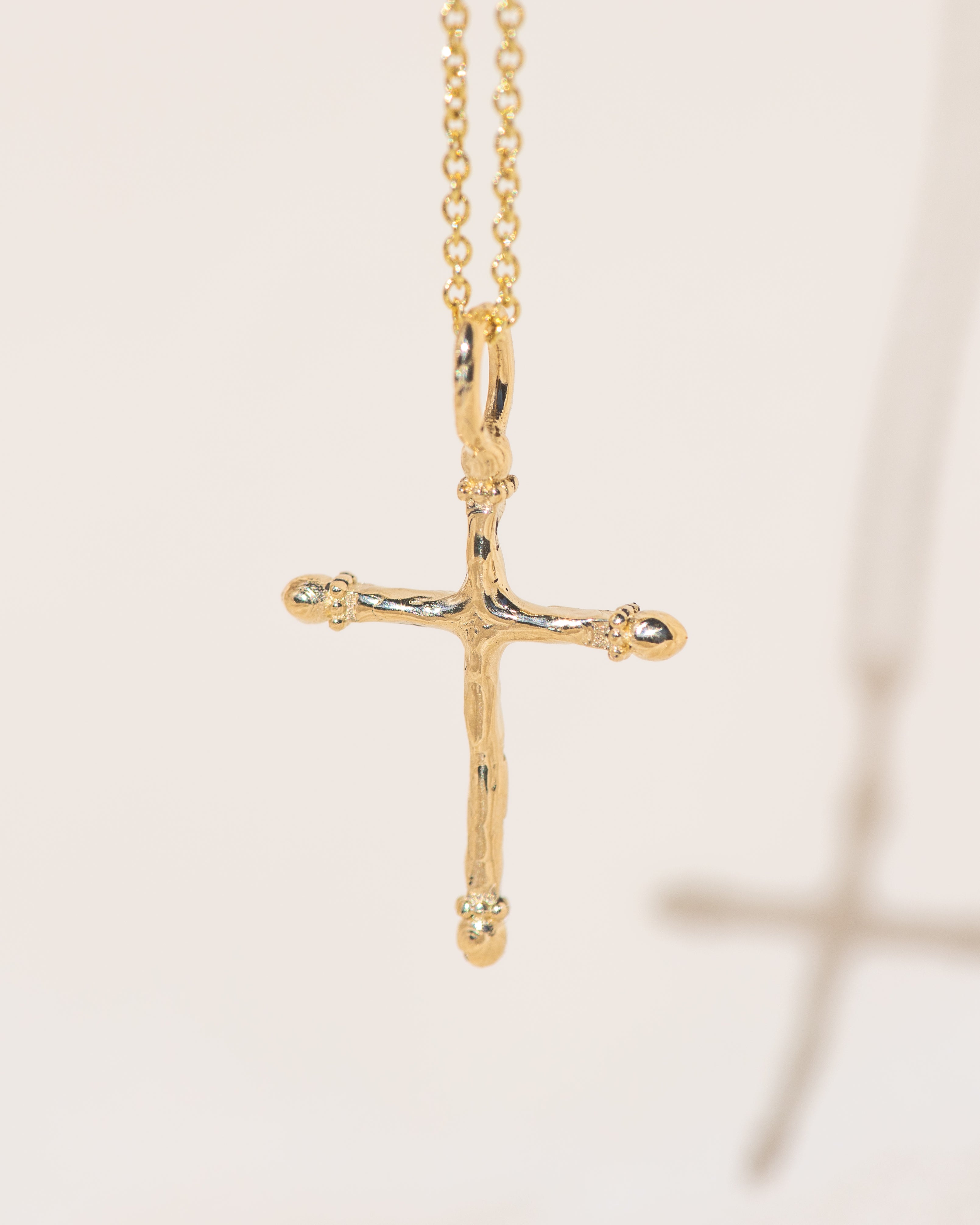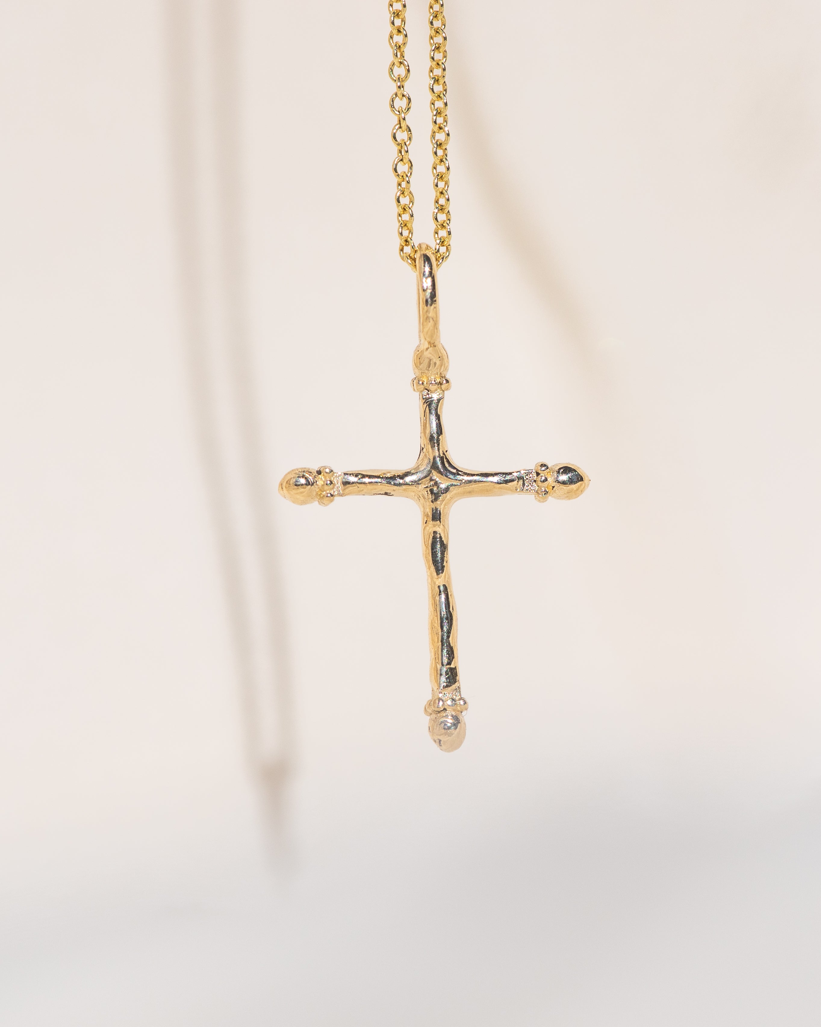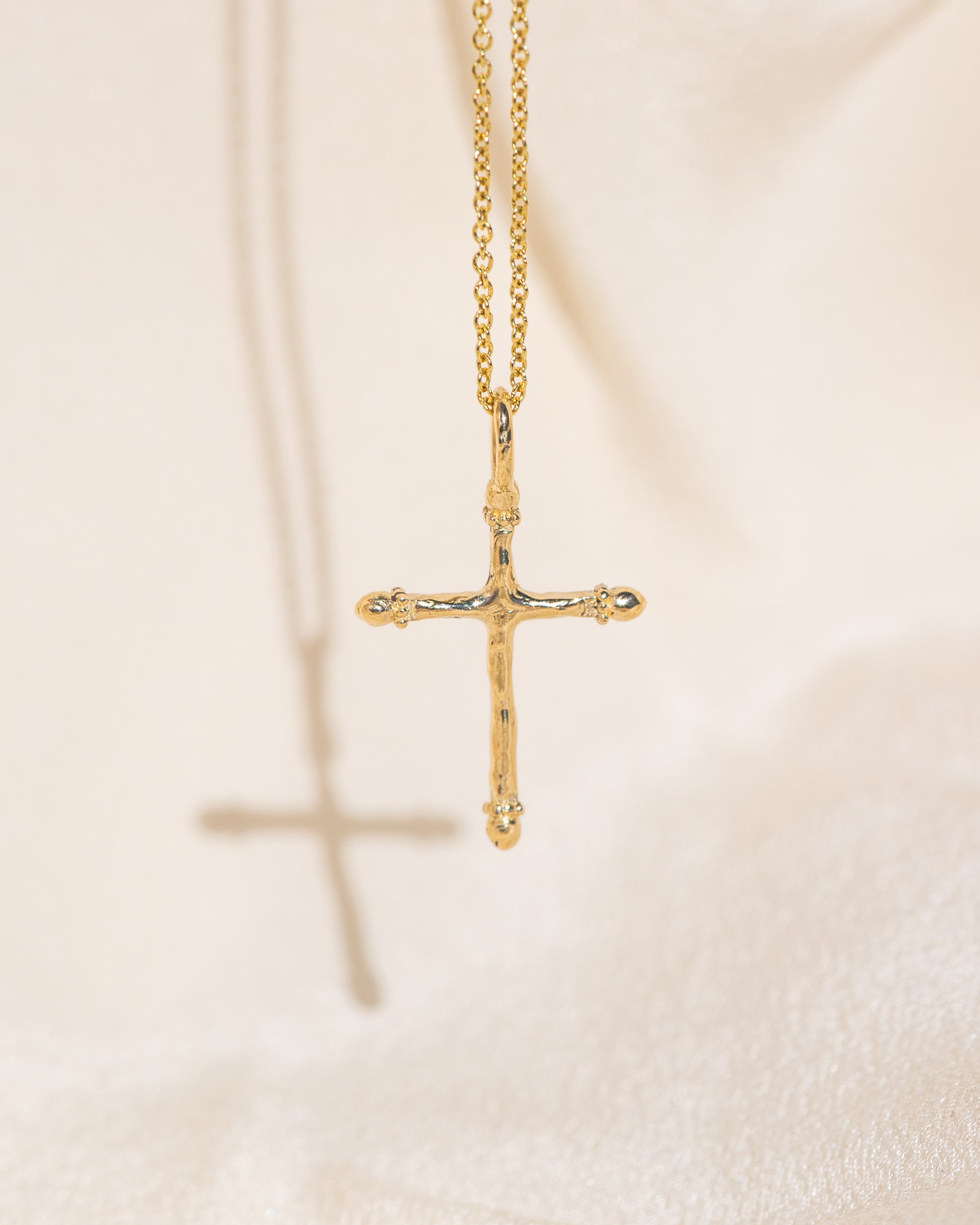 Inspired by an antique 18th century French amulet, the Cross of Revelation was designed to draw on the devotional crosses worn in France in a time when faith, symbolism and artistry were interwoven. Its delicate silhouette nestles into the historic family of the Croix Bourgeonnante {the Budding Cross}, a style that was extremely common in French devotional jewelry from the medieval era through the 1700s. Its small budded terminals embody the blossoming of faith, resurrection, the unfolding of Divine knowledge, and the spiritual awakening that occurs when we turn towards the Divine. It represents the blossoming of inner truth, guiding us towards clarity, devotion, and spiritual revelation.
