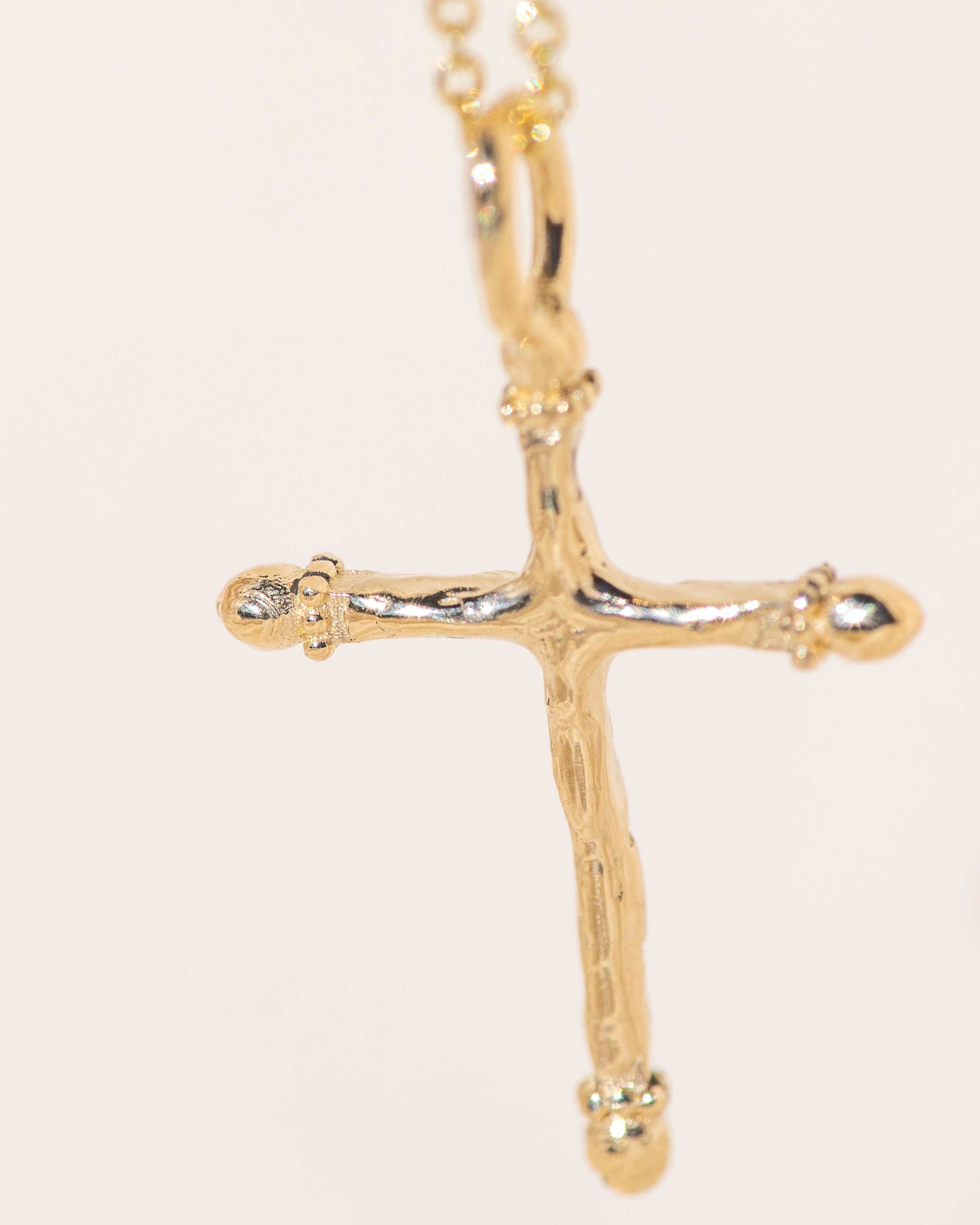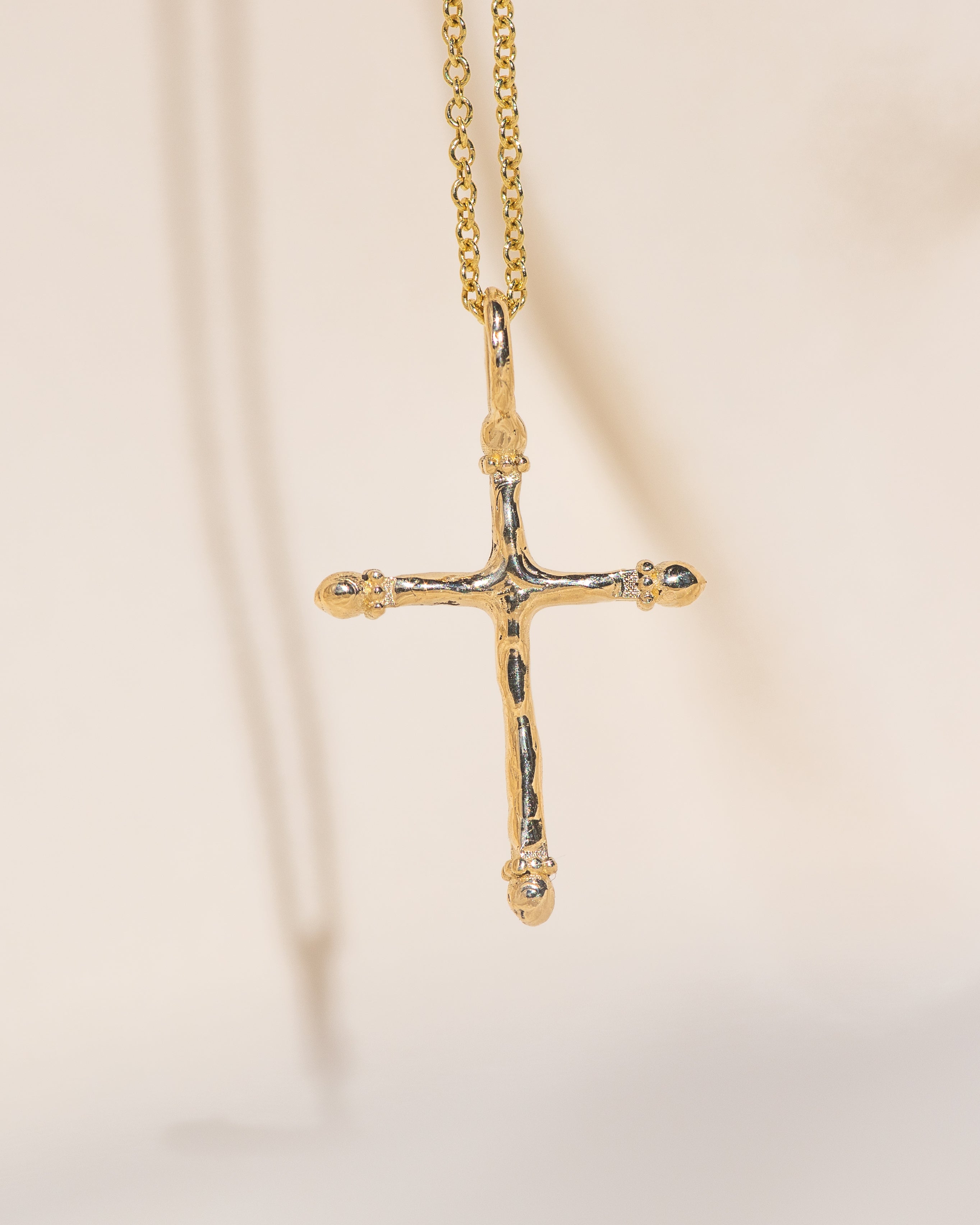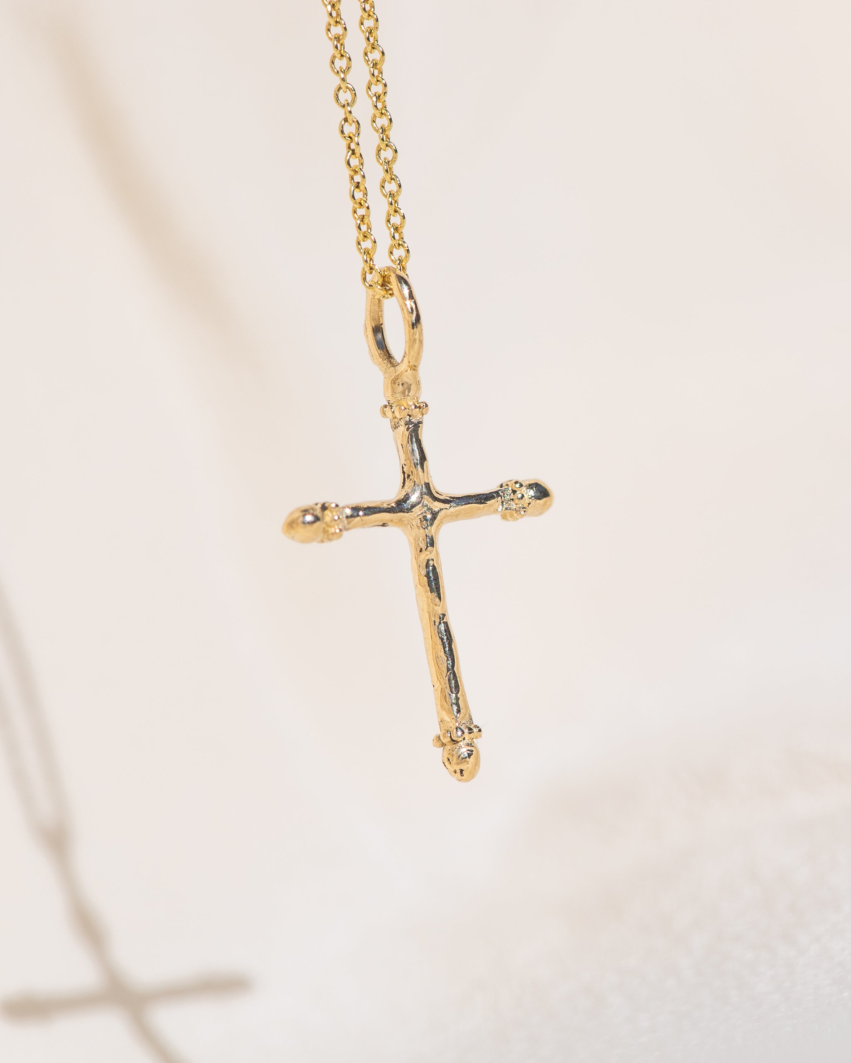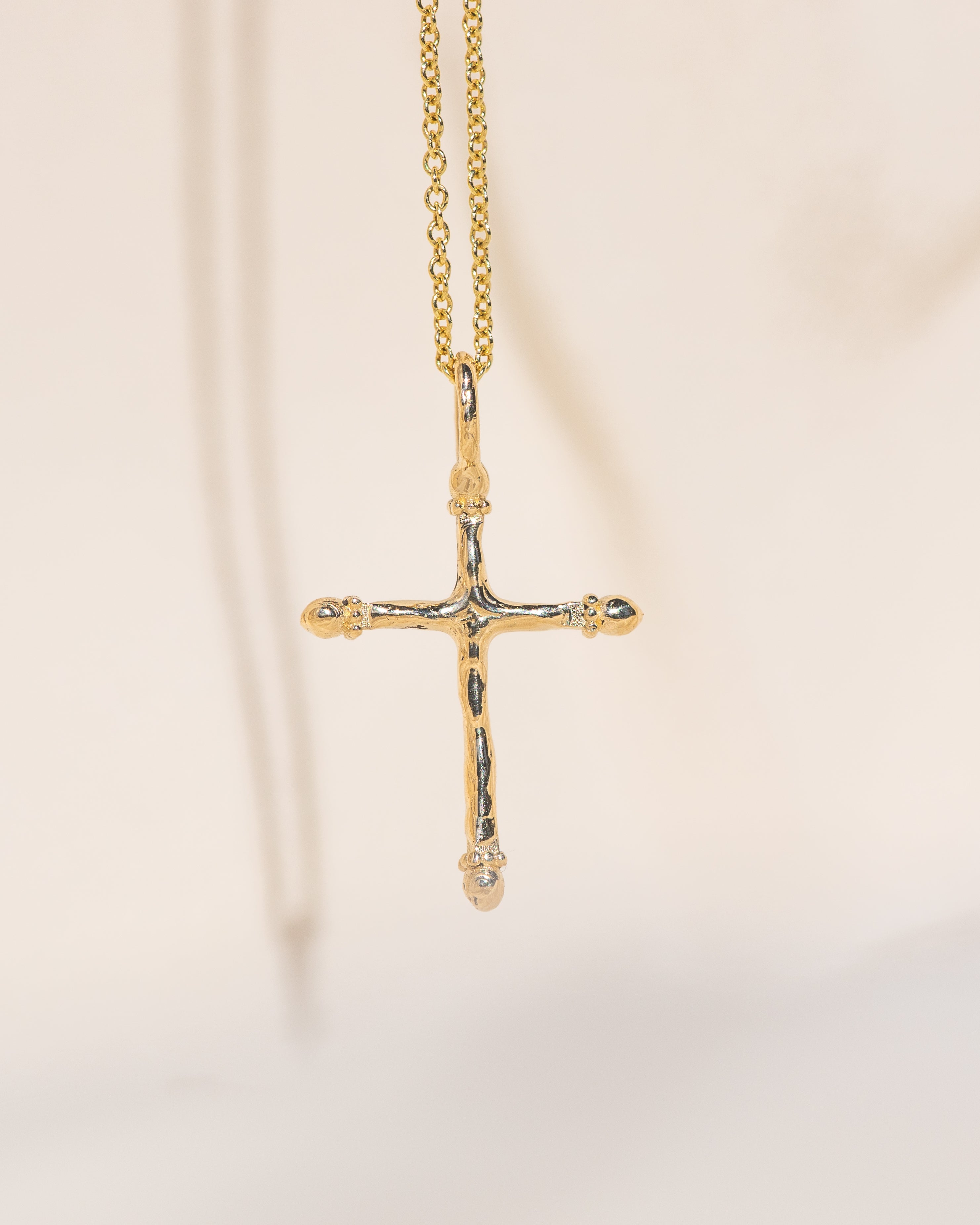 Inspired by an antique 18th century French amulet, the Cross of Revelation was designed to draw on the devotional crosses worn in France in a time when faith, symbolism and artistry were interwoven. Its delicate silhouette nestles into the historic family of the Croix Bourgeonnante {the Budding Cross}, a style that was extremely common in French devotional jewelry from the medieval era through the 1700s. Its small budded terminals embody the blossoming of faith, resurrection, the unfolding of Divine knowledge, and the spiritual awakening that occurs when we turn towards the Divine. It represents the blossoming of inner truth, guiding us towards clarity, devotion, and spiritual revelation.