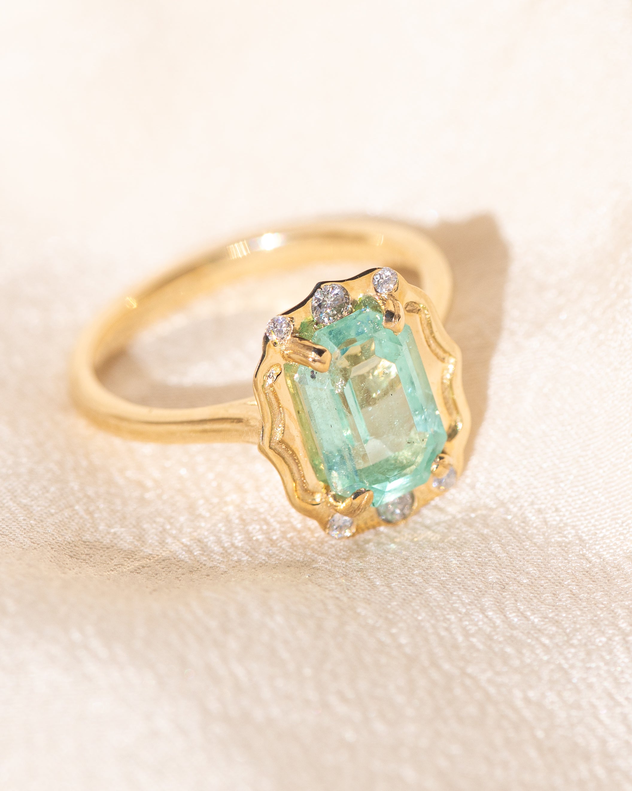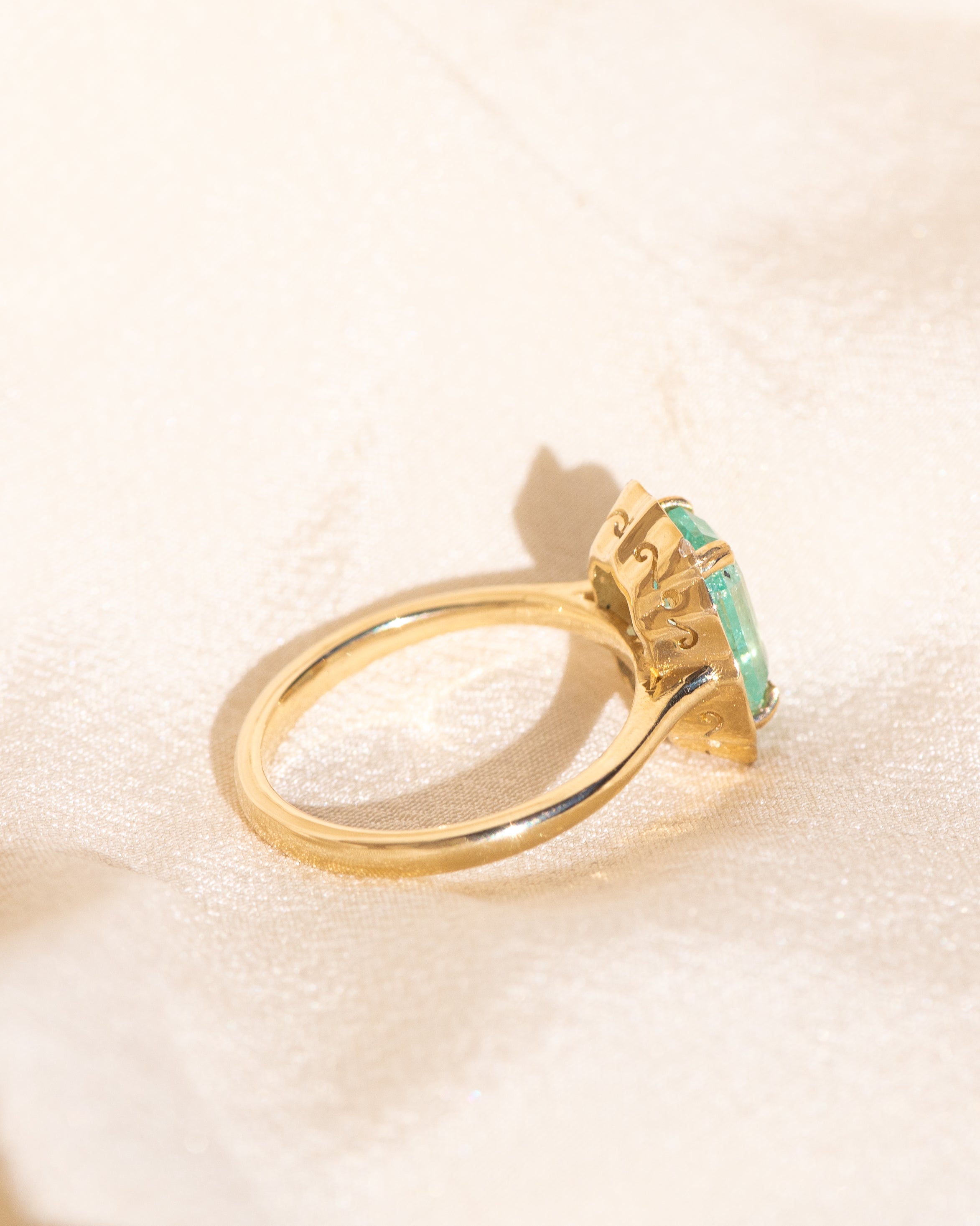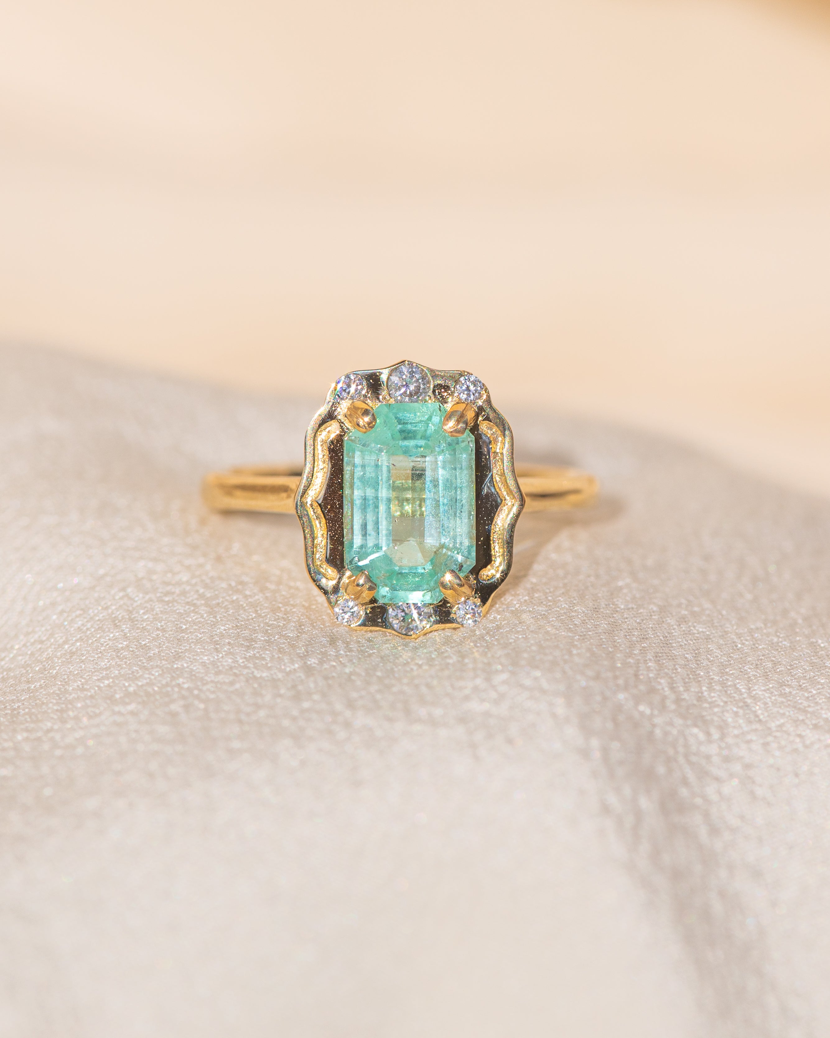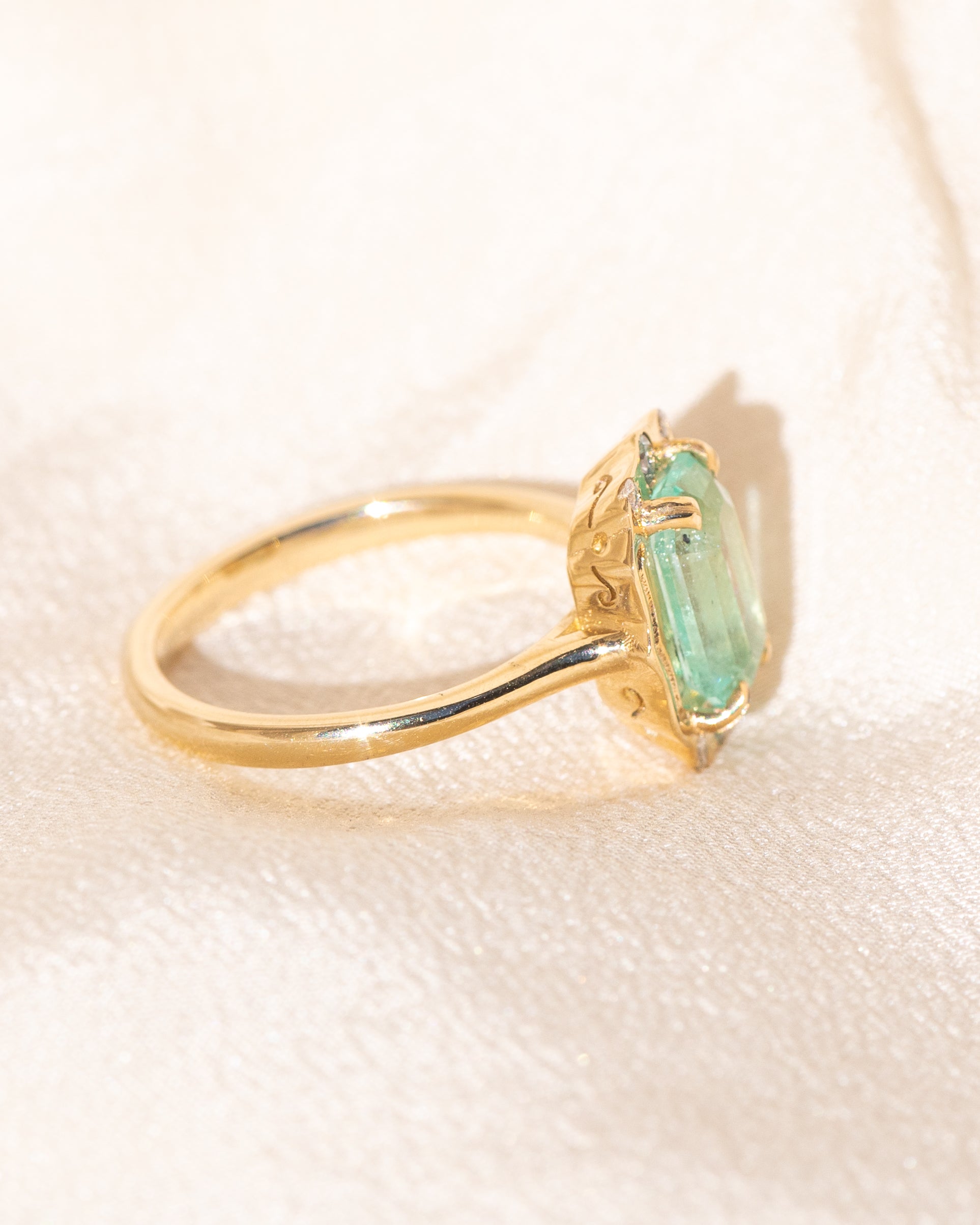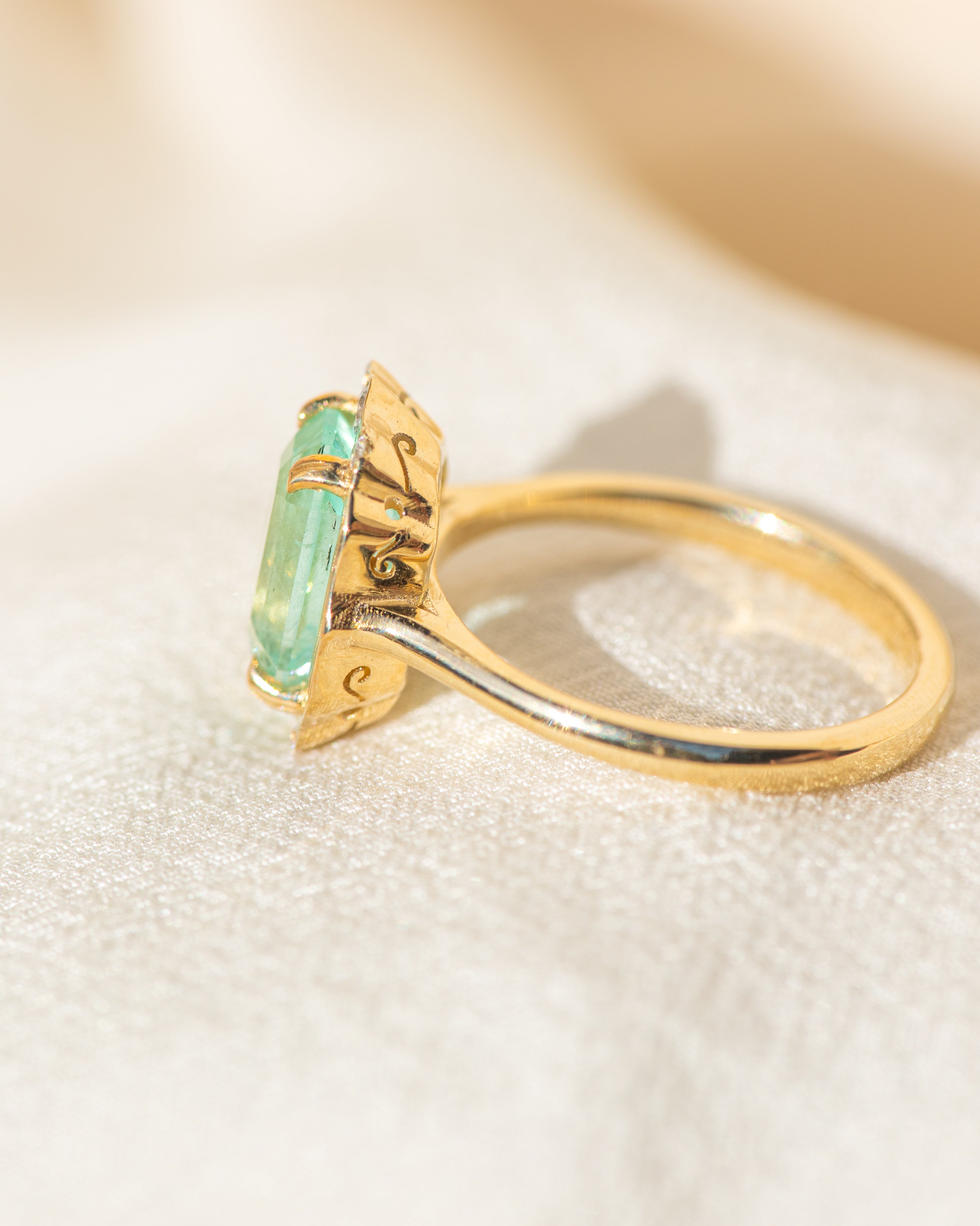 An incredibly luxurious one of a kind 14k Yellow Gold solitaire ring featuring a stunning 2 CT emerald cut mint-colored 6.35 x 9.82m Nigerian Emerald, set within a rococo detailed frame, kissed with 6 diamonds. A Divine piece unlike any other, filled with unconditional love, beauty and elegant details.