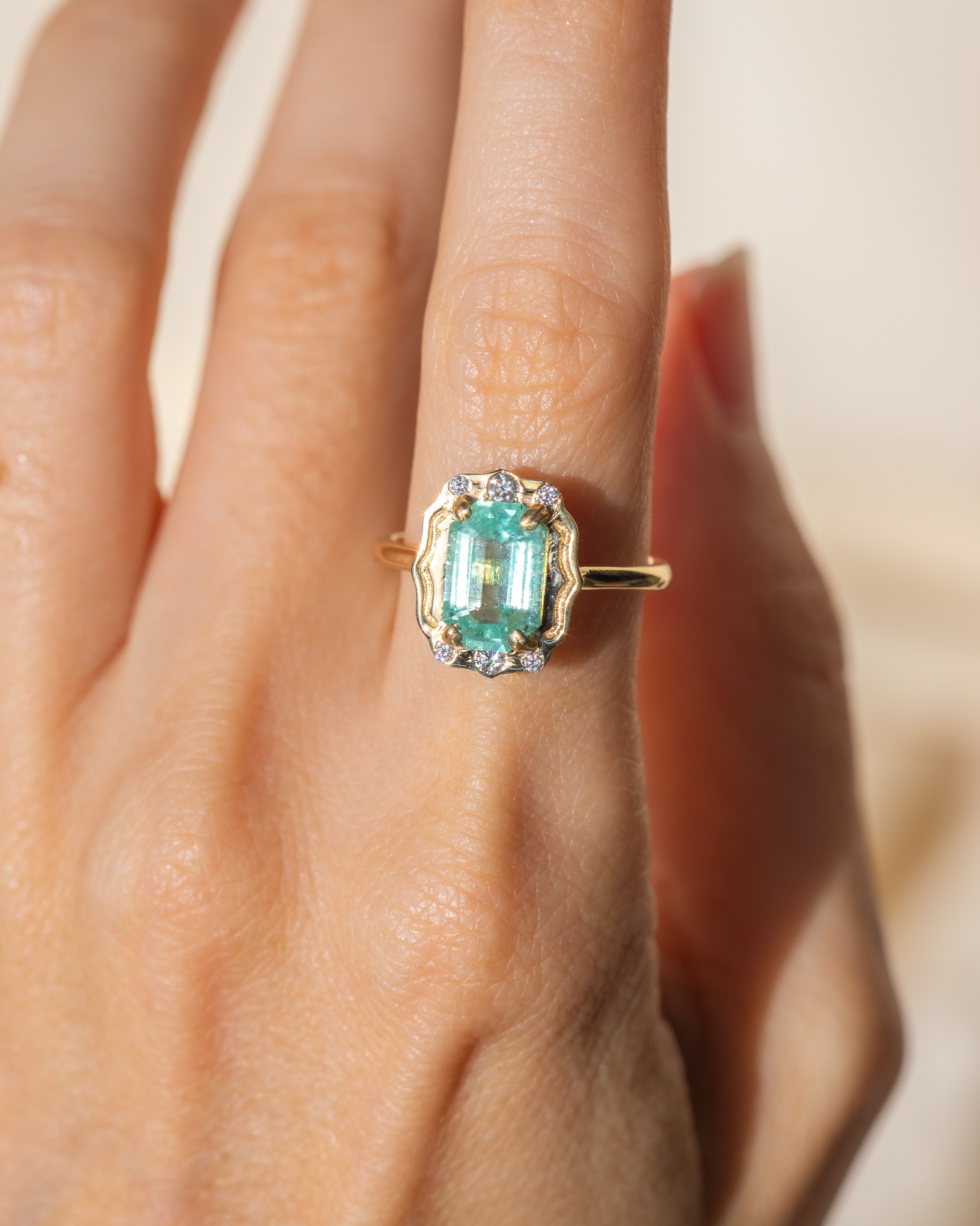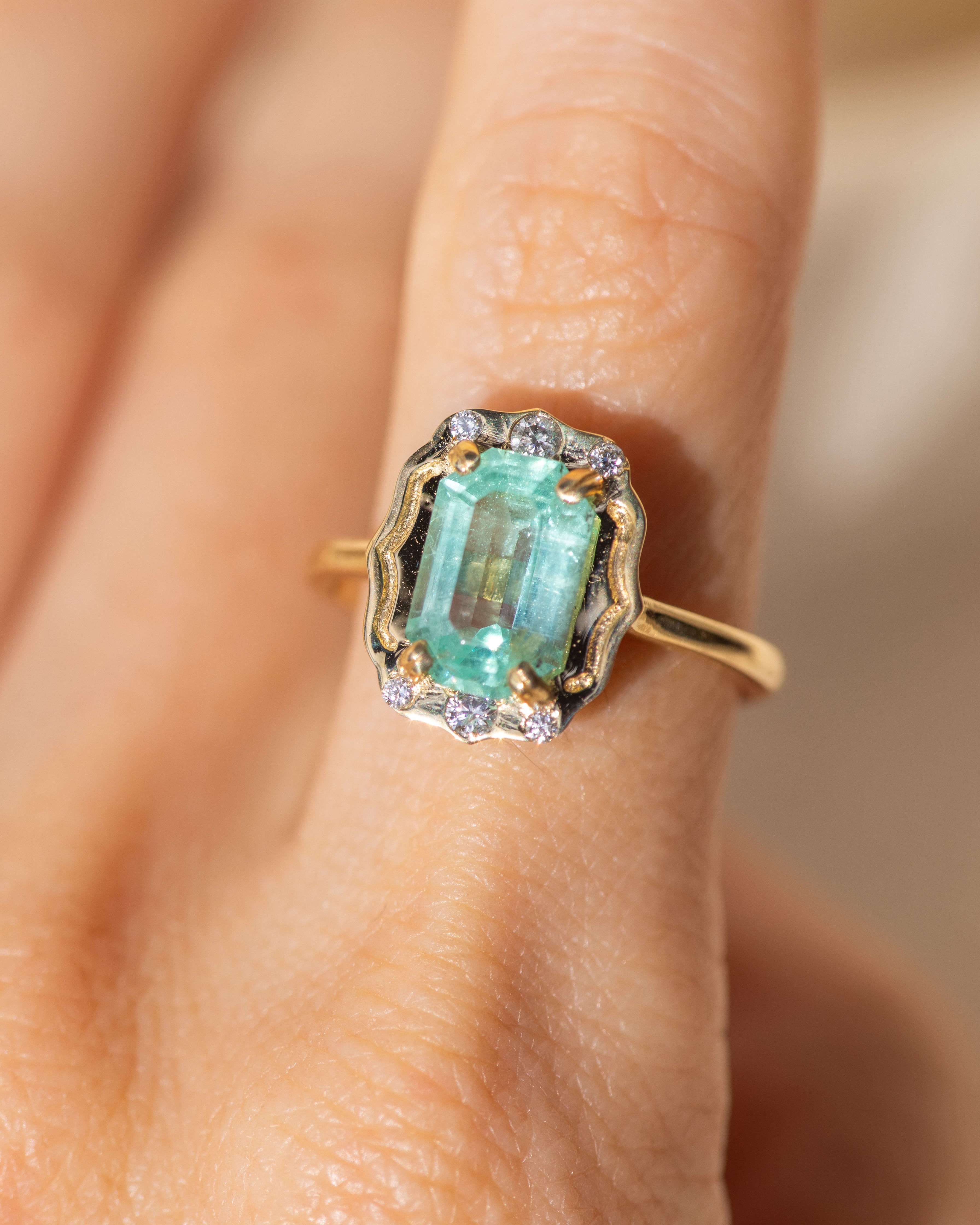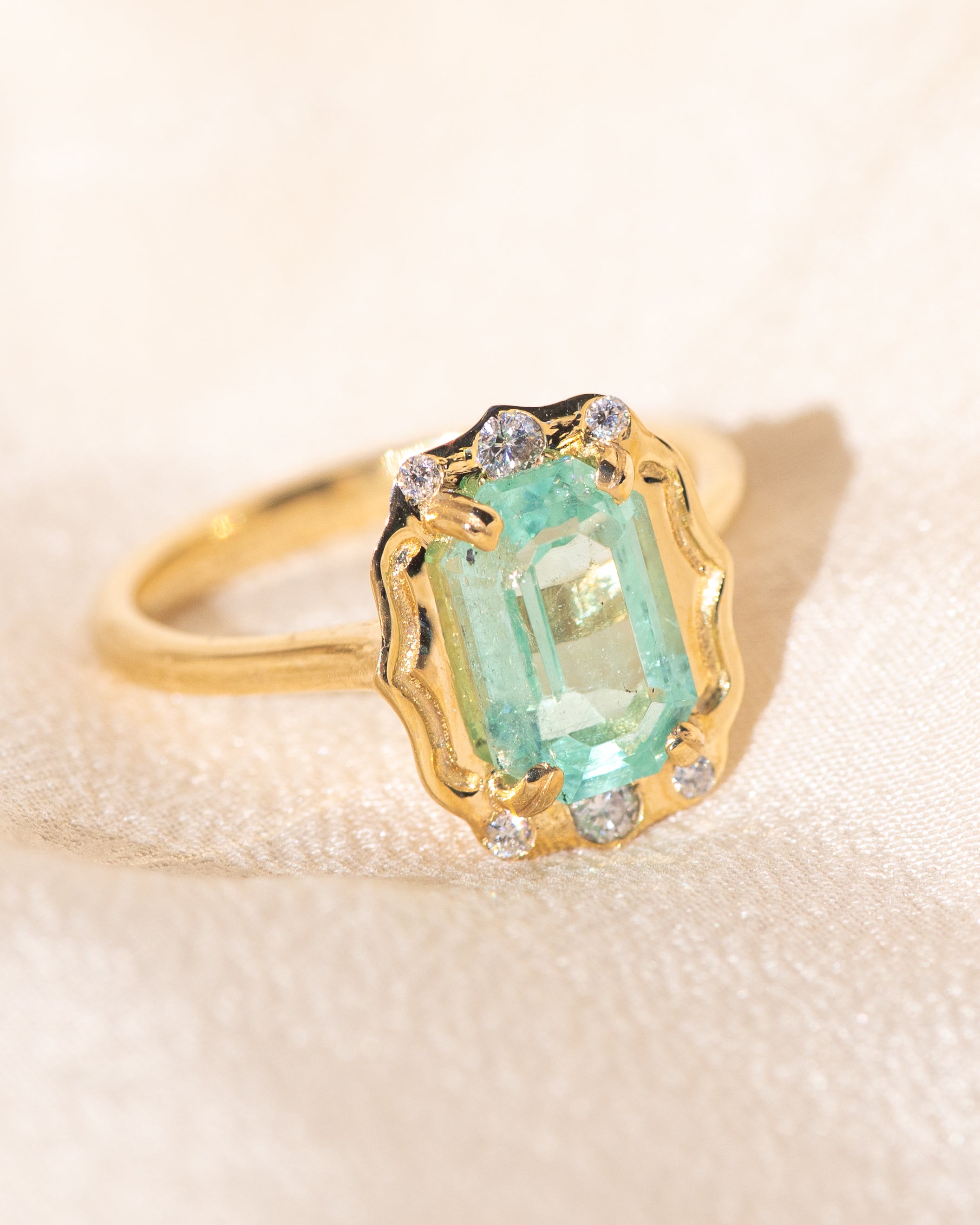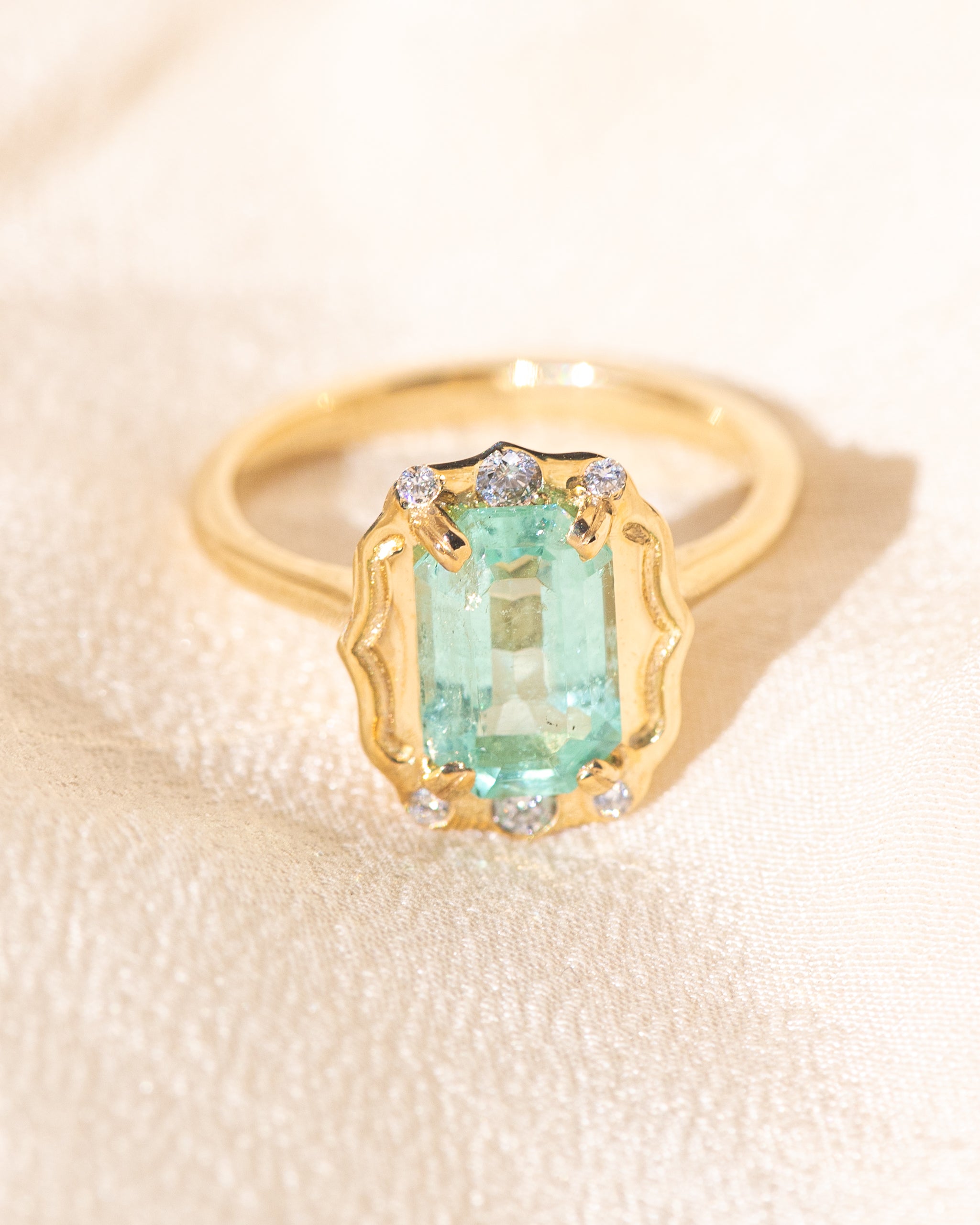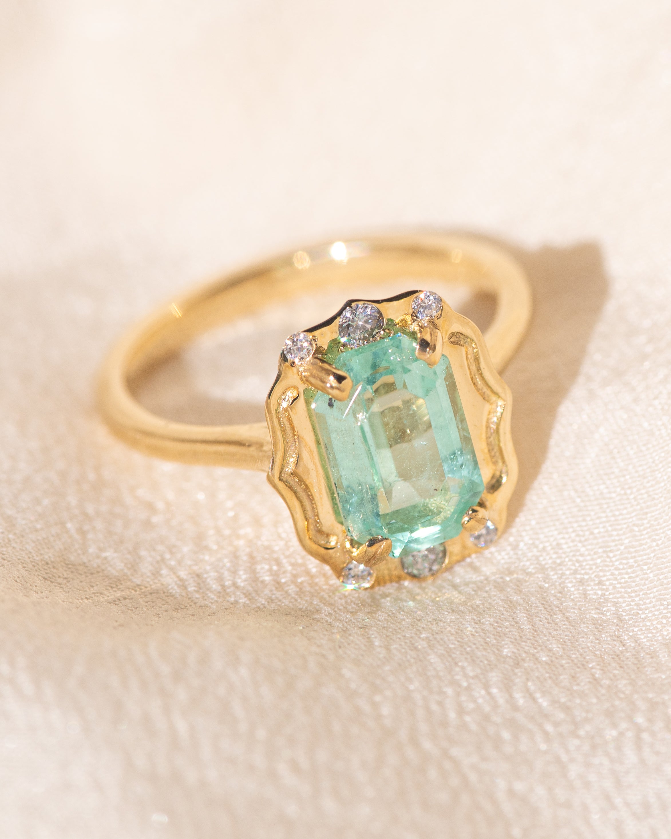 An incredibly luxurious one of a kind 14k Yellow Gold solitaire ring featuring a stunning 2 CT emerald cut mint-colored 6.35 x 9.82m Nigerian Emerald, set within a rococo detailed frame, kissed with 6 diamonds. A Divine piece unlike any other, filled with unconditional love, beauty and elegant details.