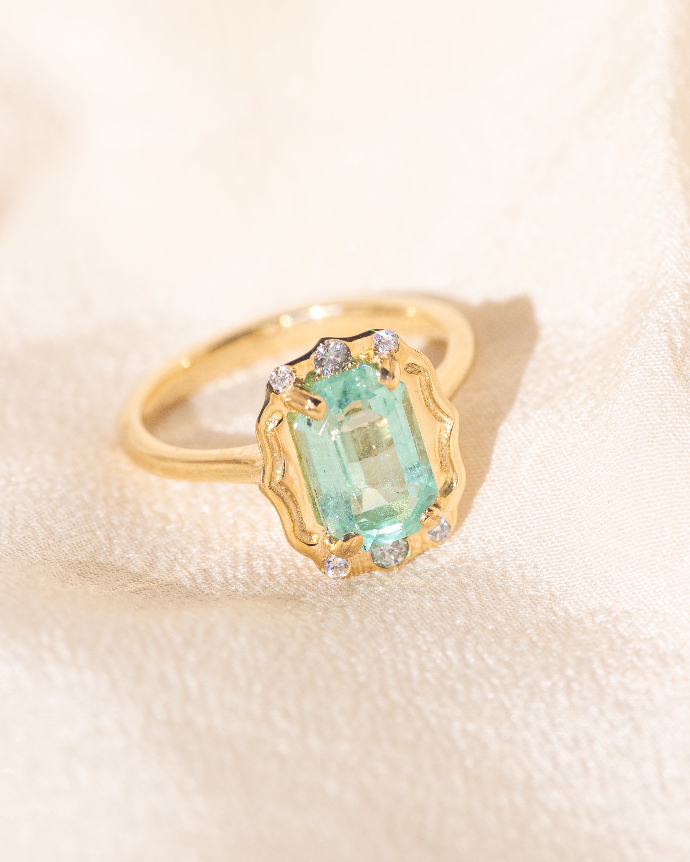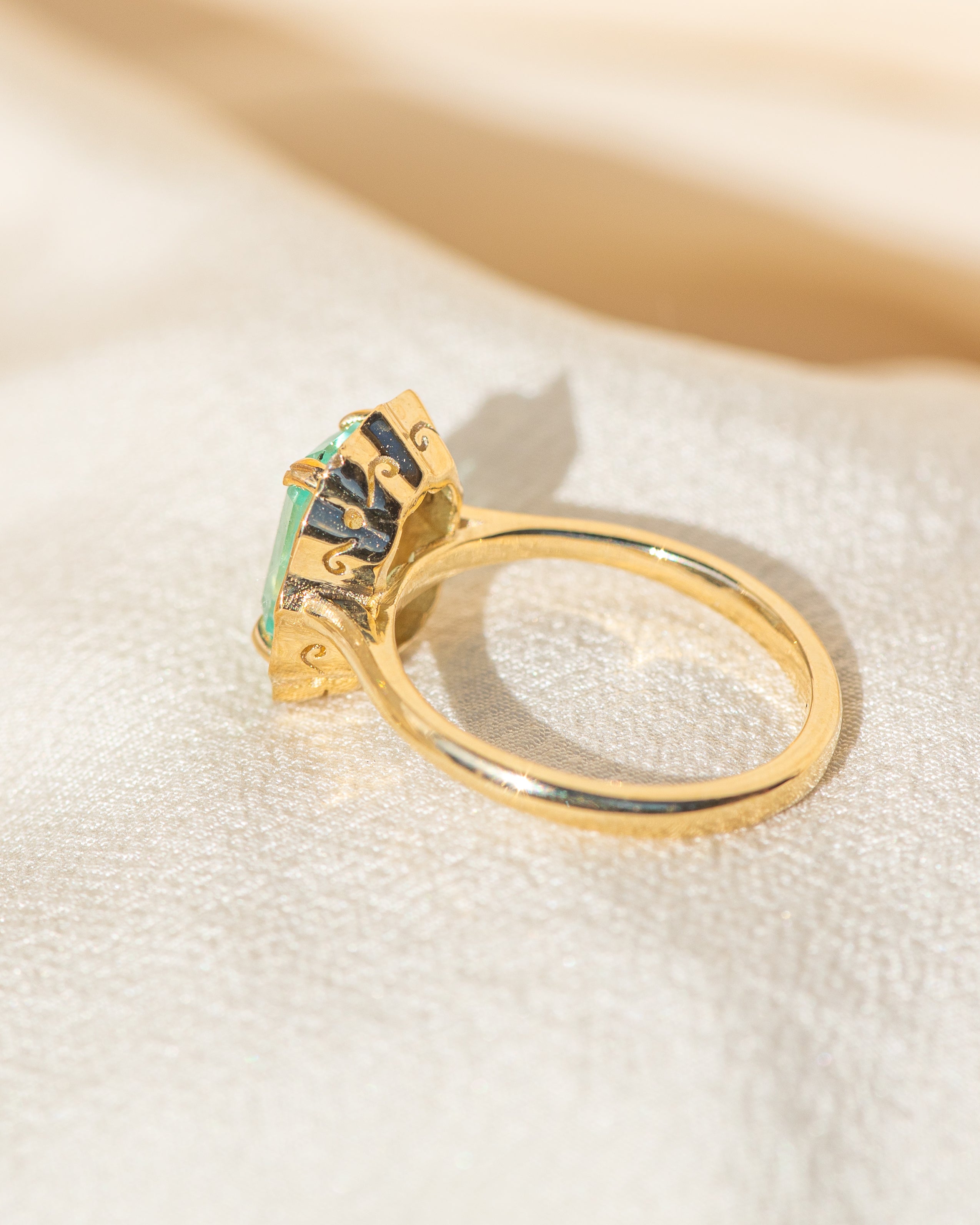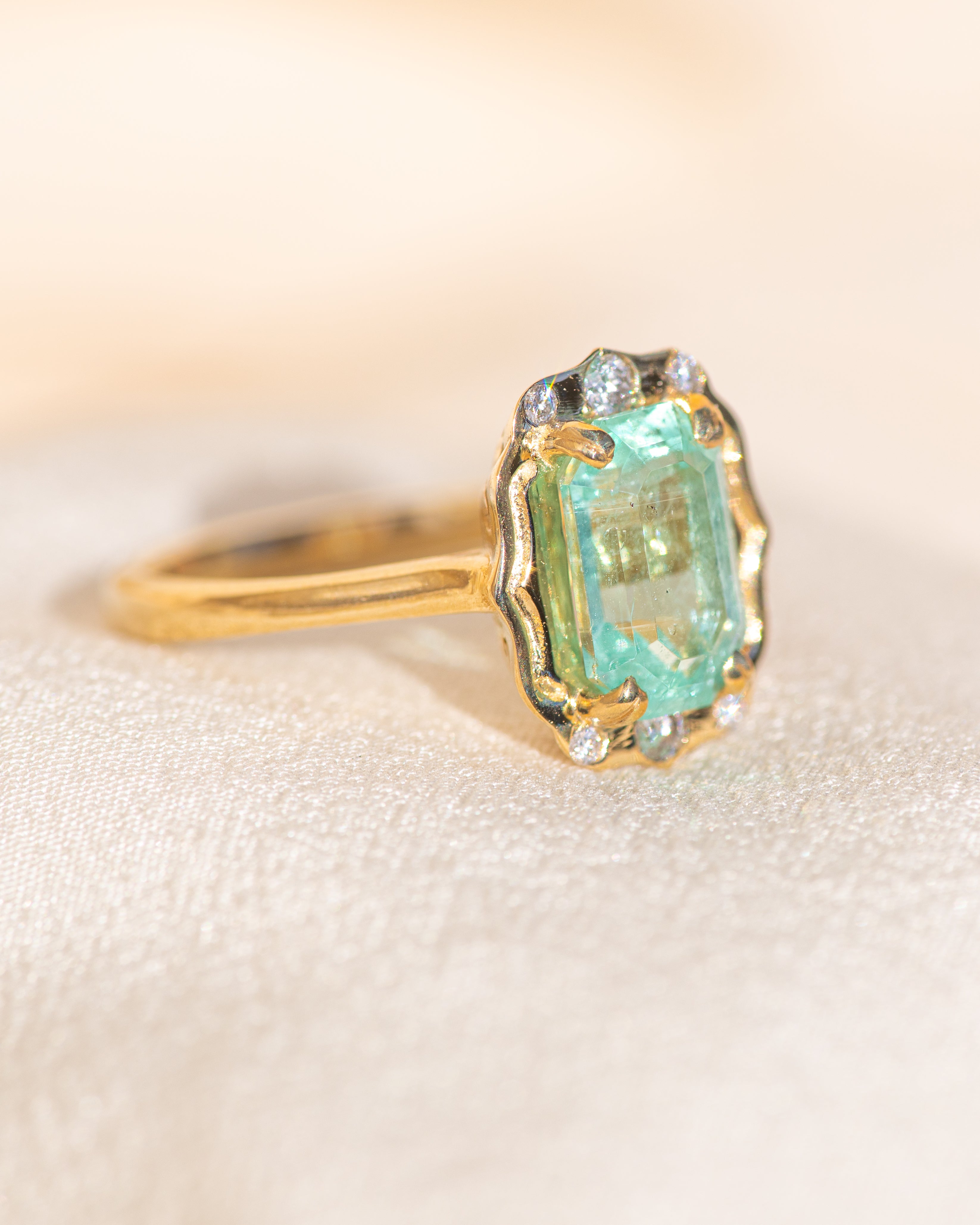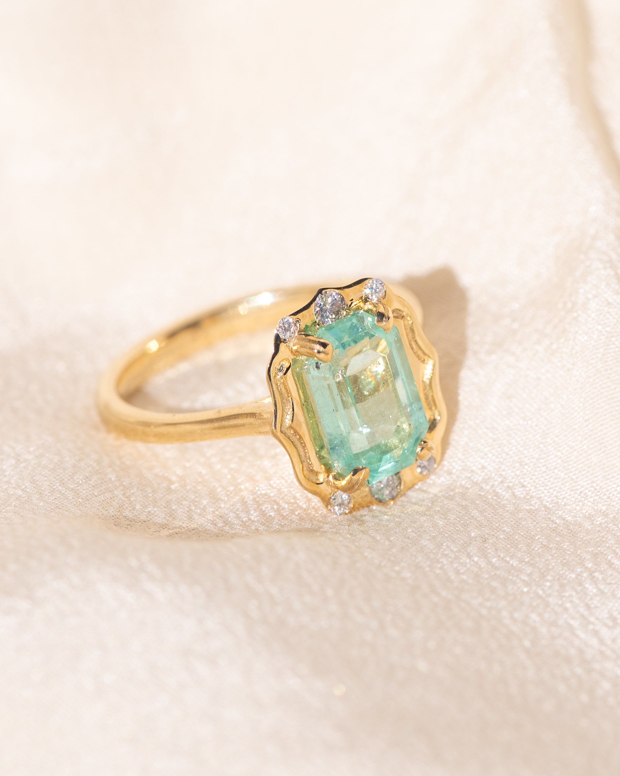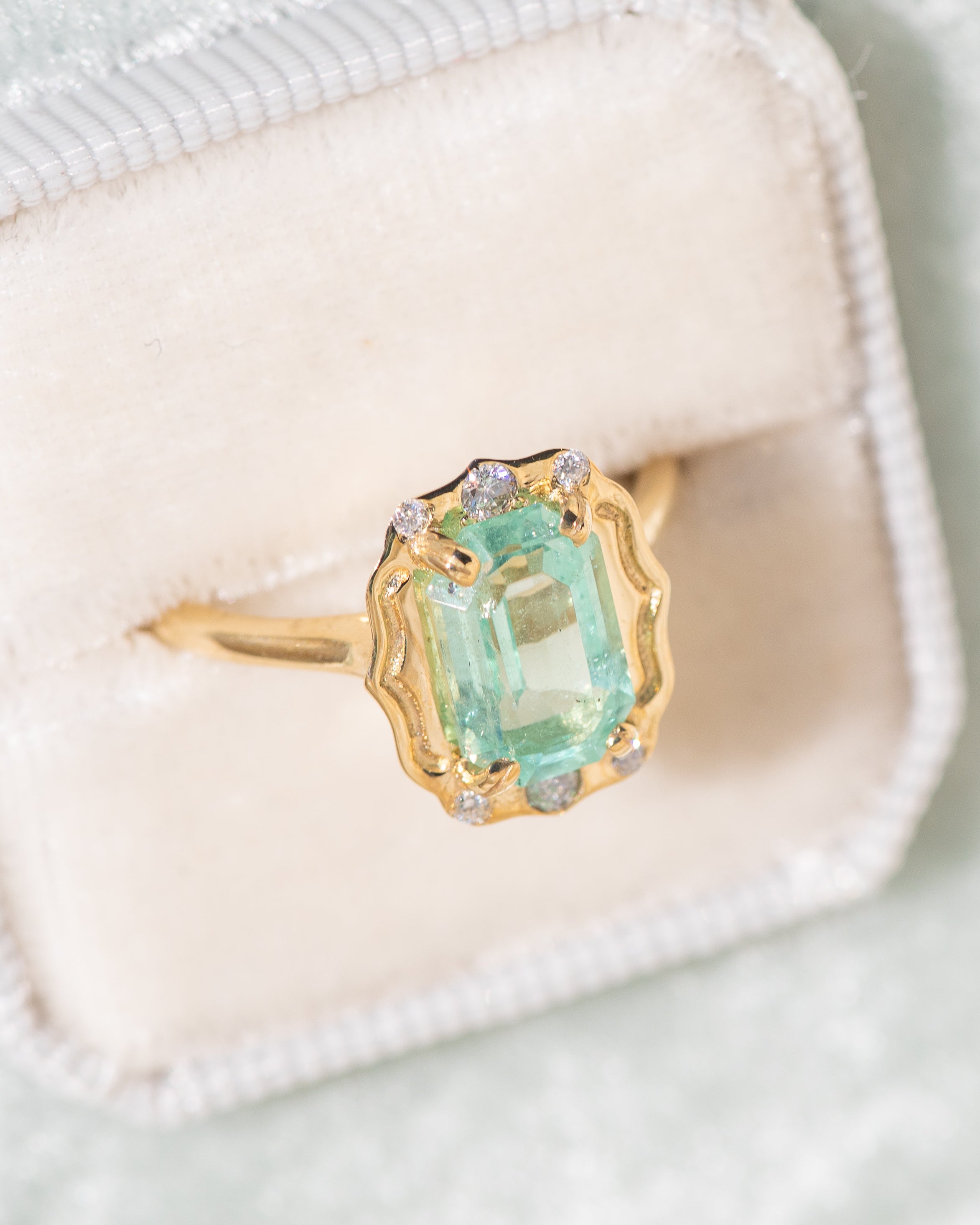 An incredibly luxurious one of a kind 14k Yellow Gold solitaire ring featuring a stunning 2 CT emerald cut mint-colored 6.35 x 9.82m Nigerian Emerald, set within a rococo detailed frame, kissed with 6 diamonds. A Divine piece unlike any other, filled with unconditional love, beauty and elegant details.