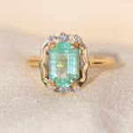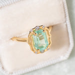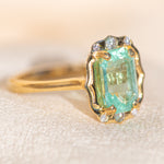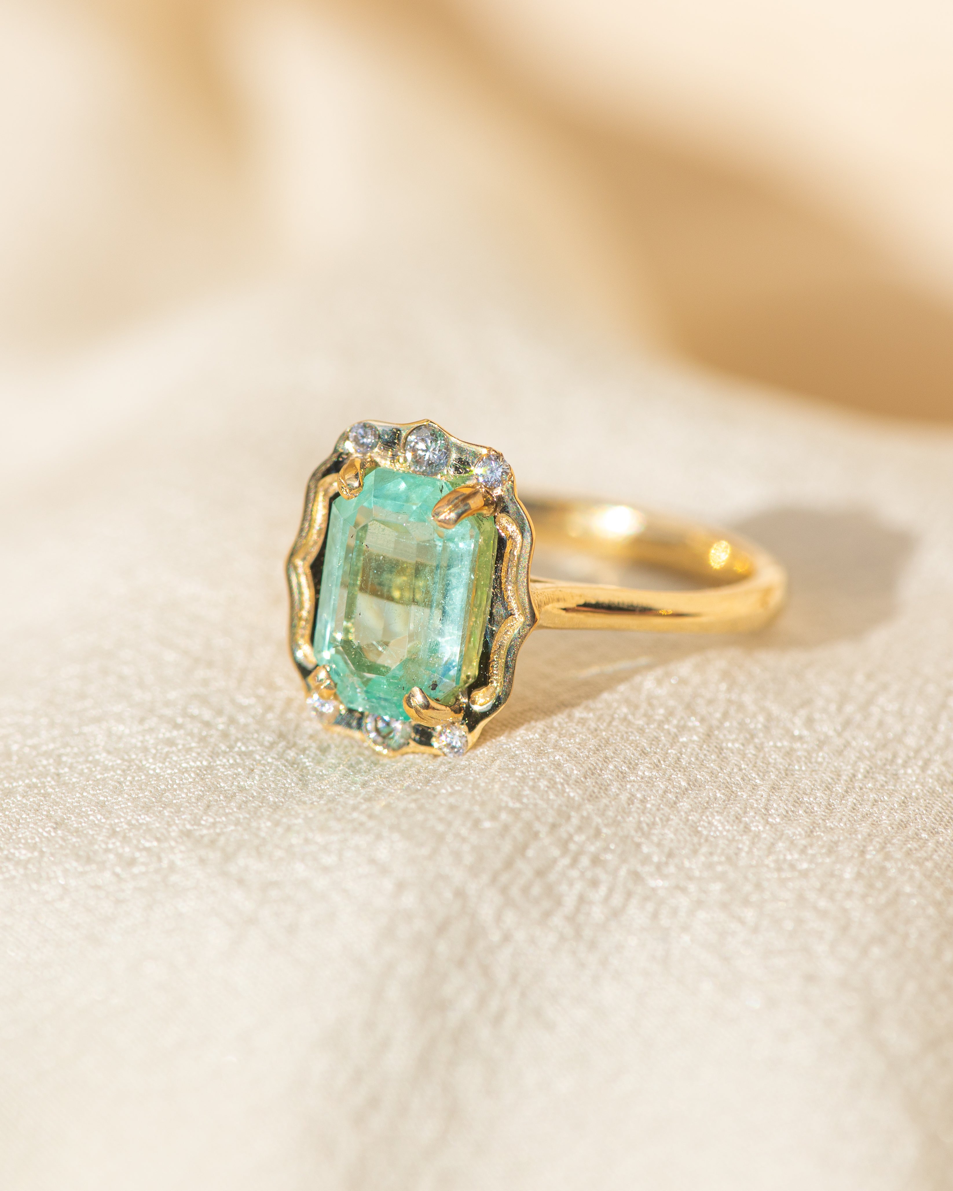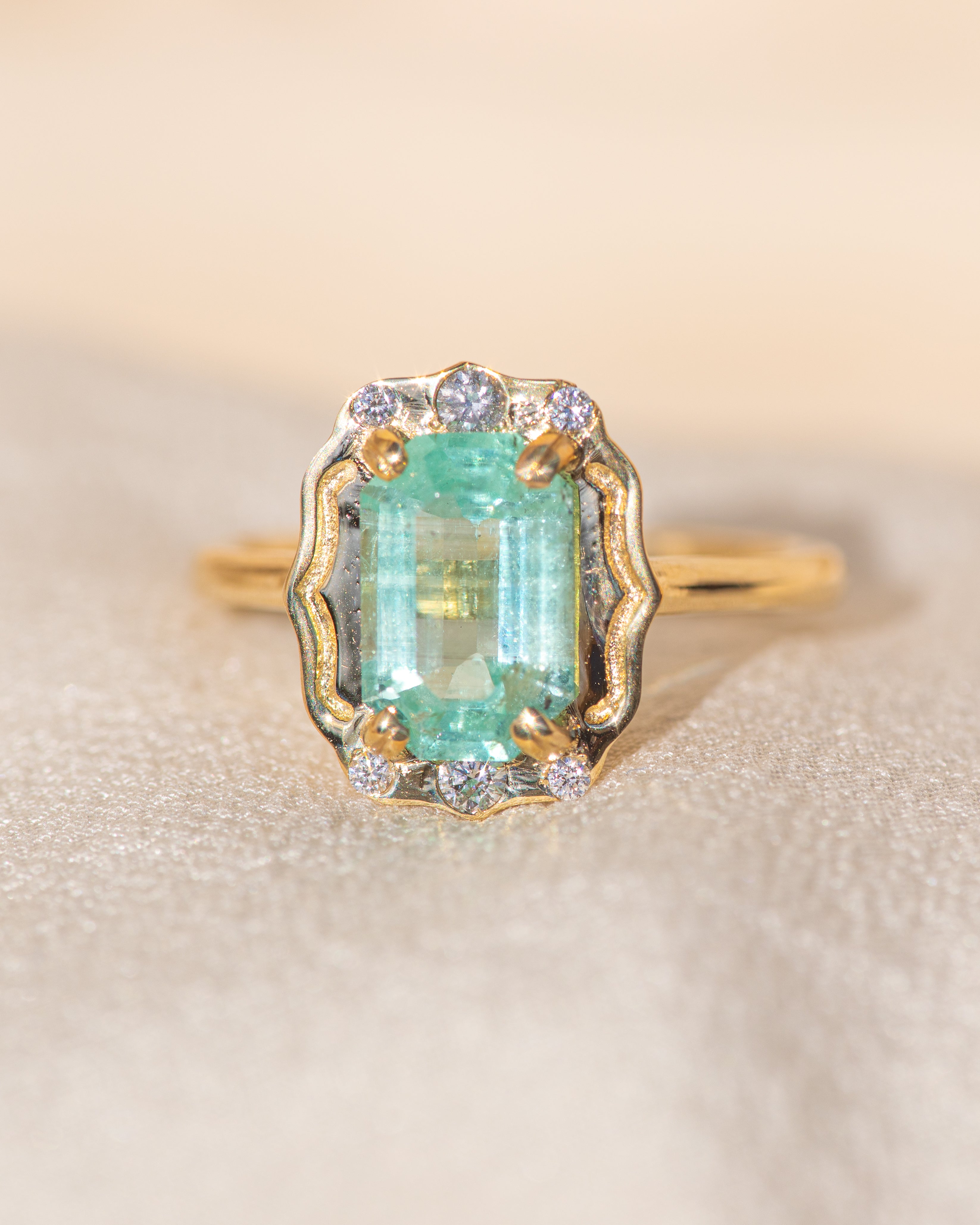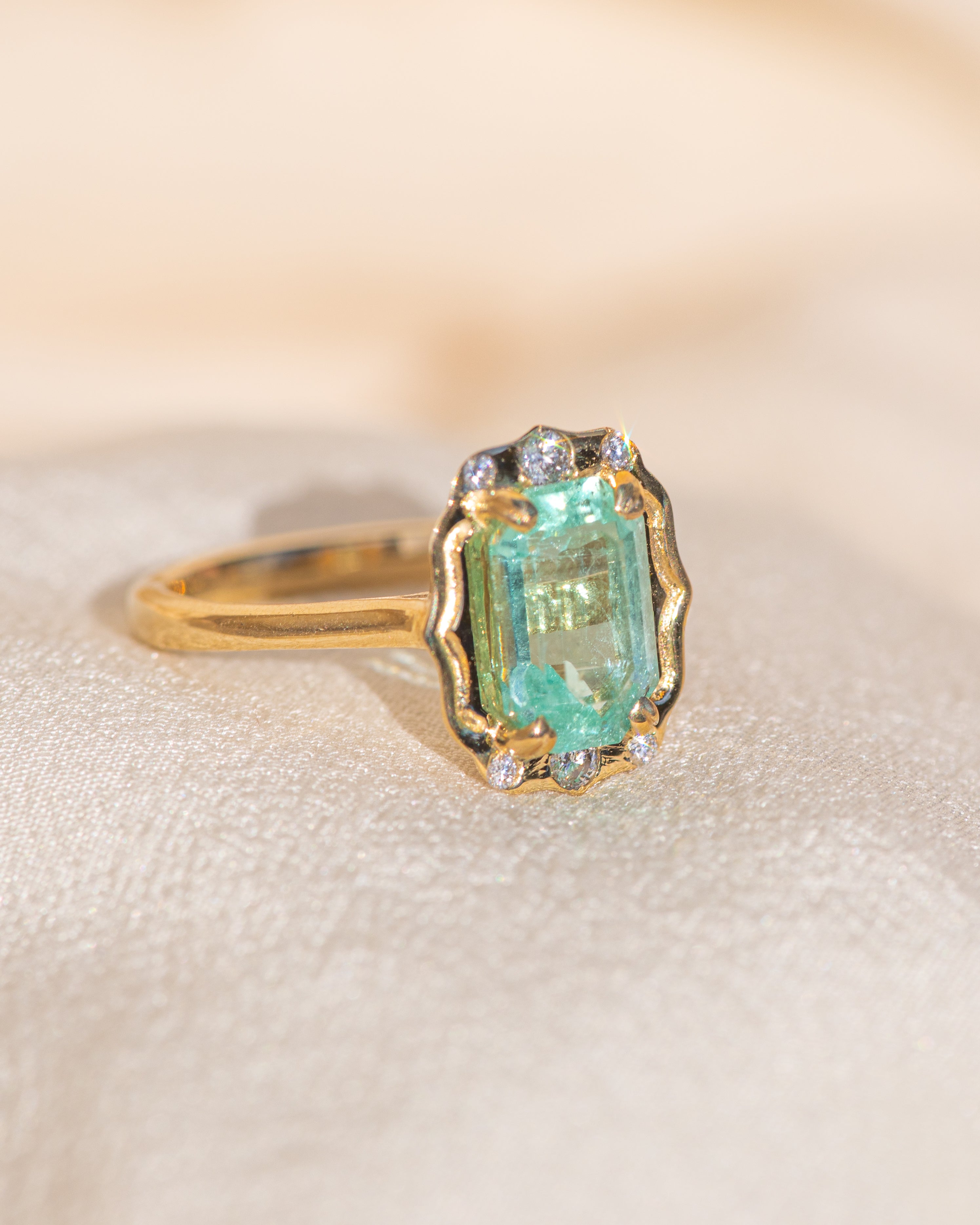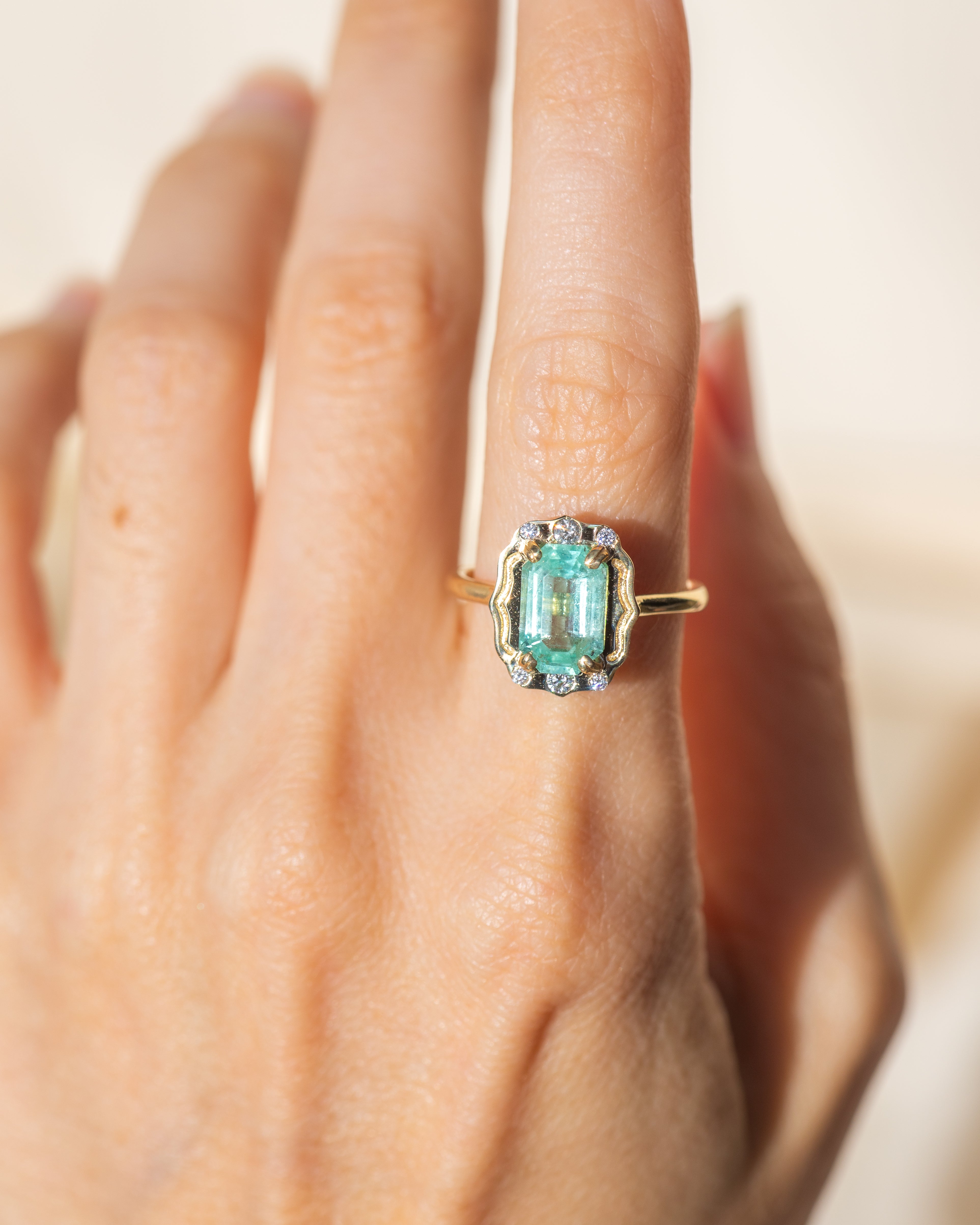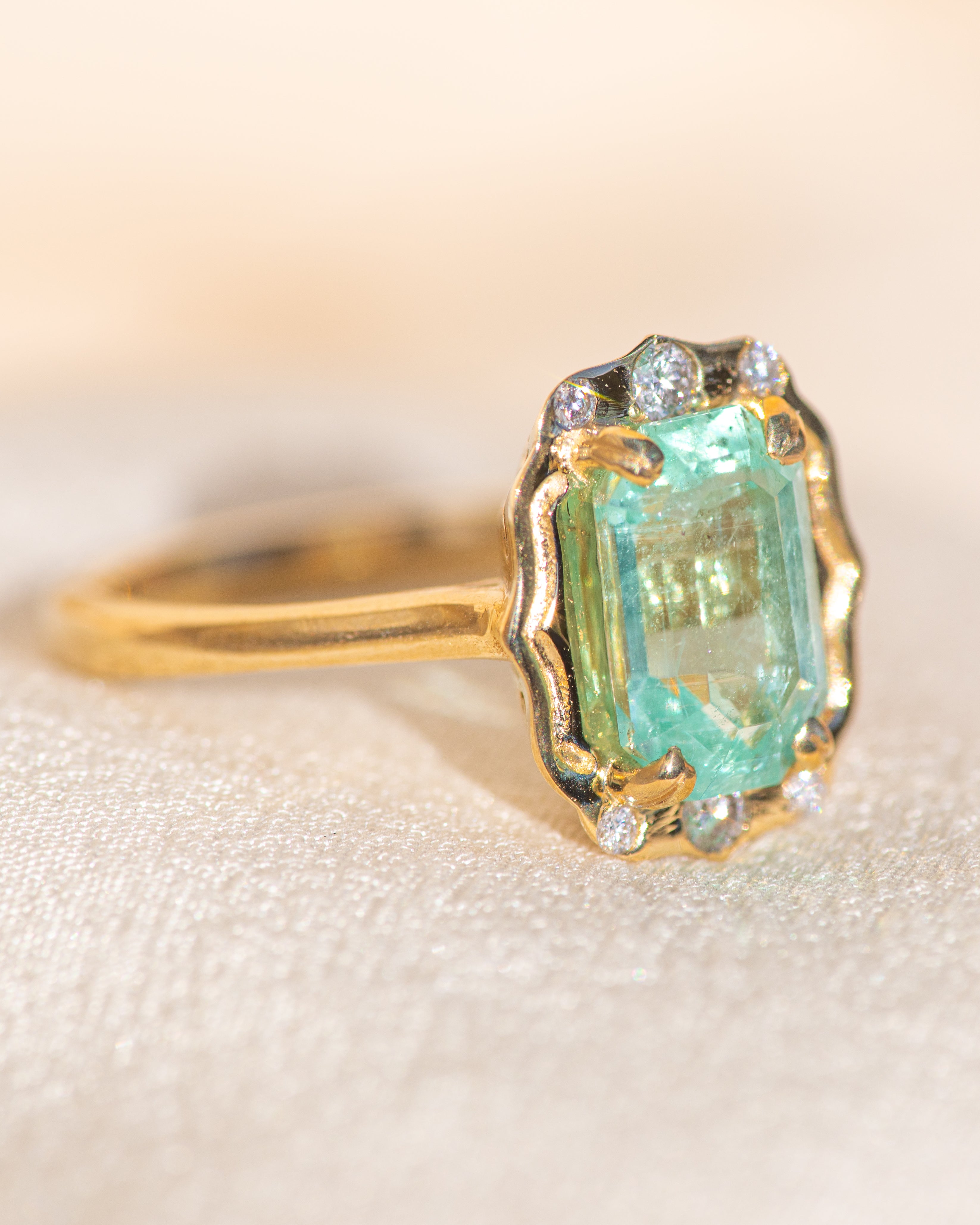 An incredibly luxurious one of a kind 14k Yellow Gold solitaire ring featuring a stunning 2 CT emerald cut mint-colored 6.35 x 9.82m Nigerian Emerald, set within a rococo detailed frame, kissed with 6 diamonds. A Divine piece unlike any other, filled with unconditional love, beauty and elegant details.