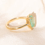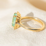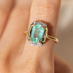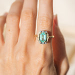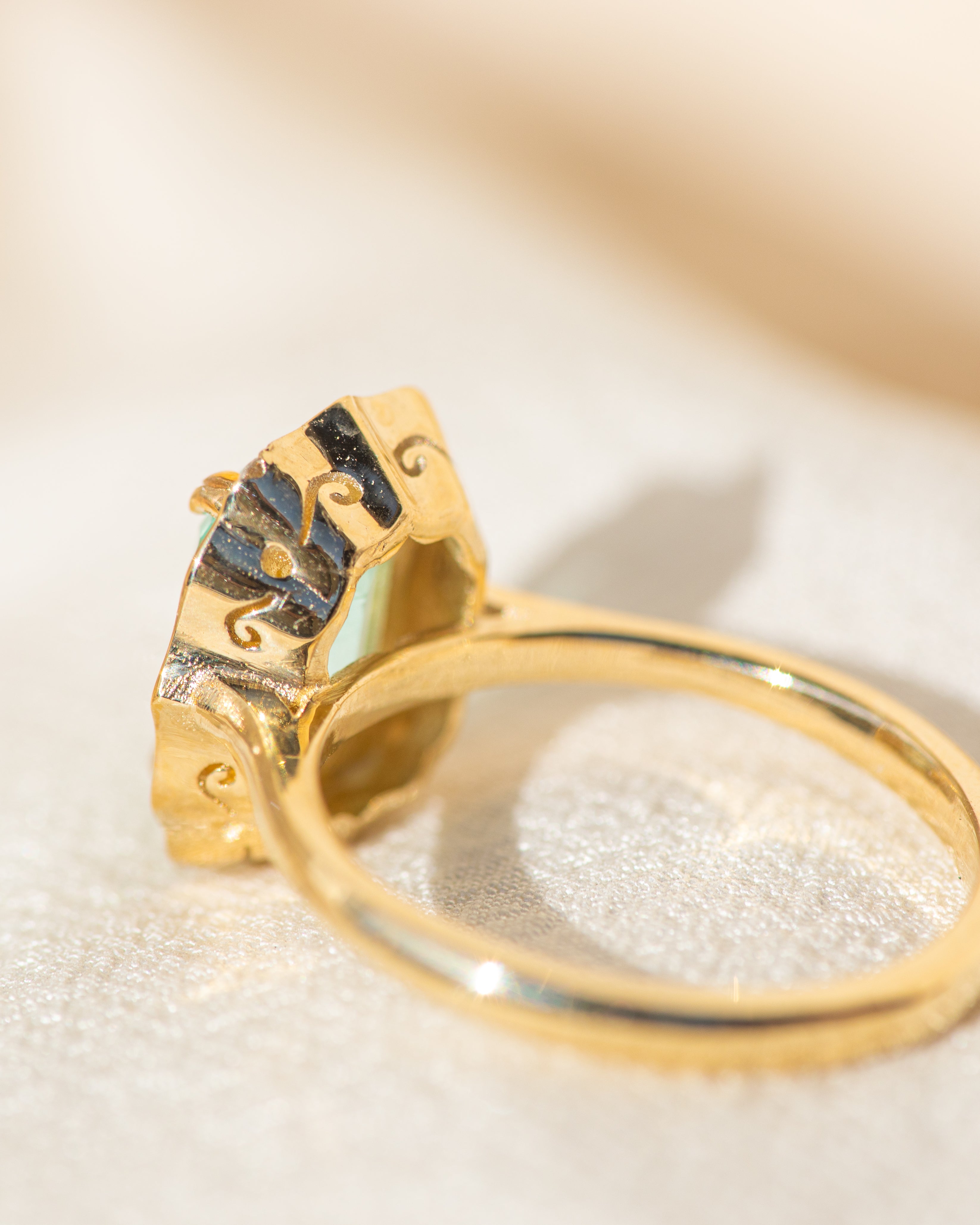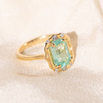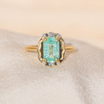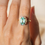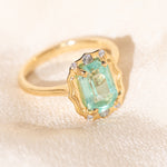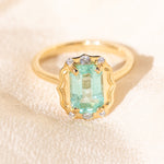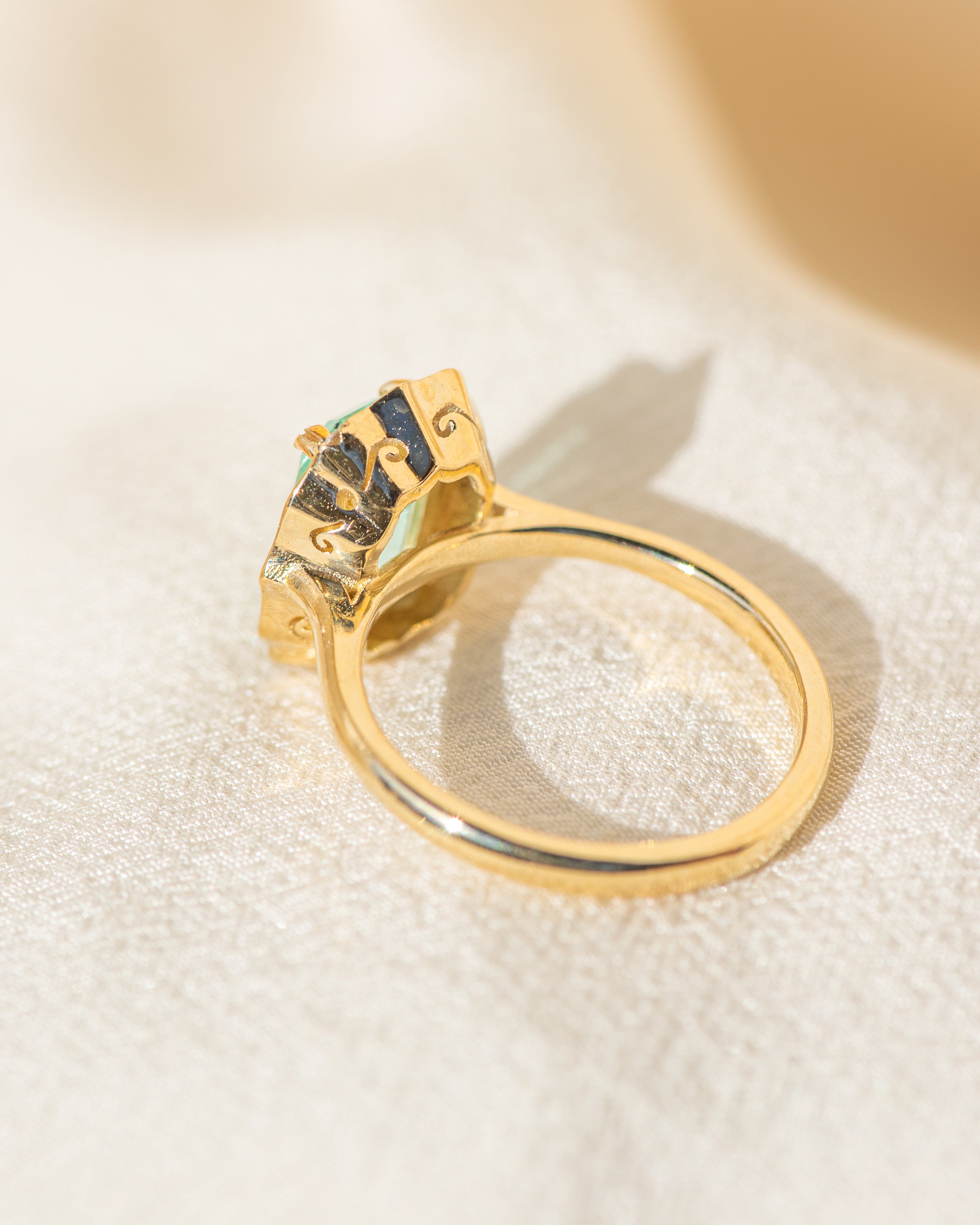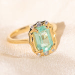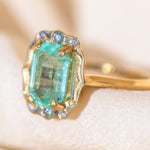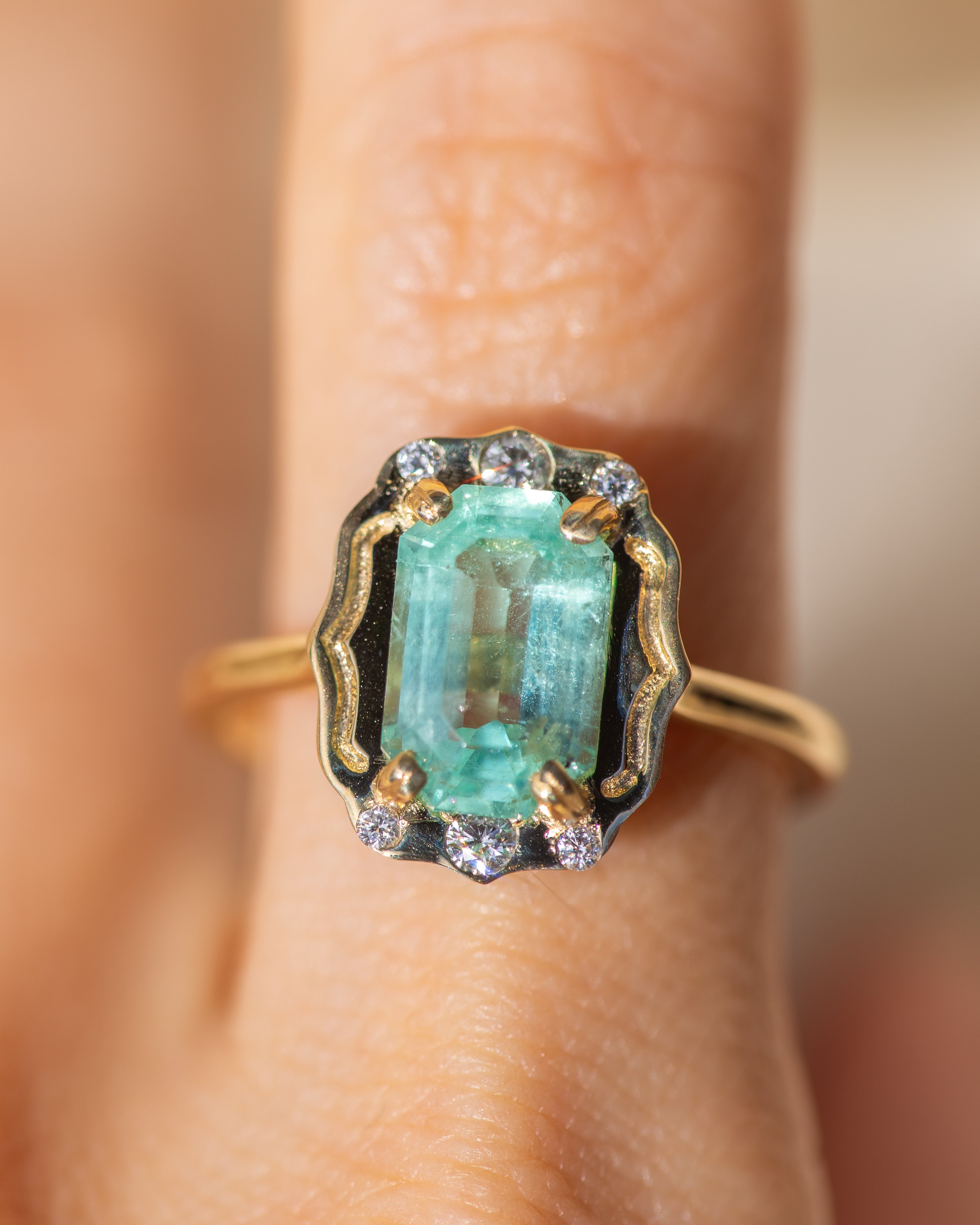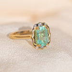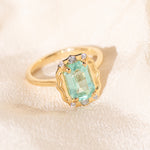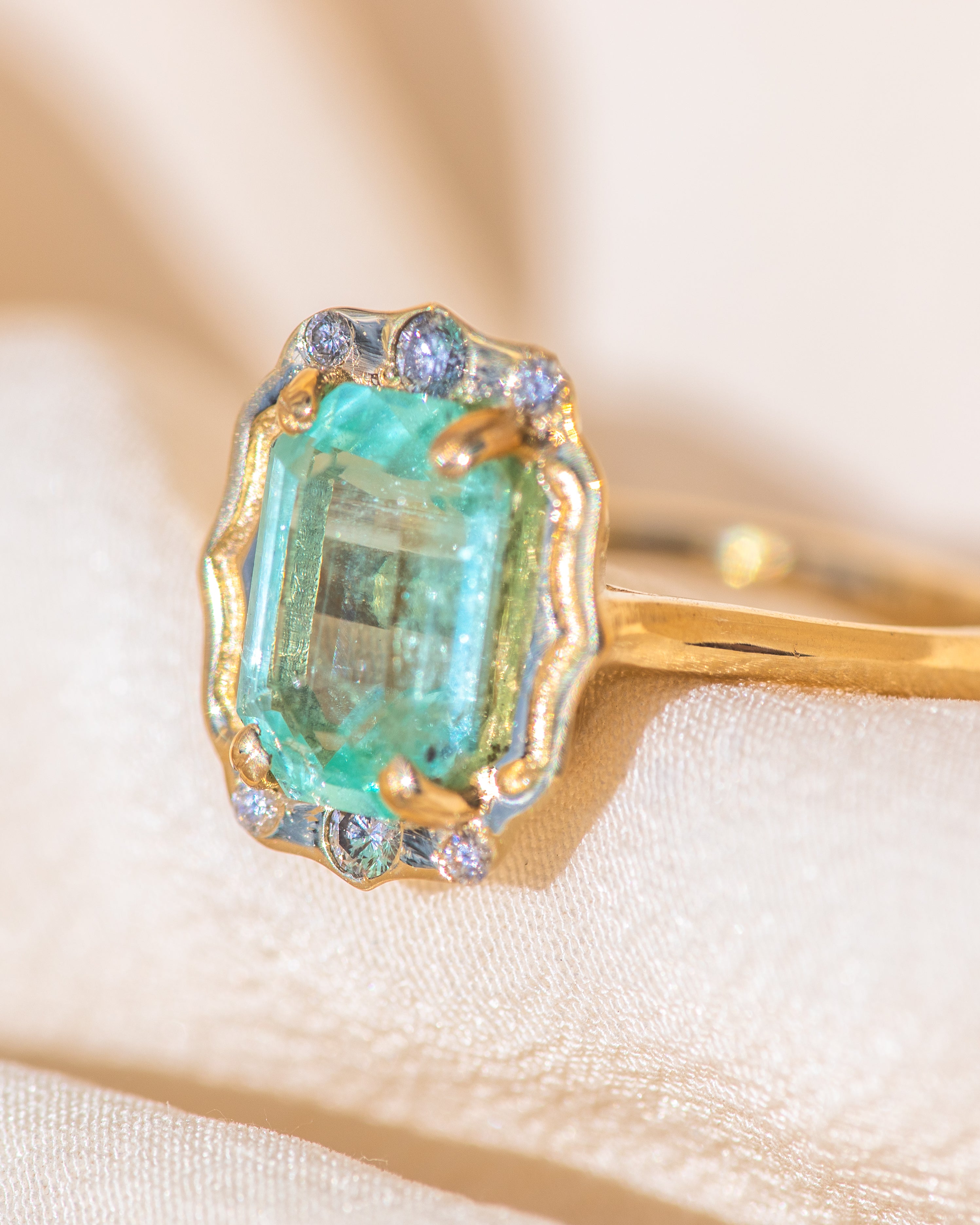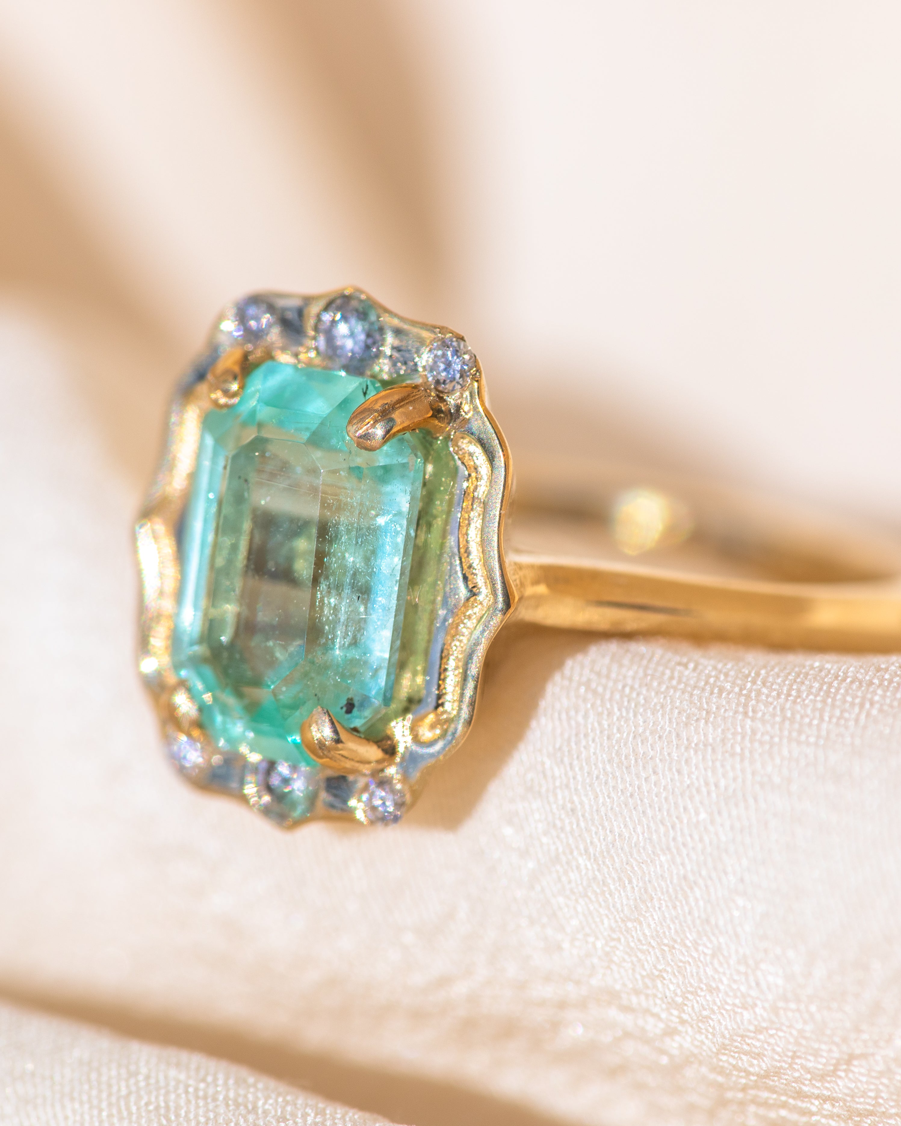 An incredibly luxurious one of a kind 14k Yellow Gold solitaire ring featuring a stunning 2 CT emerald cut mint-colored 6.35 x 9.82m Nigerian Emerald, set within a rococo detailed frame, kissed with 6 diamonds. A Divine piece unlike any other, filled with unconditional love, beauty and elegant details.