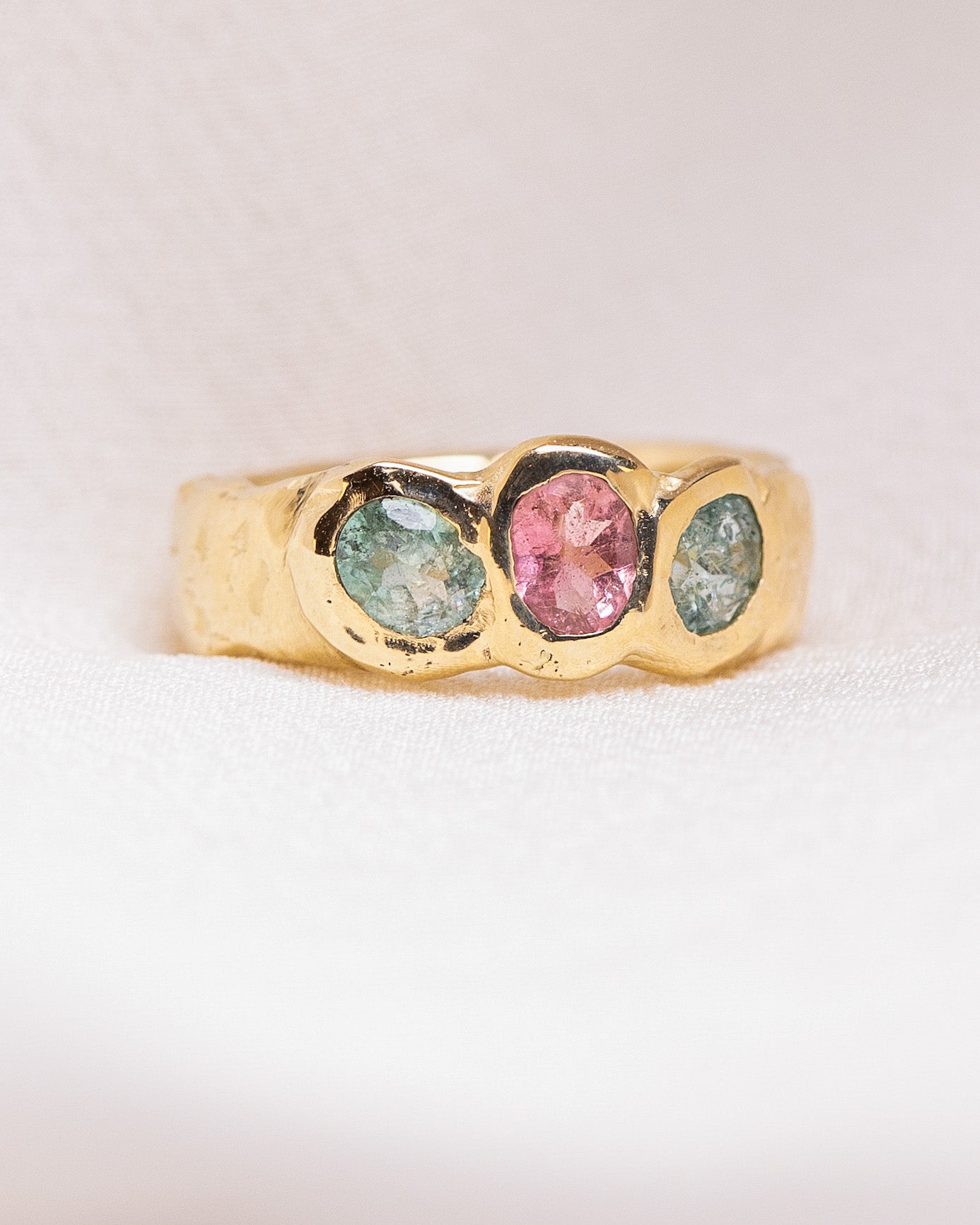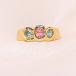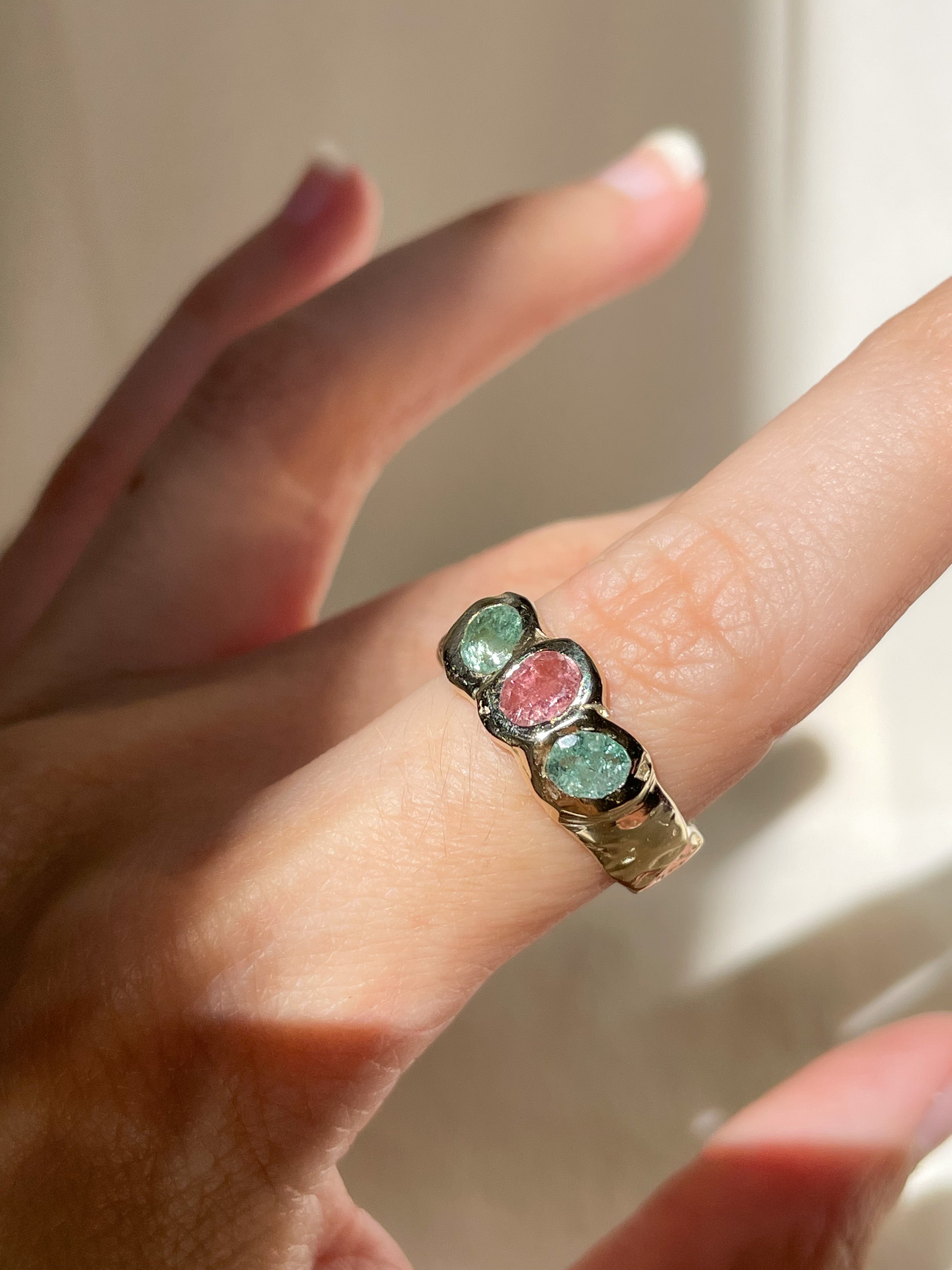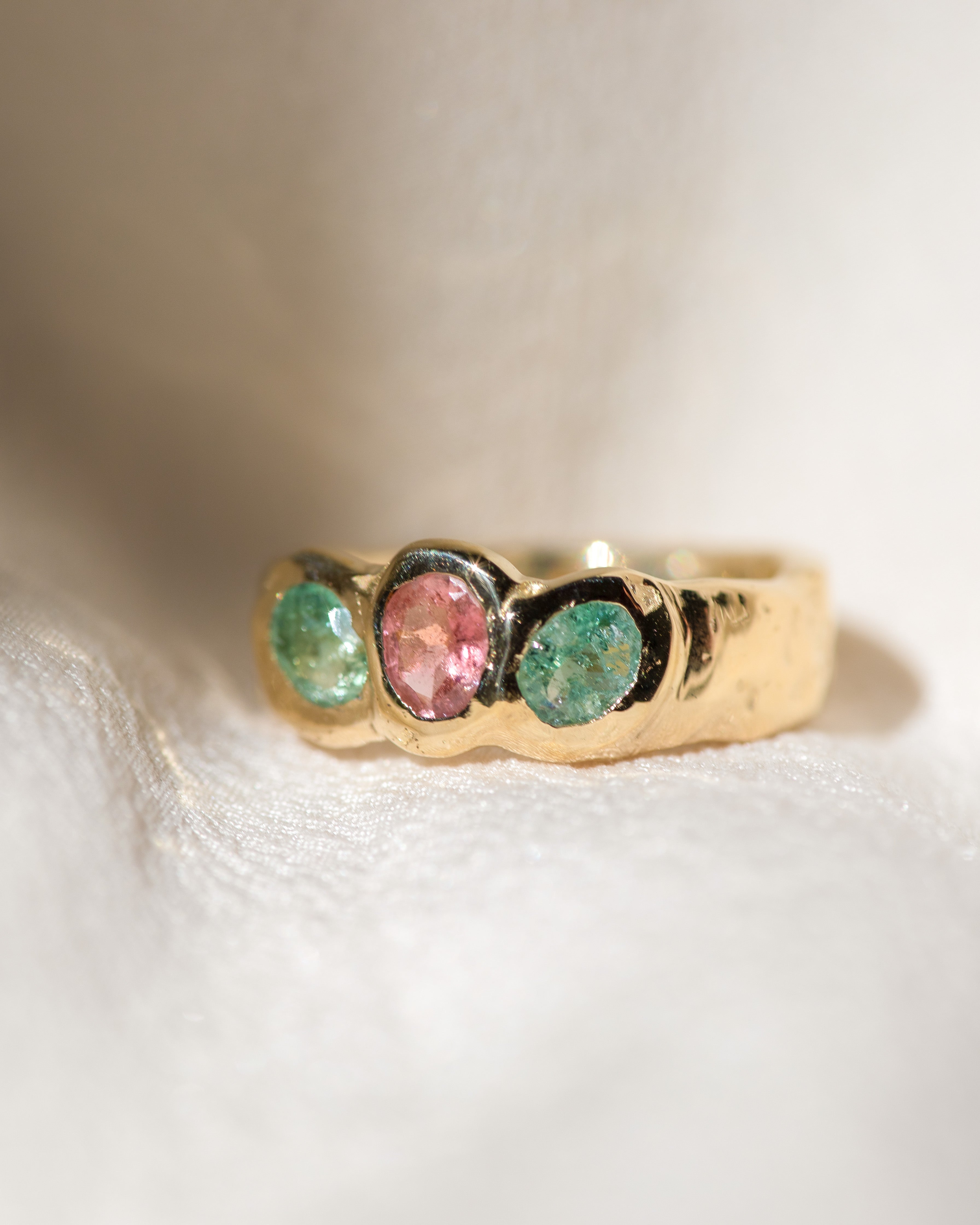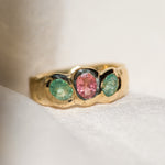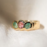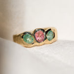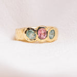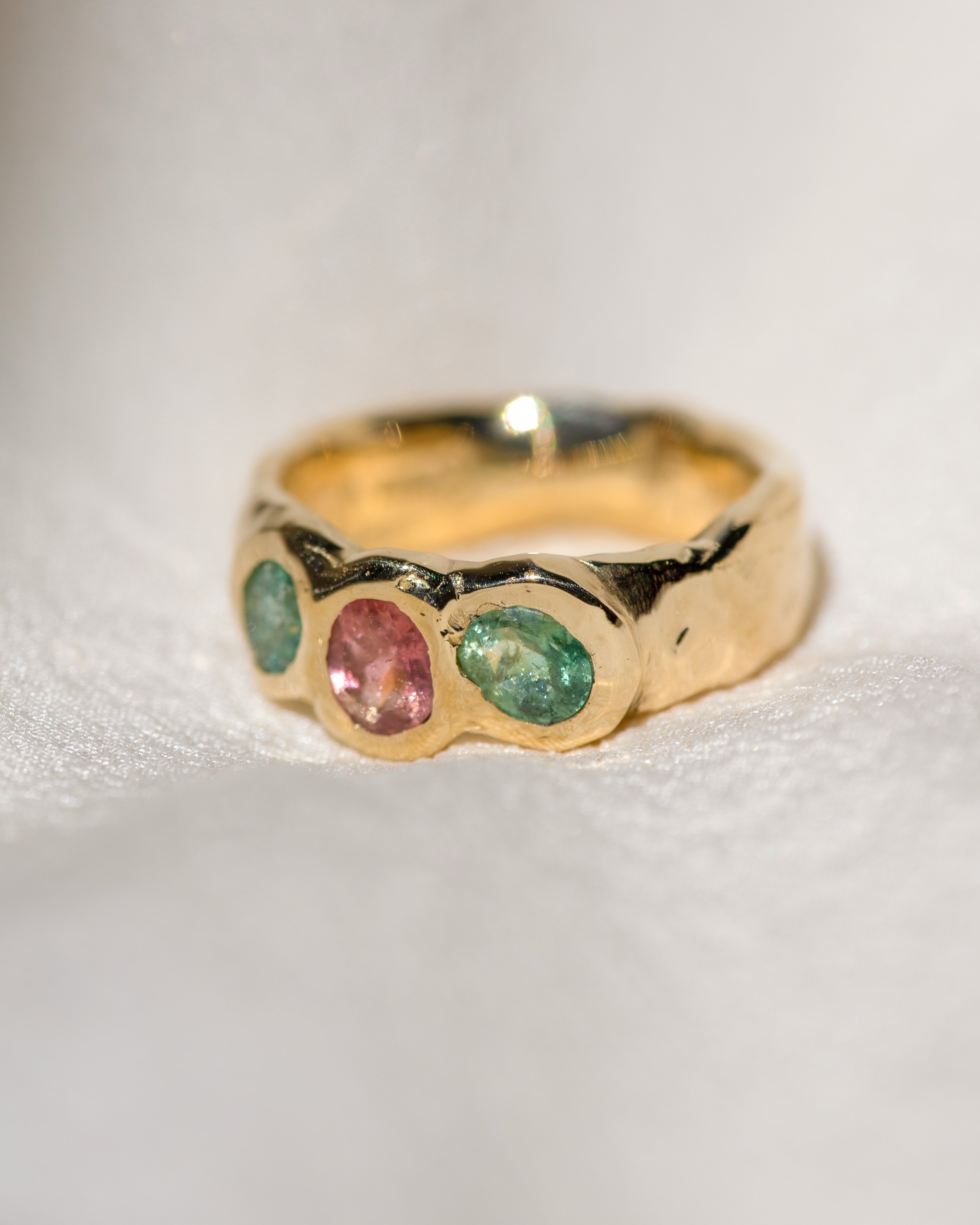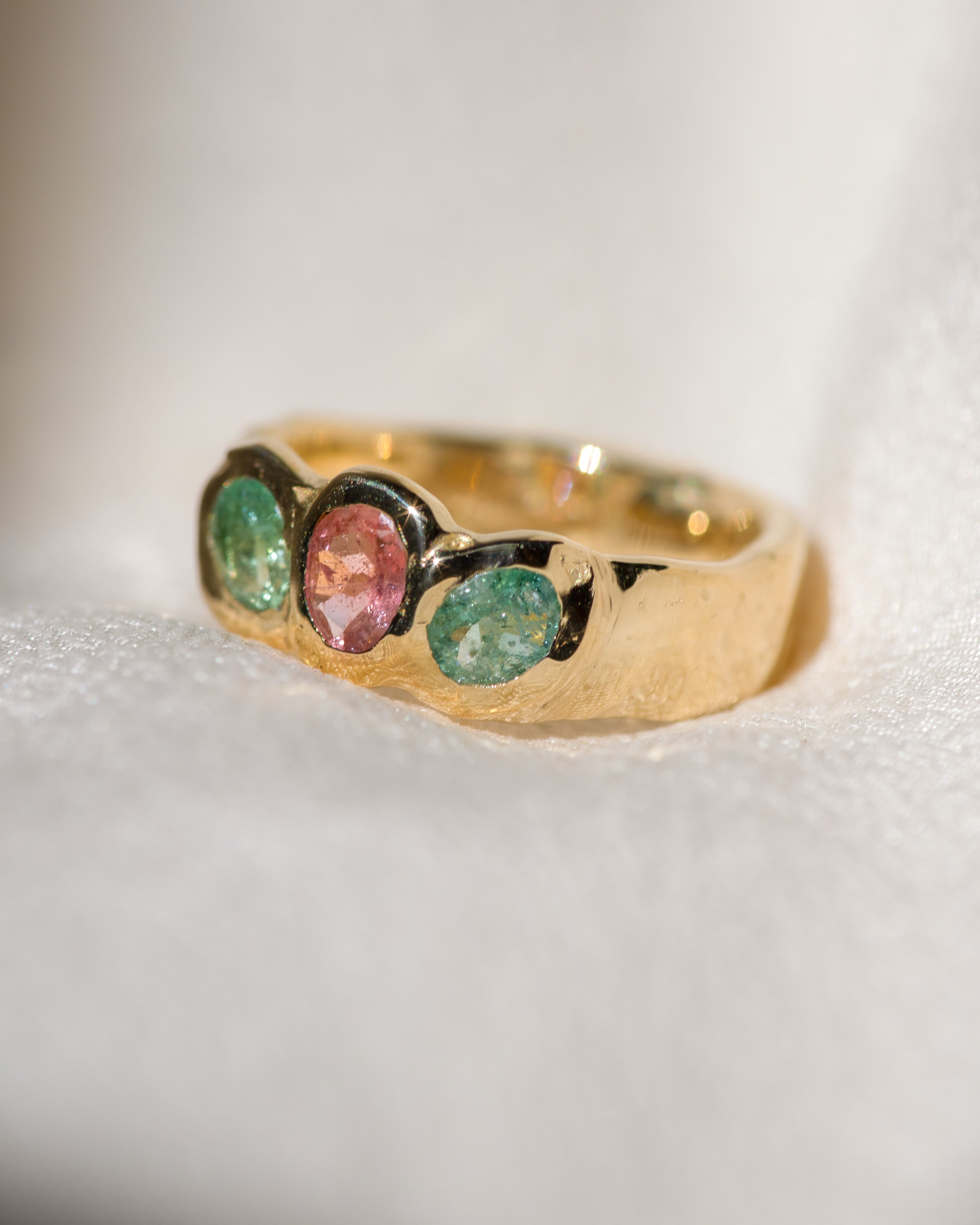 Set with (3) 5.5 x 3mm Tourmalines in solid 14k Yellow Gold hand-carved band.