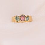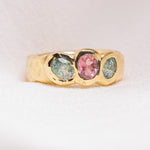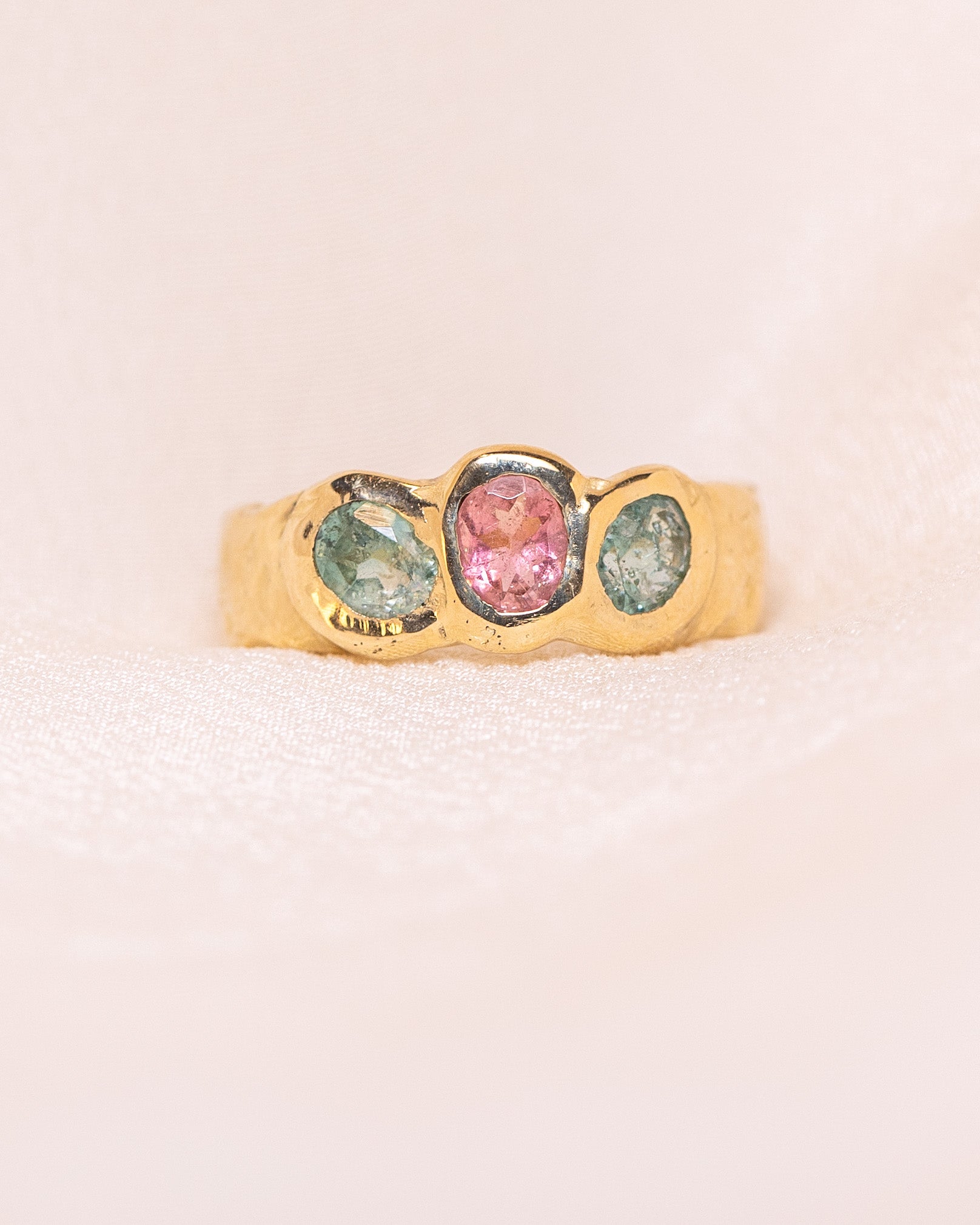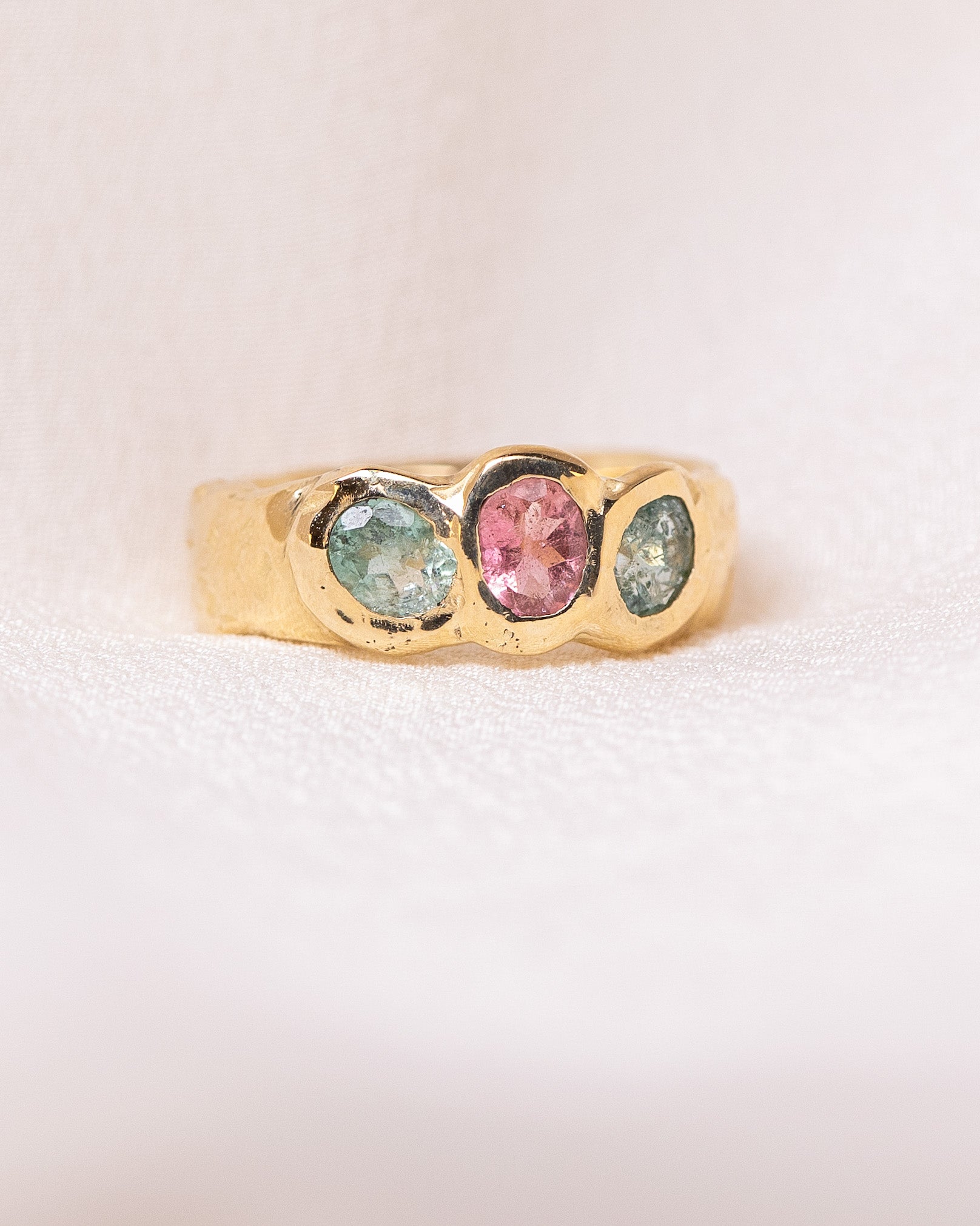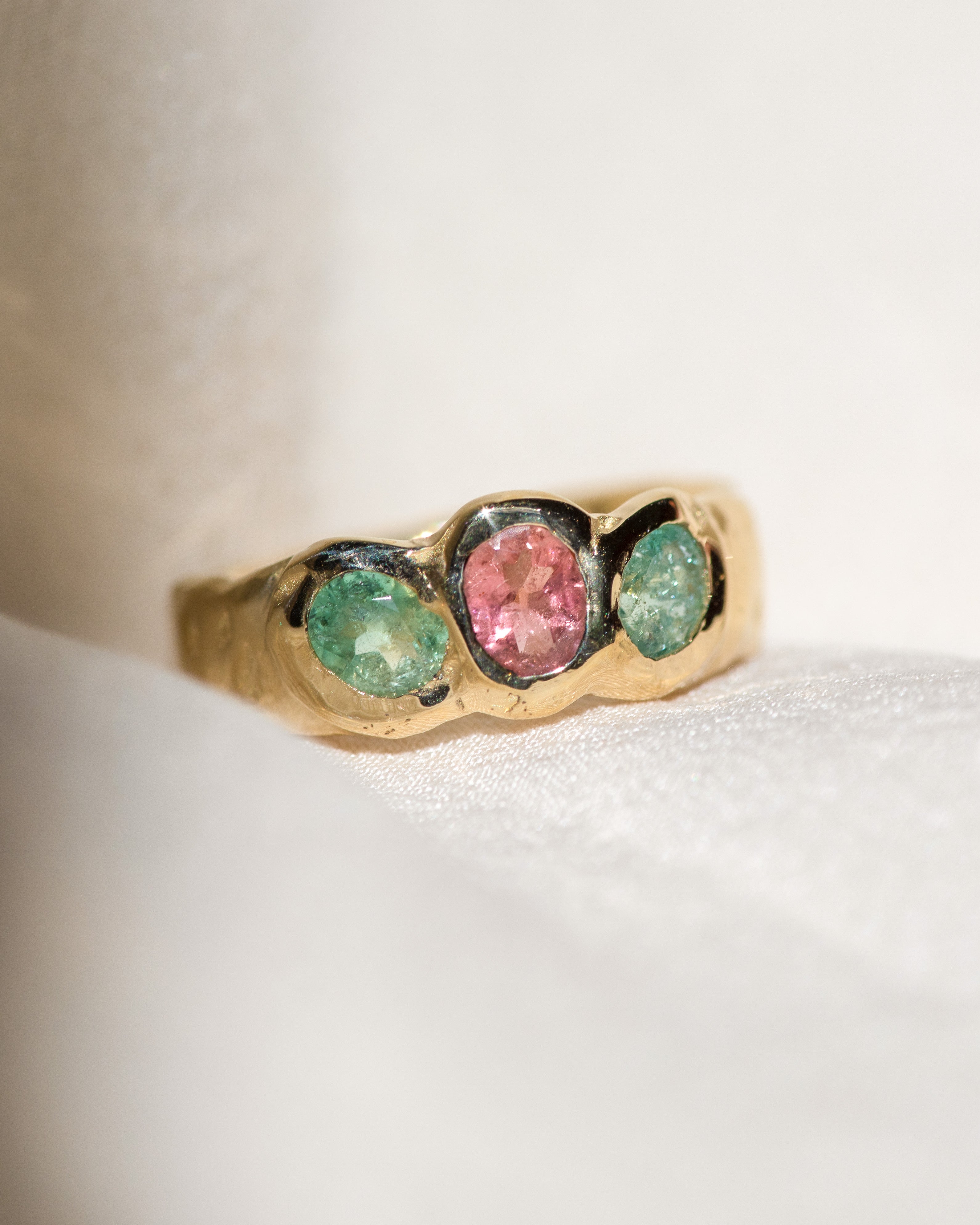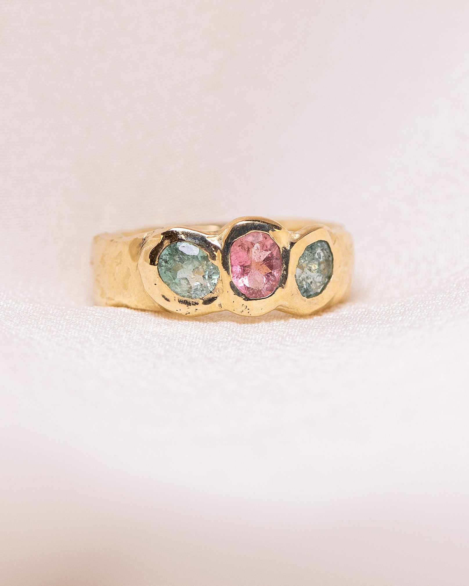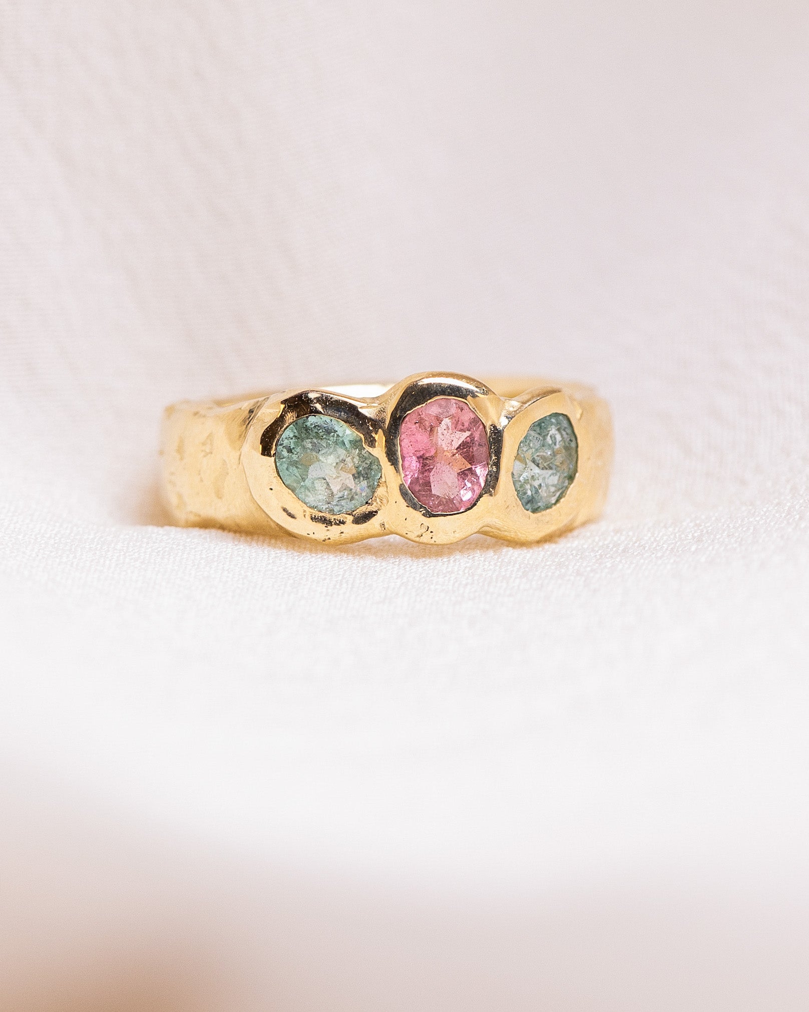 Set with (3) 5.5 x 3mm Tourmalines in solid 14k Yellow Gold hand-carved band.