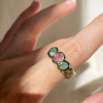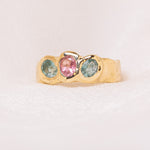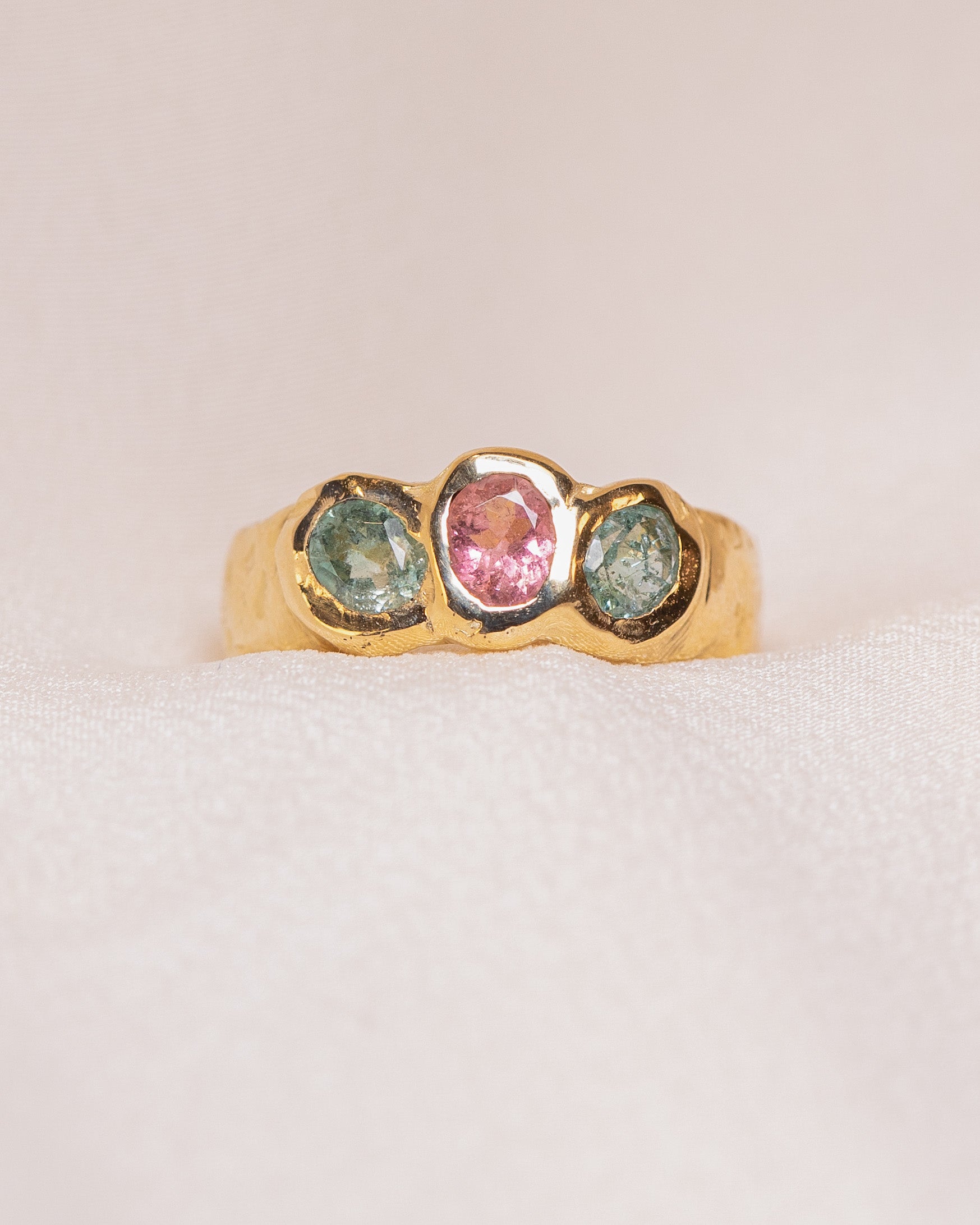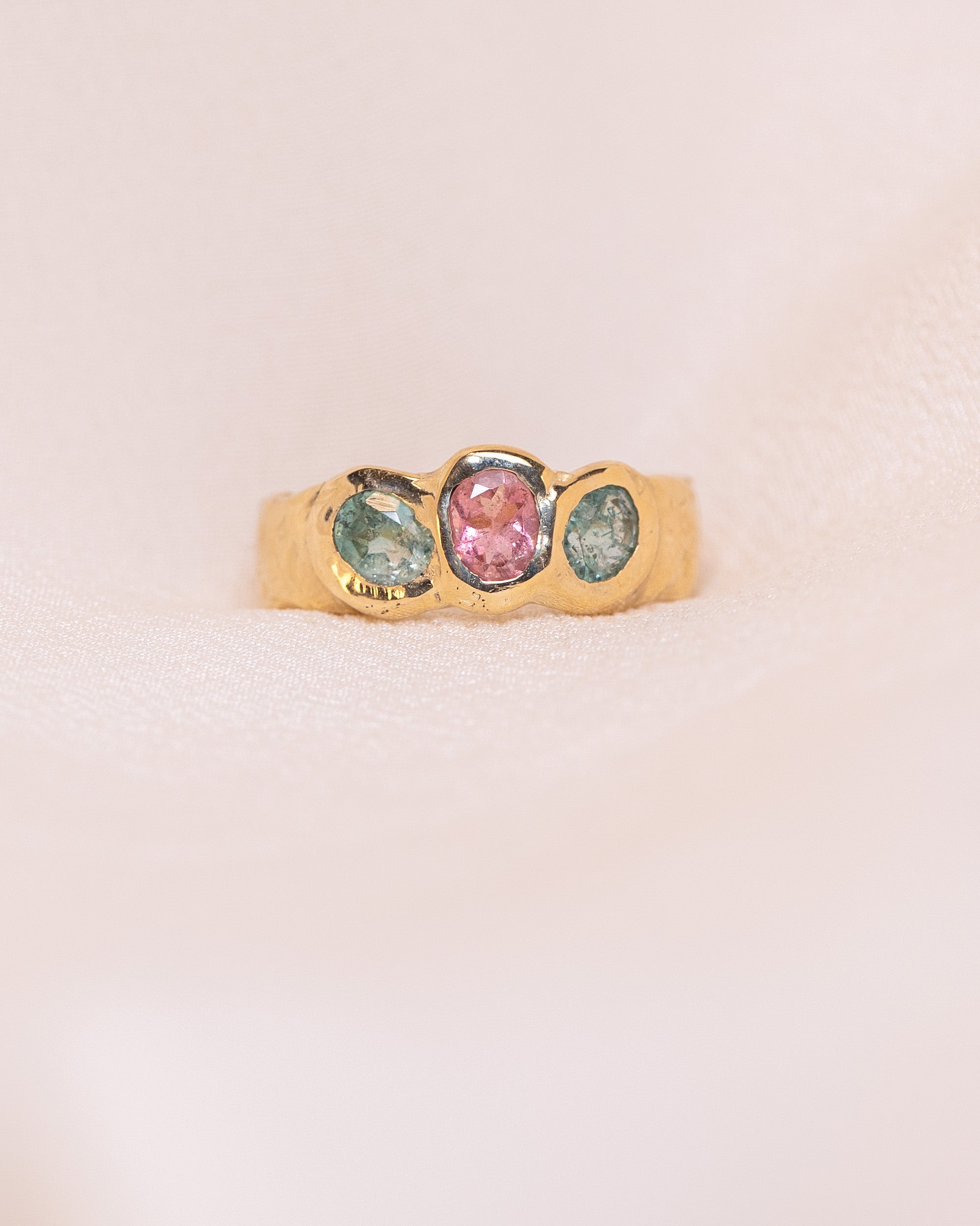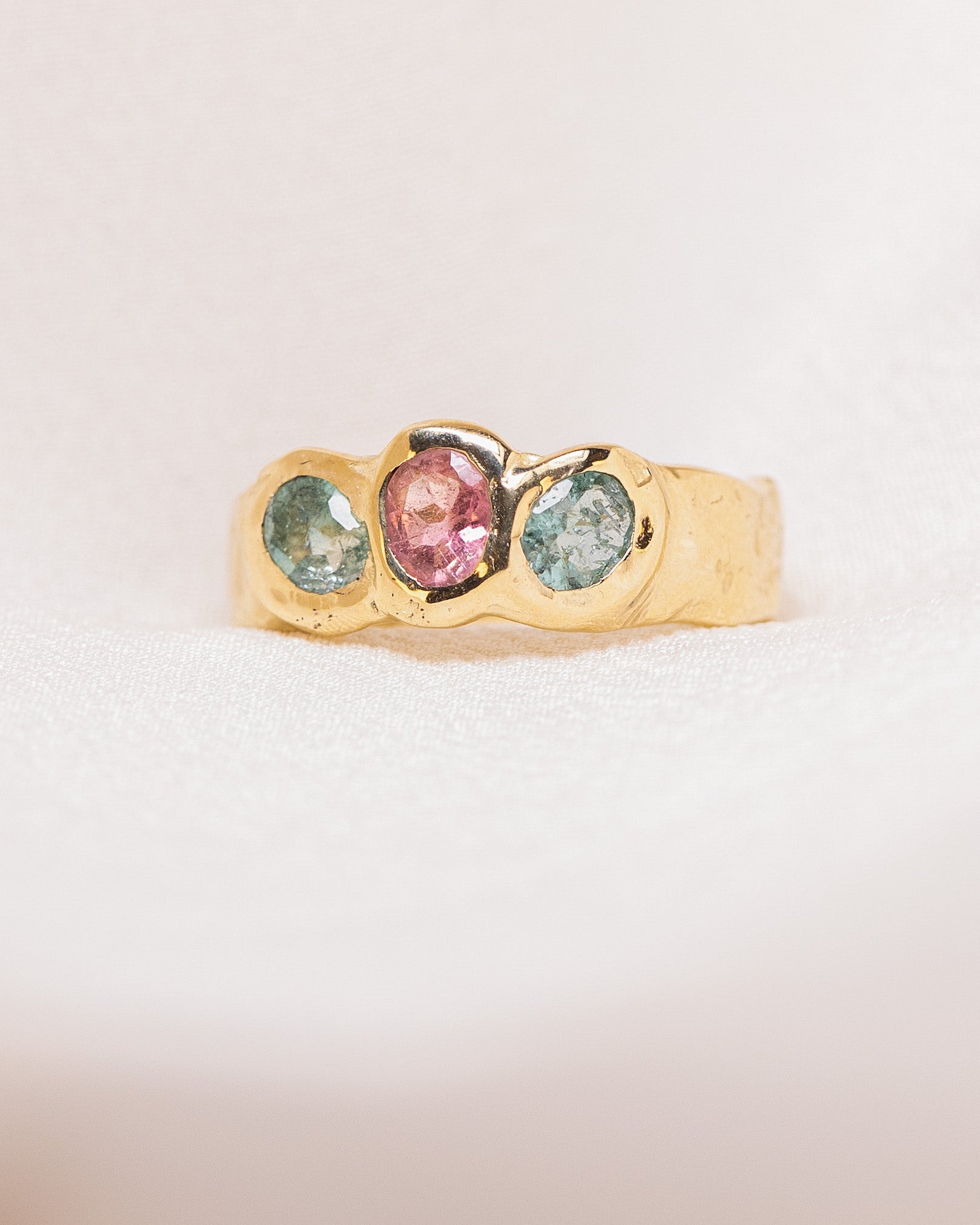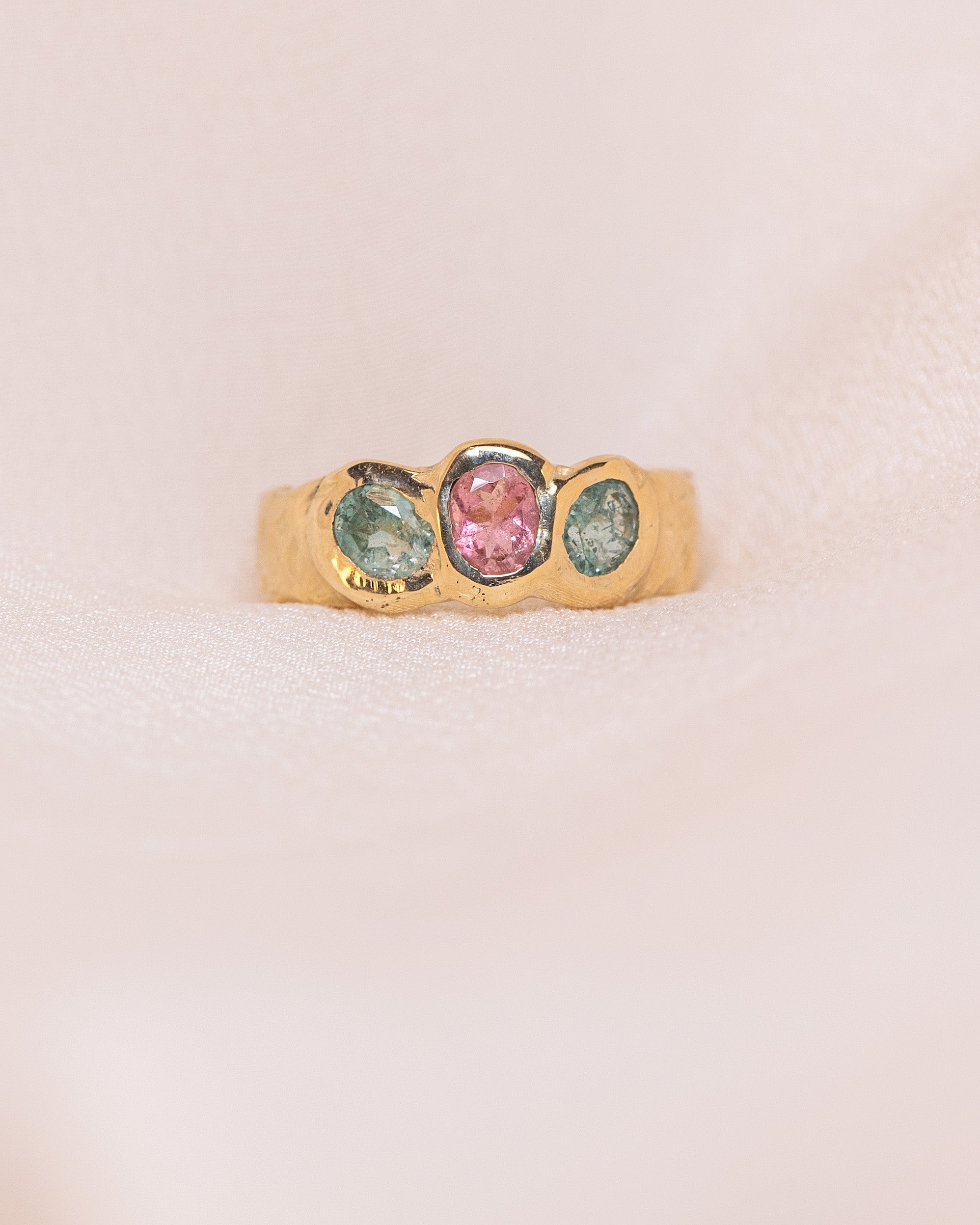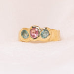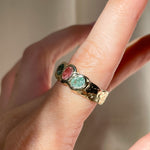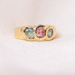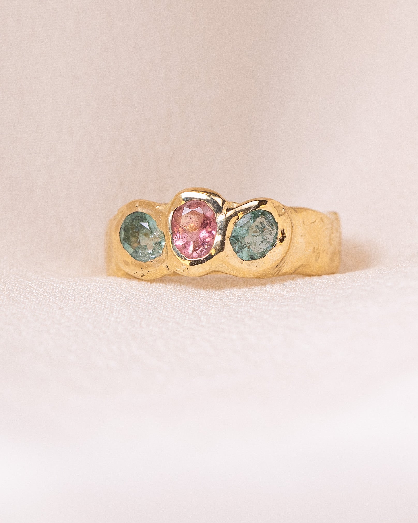 Set with (3) 5.5 x 3mm Tourmalines in solid 14k Yellow Gold hand-carved band.