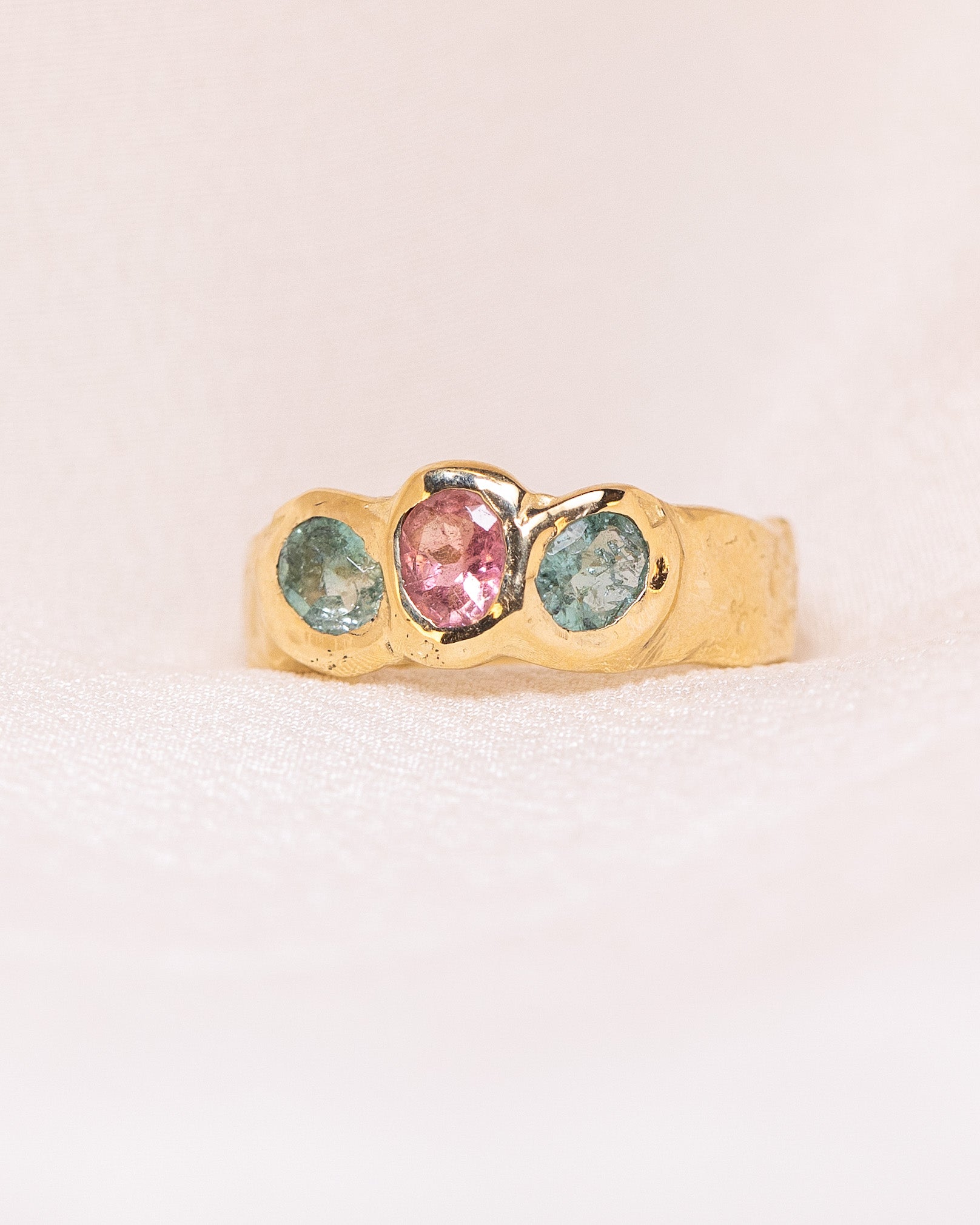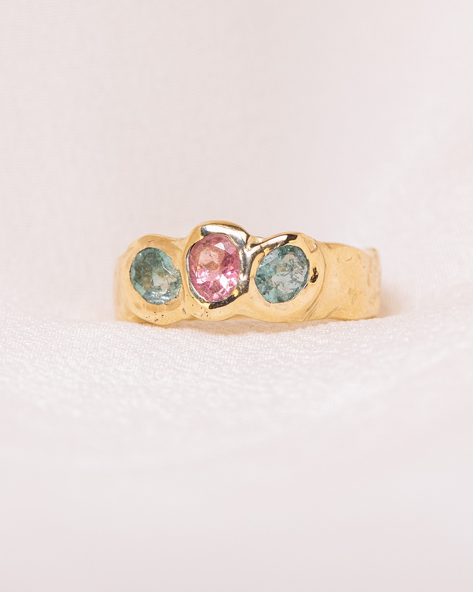 This piece calls upon you to access the unconditional love and Divine source energy that you are made of. Pink Tourmaline is hugged on either side by two Blue Tourmalines, emanating the abundant source of love held at the forefront and the center between two sacred spirit guardians of light.