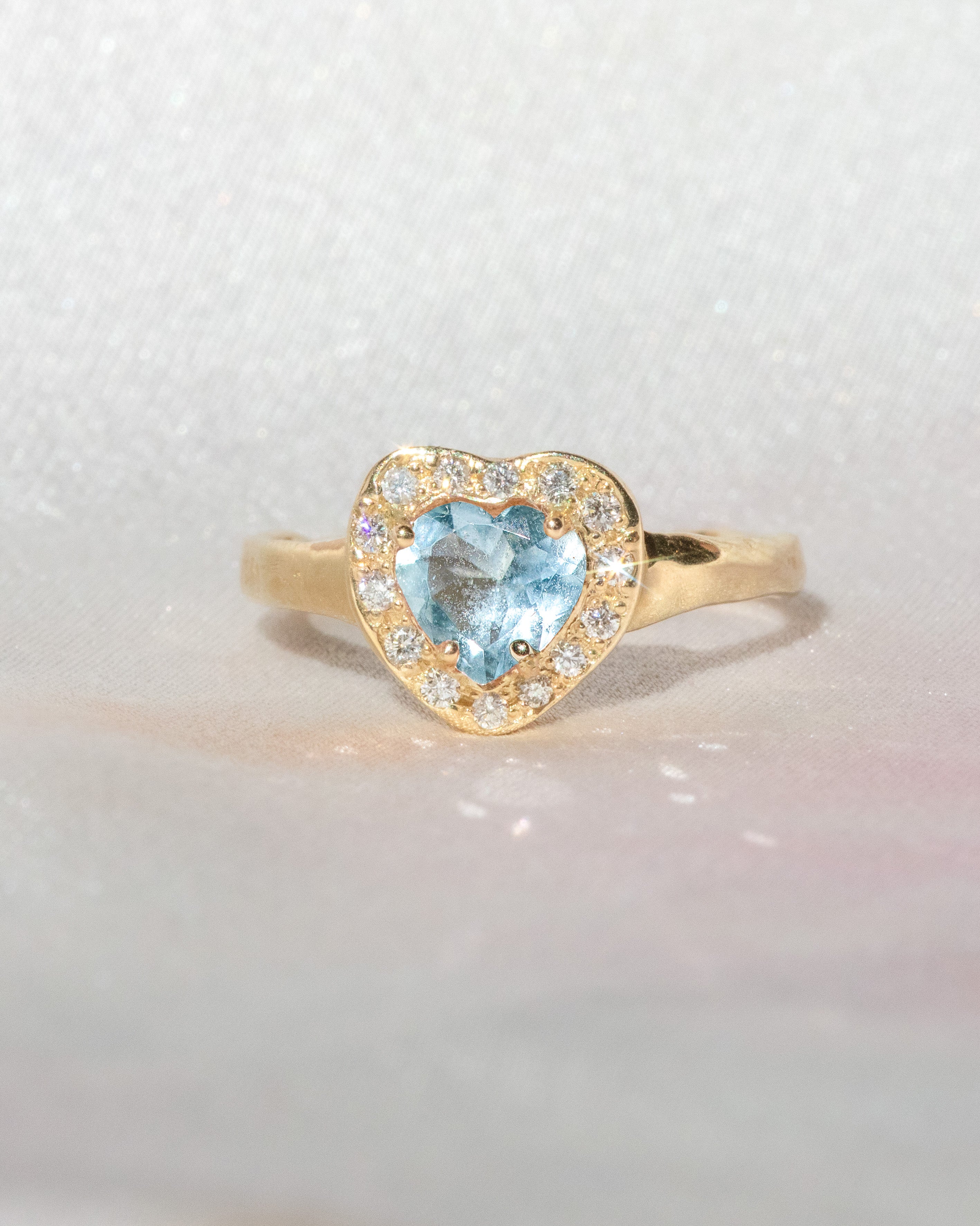 This illuminated heart-centered ring is beautifully enraptured in unconditional love, hand-carved in 14k yellow gold. Features a stunning heart-shaped 6mm center Morganite or Aquamarine of your choice, surrounded by a halo of White Diamonds.