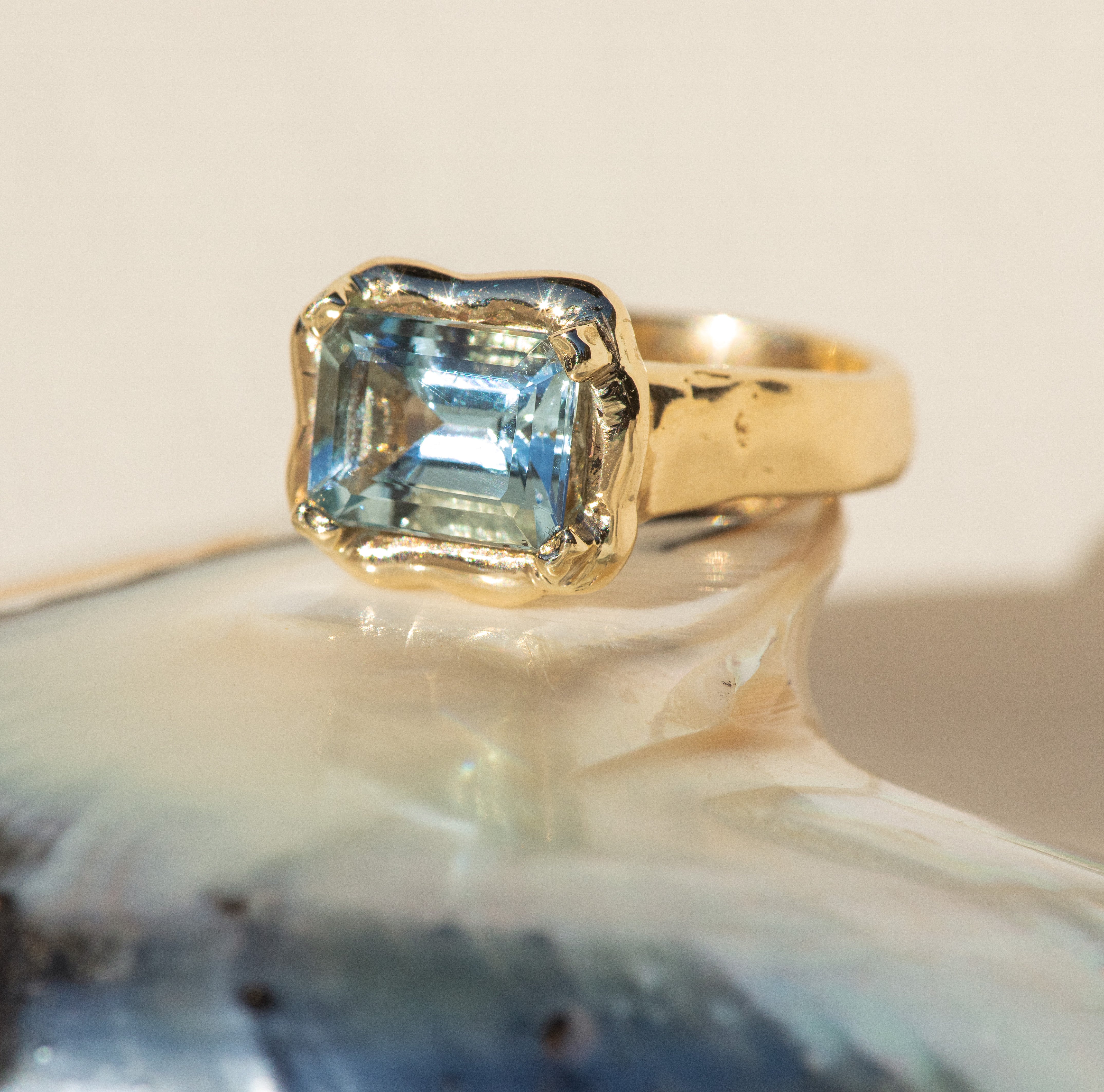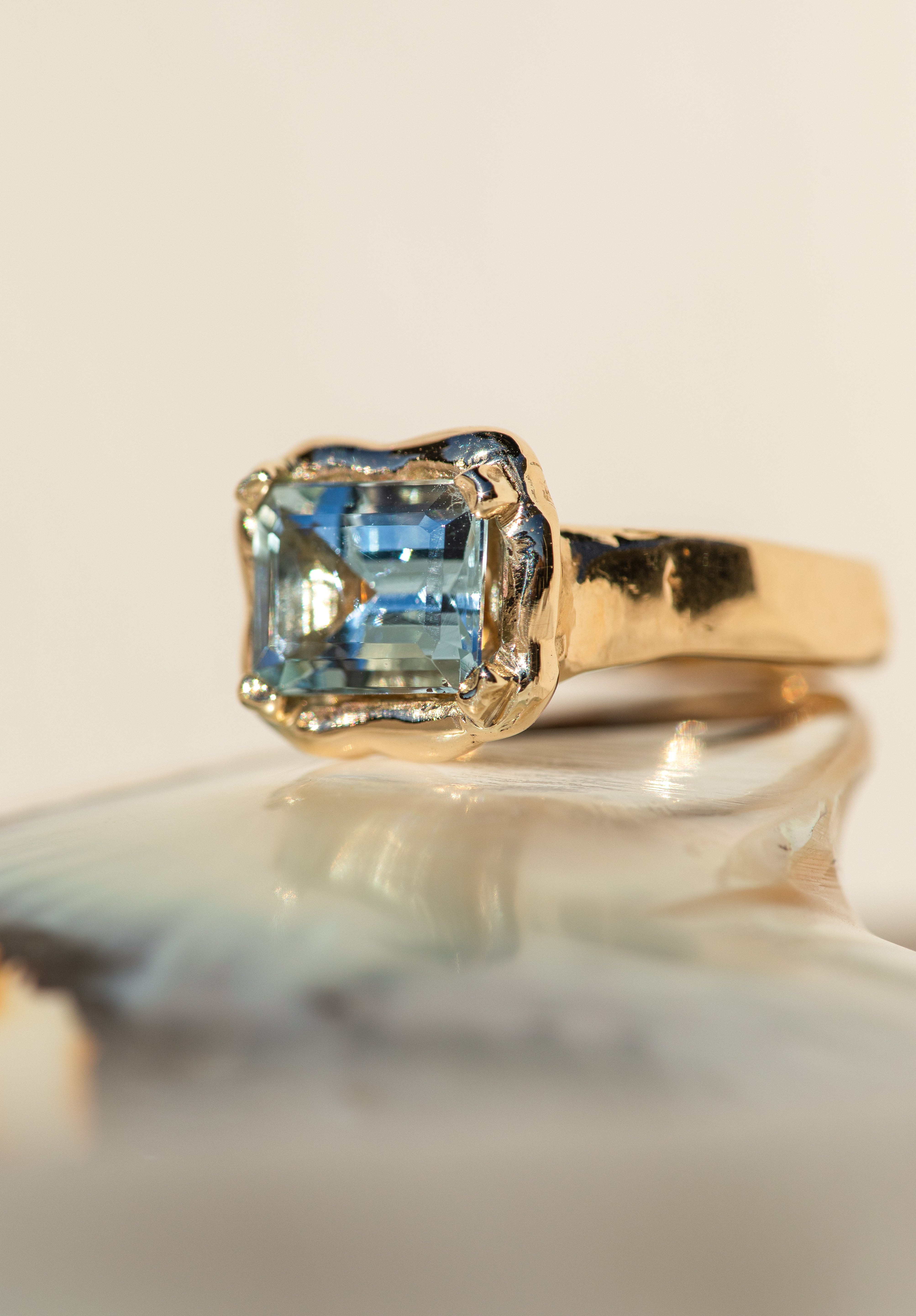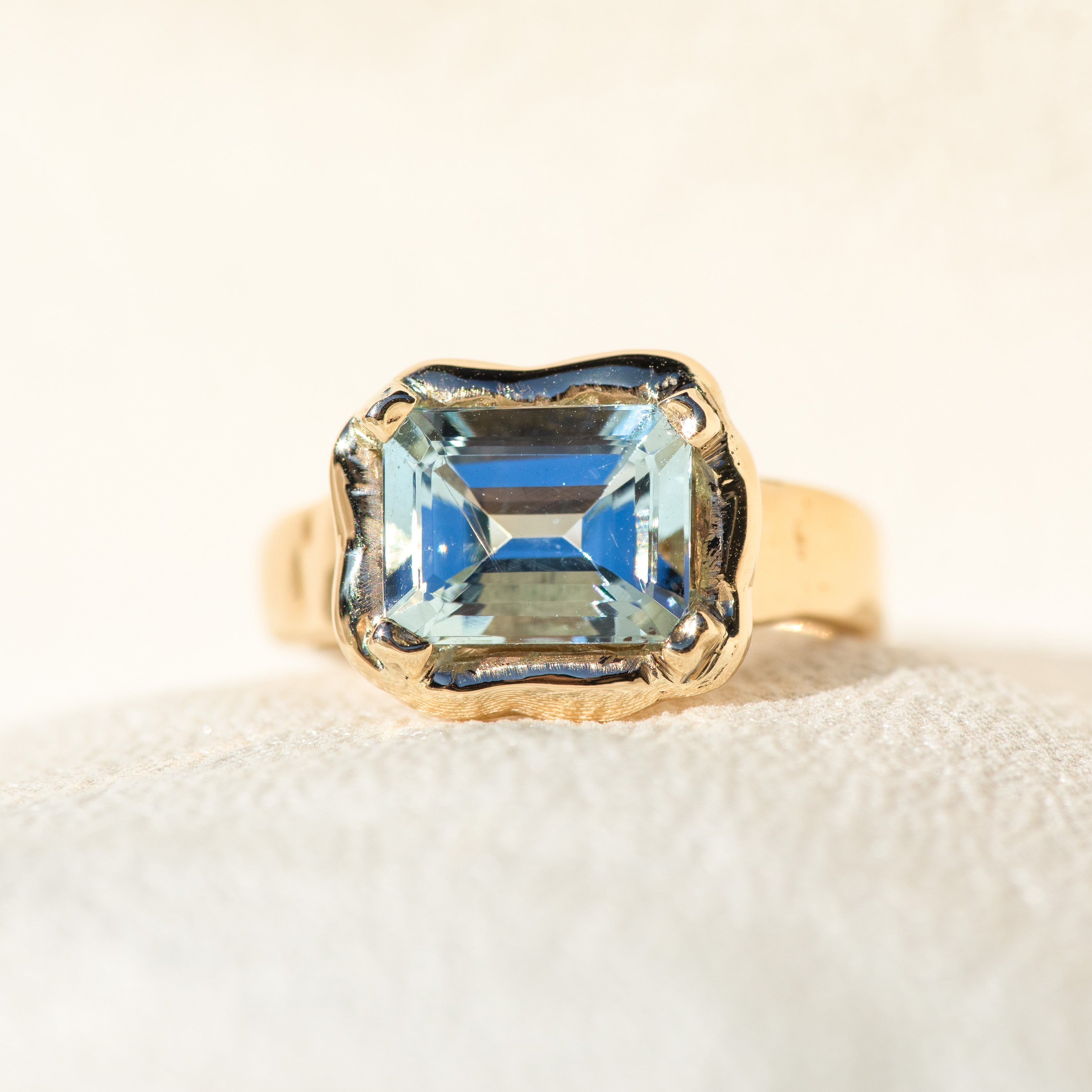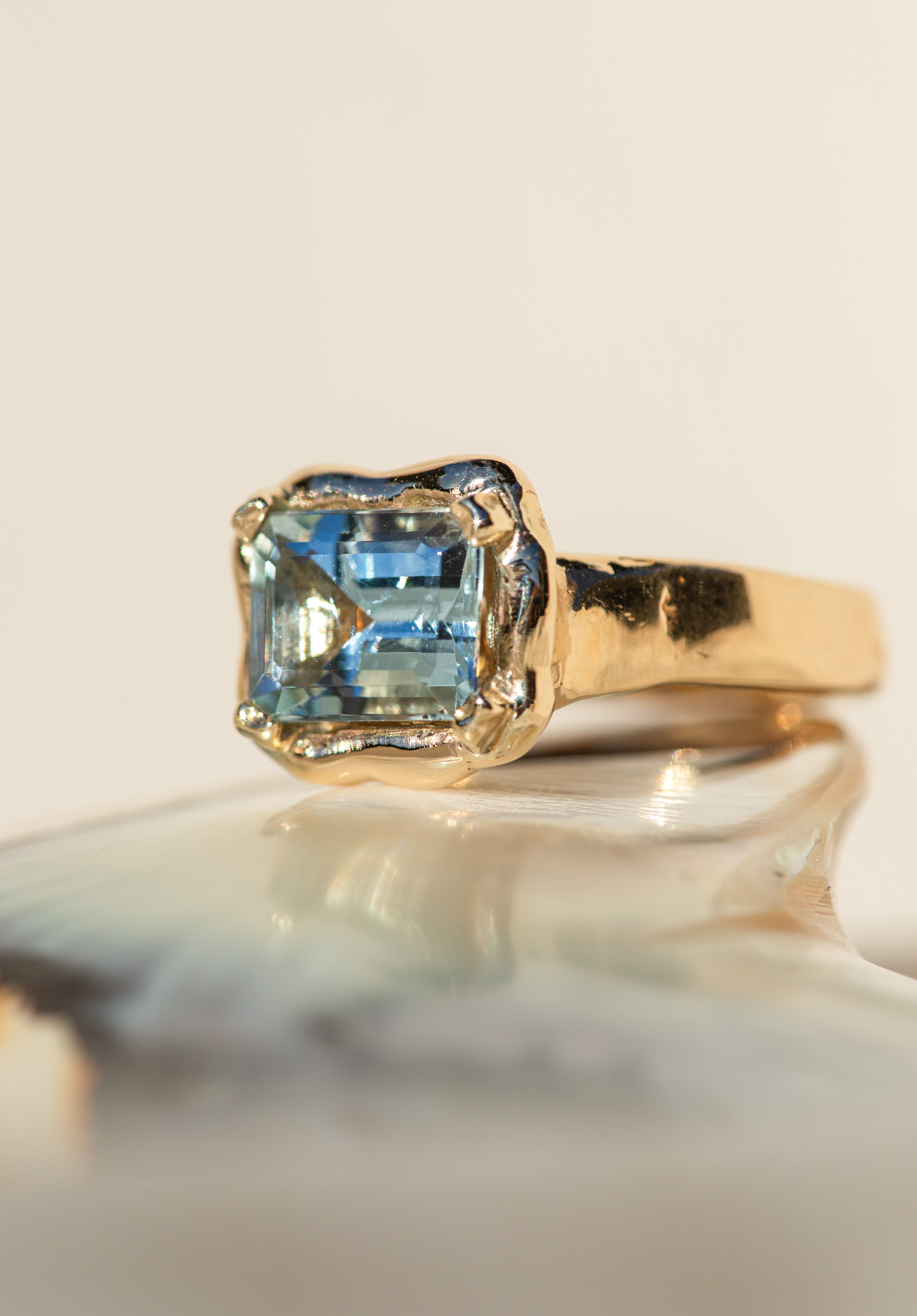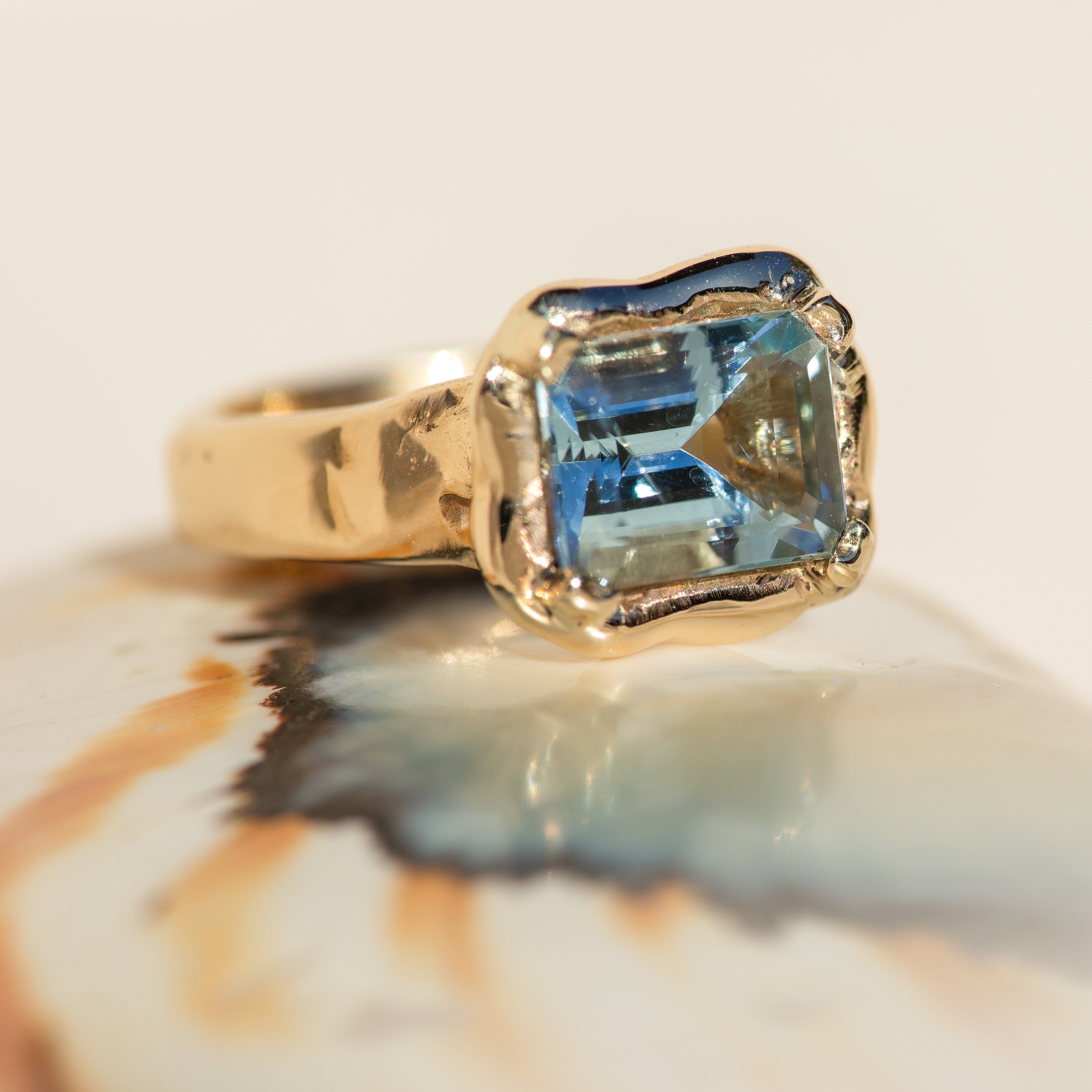 One of a kind hand-carved 14k Yellow gold ring featuring a stunning emerald cut Aquamarine. Stone measures approx. 2.1ct. 9x7mm. 5mm thickness band.