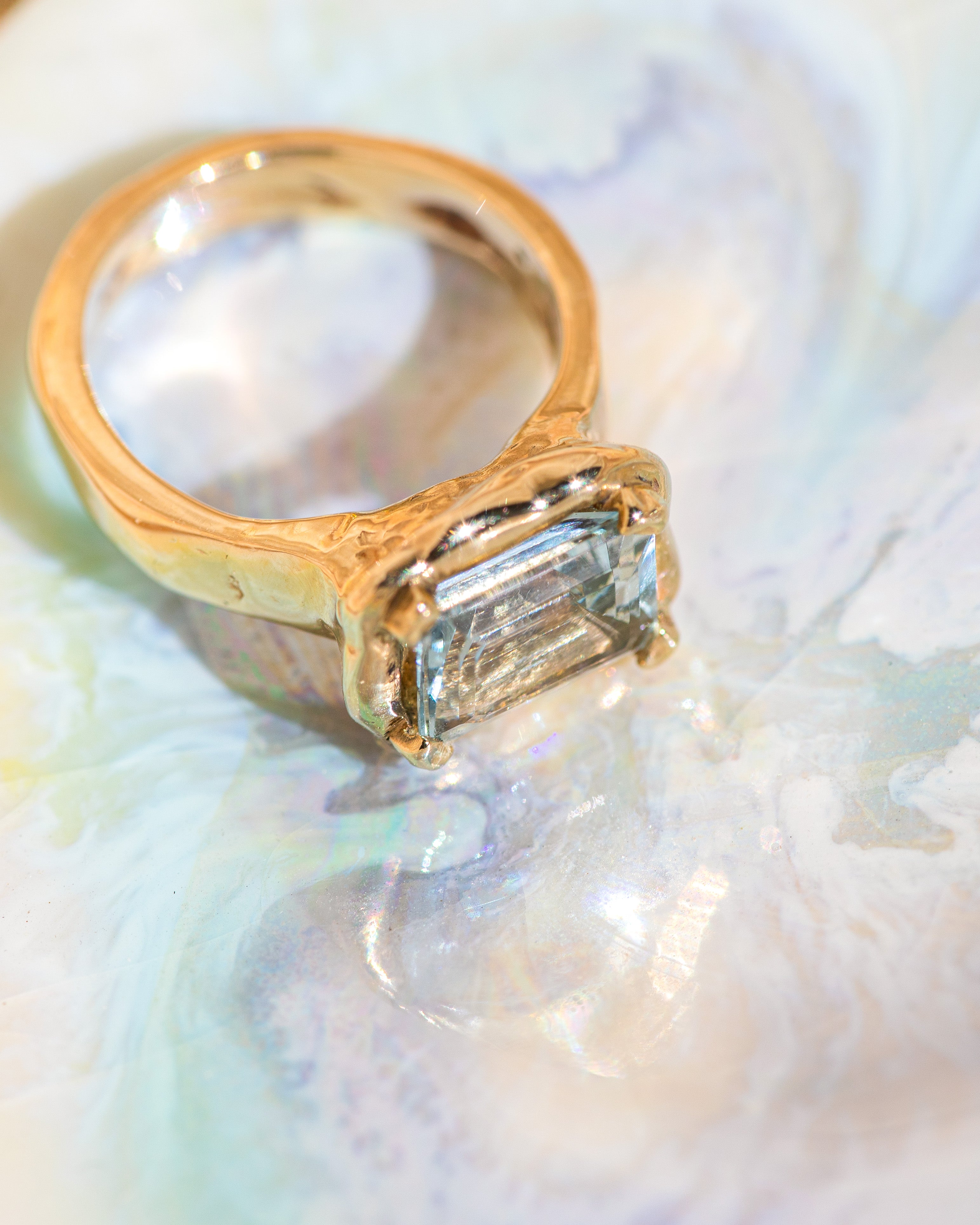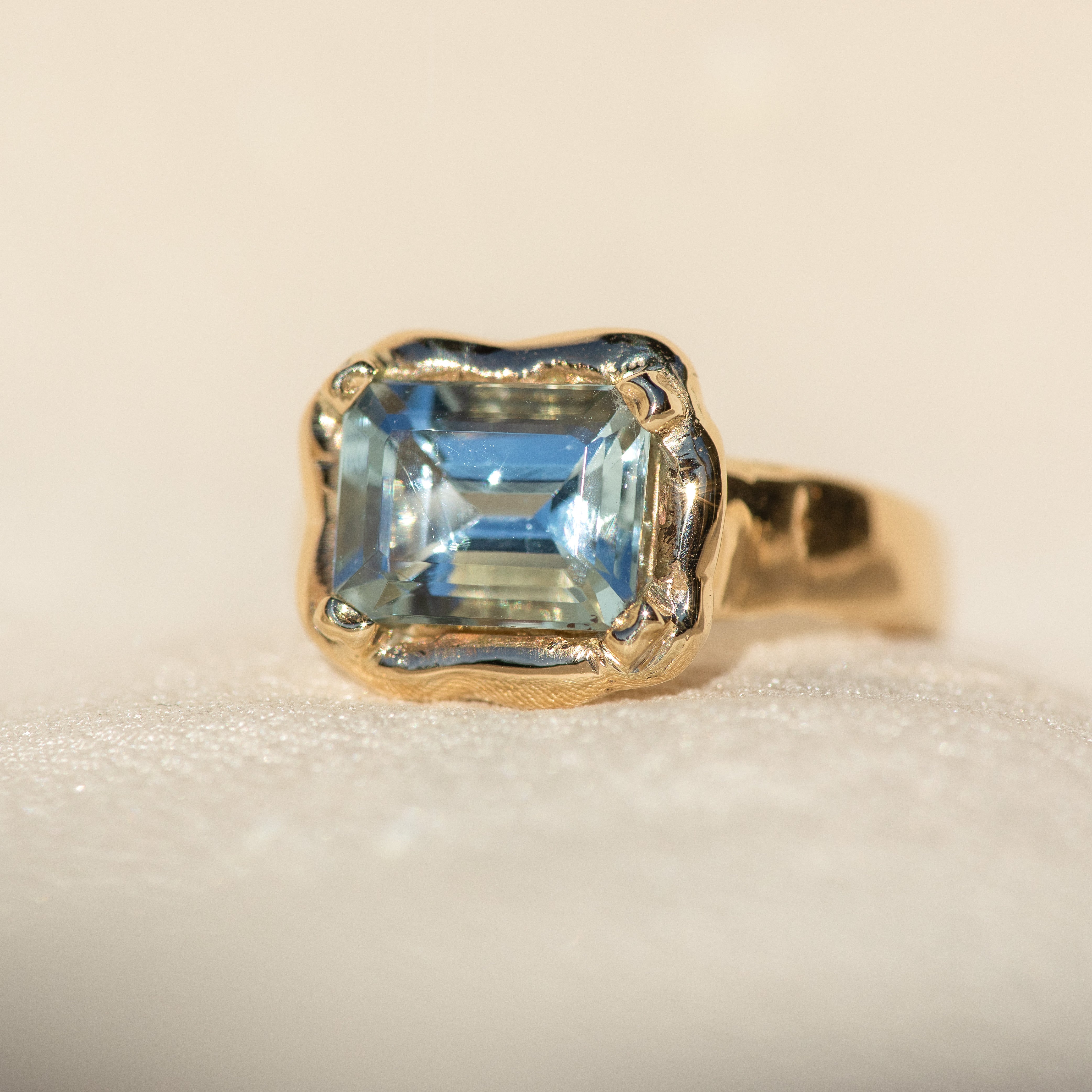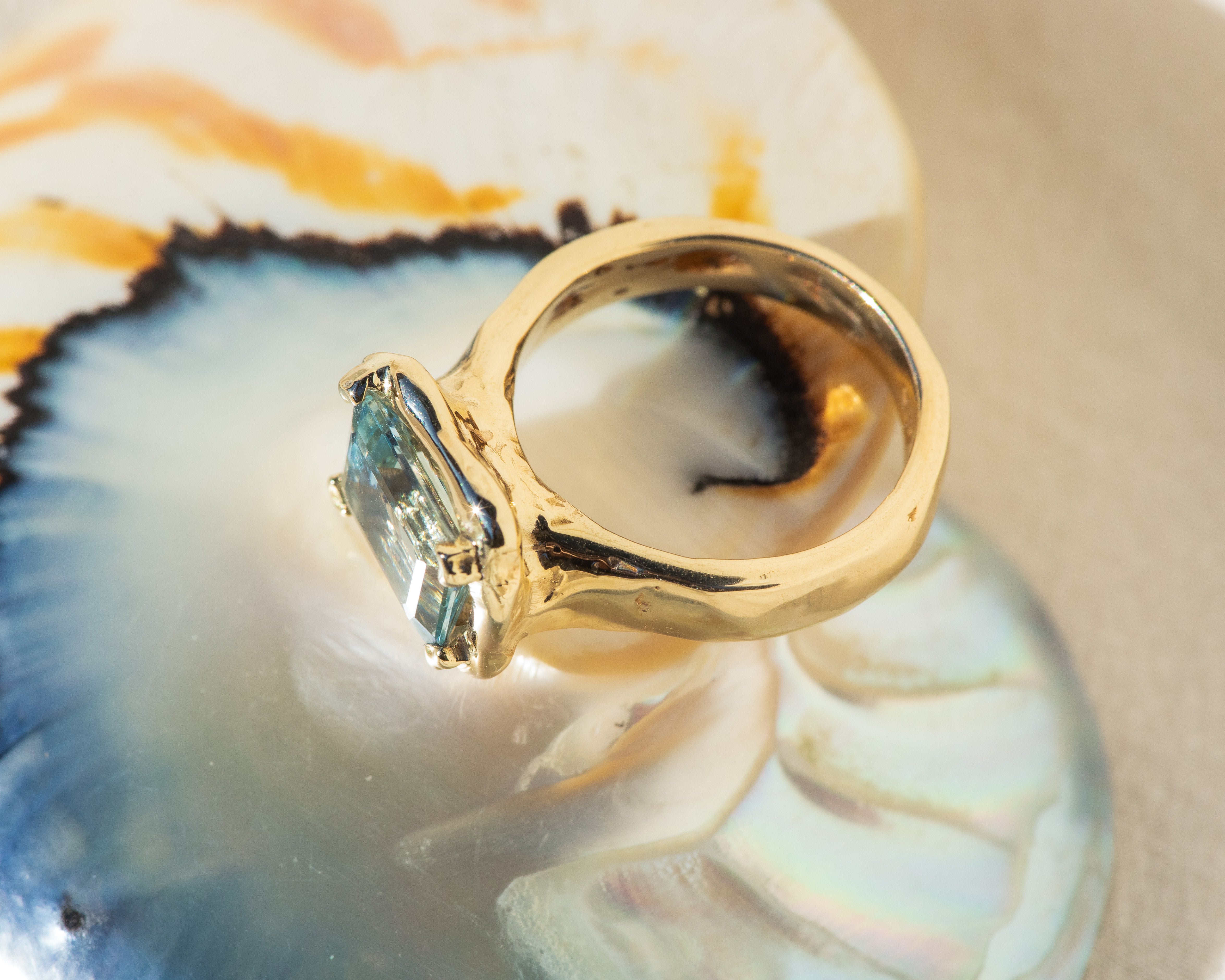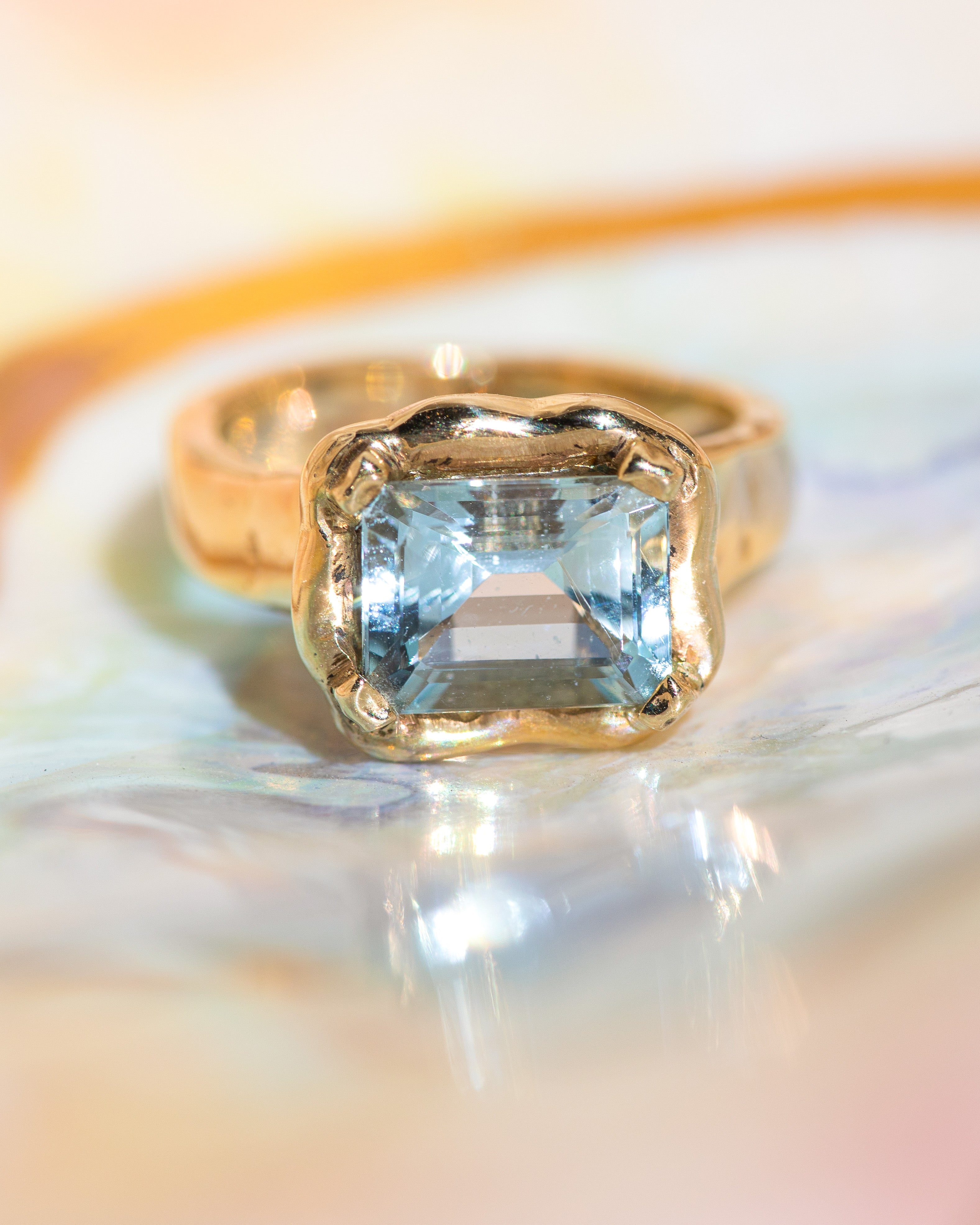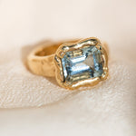 One of a kind hand-carved 14k Yellow gold ring featuring a stunning emerald cut Aquamarine. Stone measures approx. 2.1ct. 9x7mm. 5mm thickness band.