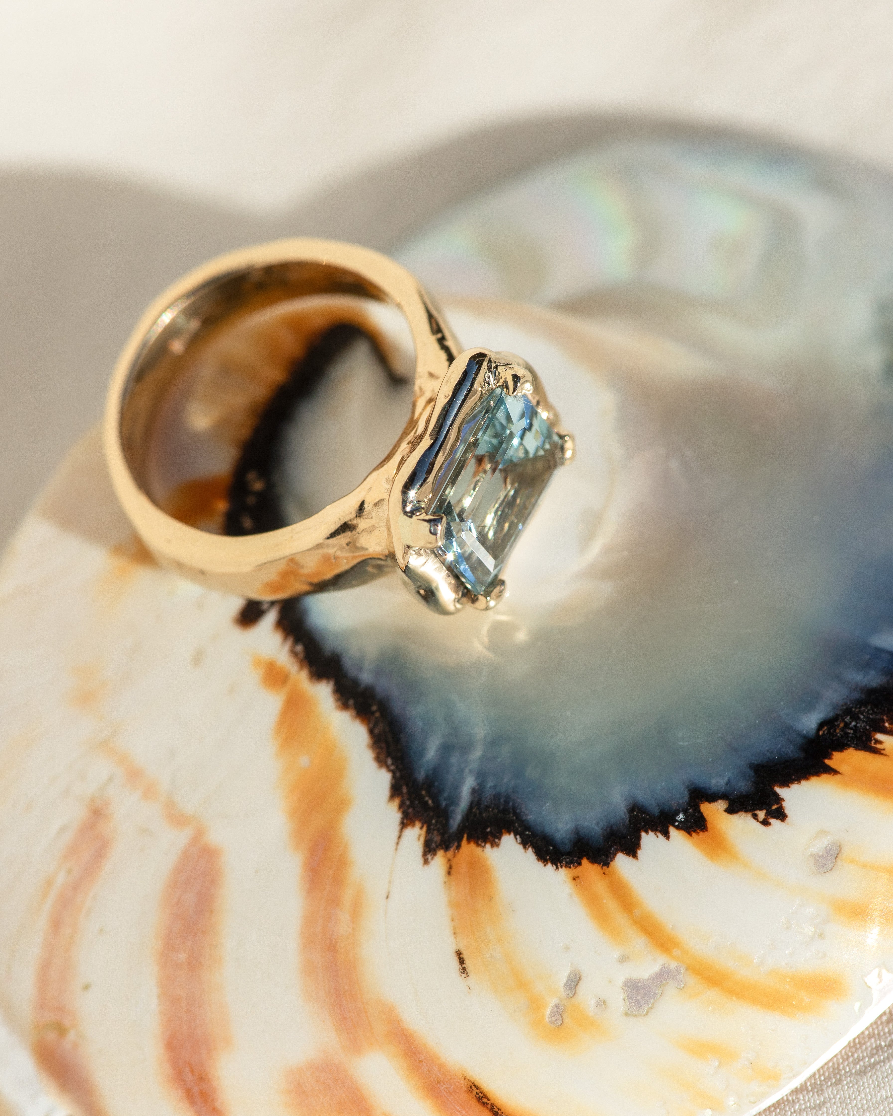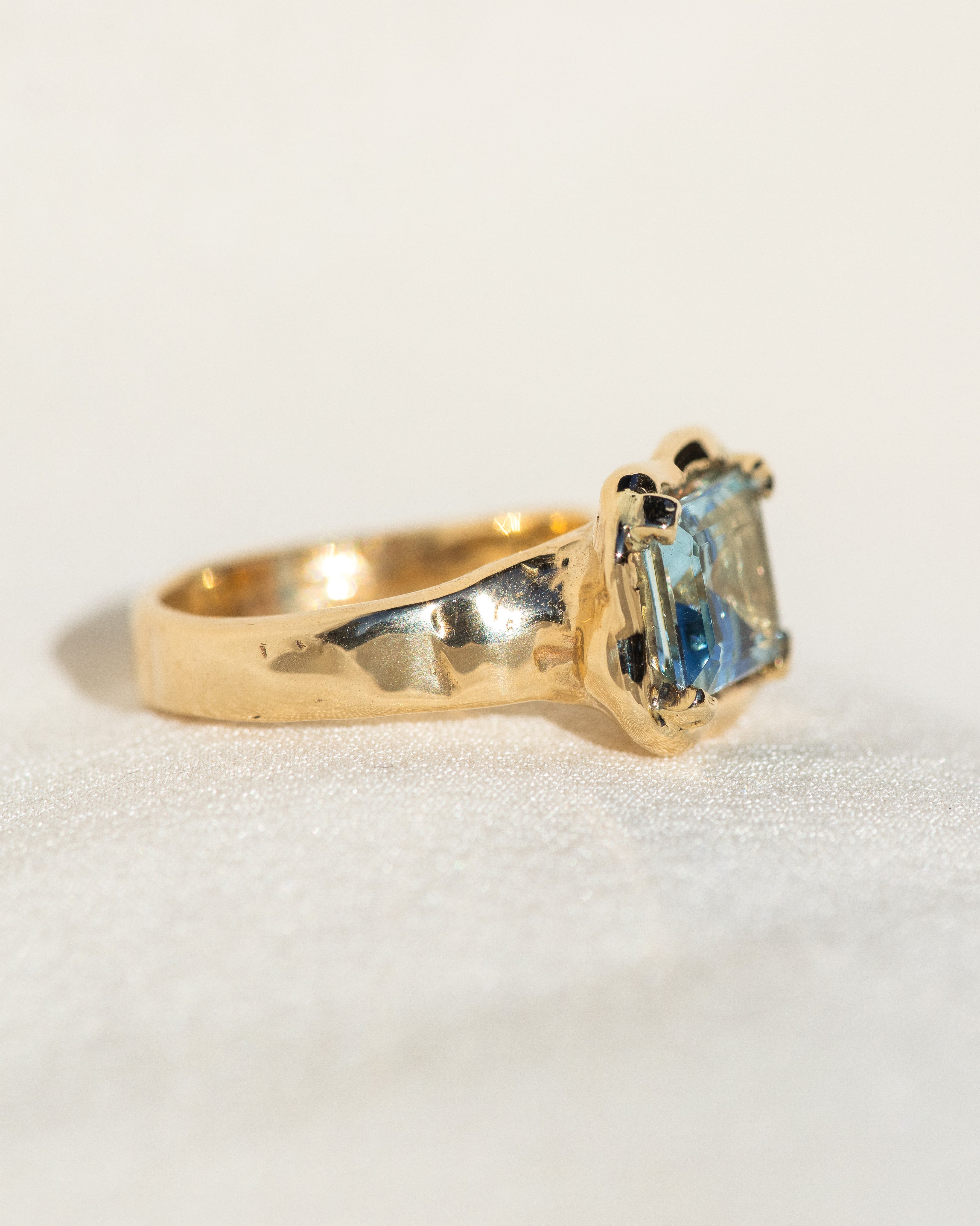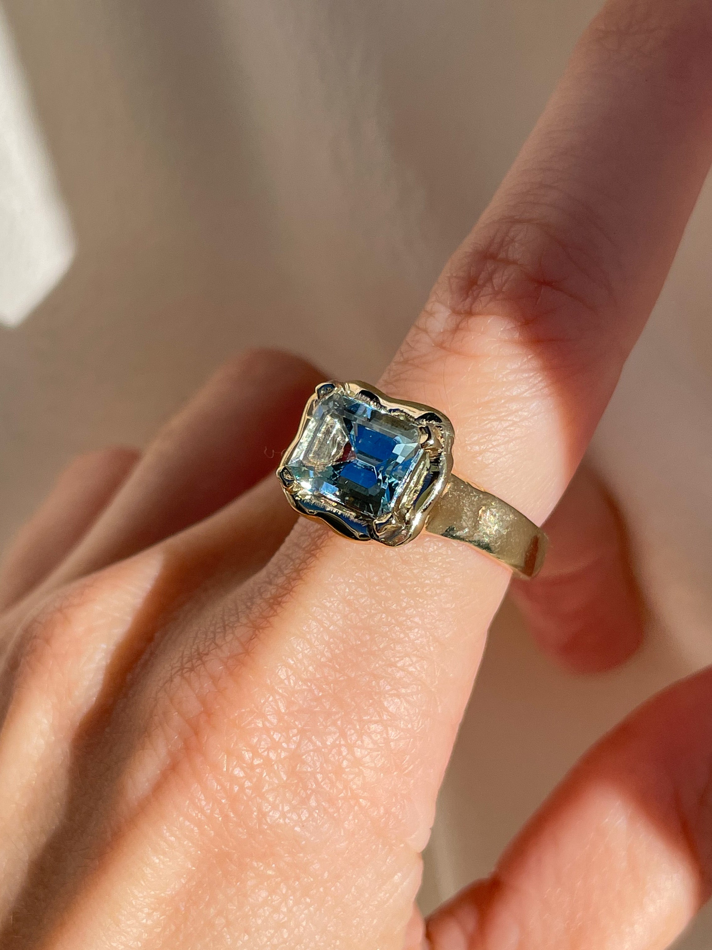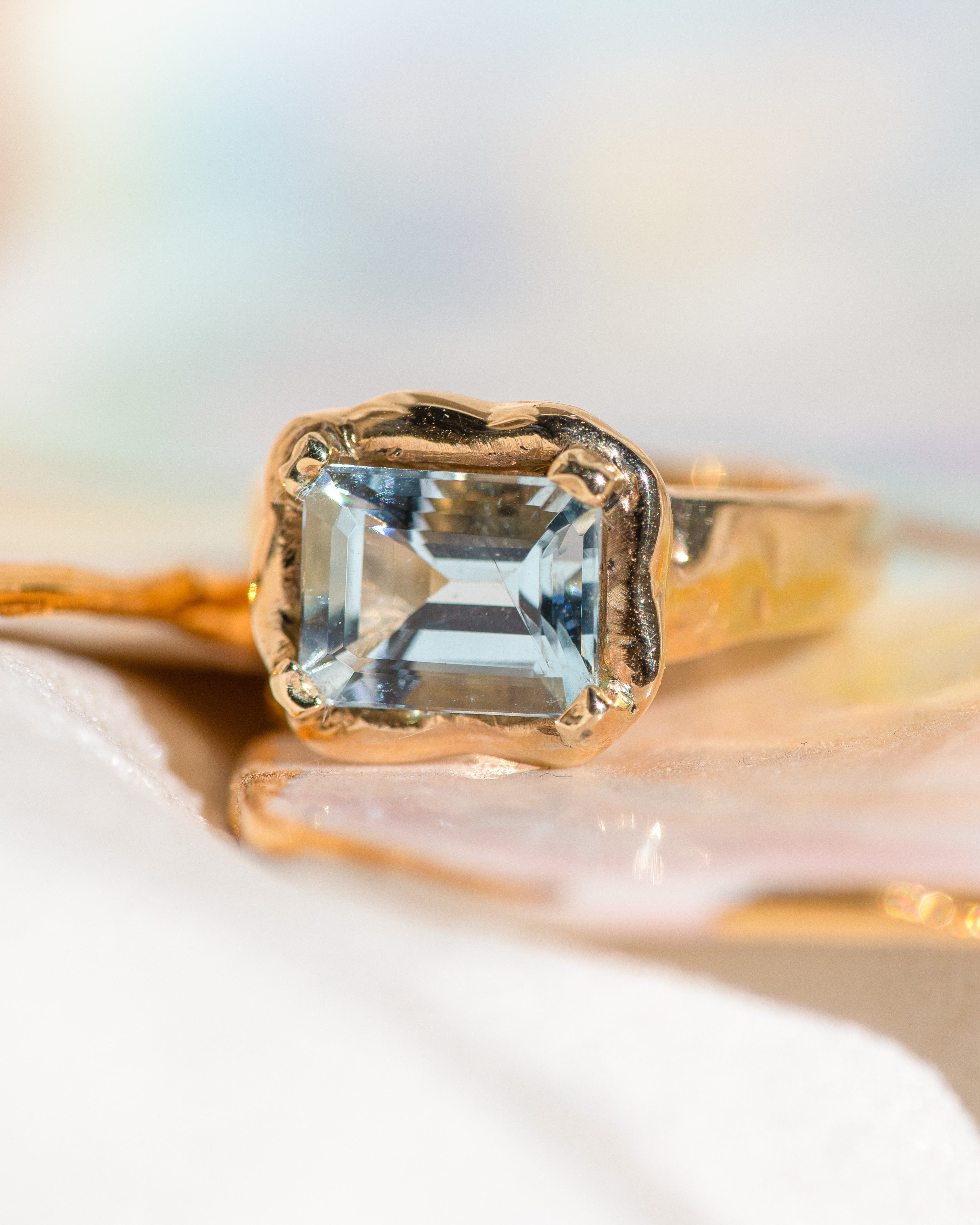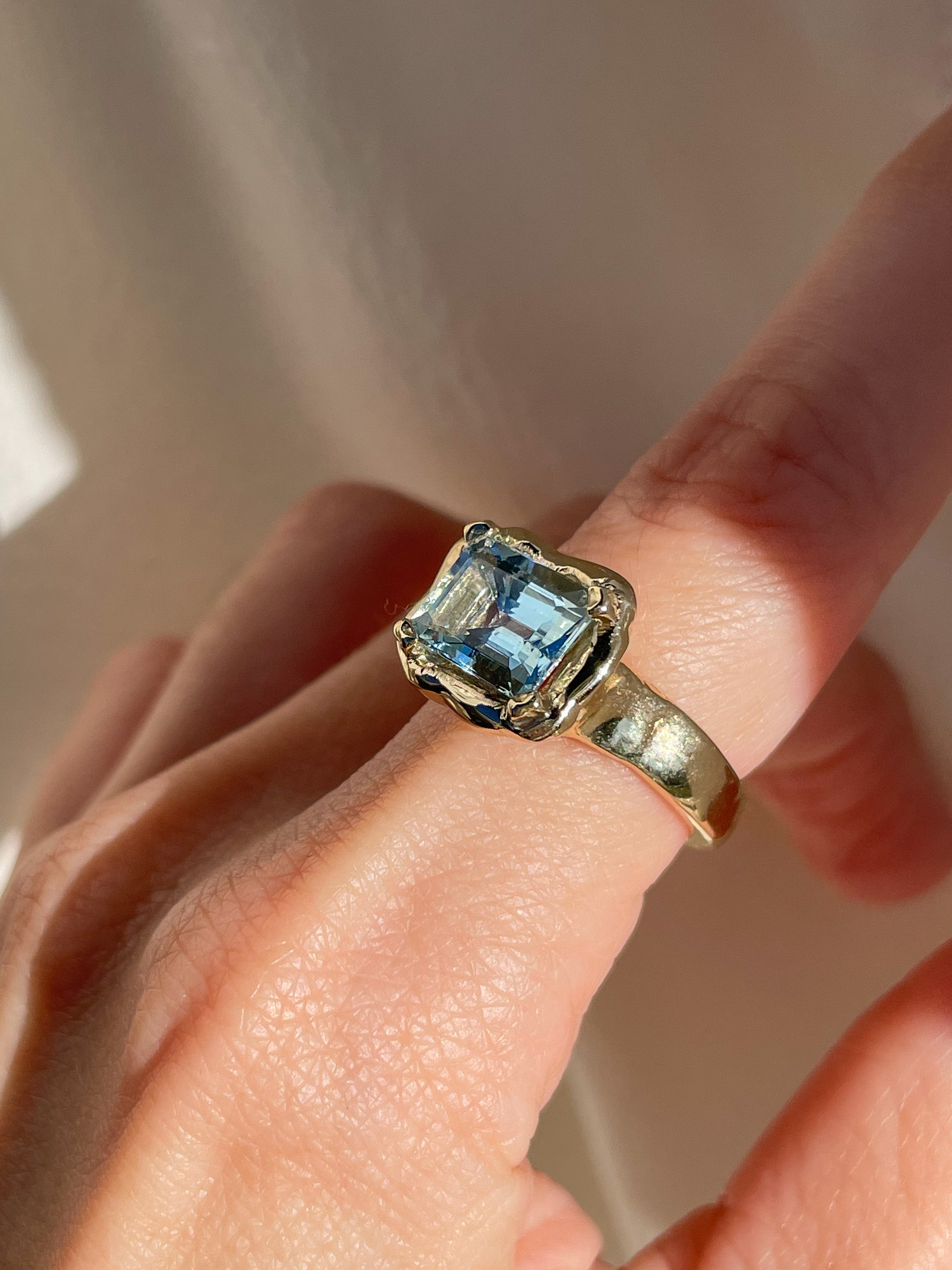 One of a kind hand-carved 14k Yellow gold ring featuring a stunning emerald cut Aquamarine. Stone measures approx. 2.1ct. 9x7mm. 5mm thickness band.