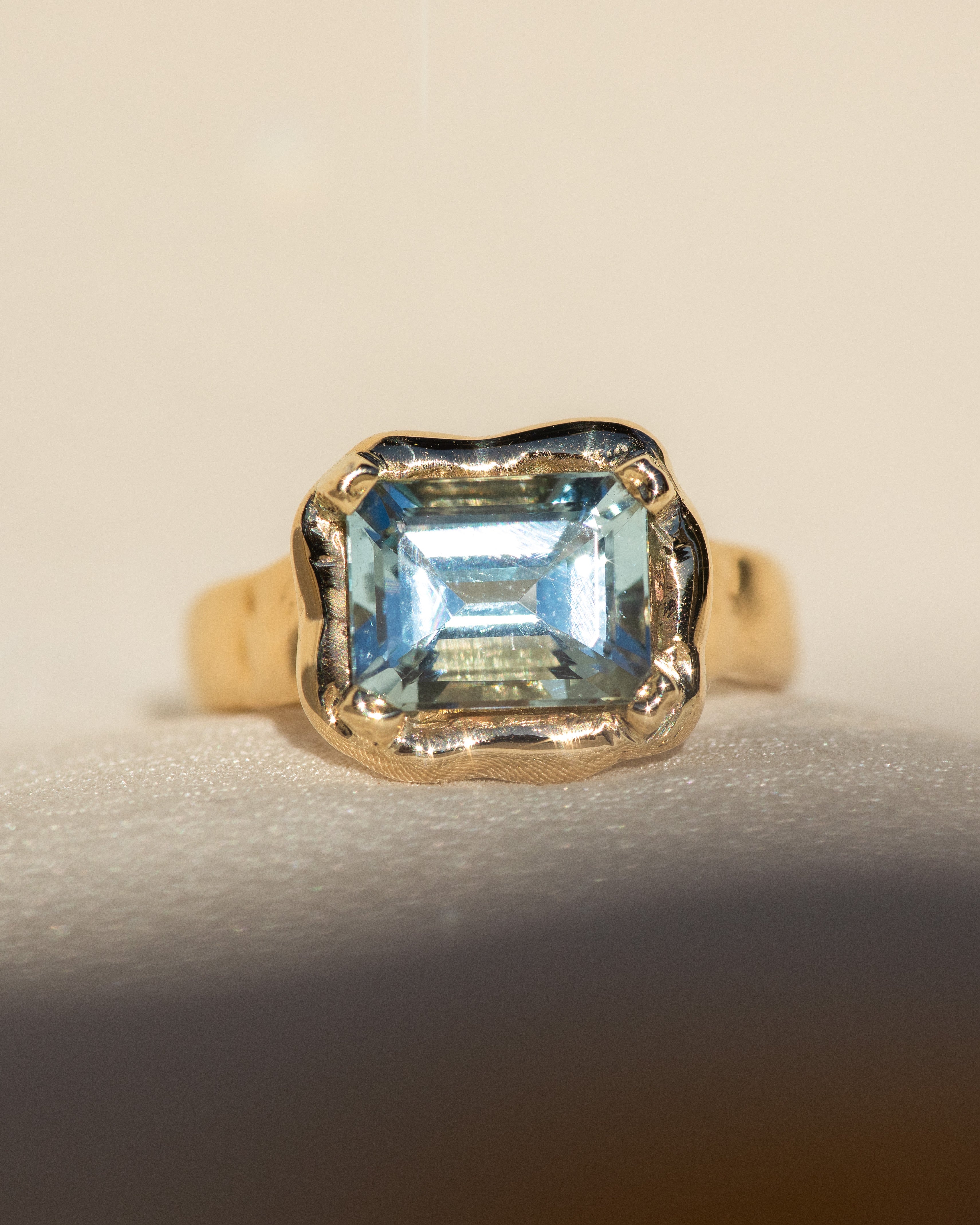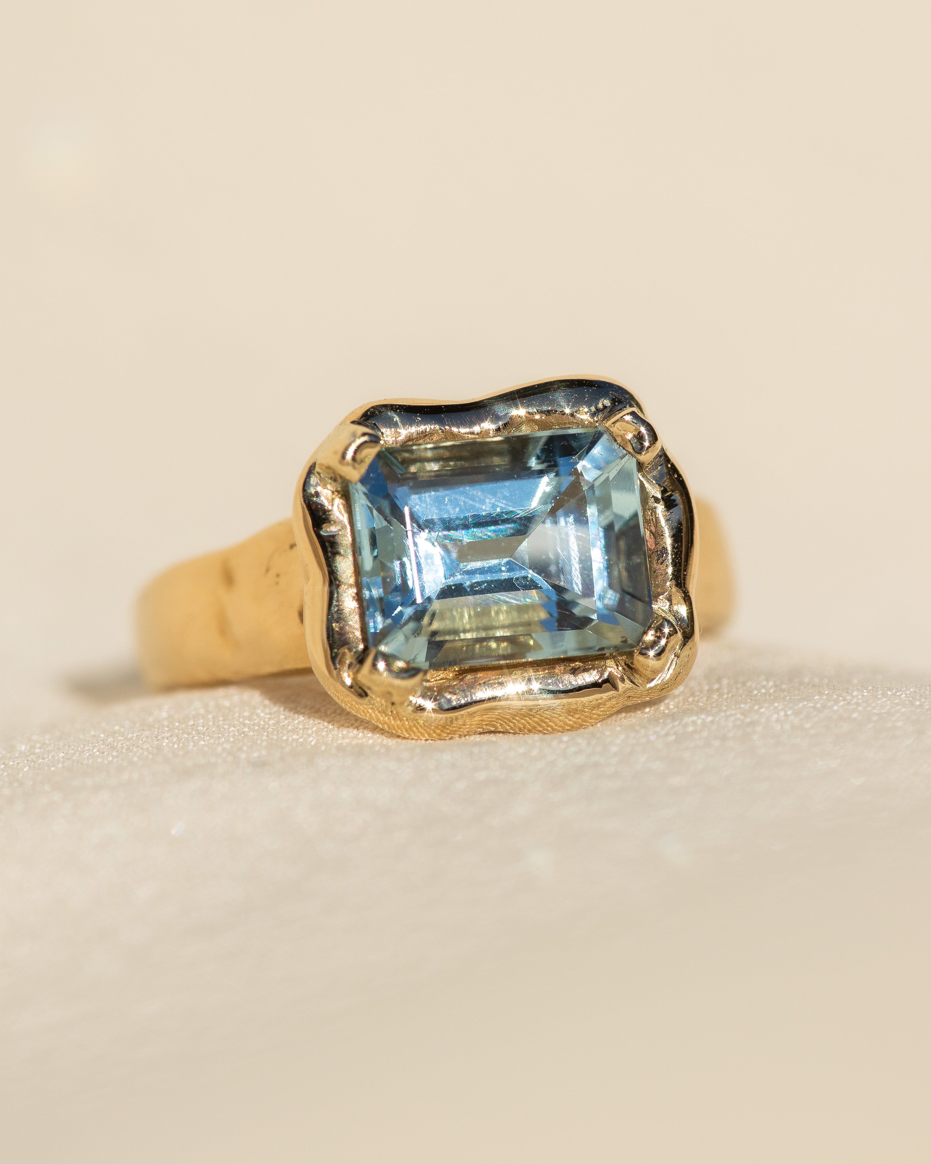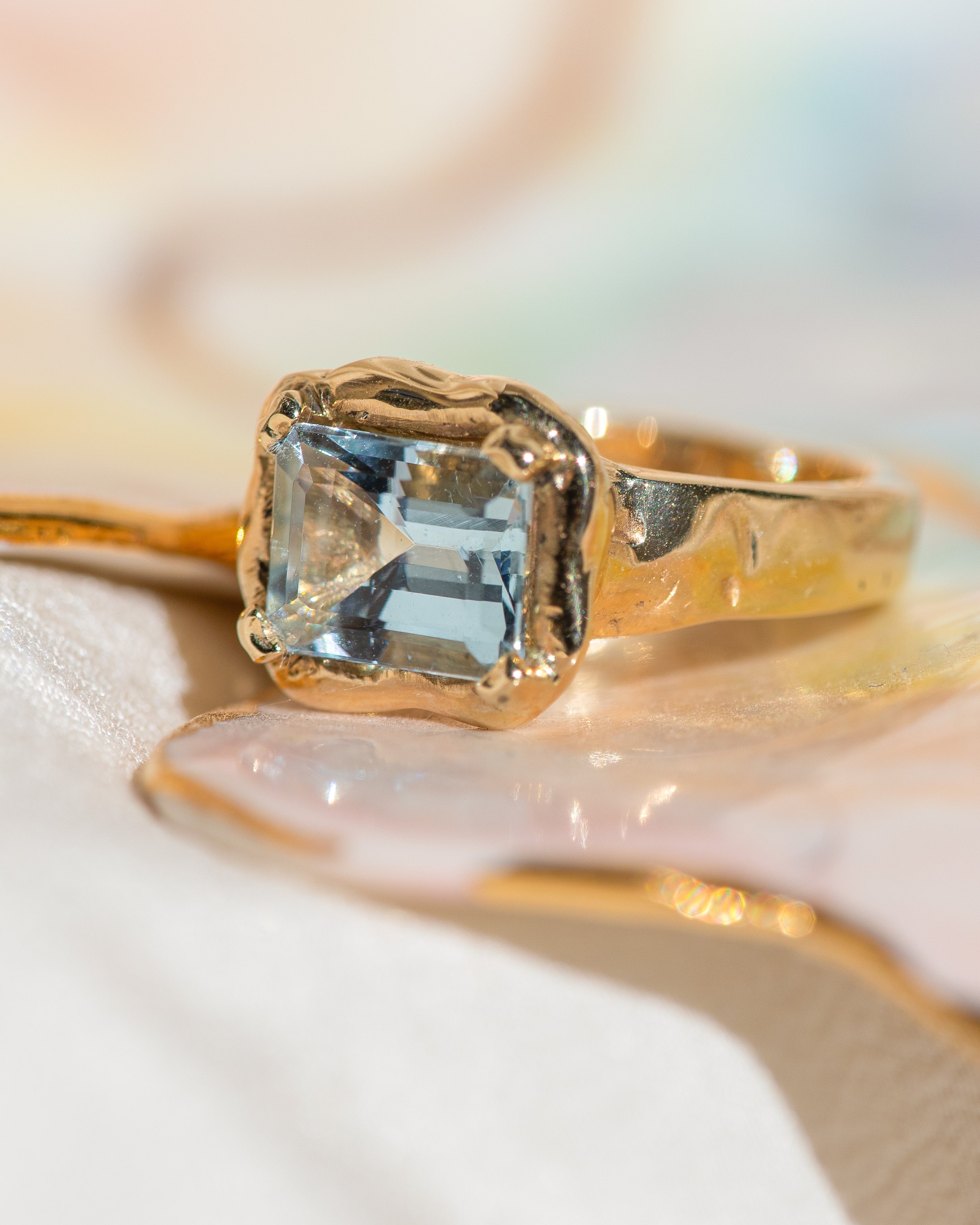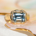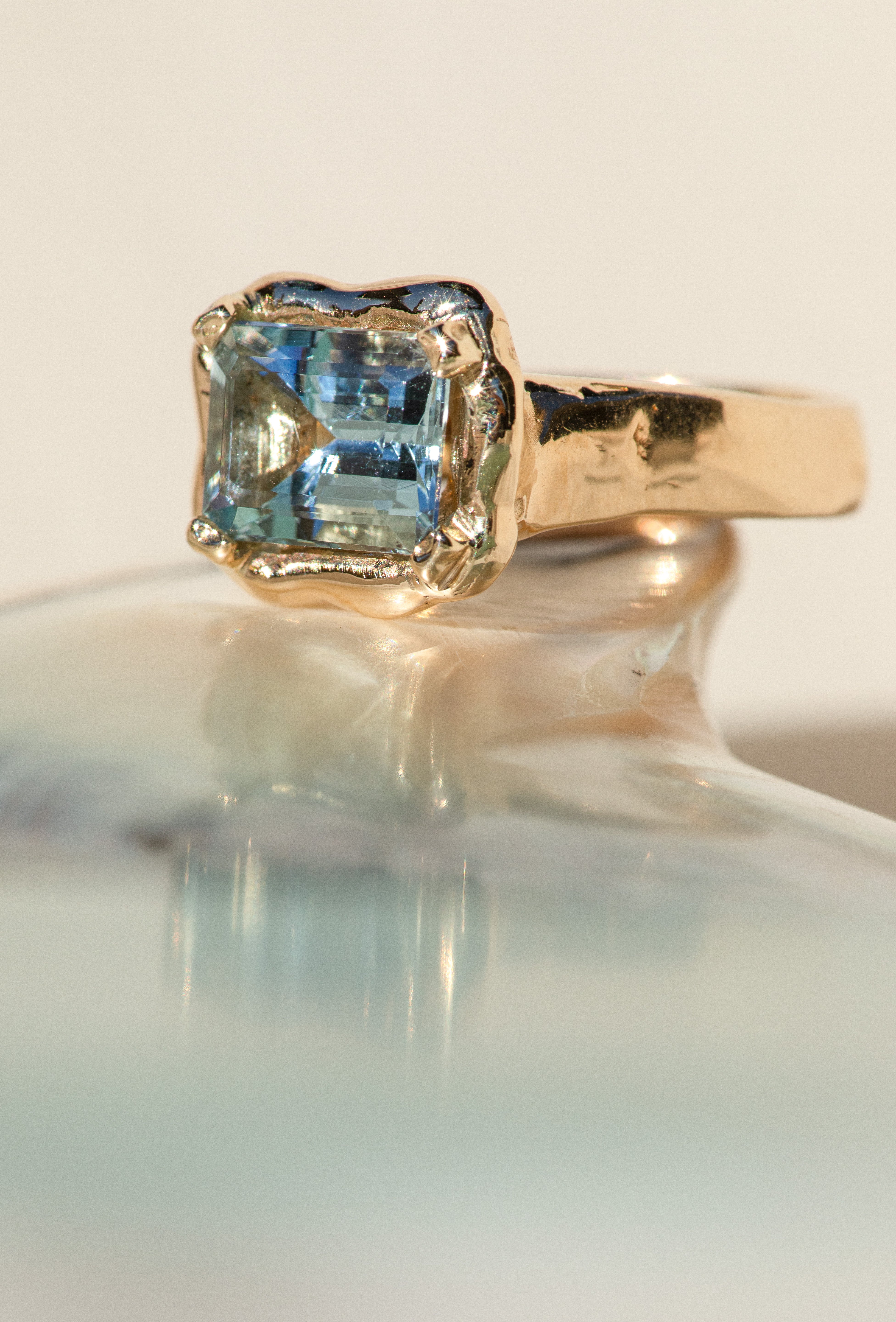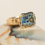 One of a kind hand-carved 14k Yellow gold ring featuring a stunning emerald cut Aquamarine. Stone measures approx. 2.1ct. 9x7mm. 5mm thickness band.