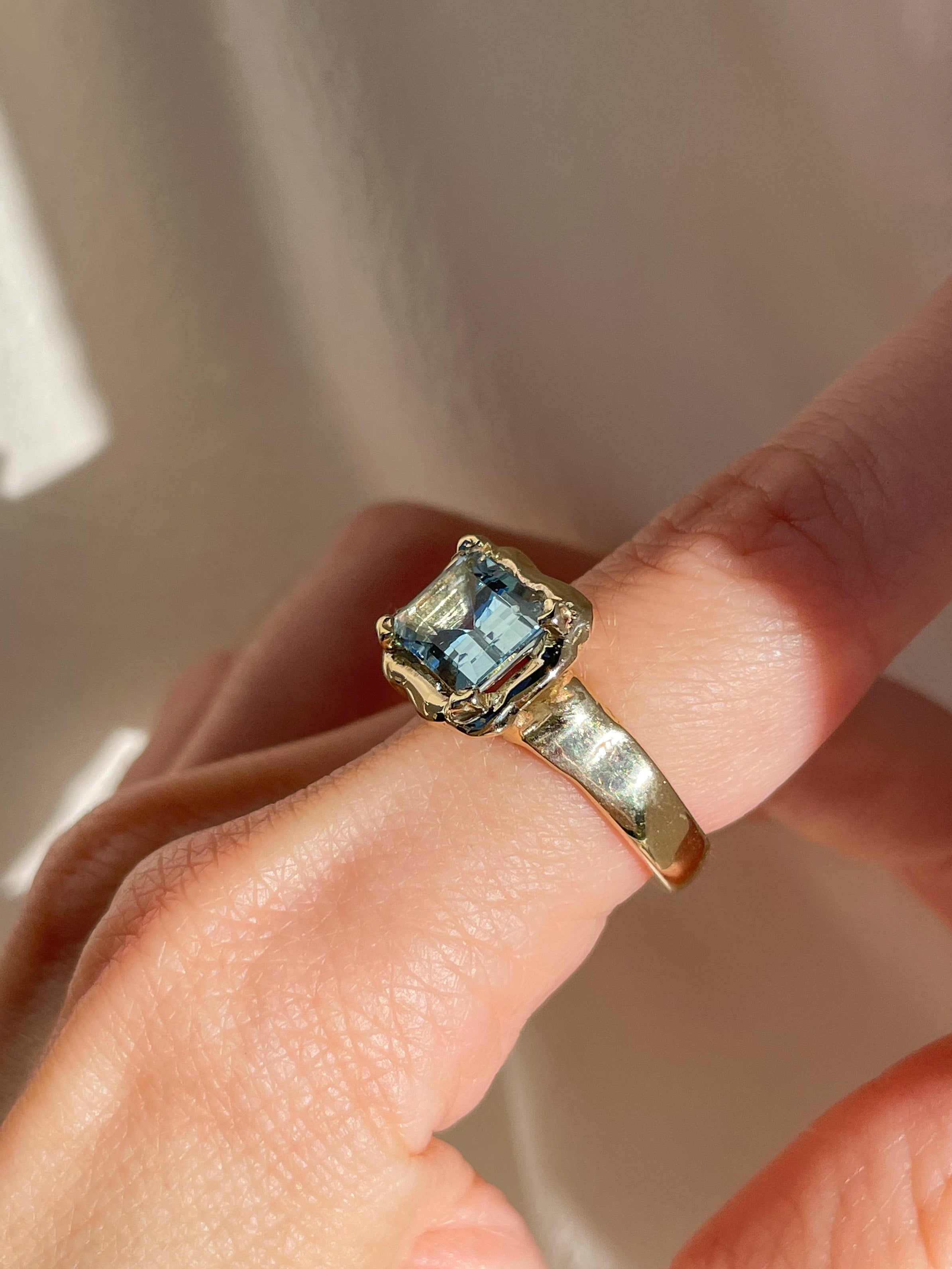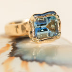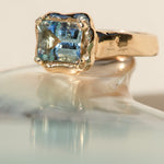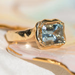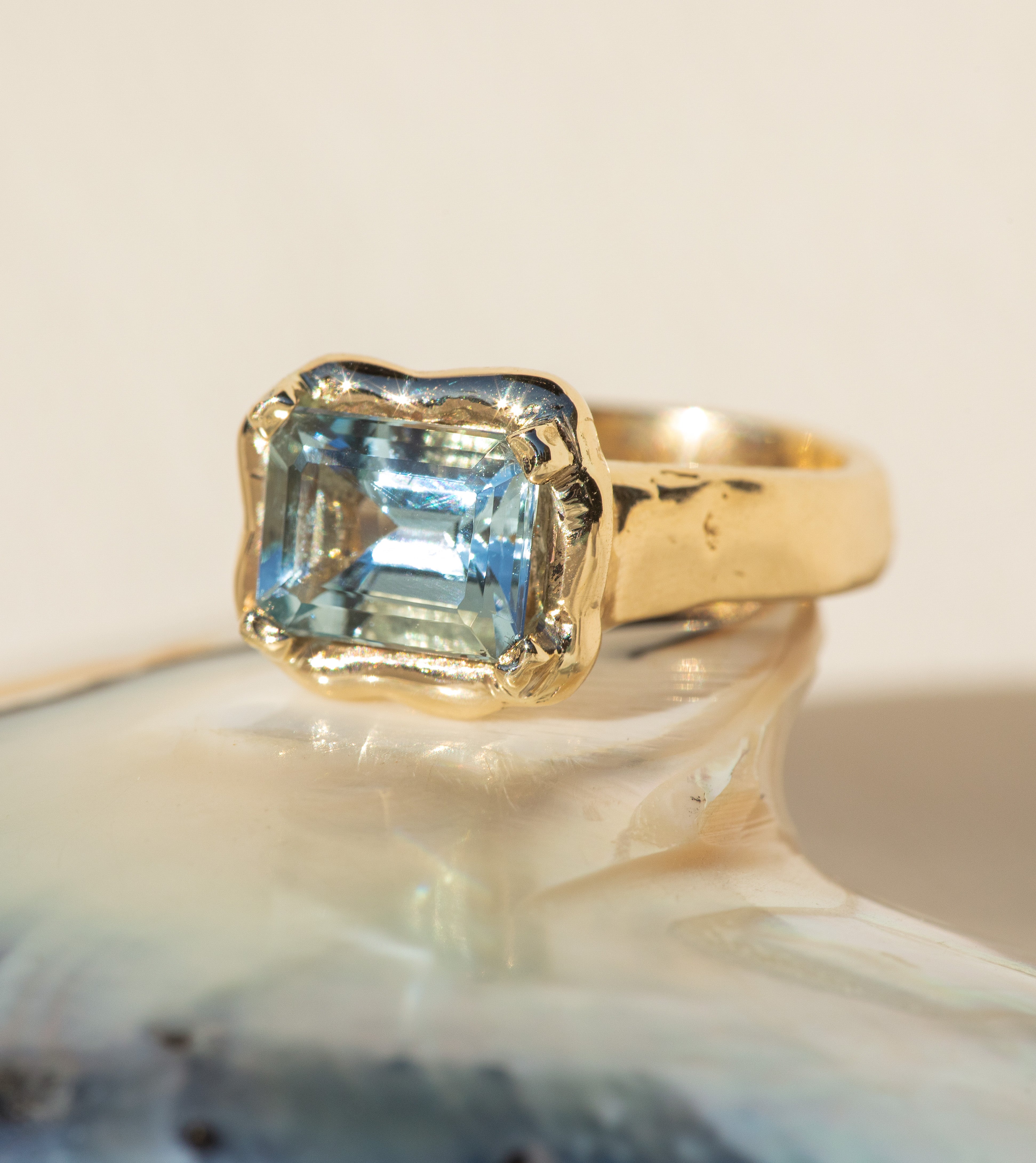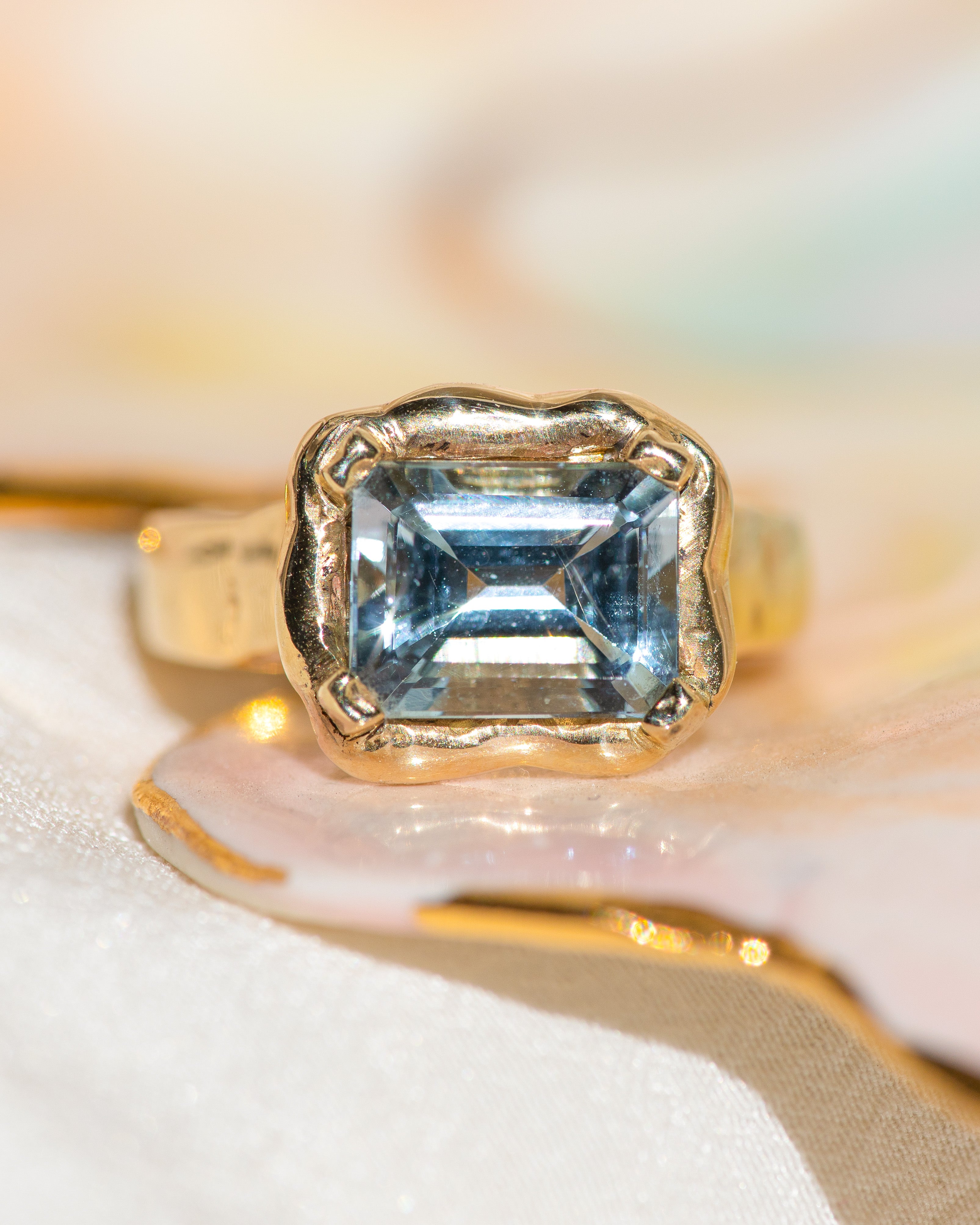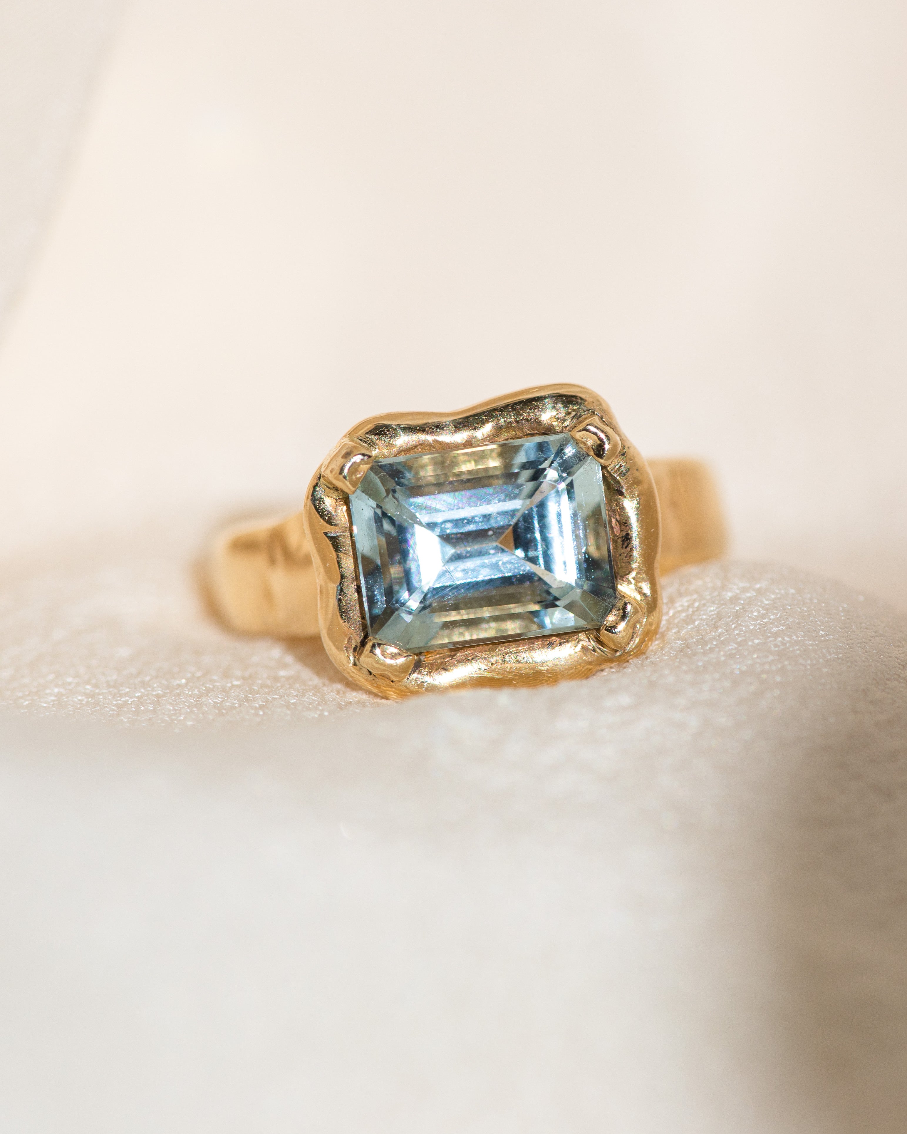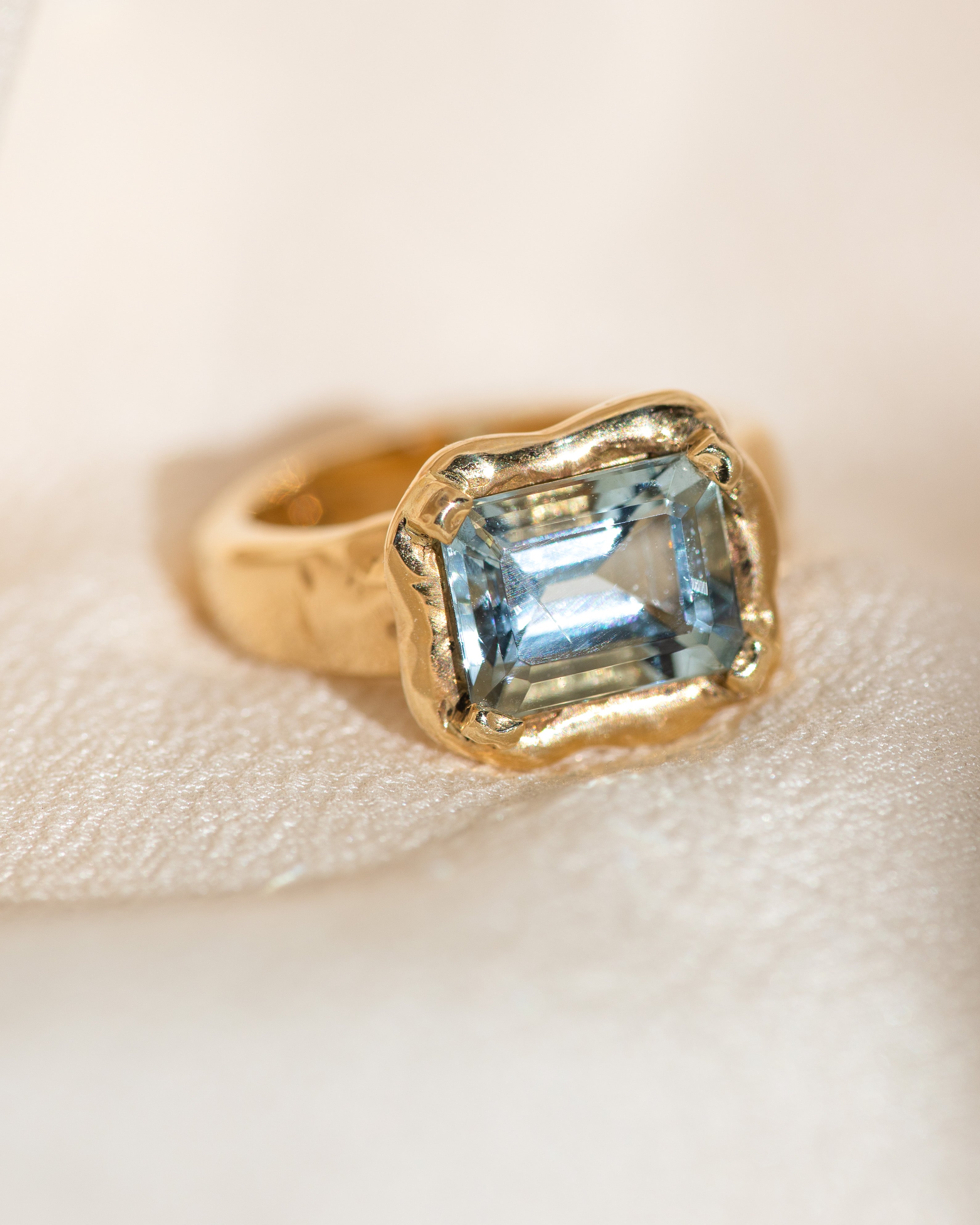 One of a kind hand-carved 14k Yellow gold ring featuring a stunning emerald cut Aquamarine. Stone measures approx. 2.1ct. 9x7mm. 5mm thickness band.