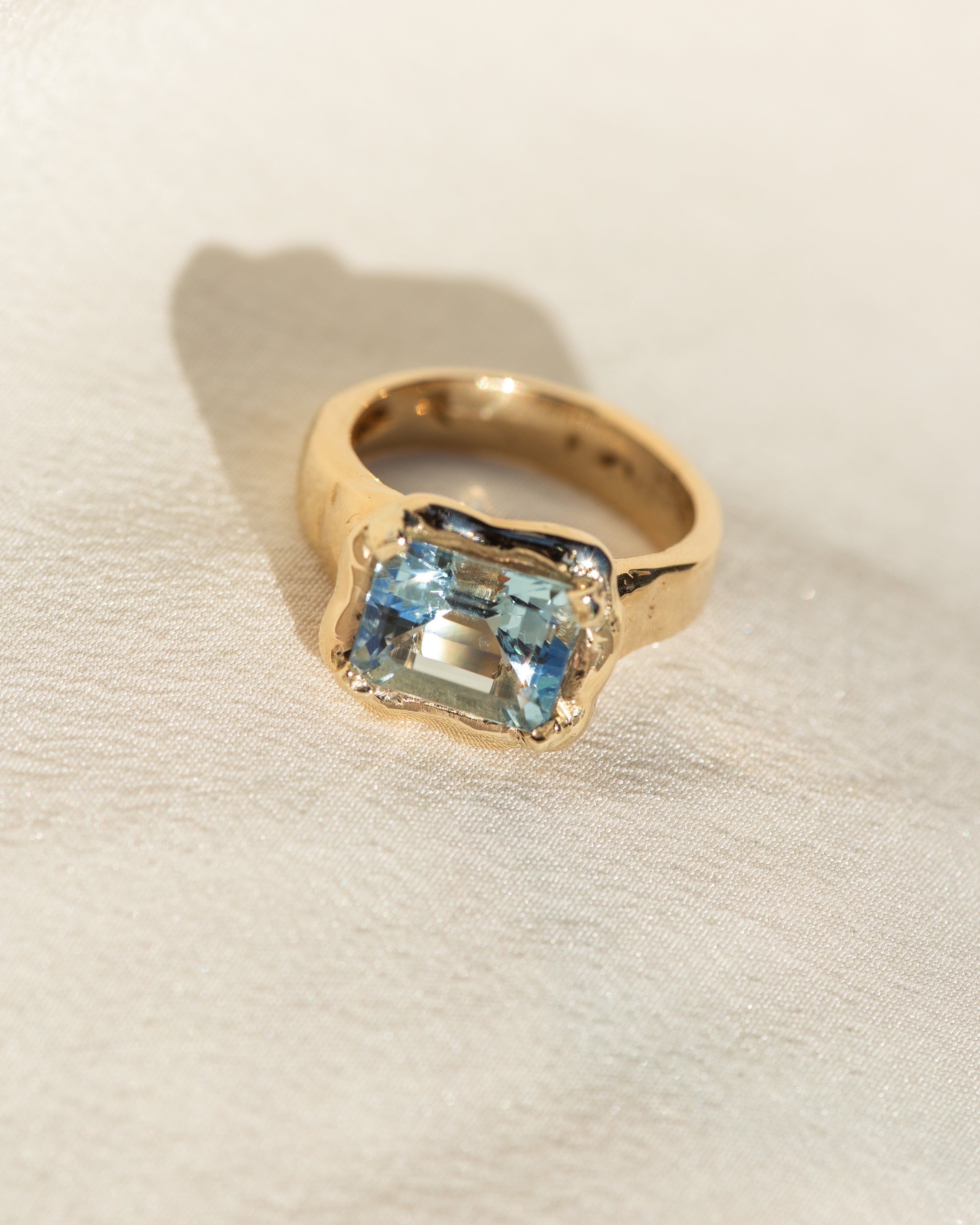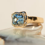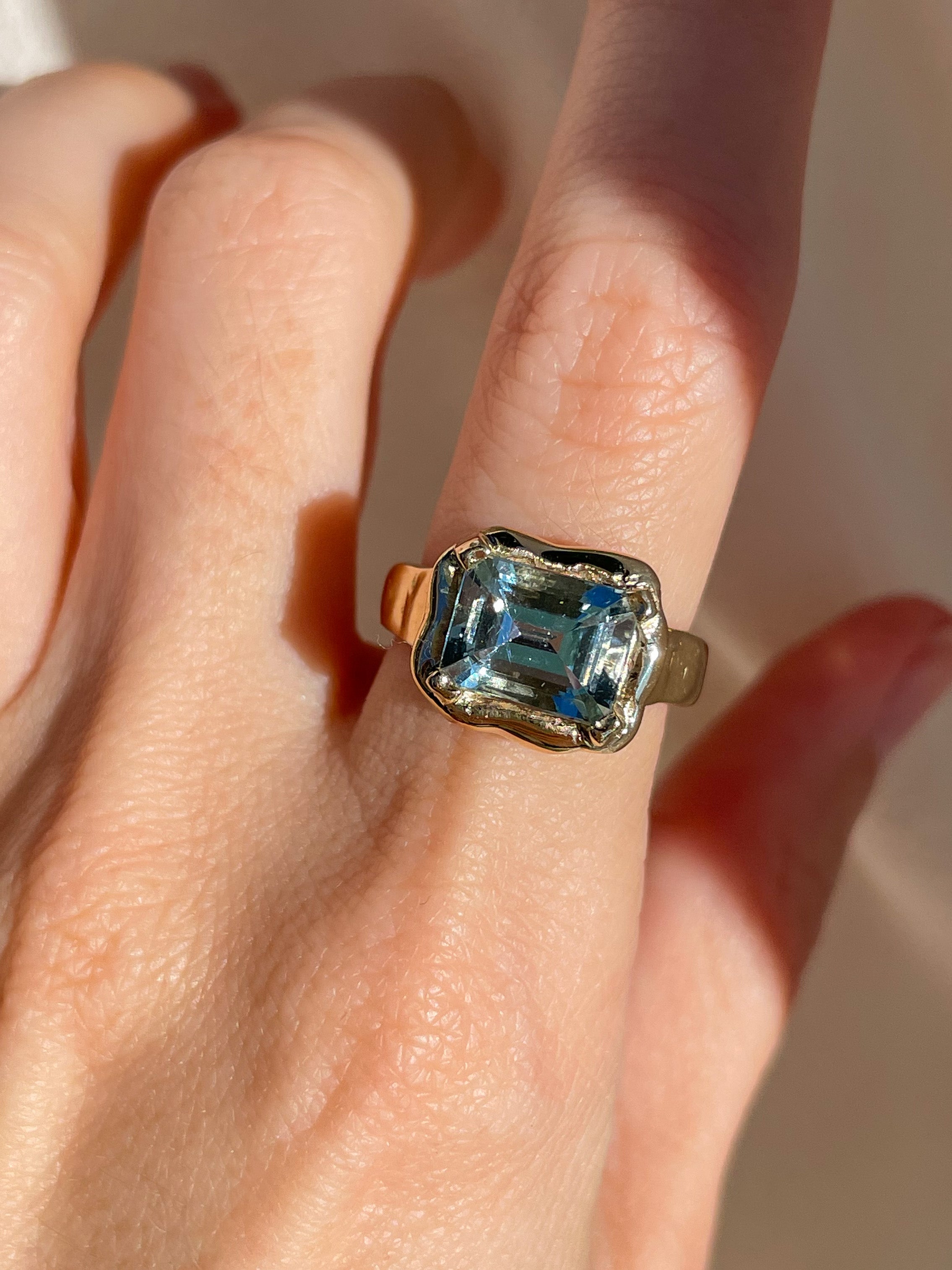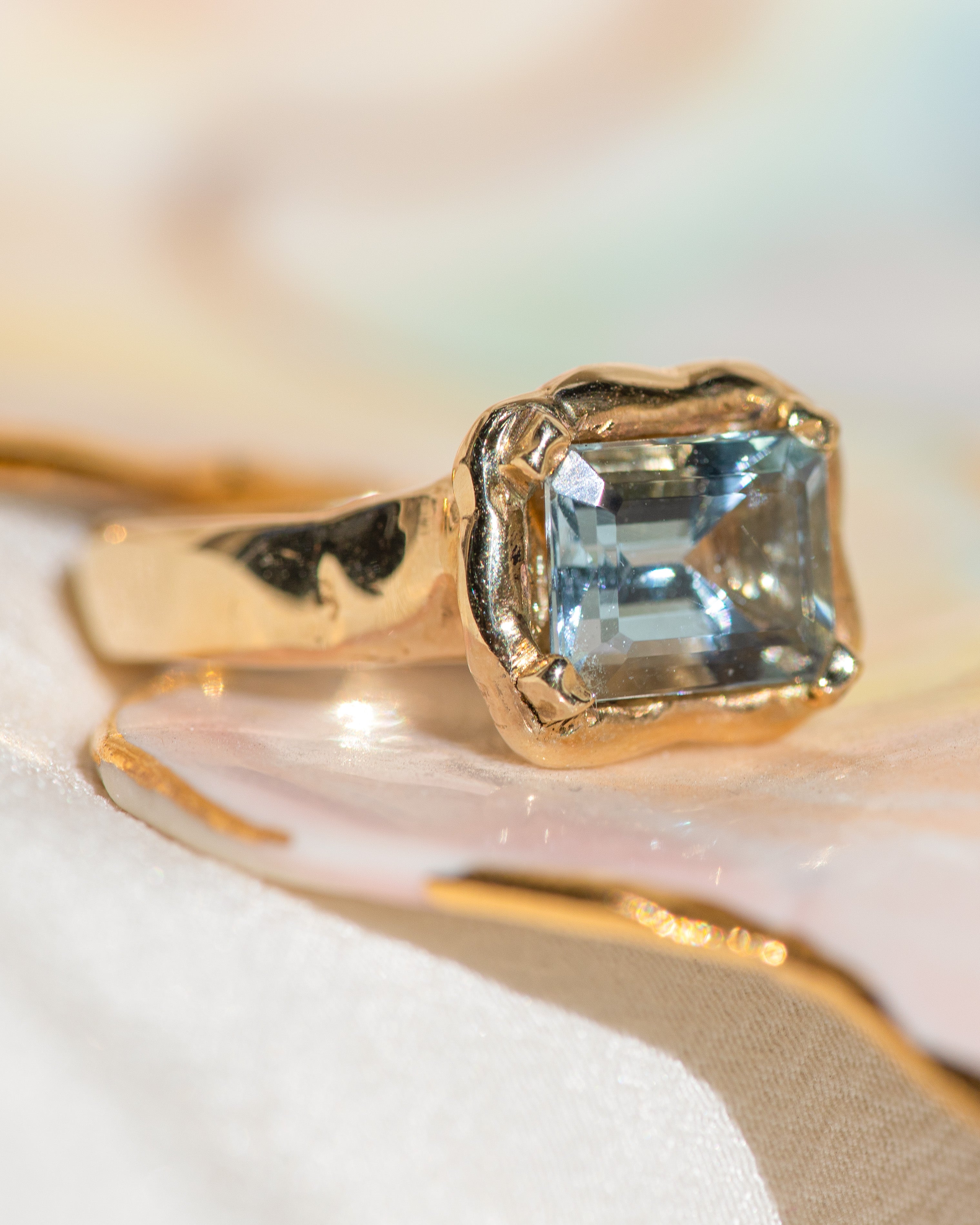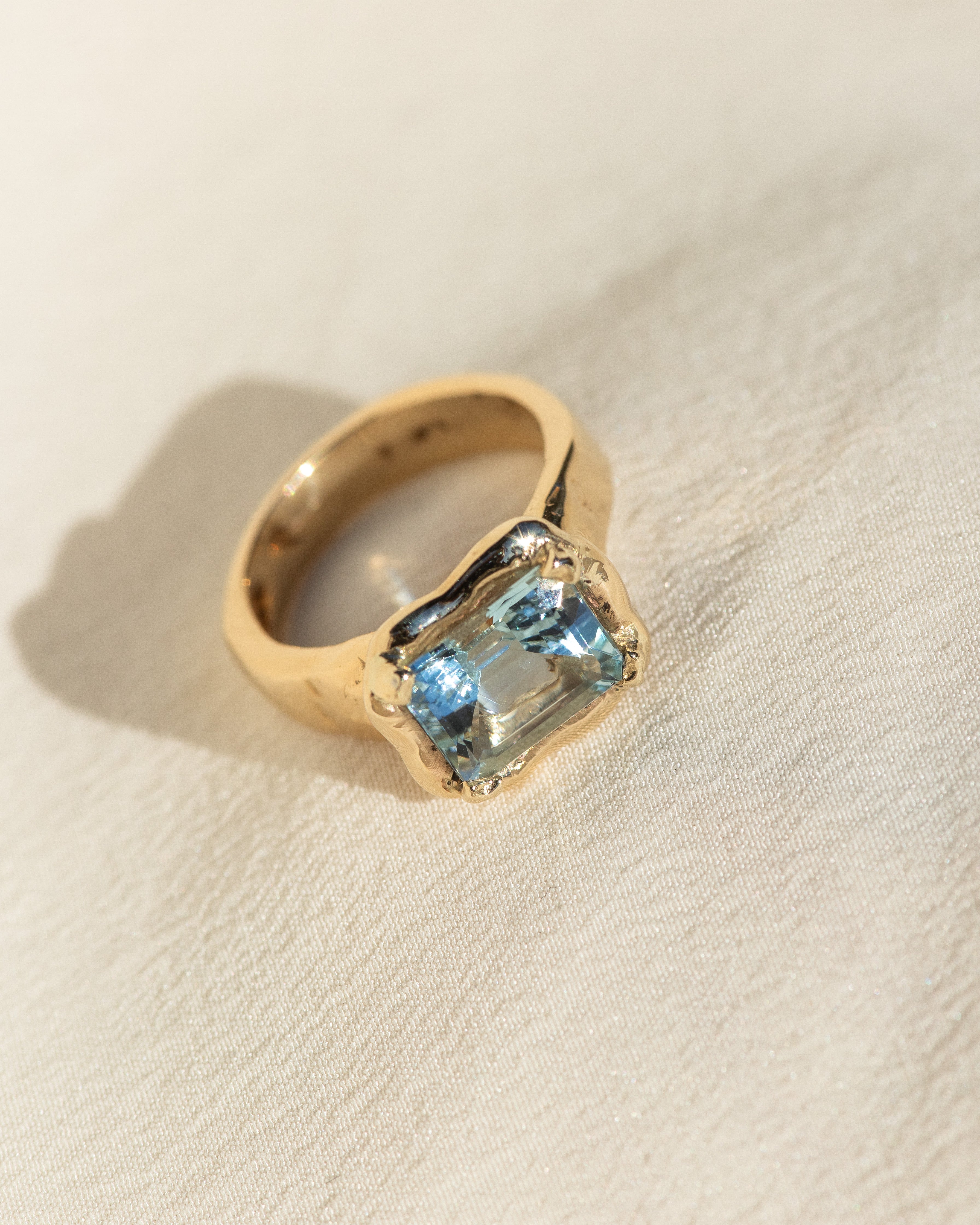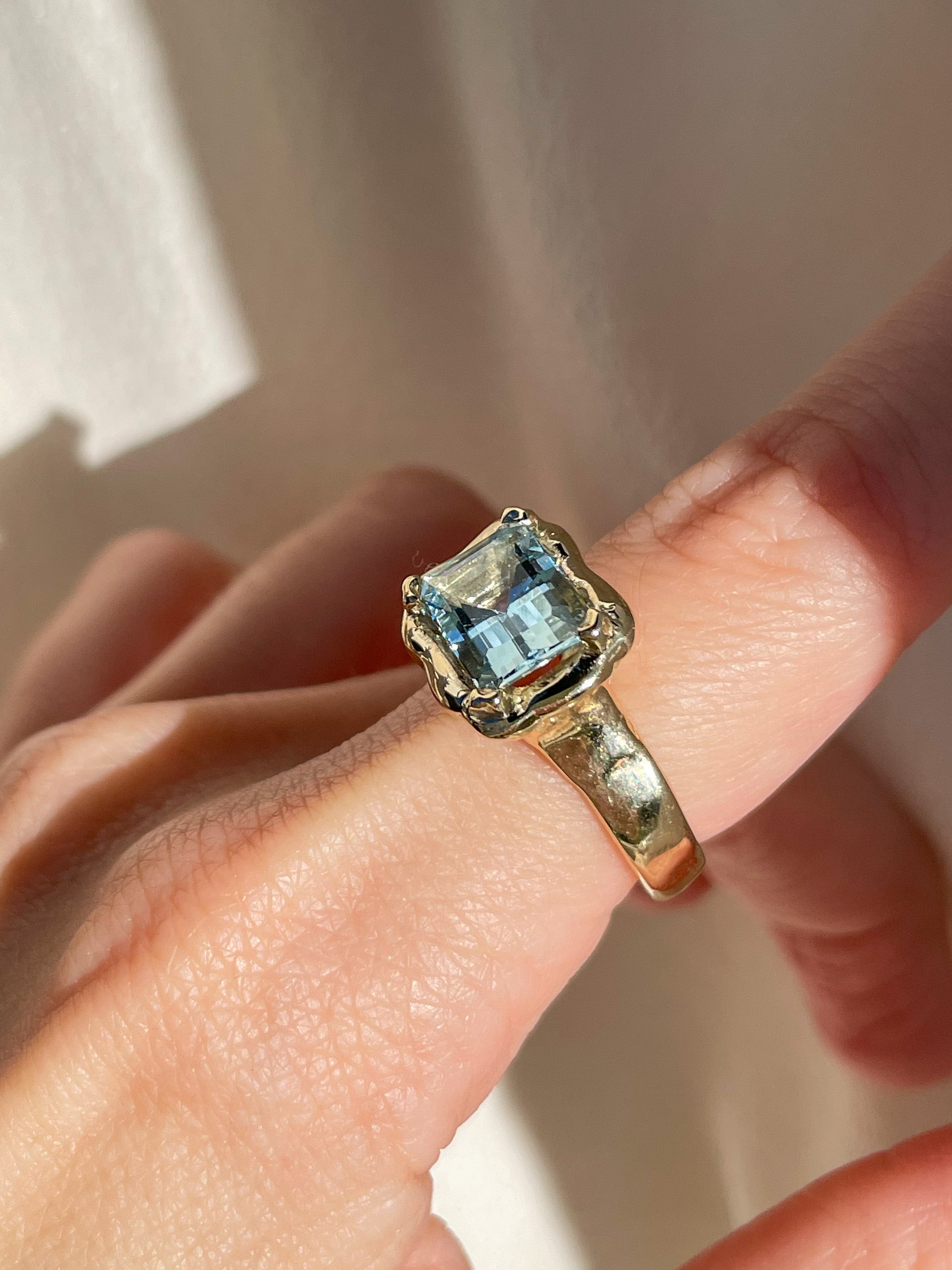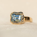 One of a kind hand-carved 14k Yellow gold ring featuring a stunning emerald cut Aquamarine. Stone measures approx. 2.1ct. 9x7mm. 5mm thickness band.