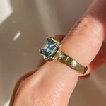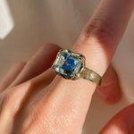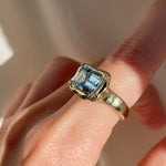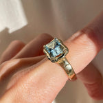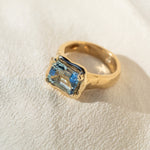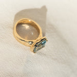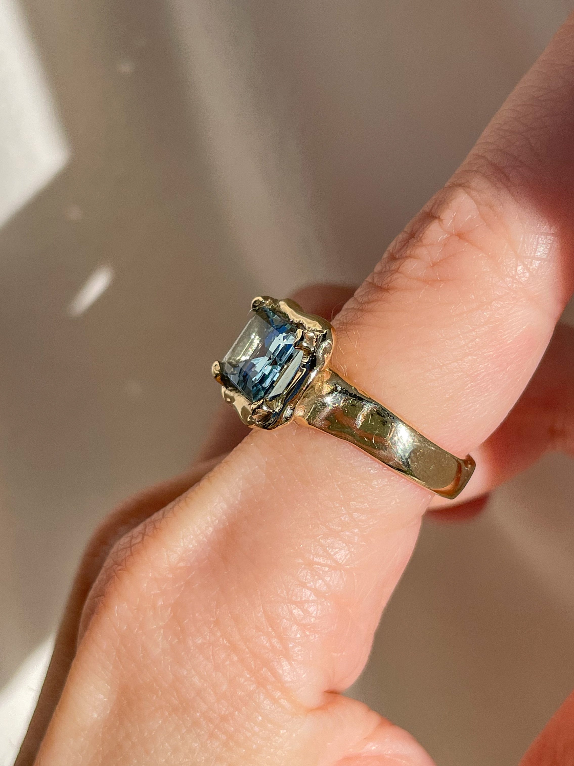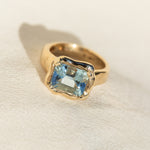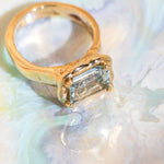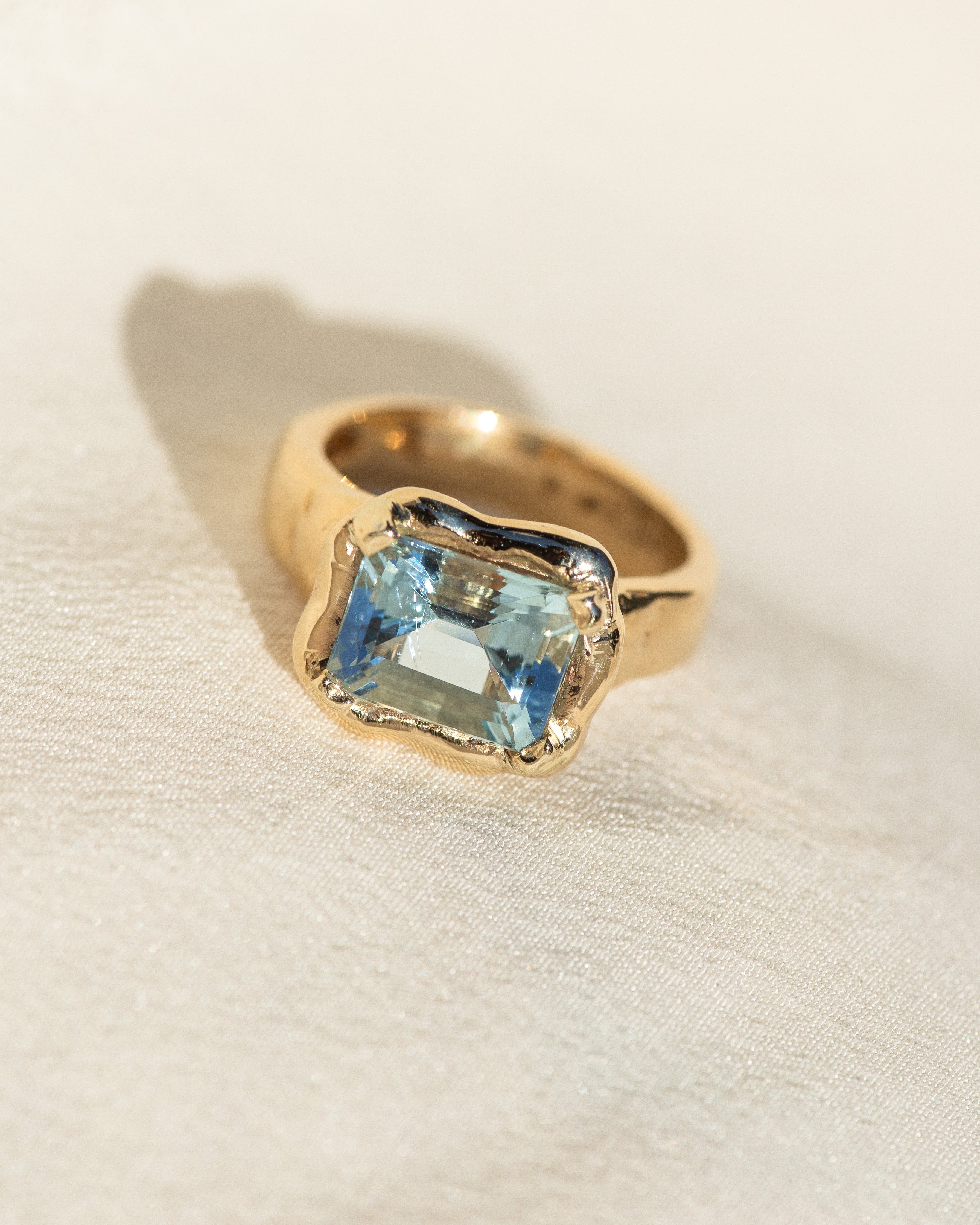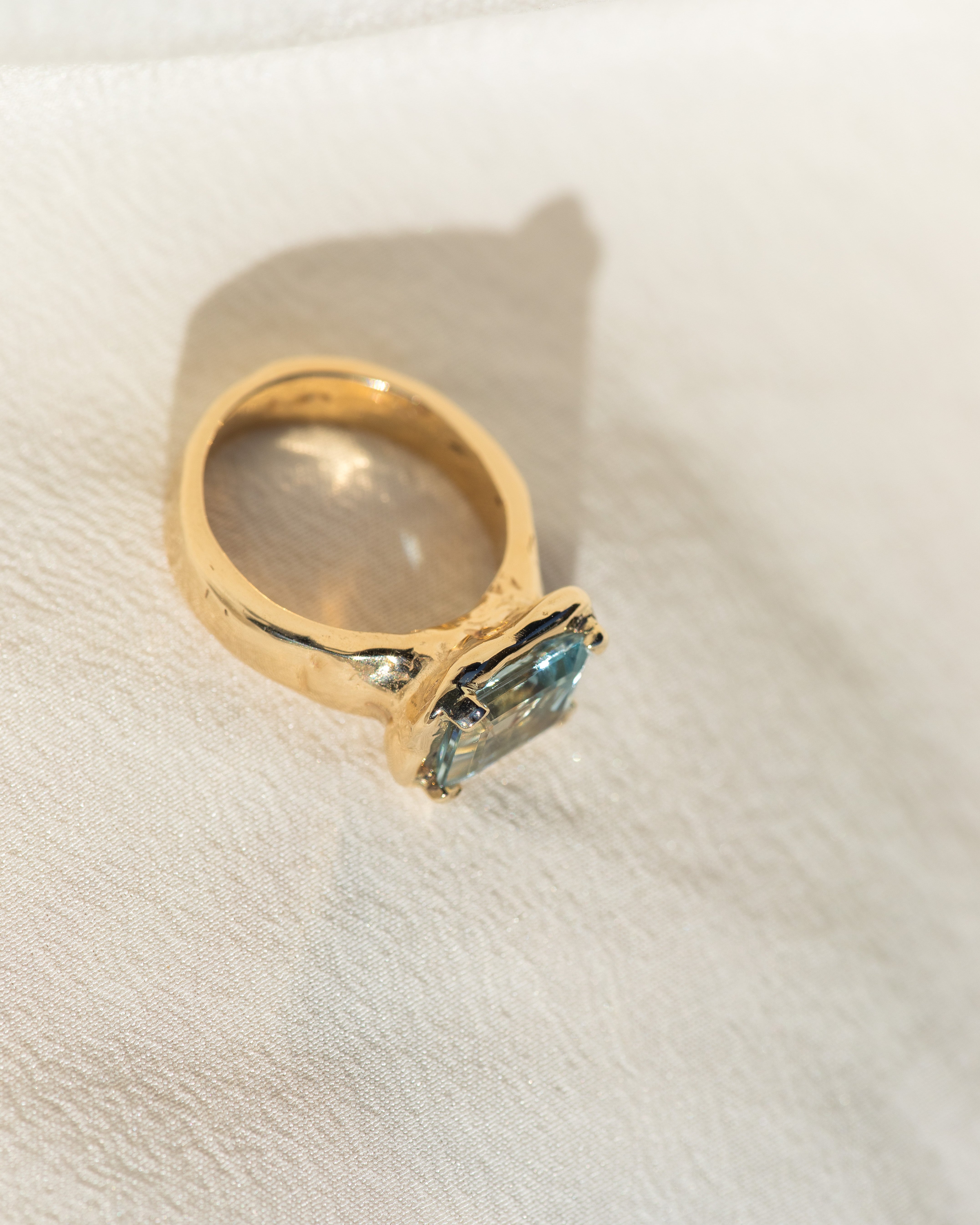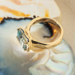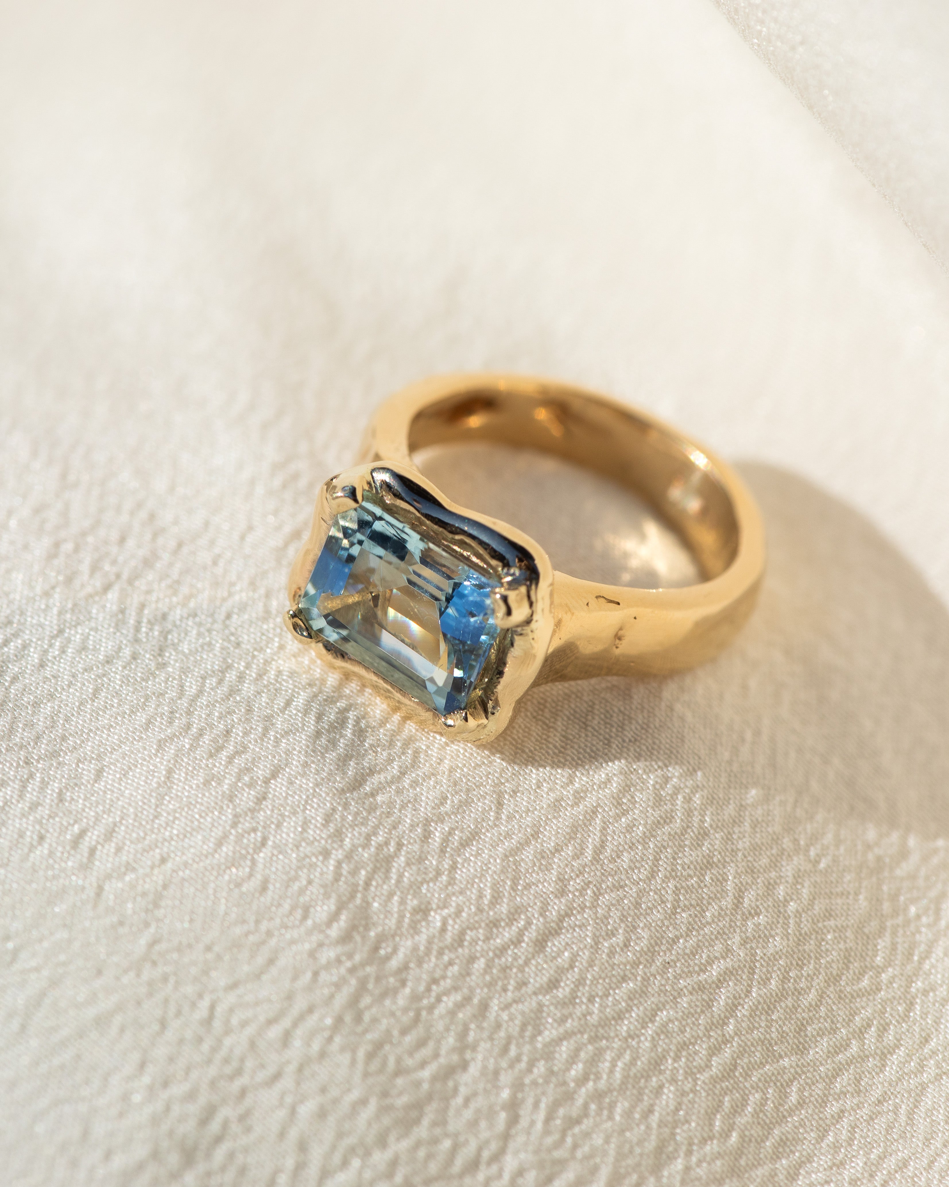 One of a kind hand-carved 14k Yellow gold ring featuring a stunning emerald cut Aquamarine. Stone measures approx. 2.1ct. 9x7mm. 5mm thickness band.