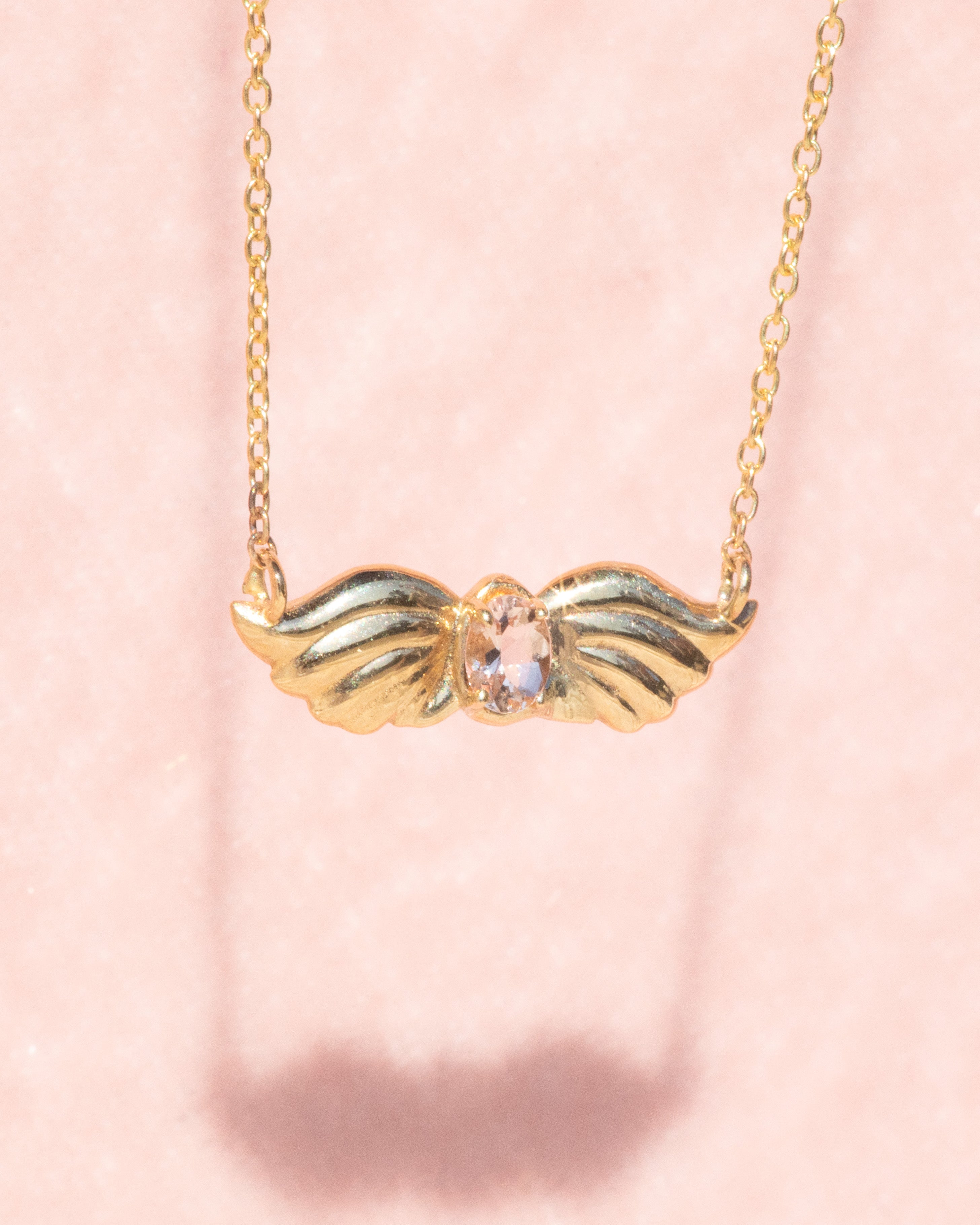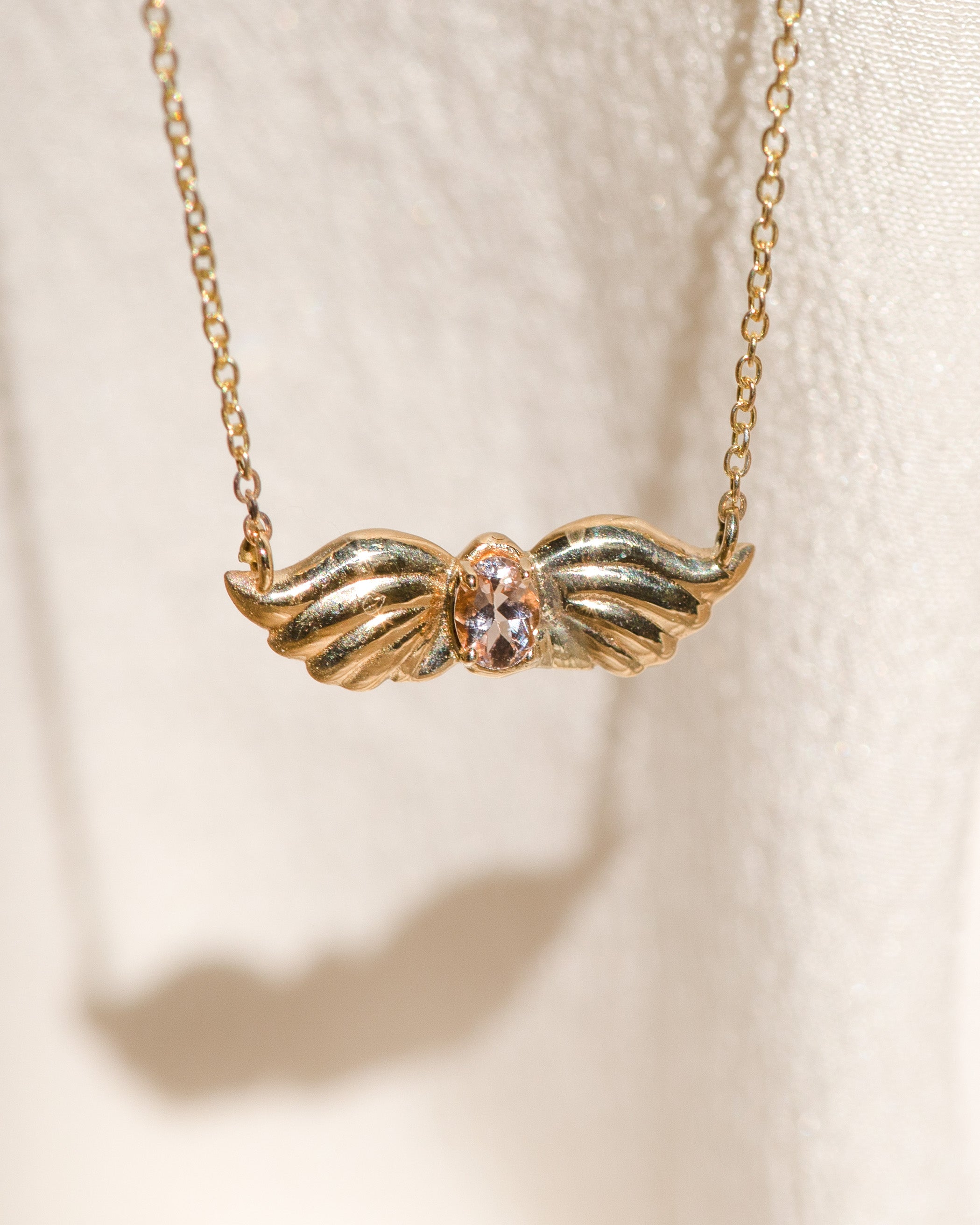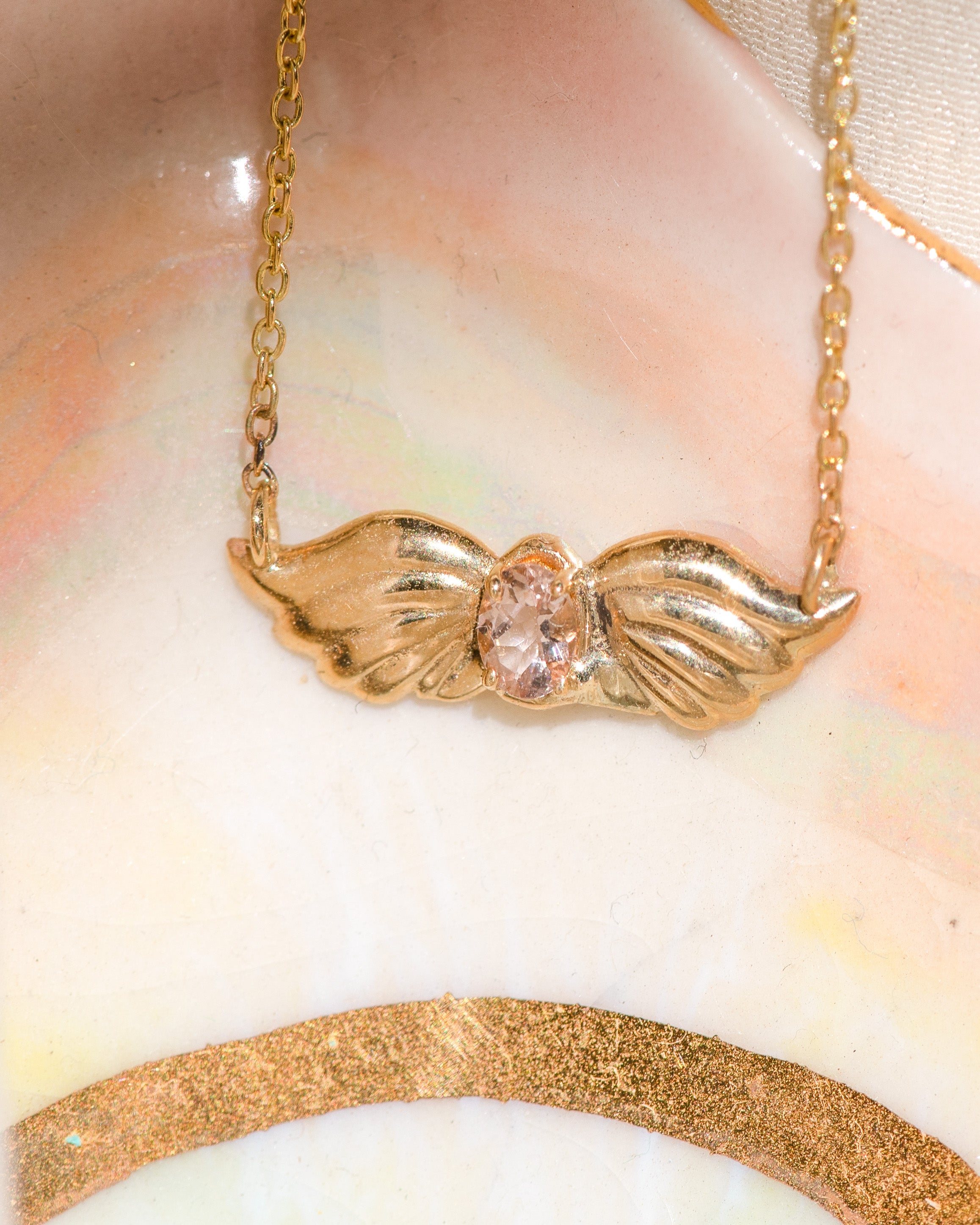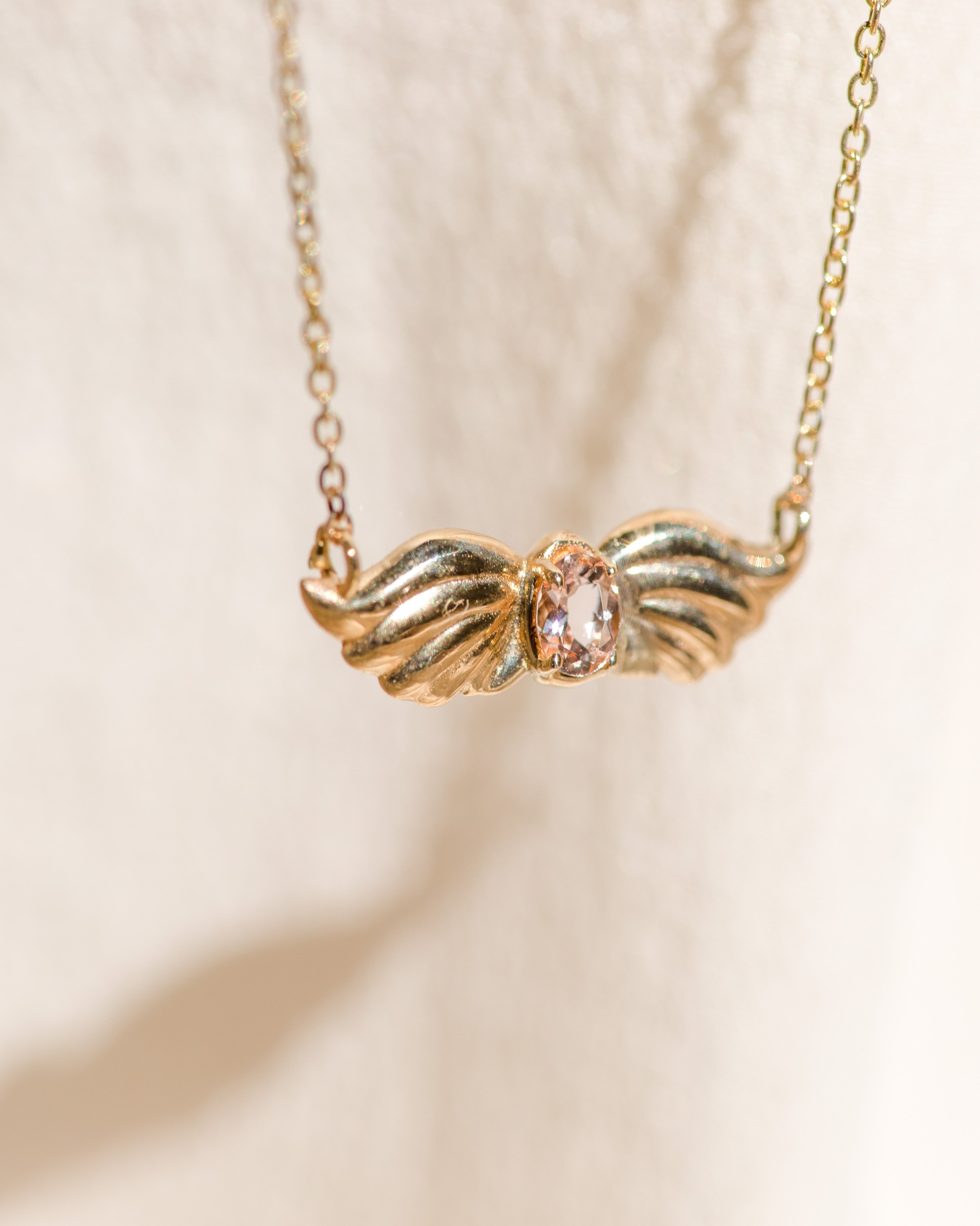 The Angel Wings Pendant features a beautiful oval center Morganite, held between a pair of Angel Wings, to guide you in the unconditional love you deserve and remind you of the innate Divinity, grace and worthiness that makes up who you are.