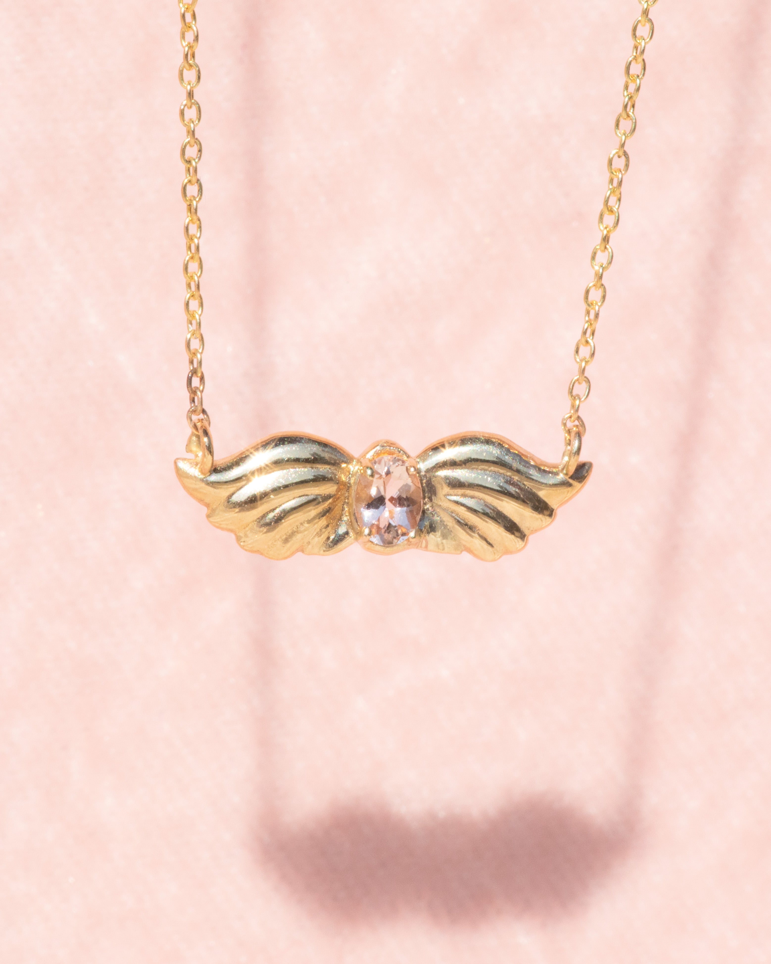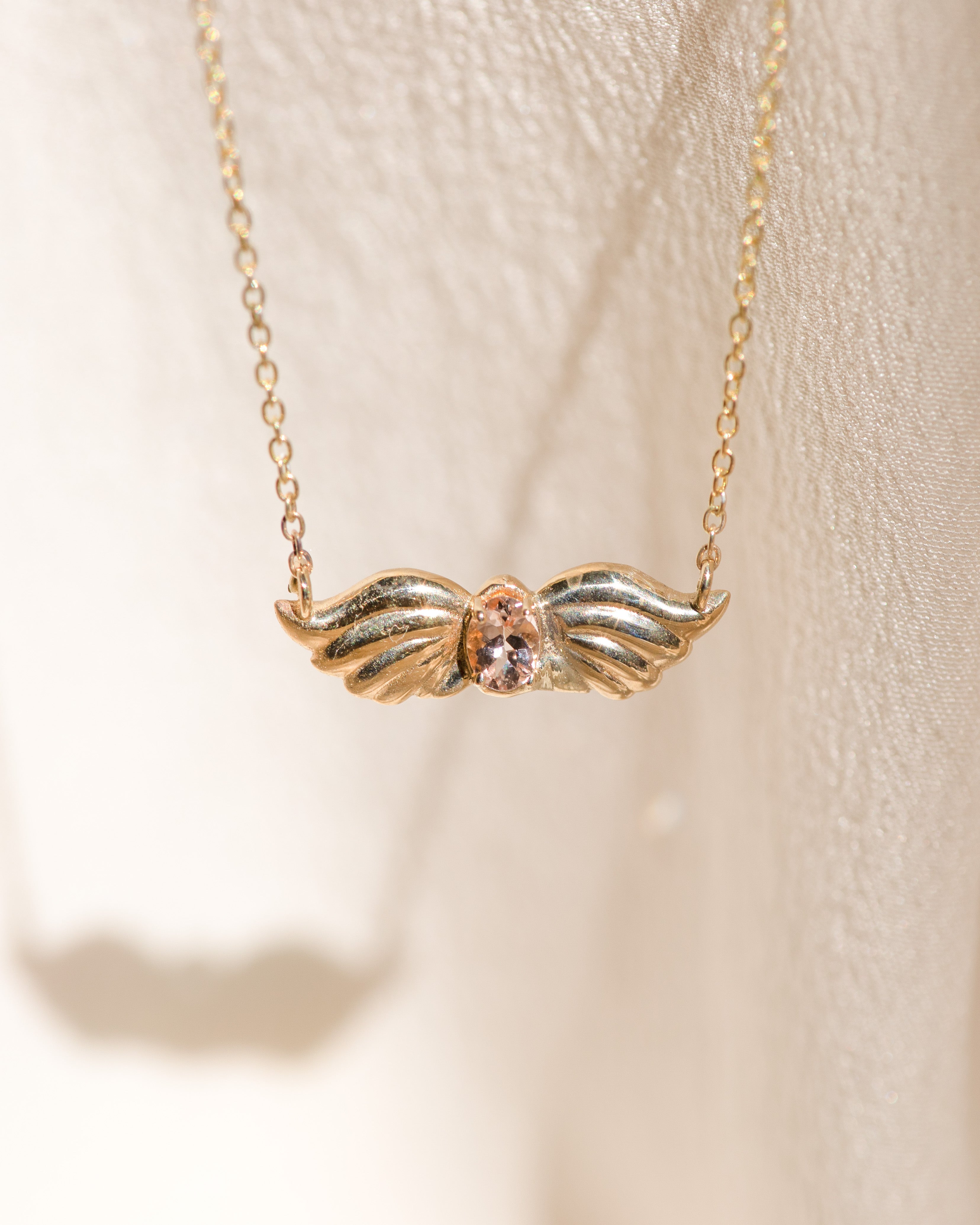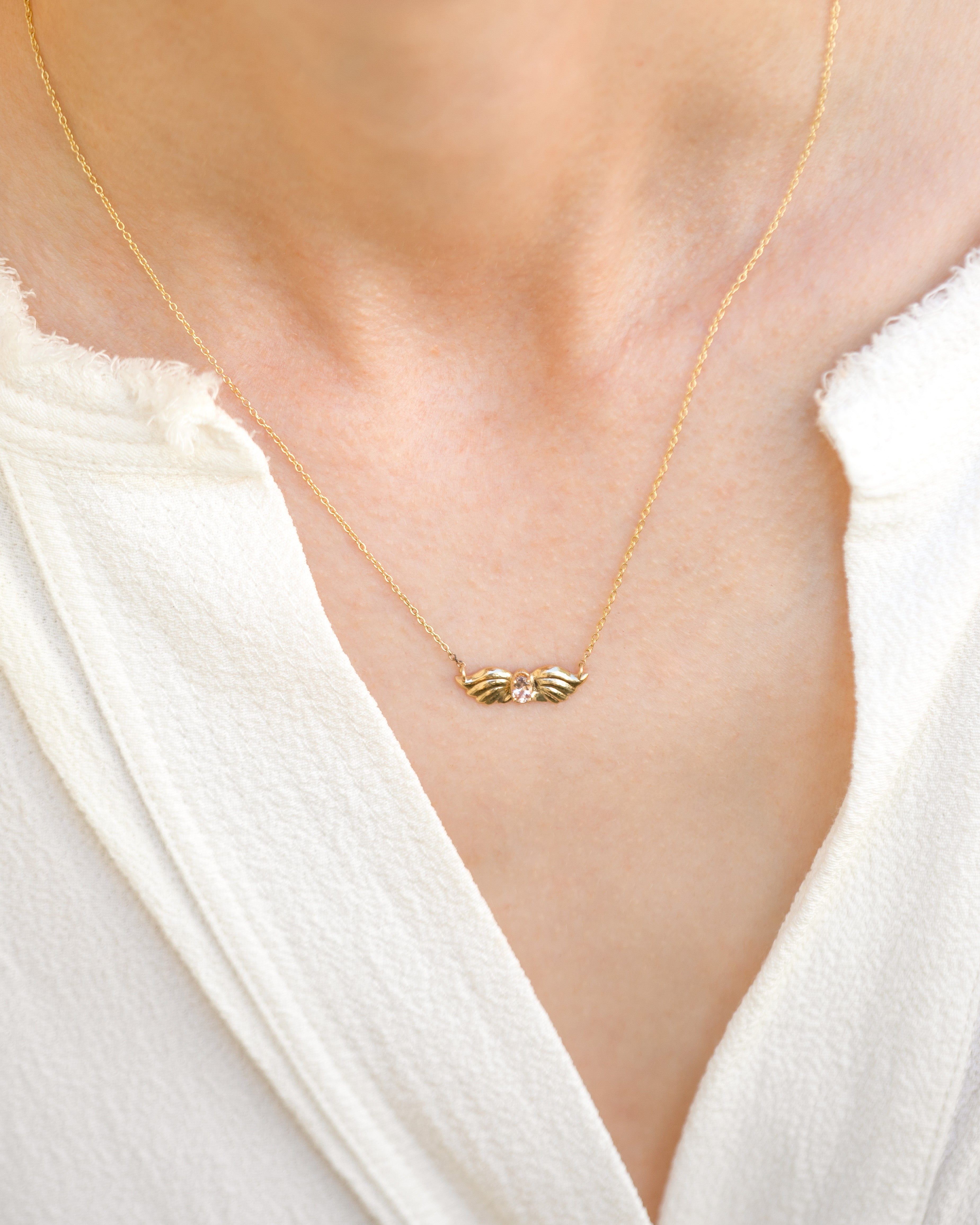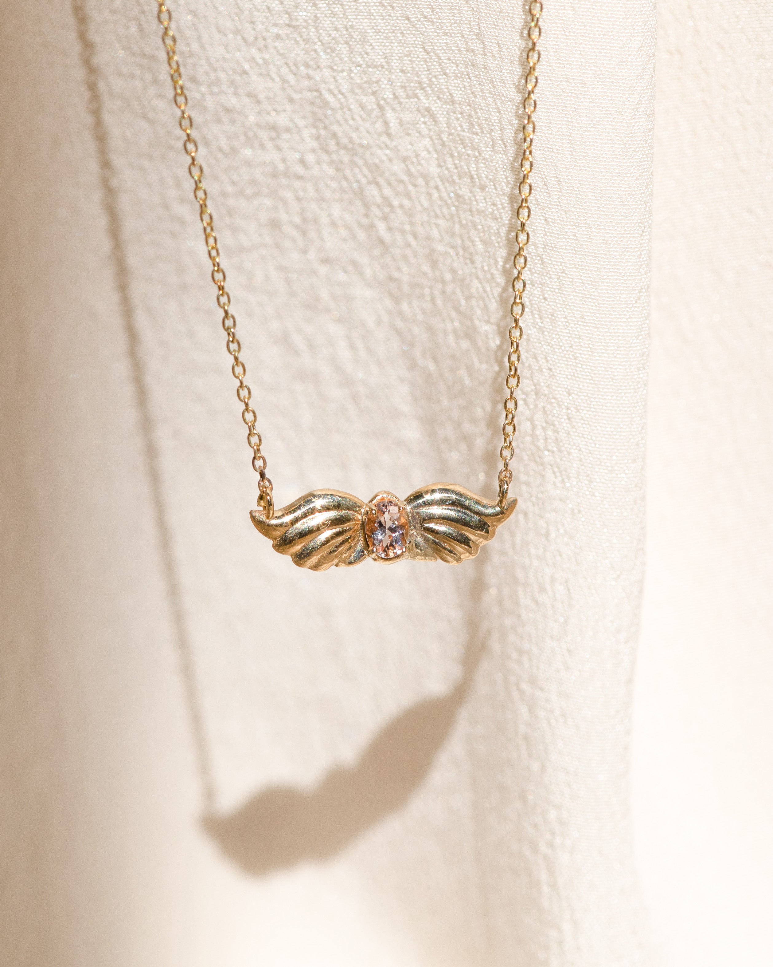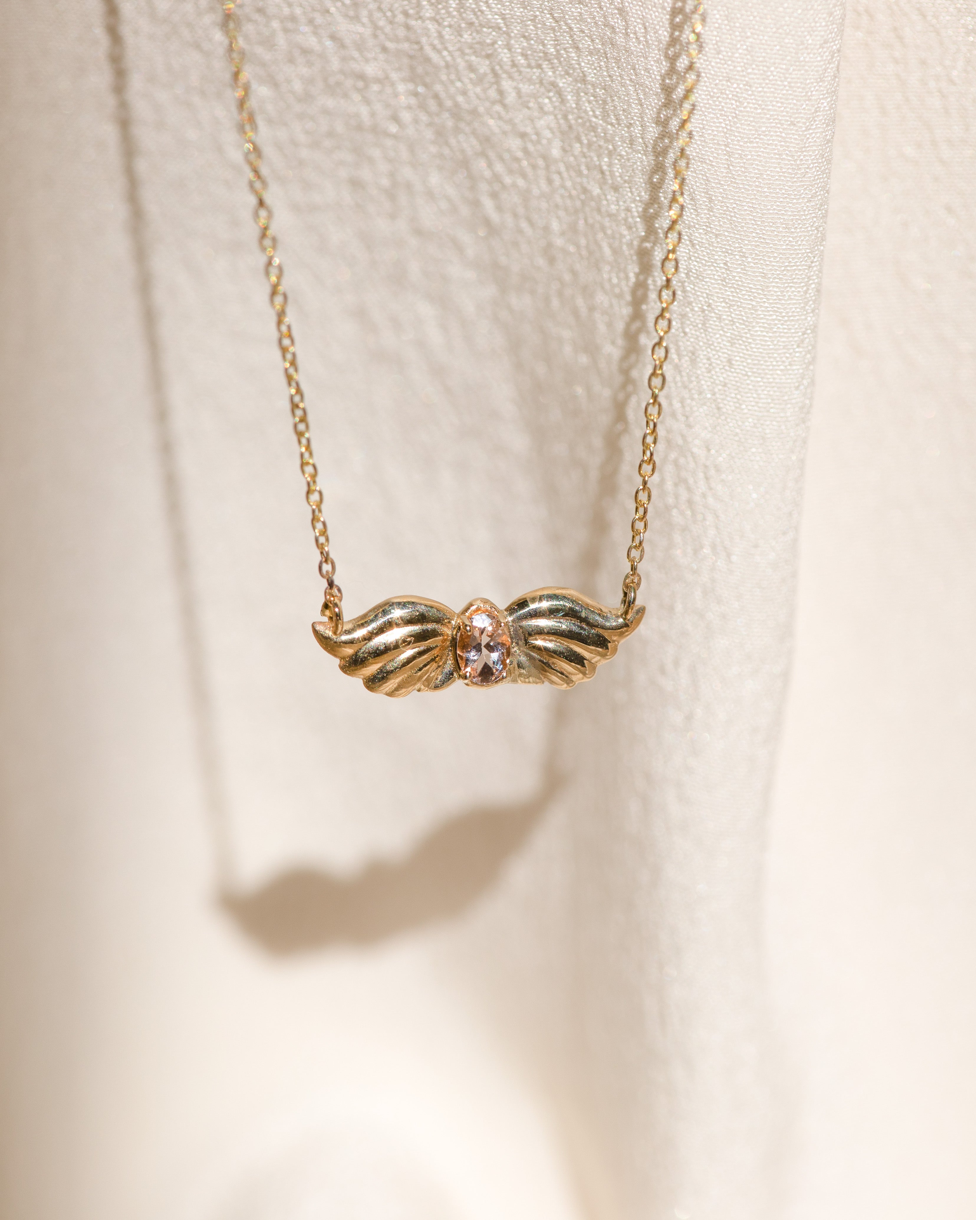 The Angel Wings Pendant features a beautiful oval center Morganite, held between a pair of Angel Wings, to guide you in the unconditional love you deserve and remind you of the innate Divinity, grace and worthiness that makes up who you are.