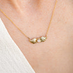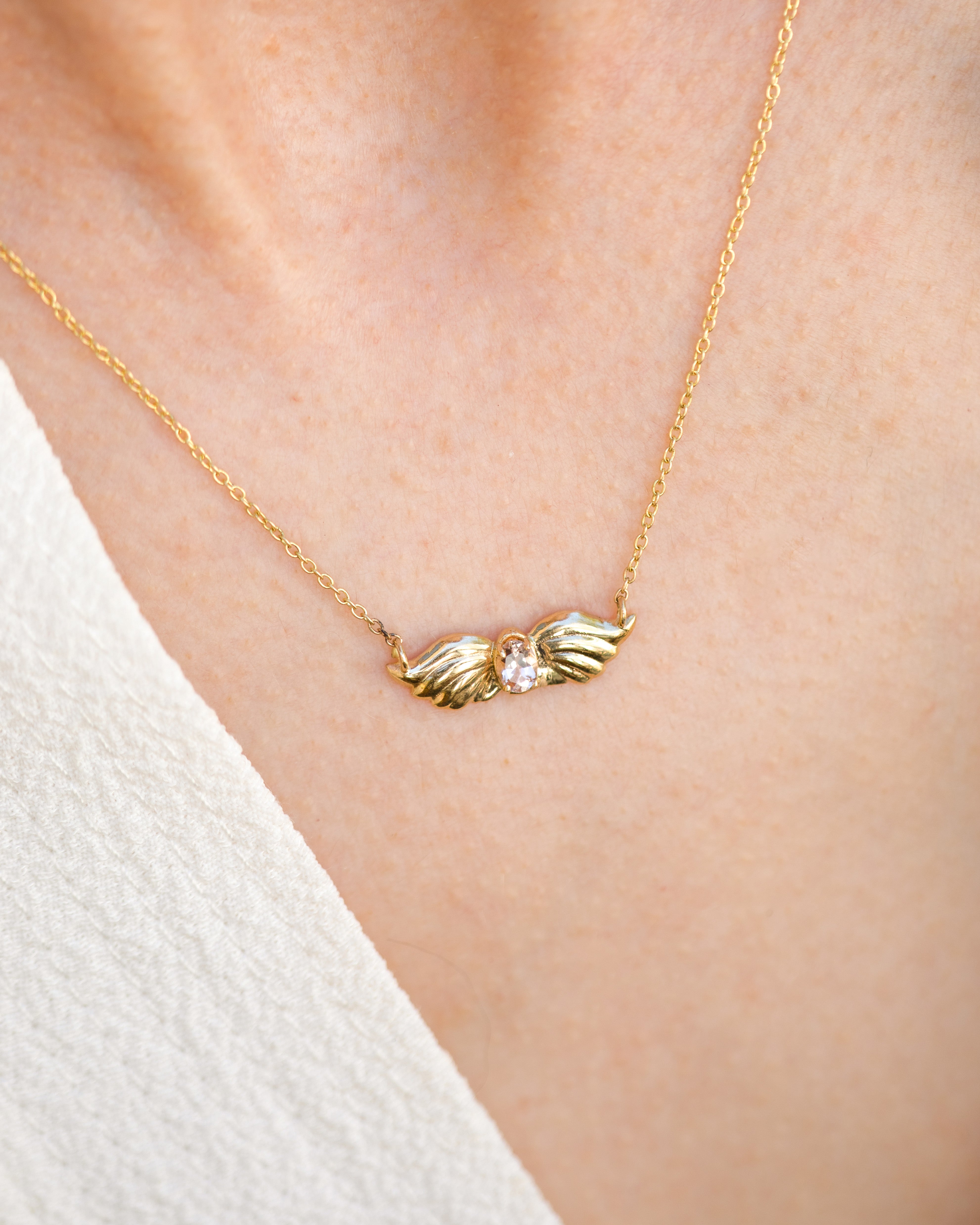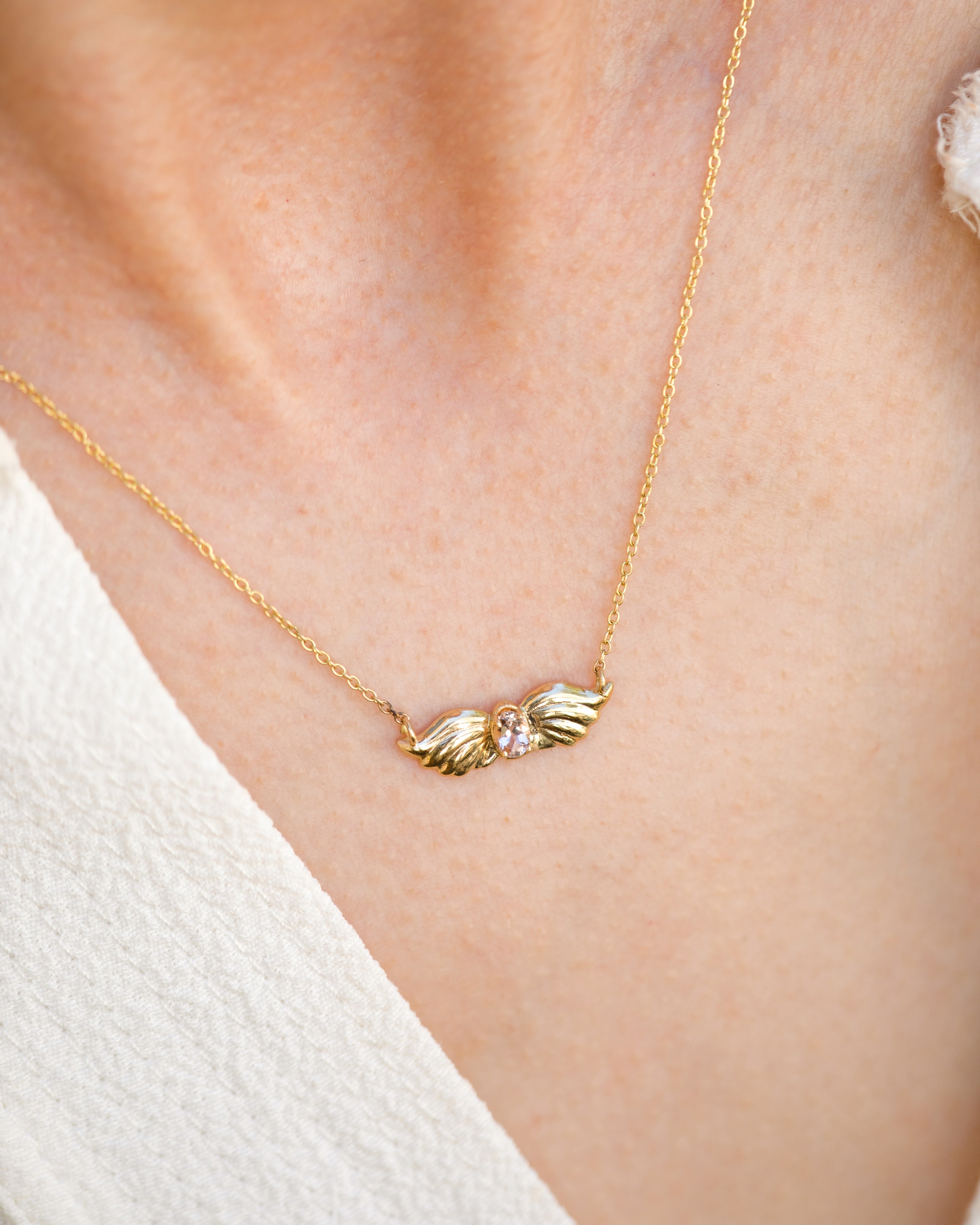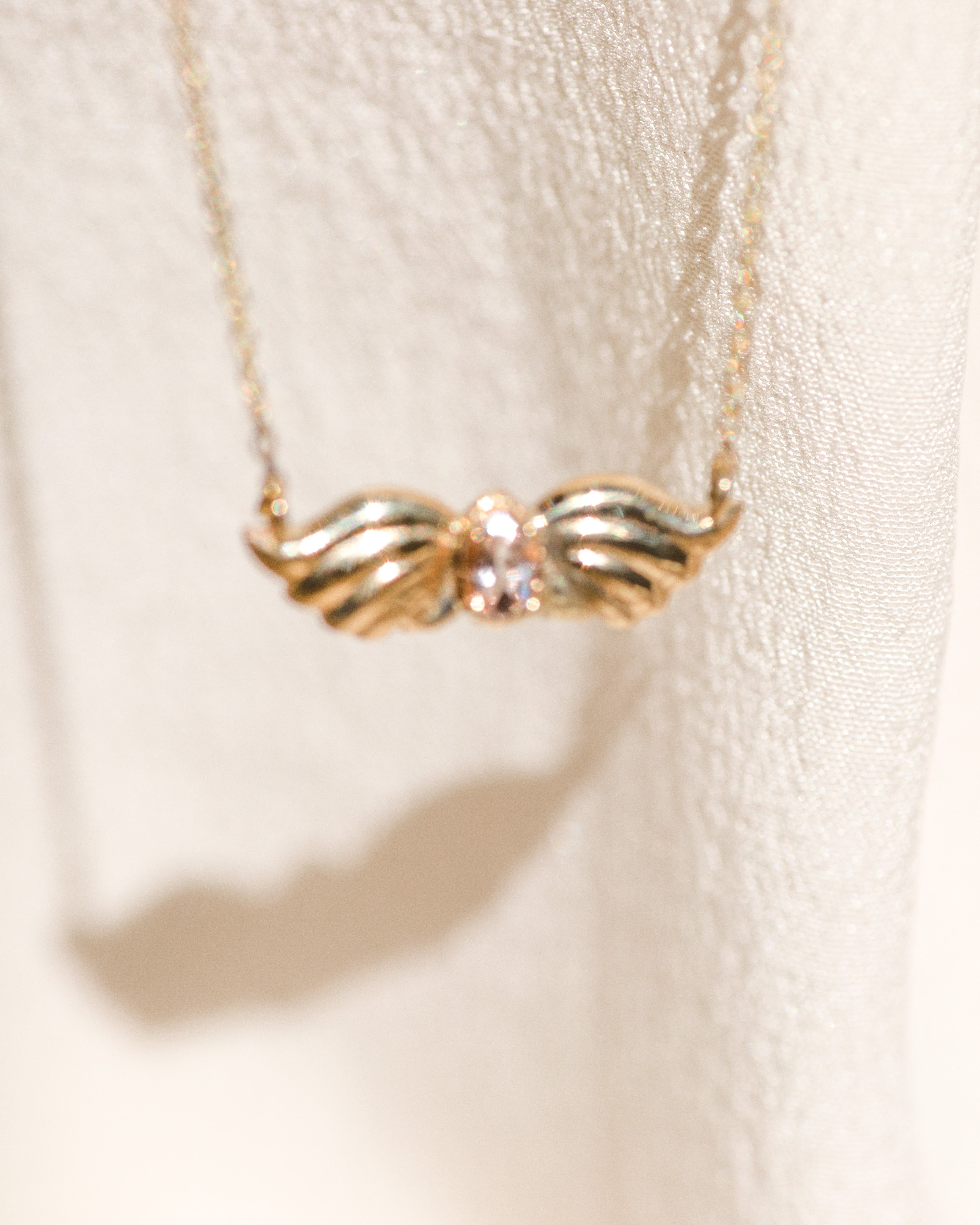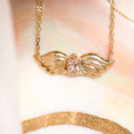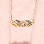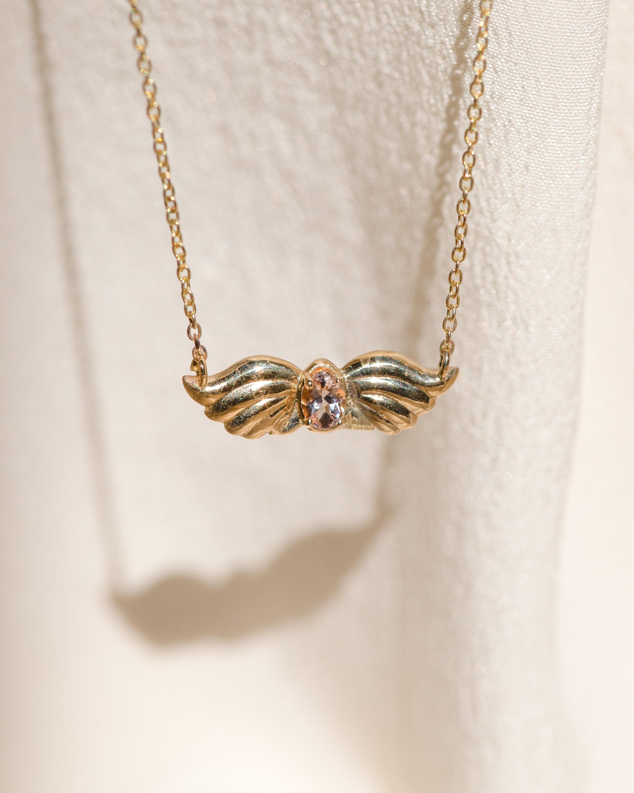 The Angel Wings Pendant features a beautiful oval center Morganite, held between a pair of Angel Wings, to guide you in the unconditional love you deserve and remind you of the innate Divinity, grace and worthiness that makes up who you are.