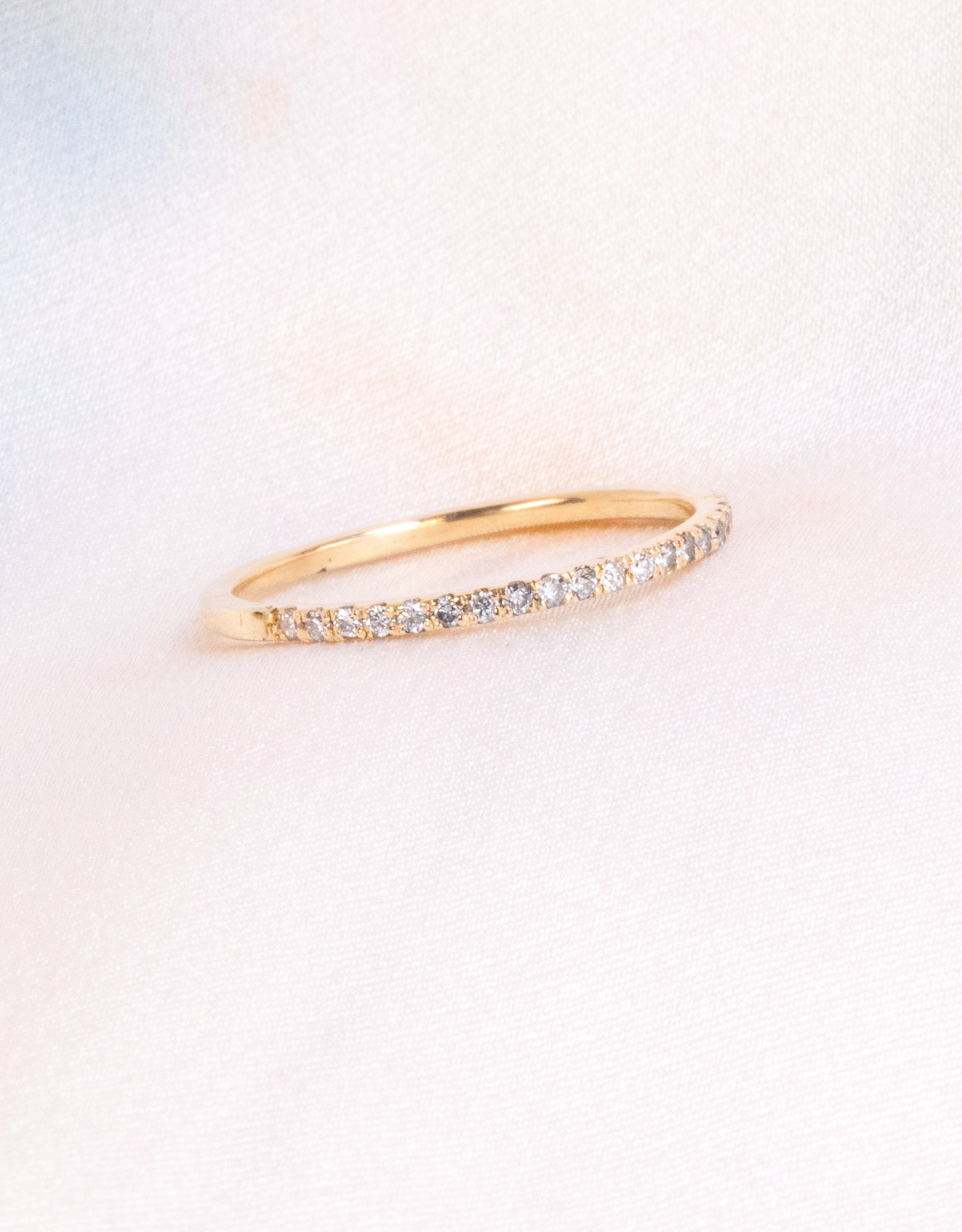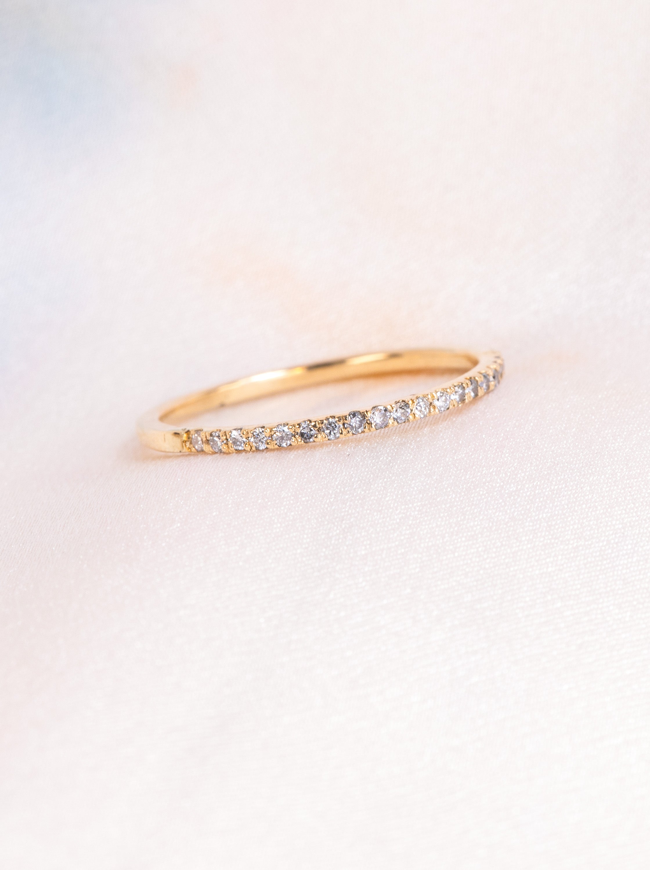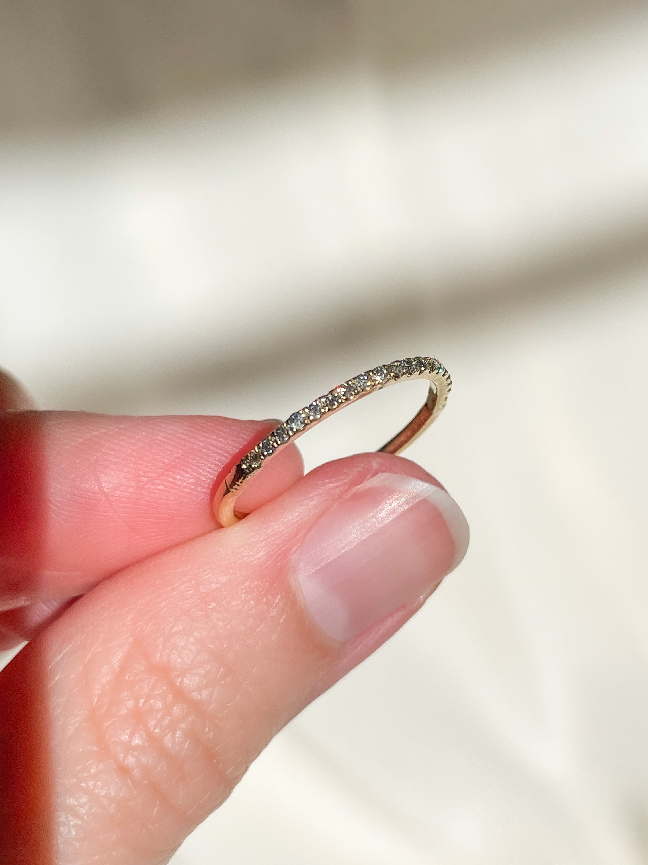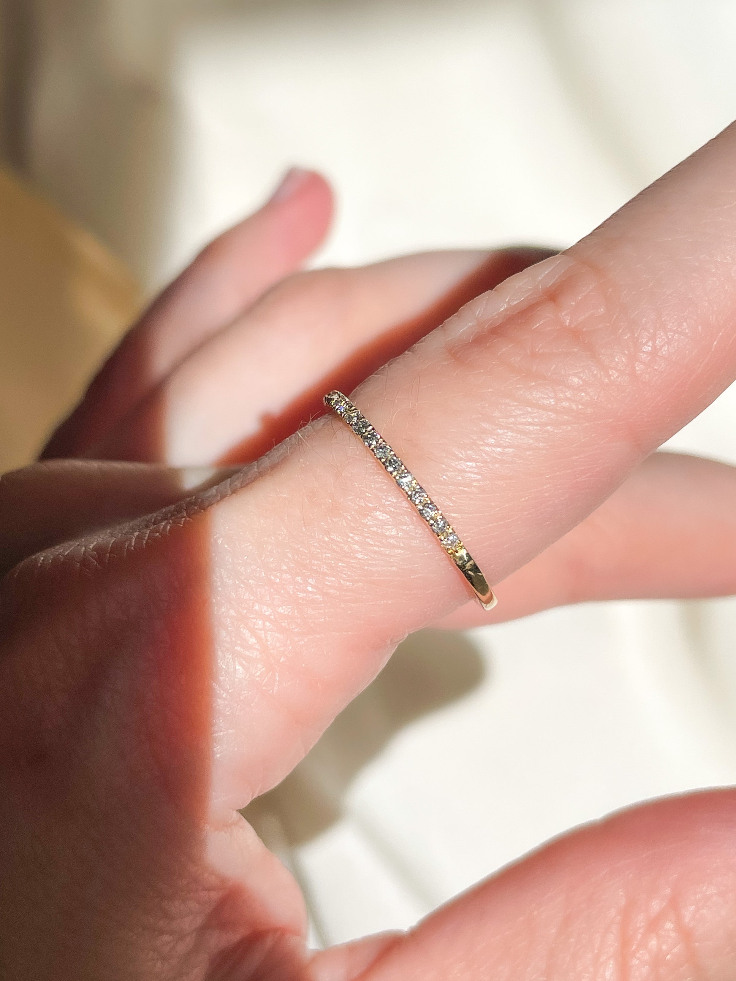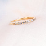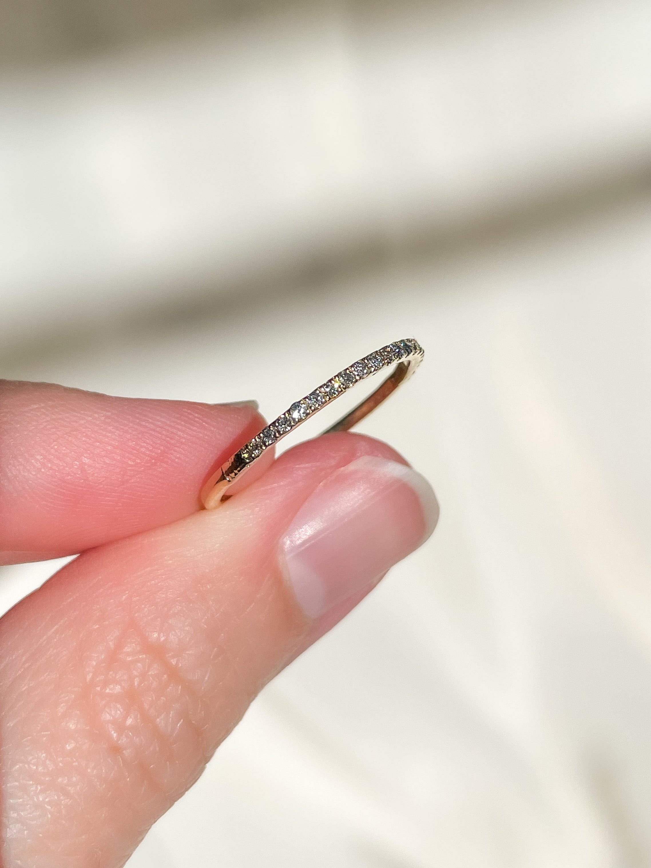 A delicate halo of light, embodying Divine spirituality and all that is holy in sacred union with yourself and your beloved. This thin 1.1mm 14k Gold band features a setting of 20 White Diamonds.