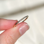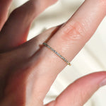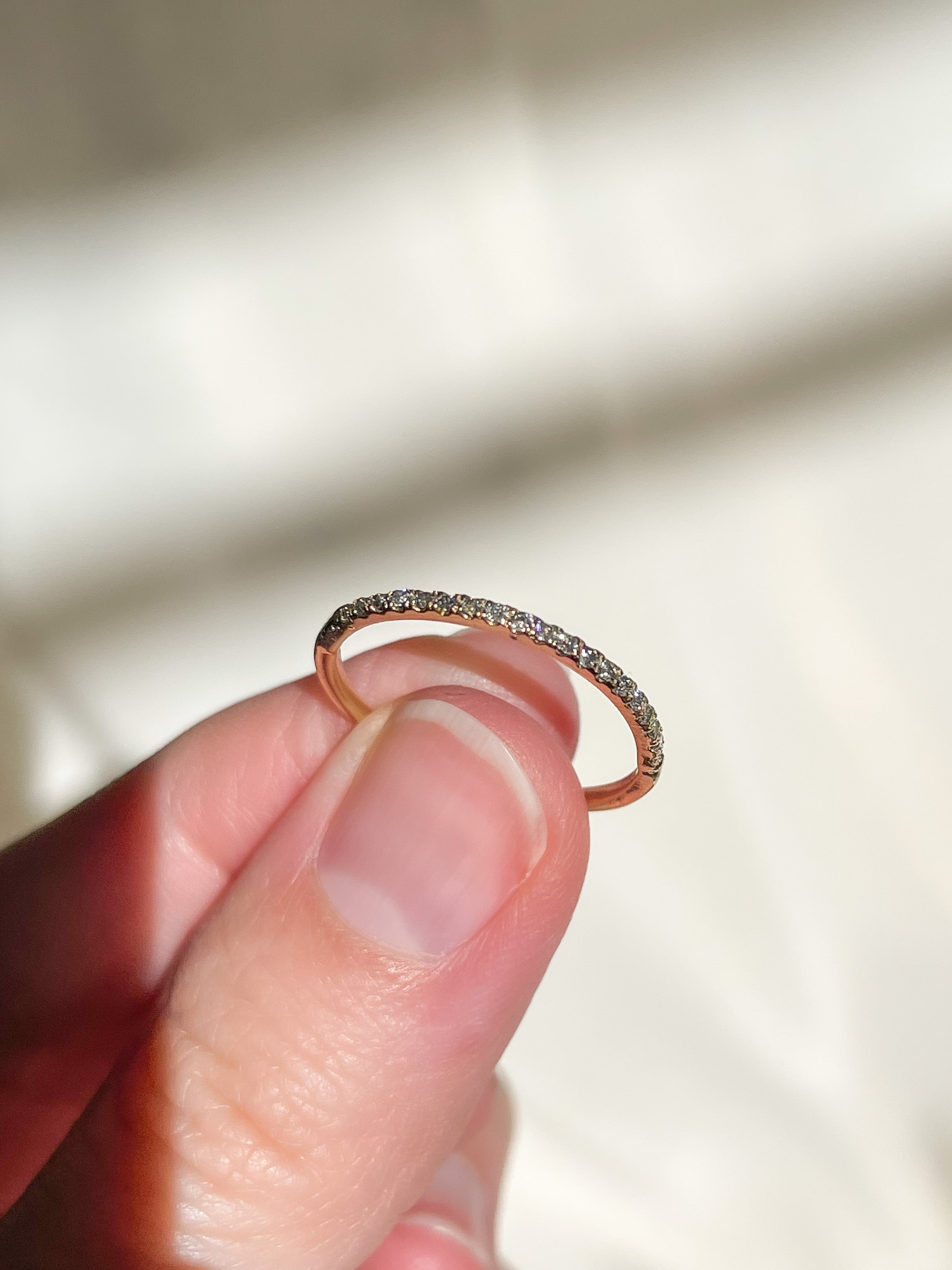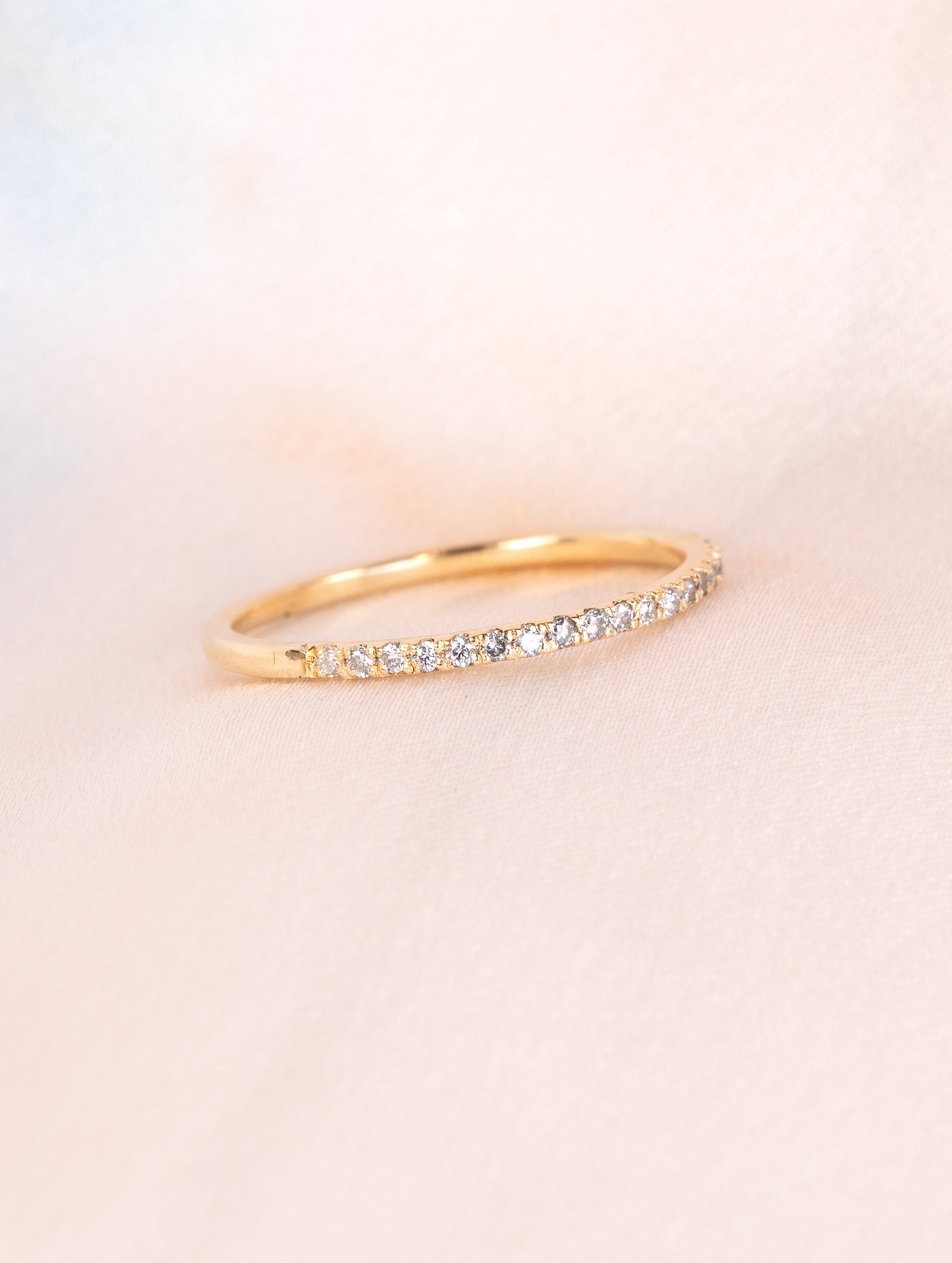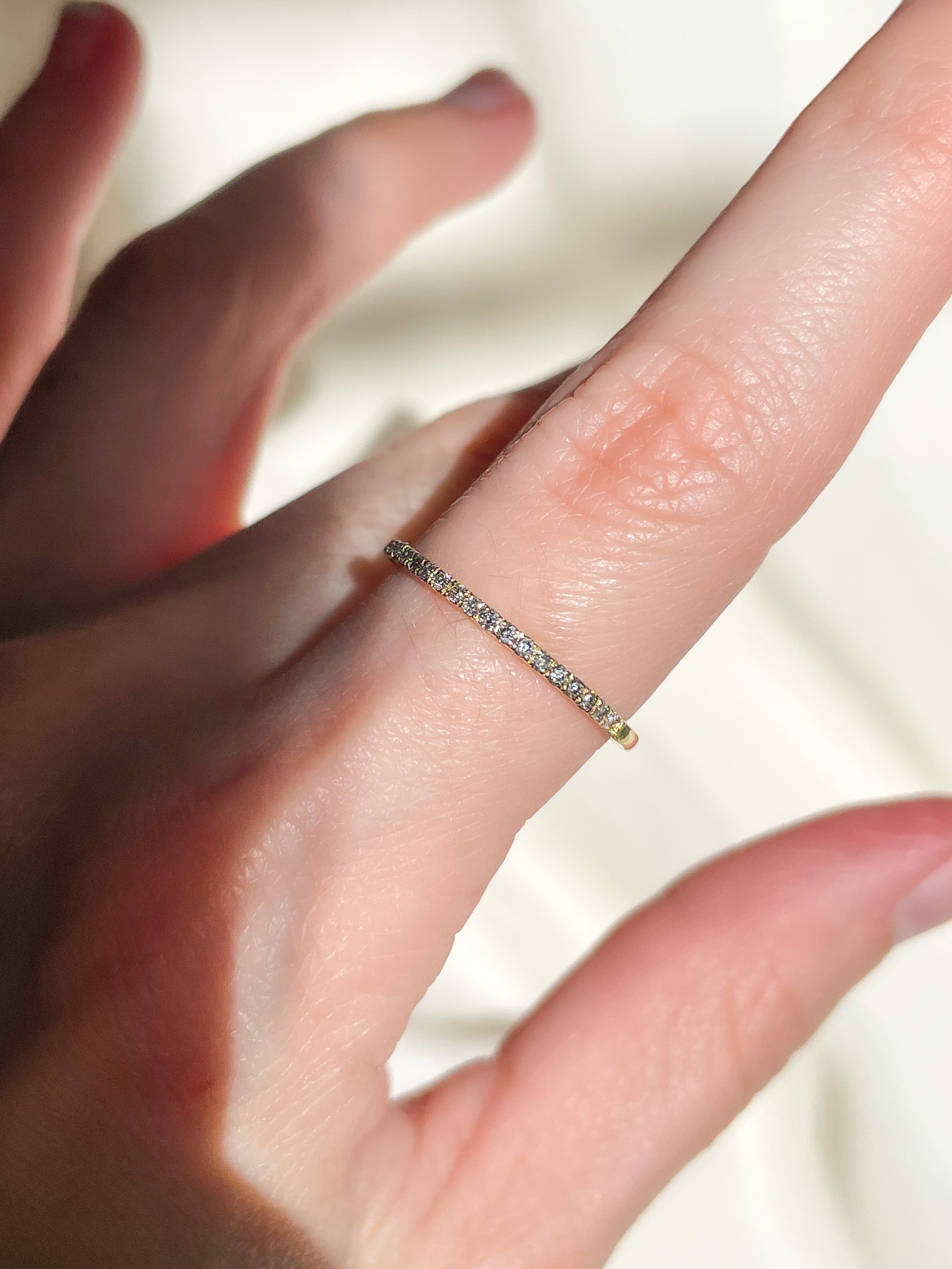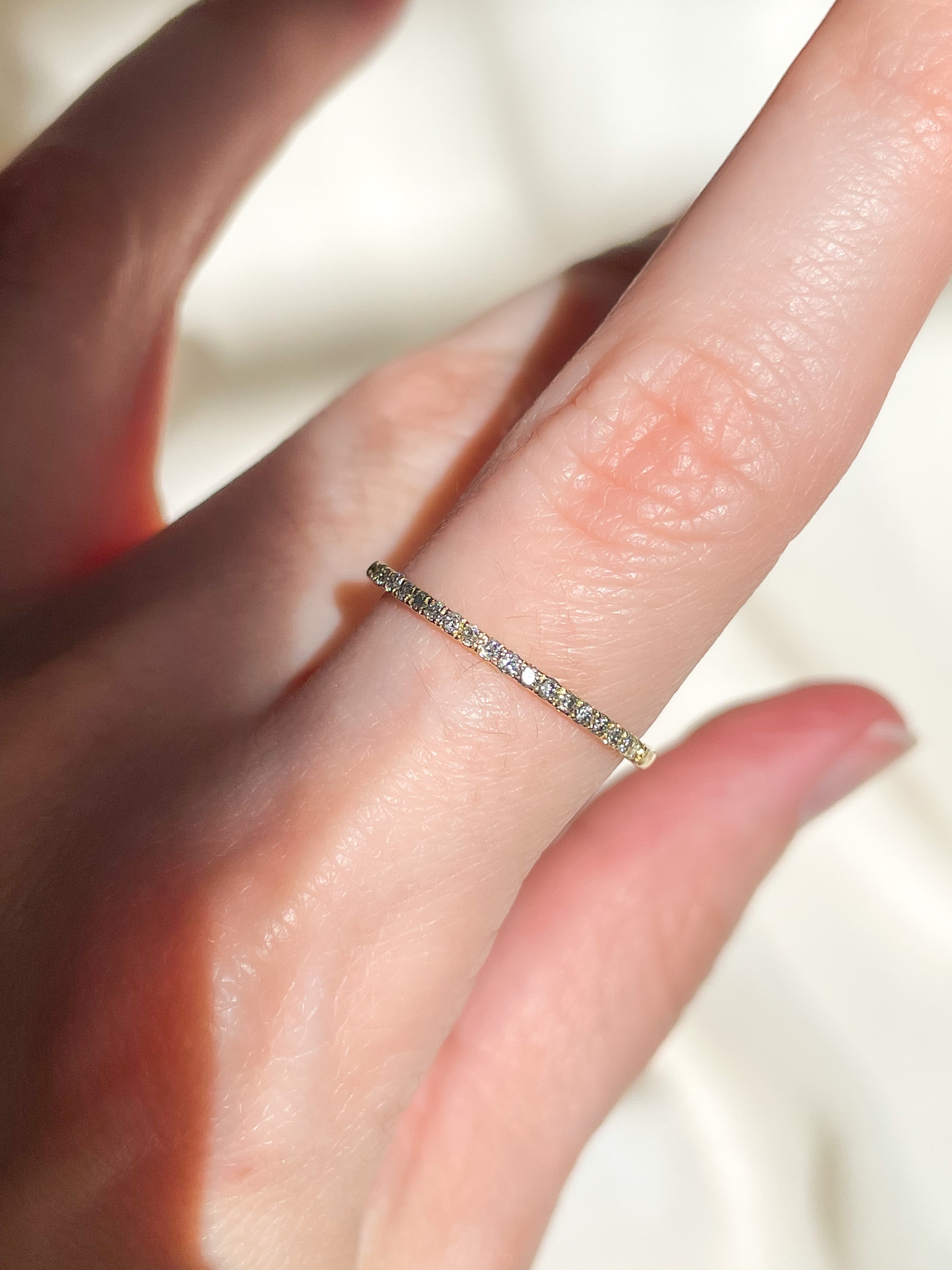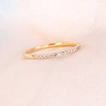 A delicate halo of light, embodying Divine spirituality and all that is holy in sacred union with yourself and your beloved. This thin 1.1mm 14k Gold band features a setting of 20 White Diamonds.