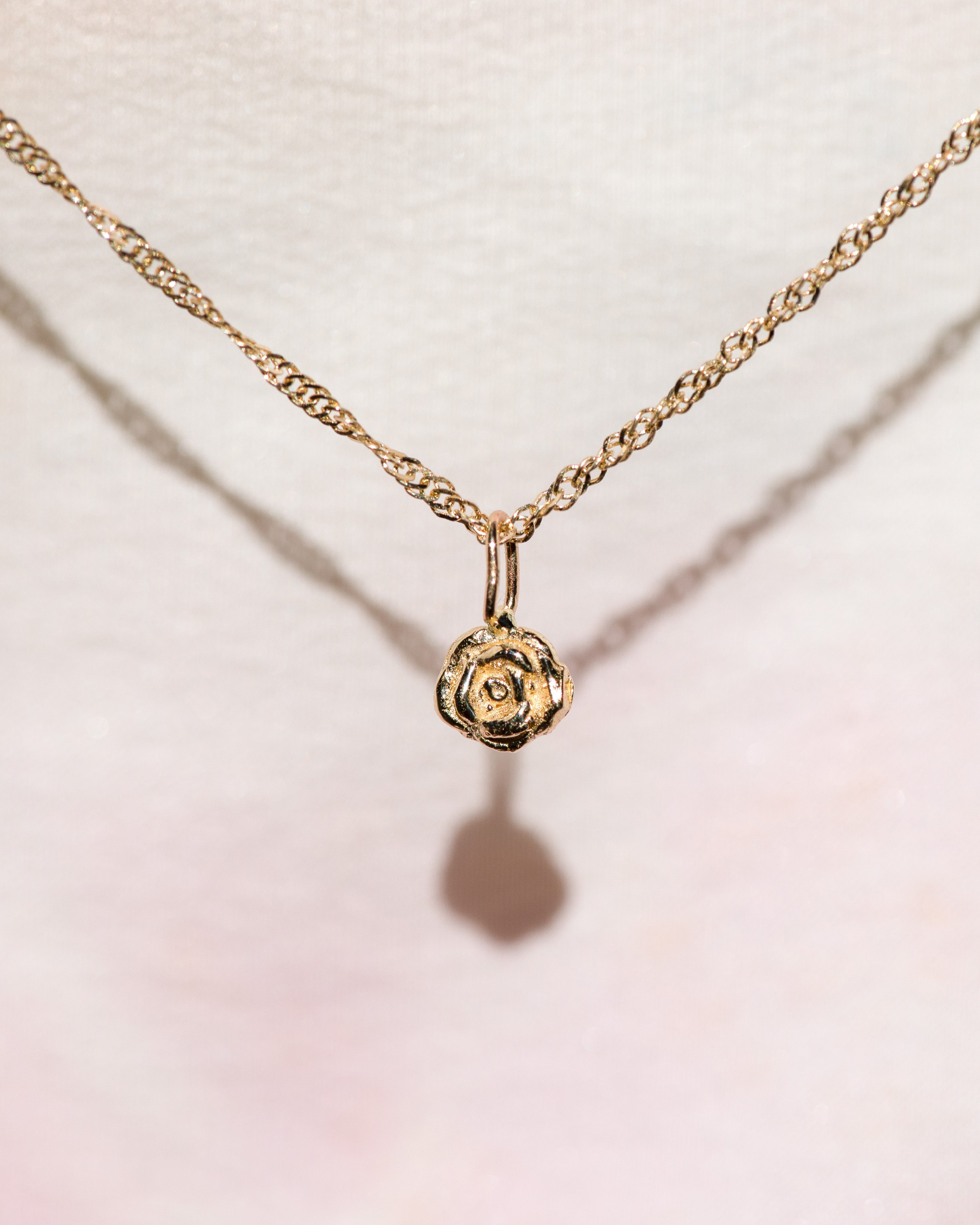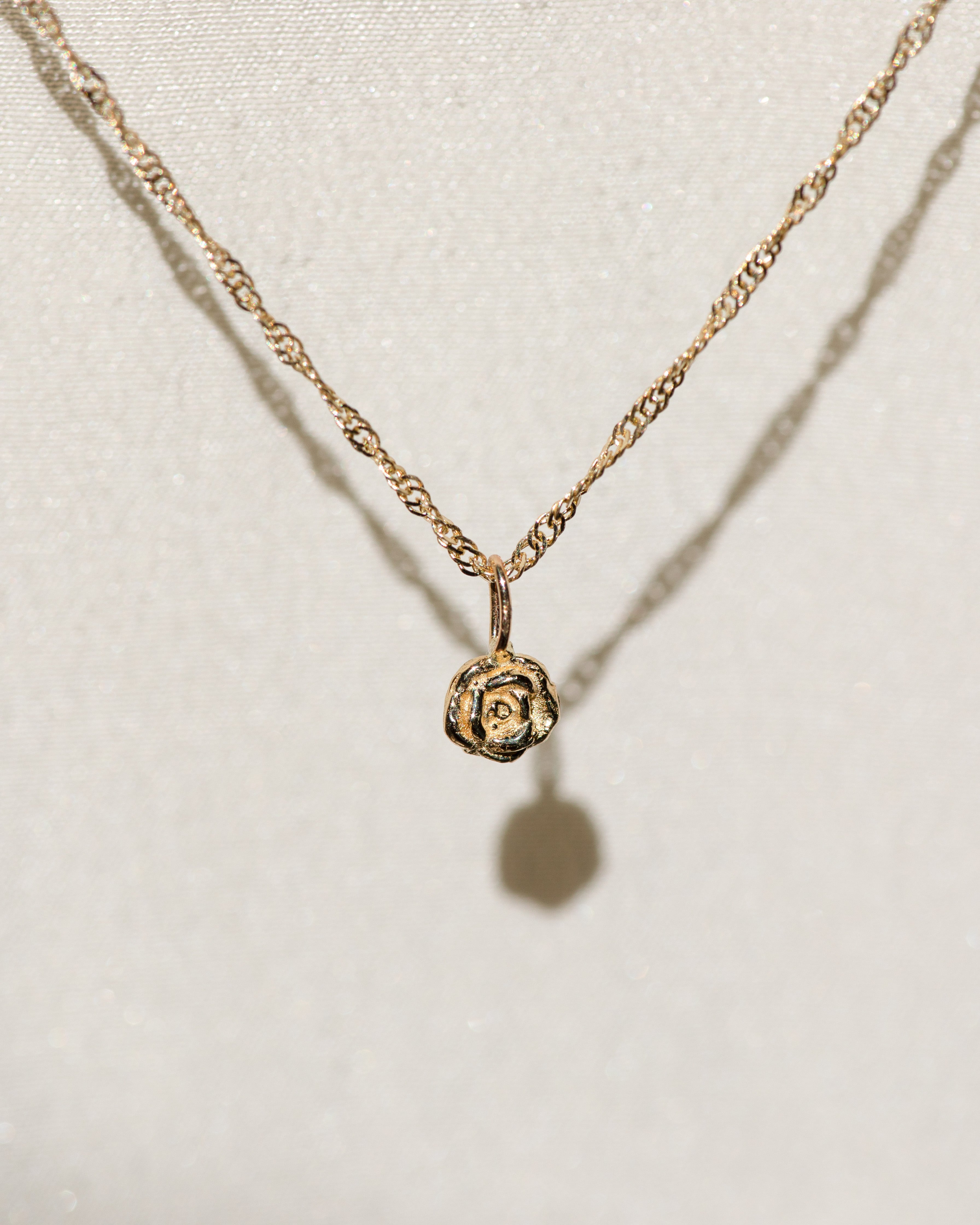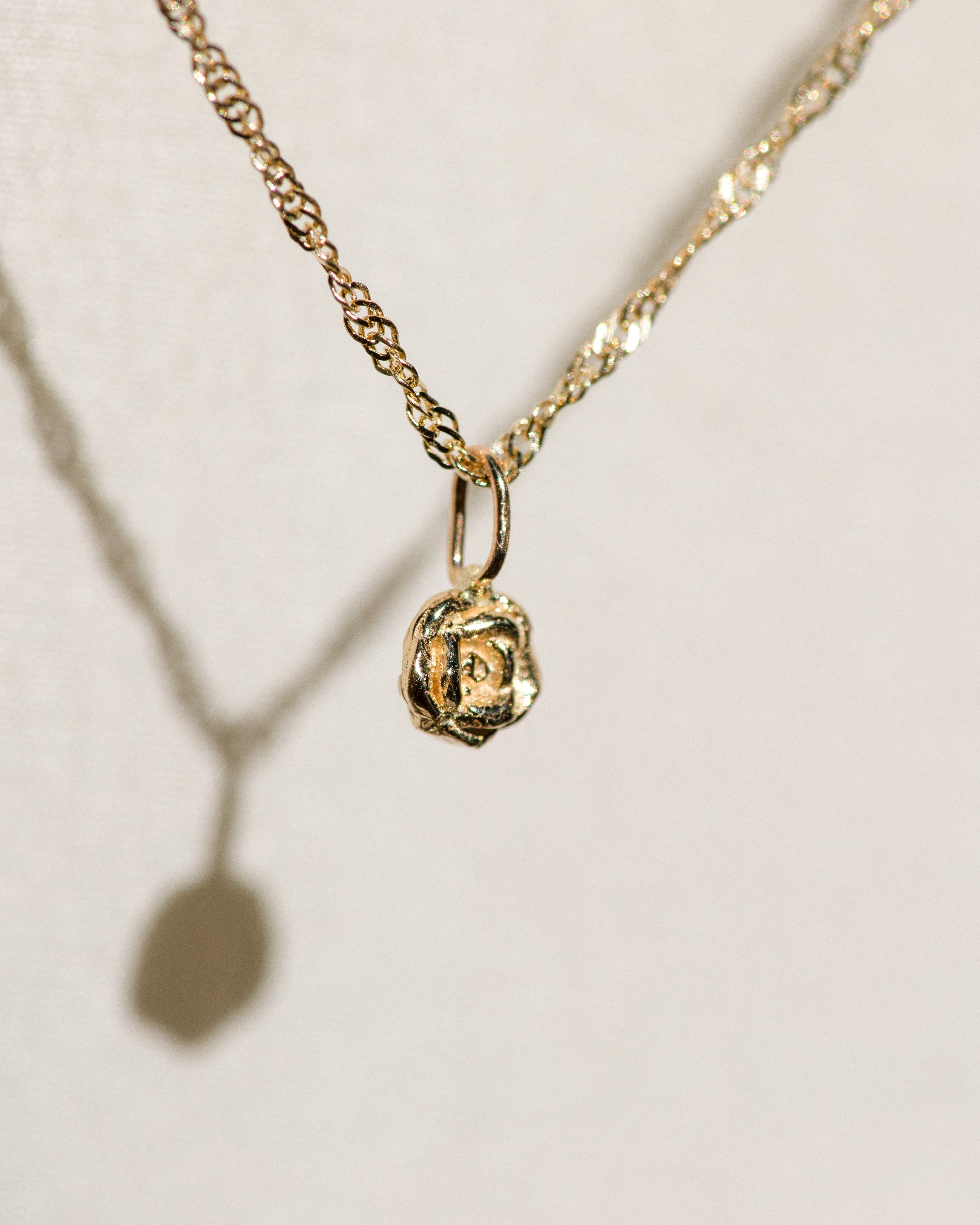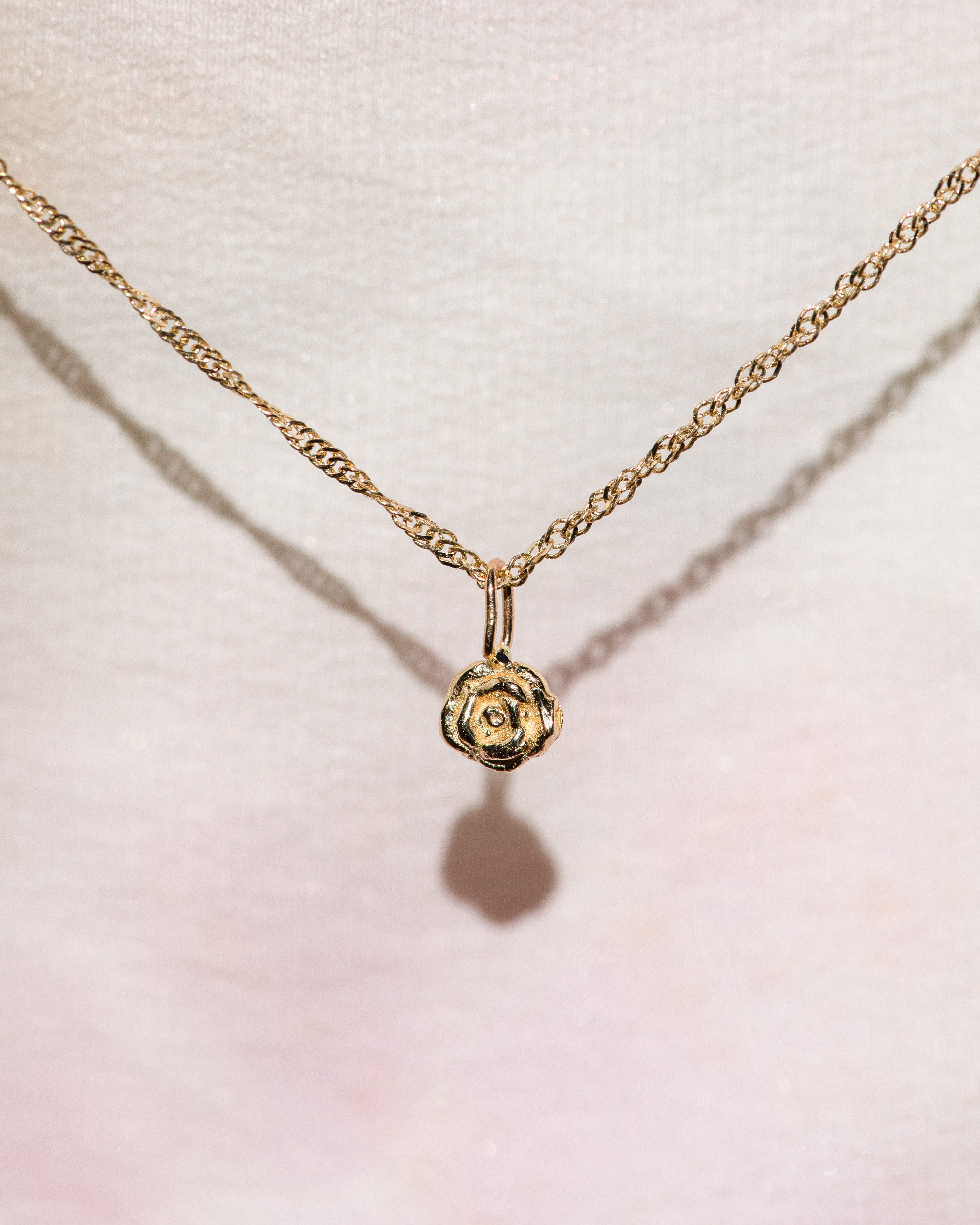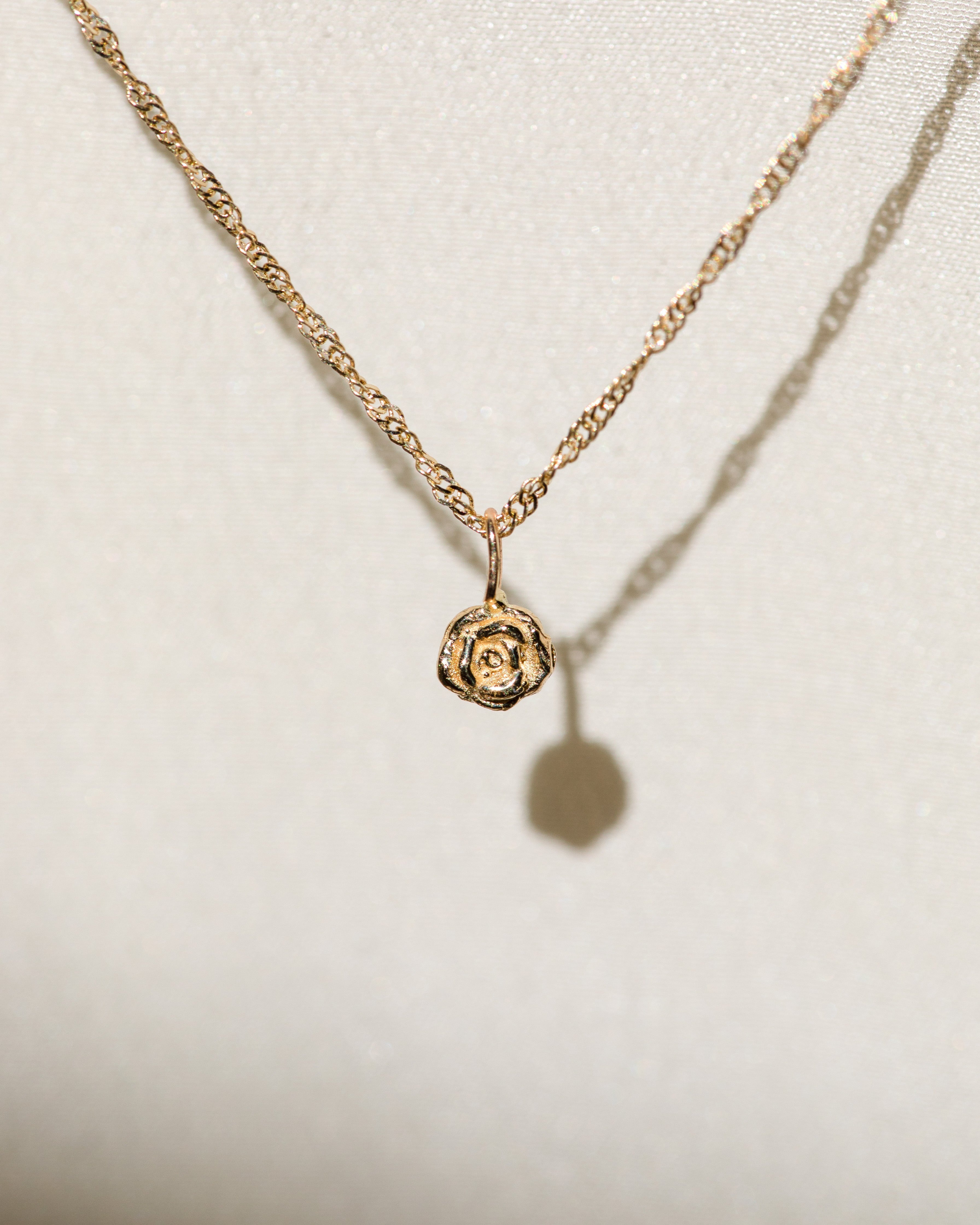 I am infatuated with the sweetness within this little bud pendant, strung on a delicate, shimmering Singapore chain.