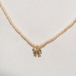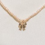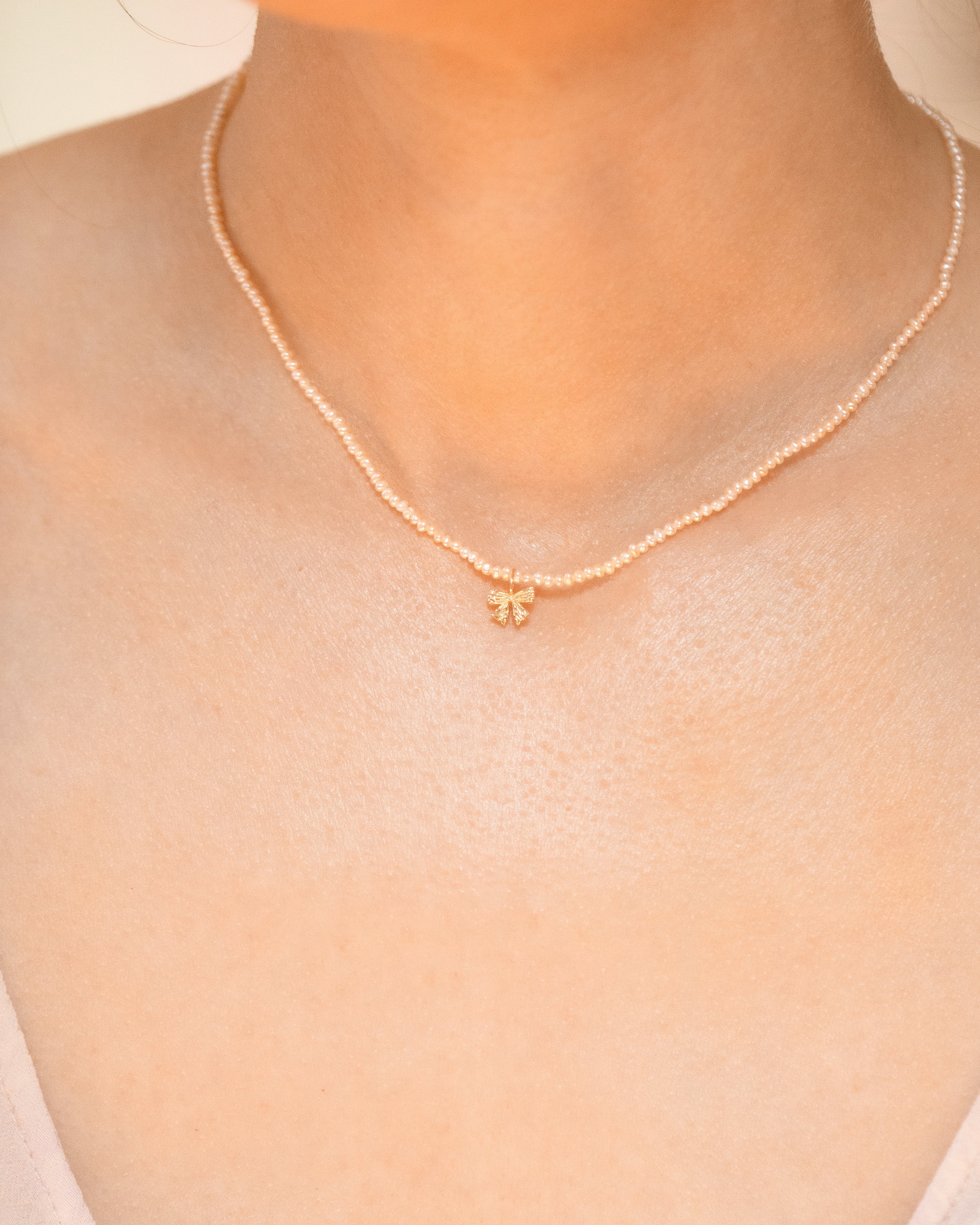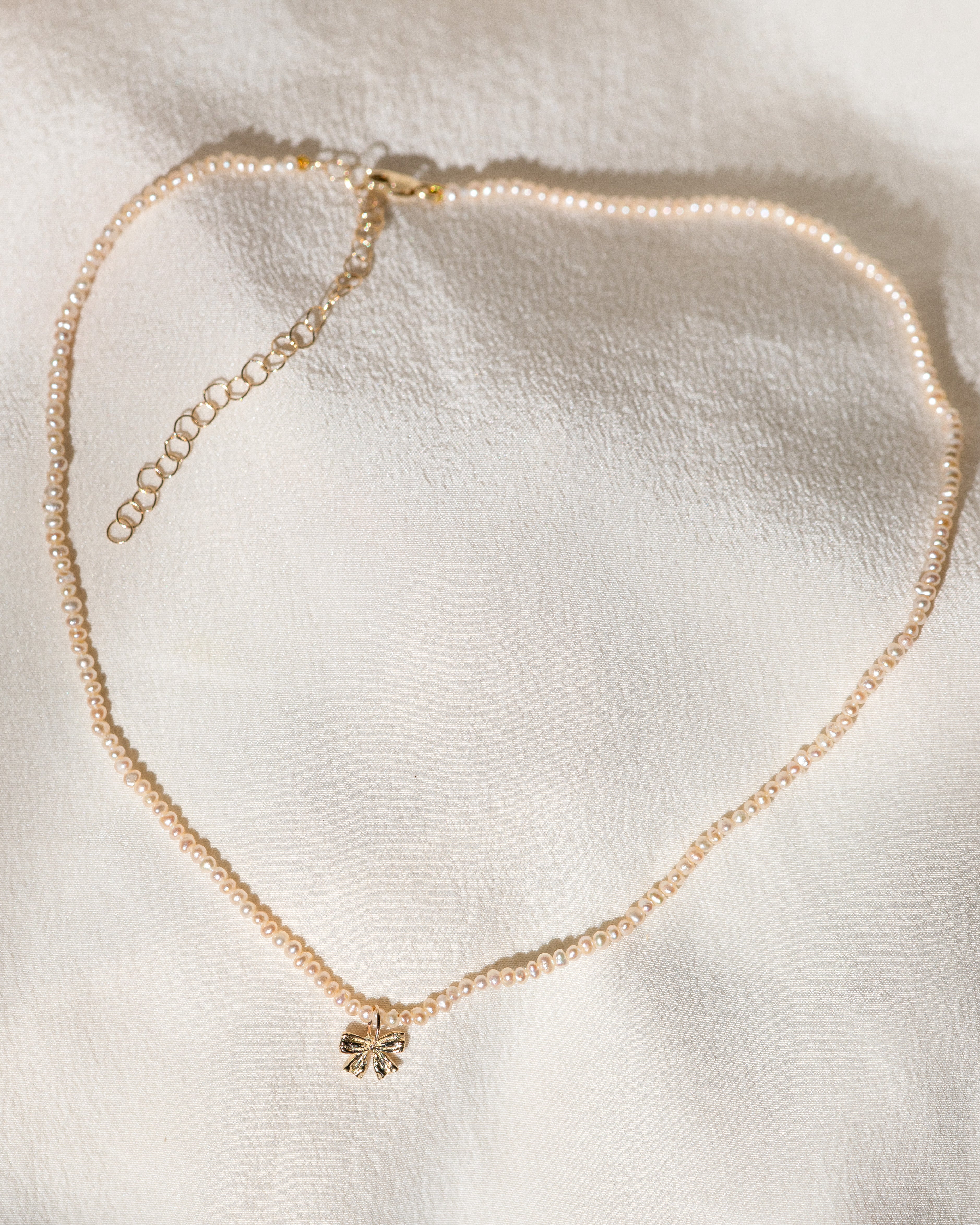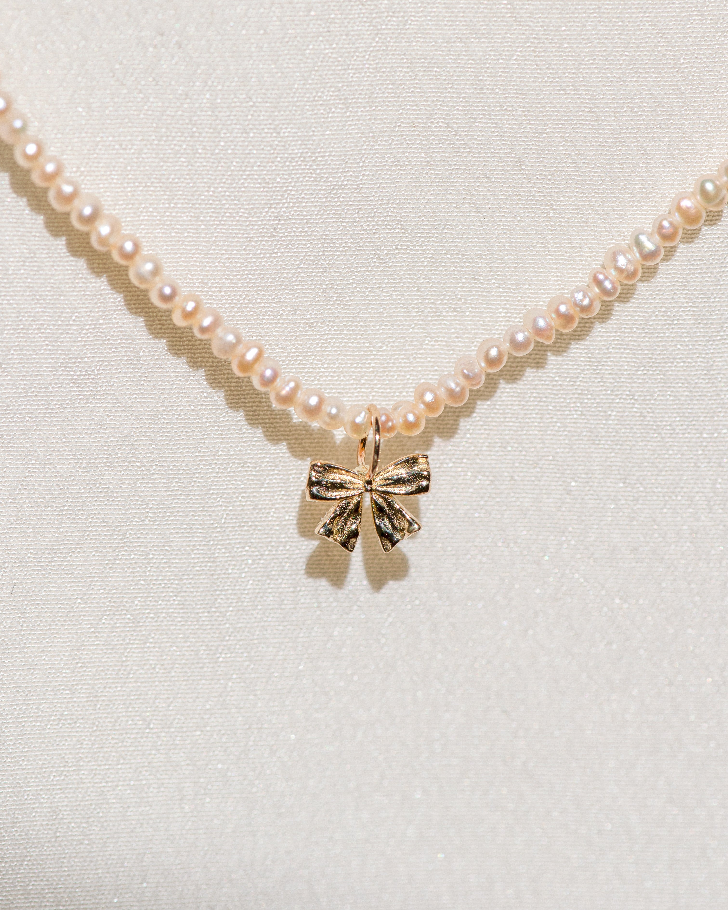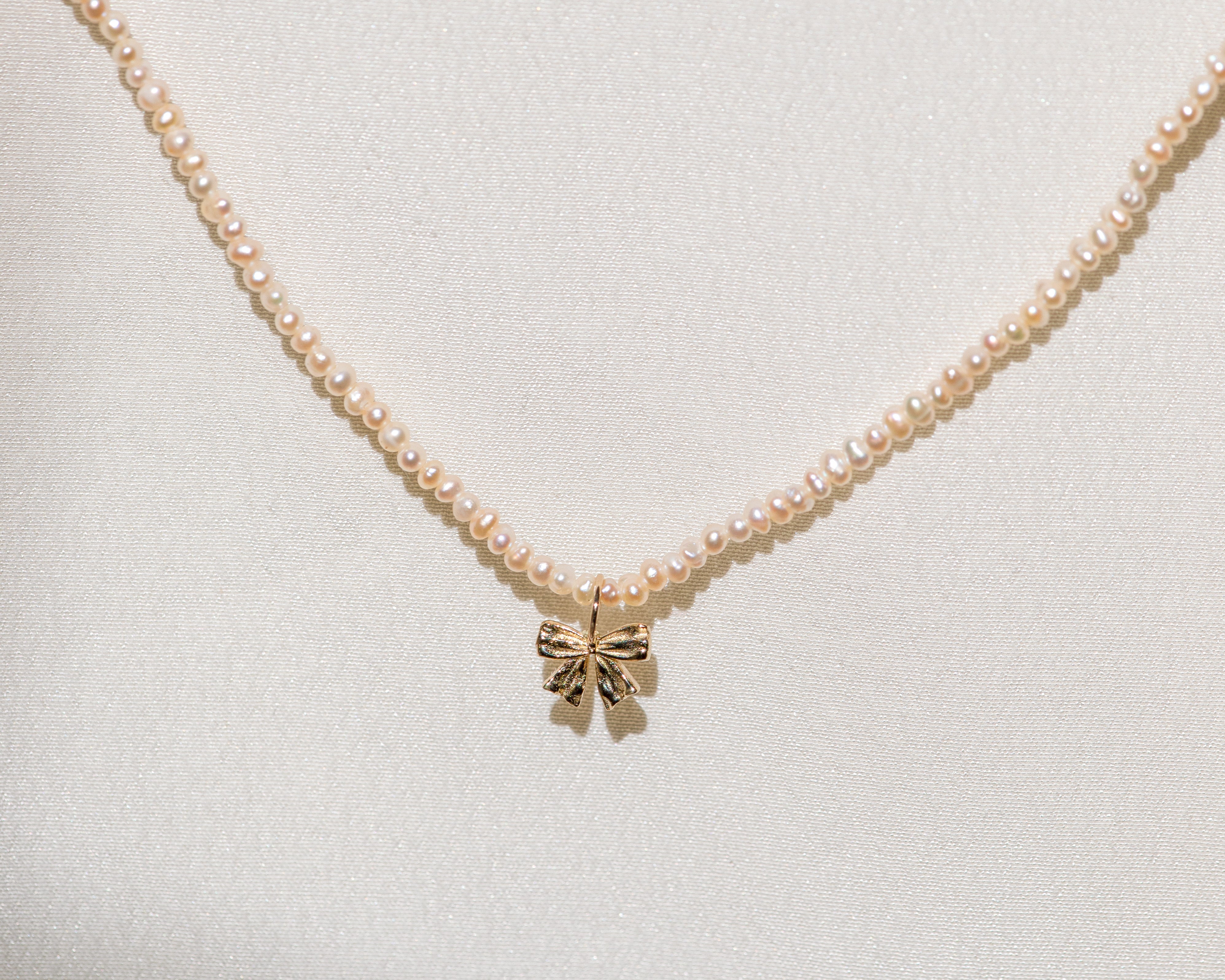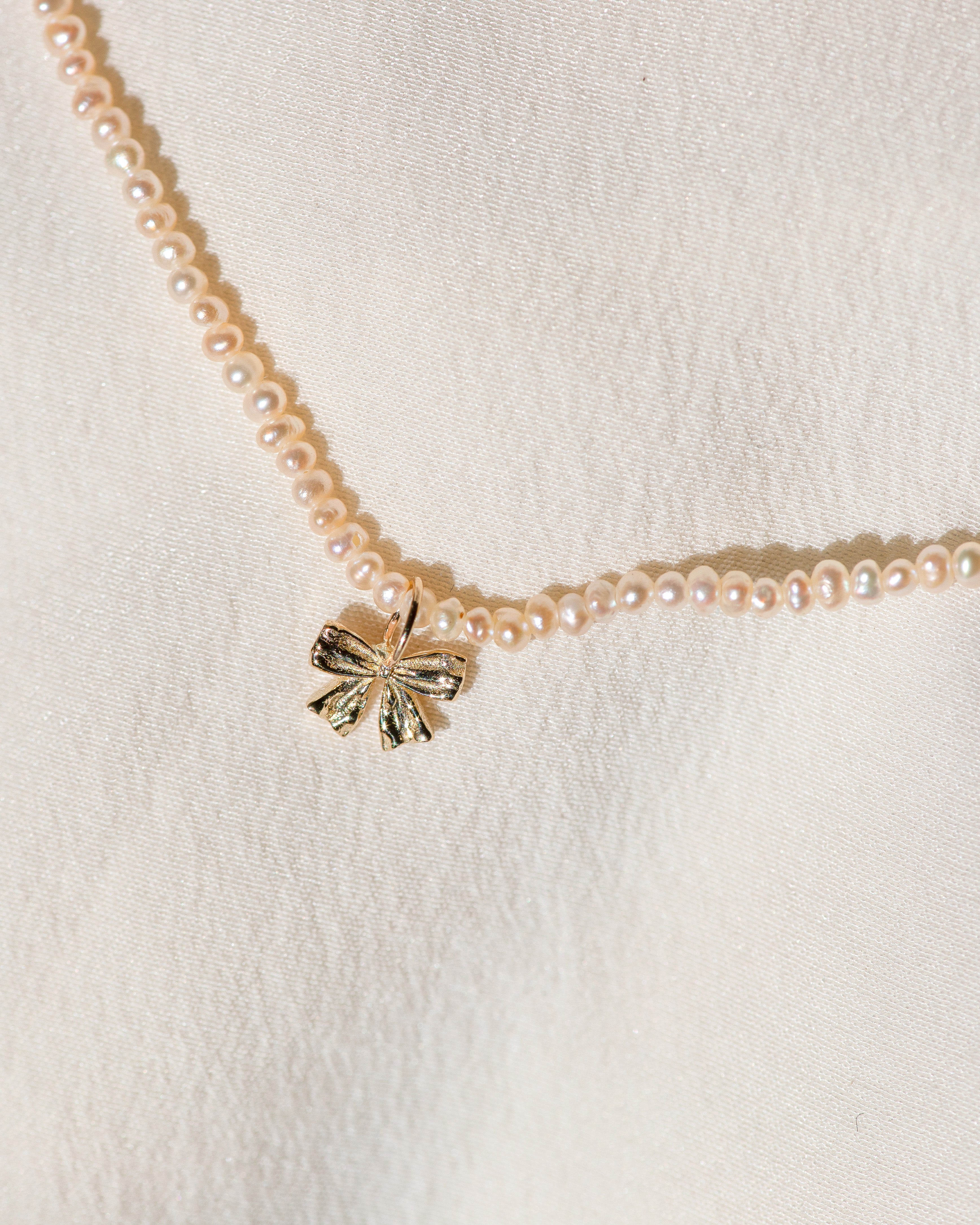 This perfectly petite coquette pearl and bow pendant is inspired by the pendants worn by Marie Antoinette, adorned in ribbon and sealed with a bow.